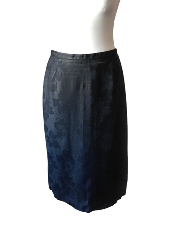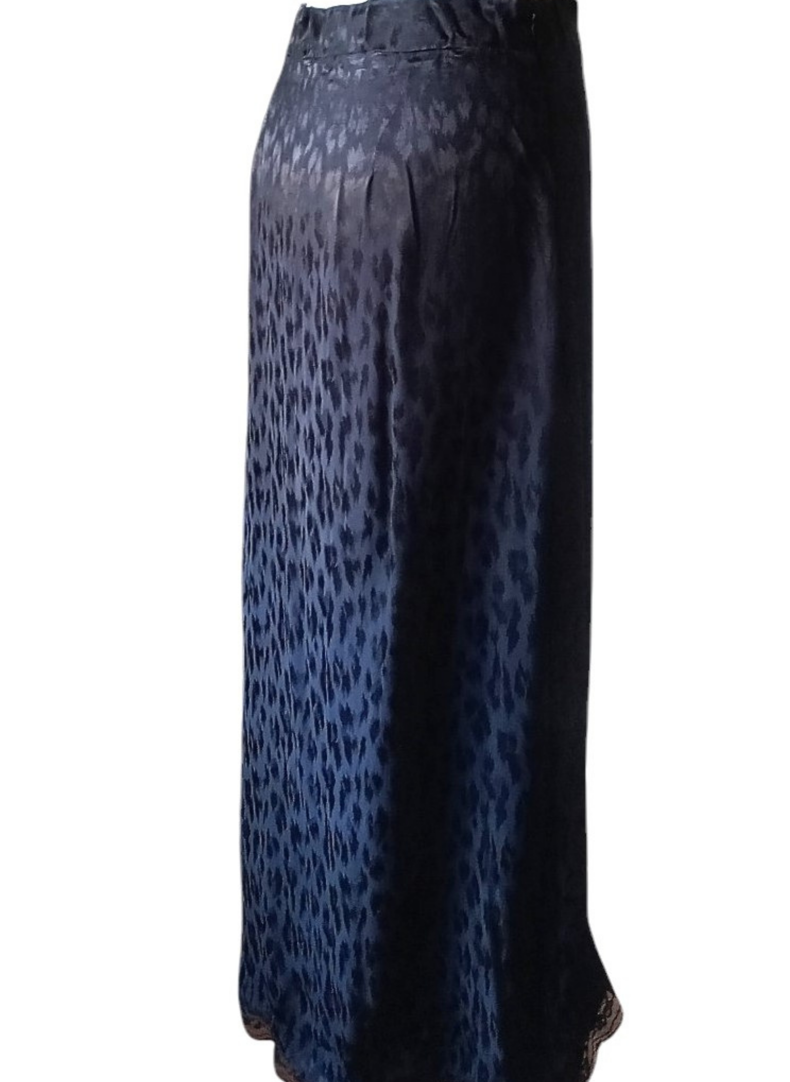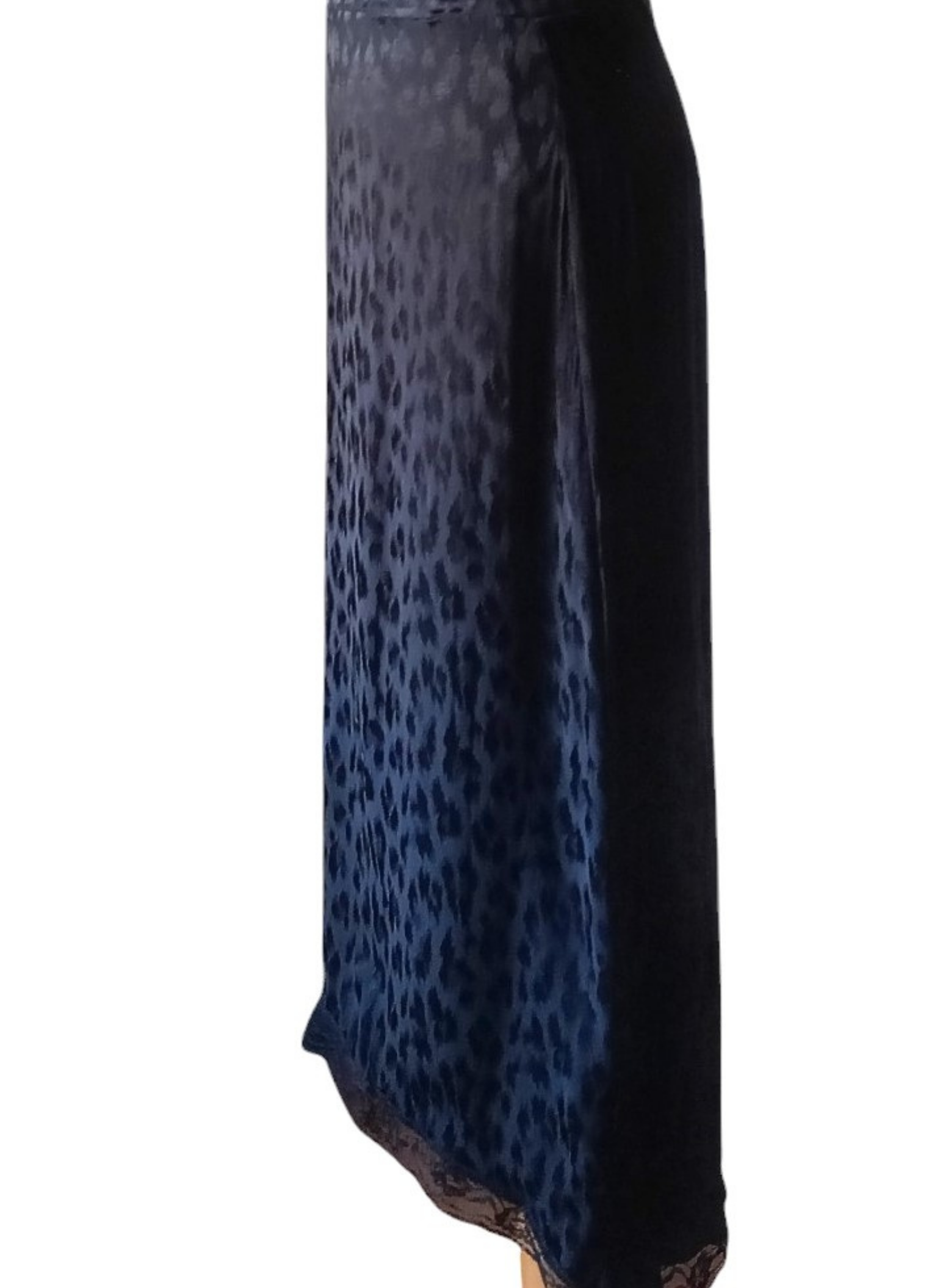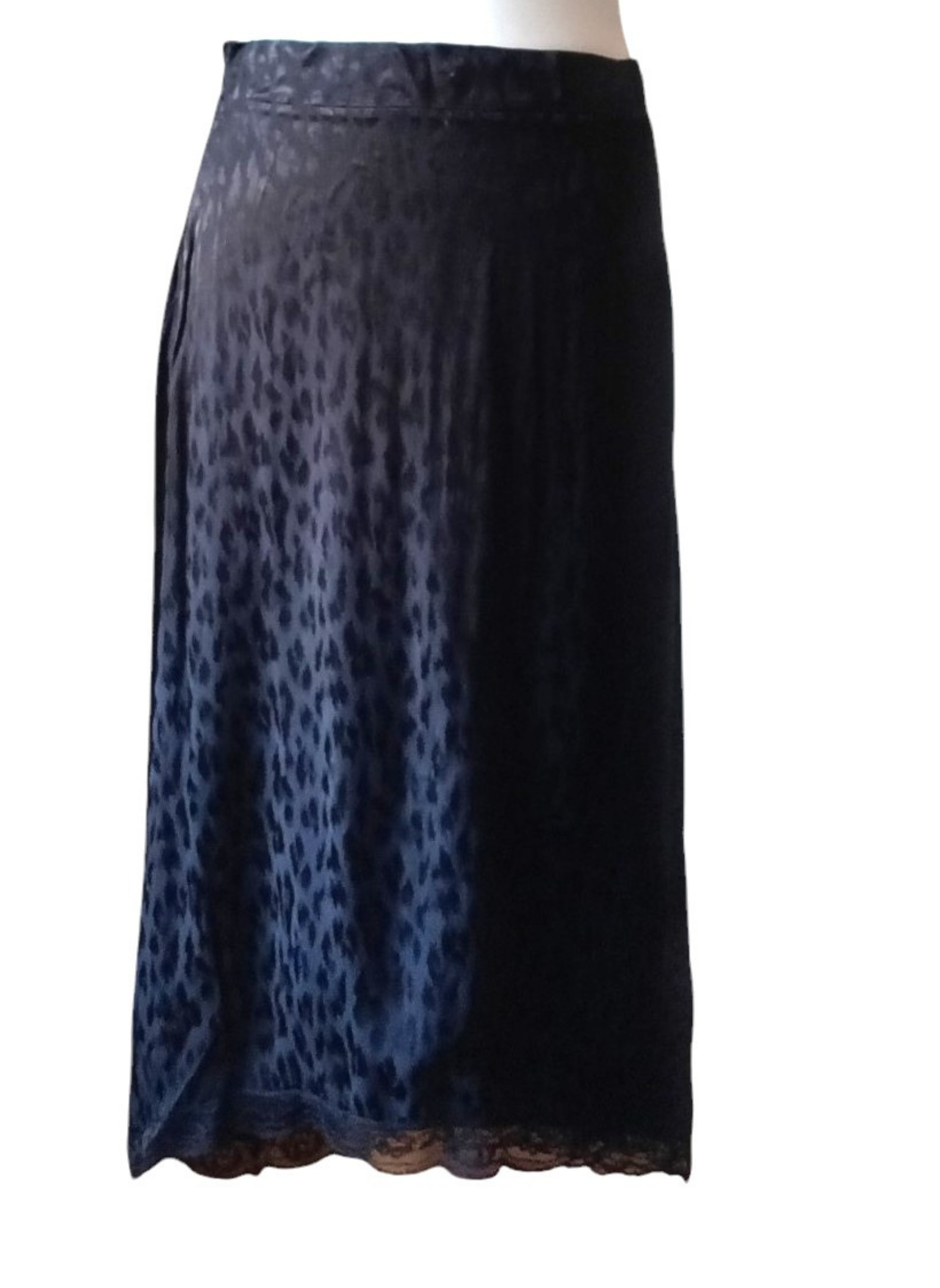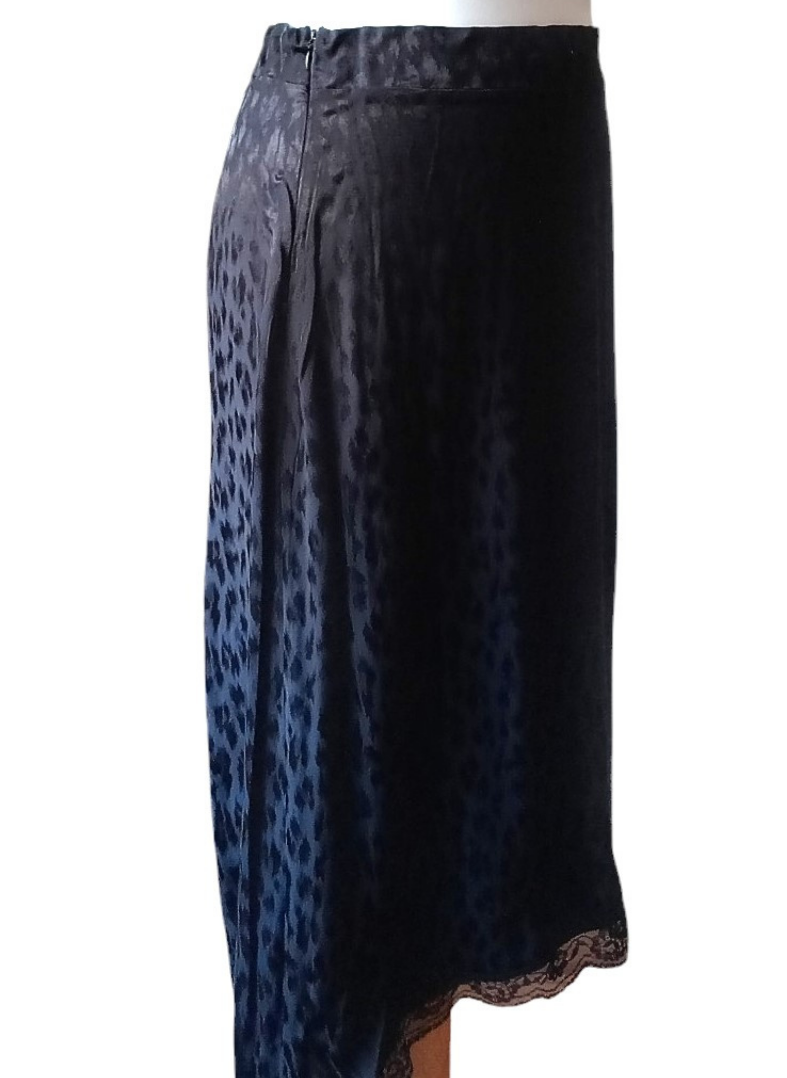 Falda de seda color negro con estampado leopardo del mismo color.Remata con encaje al final,mas larga por detras que por delante.En muy buen estado.talla 38.Medidas: 36 cms de cintura x 48 cms de cadera x 80 cms de largo.