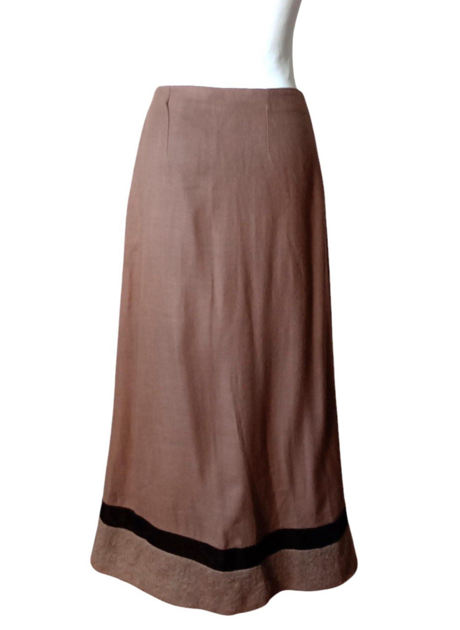 Falda larga color camel de Renato Nucci.Falda de lana larga color marron rematada con cinta de terciopelo marro´n.Esta en muy buen estado.talla 38.Medidas:34 cms de cintura x 48 cms de cadera x 94 cms de largo.