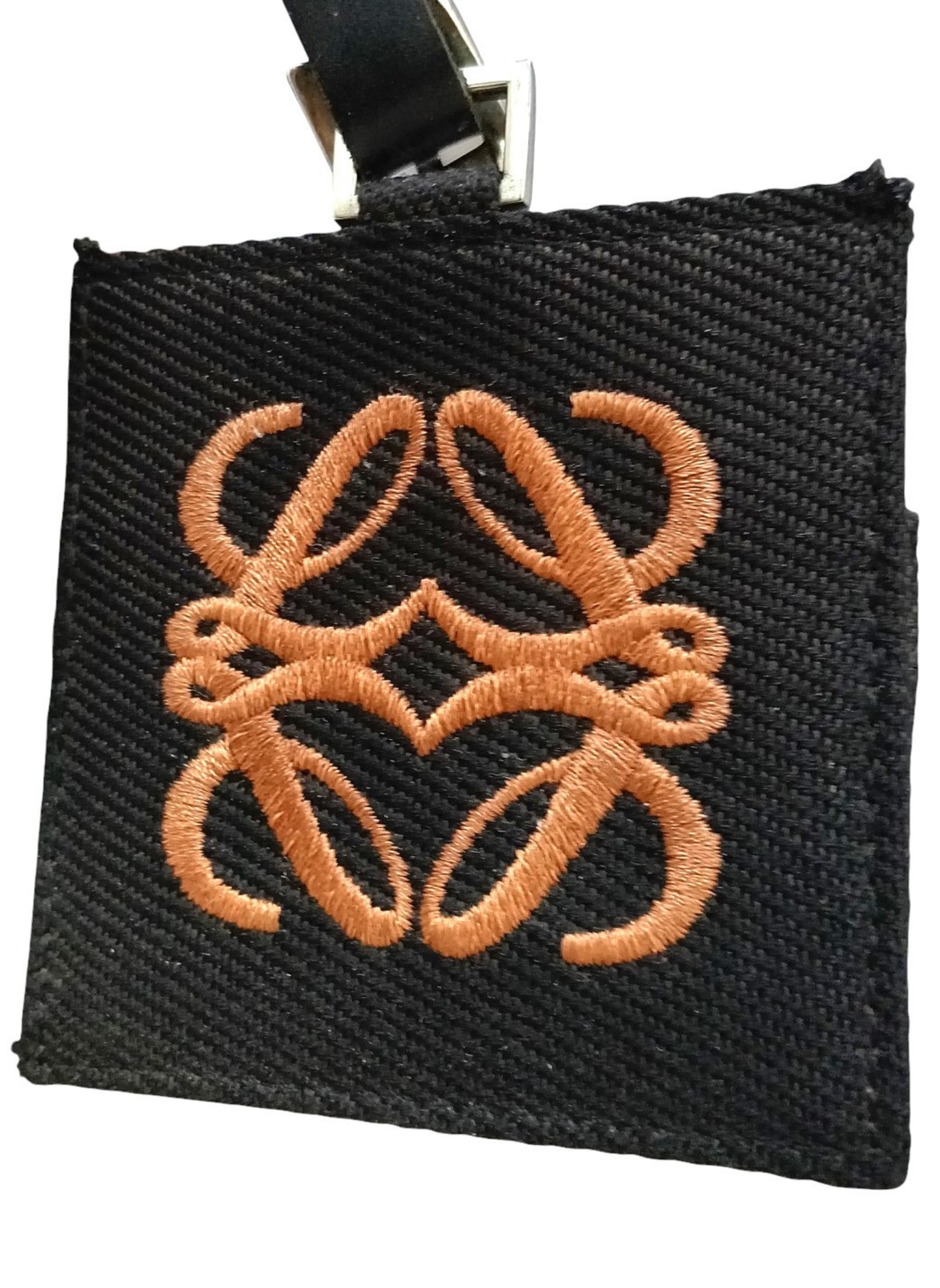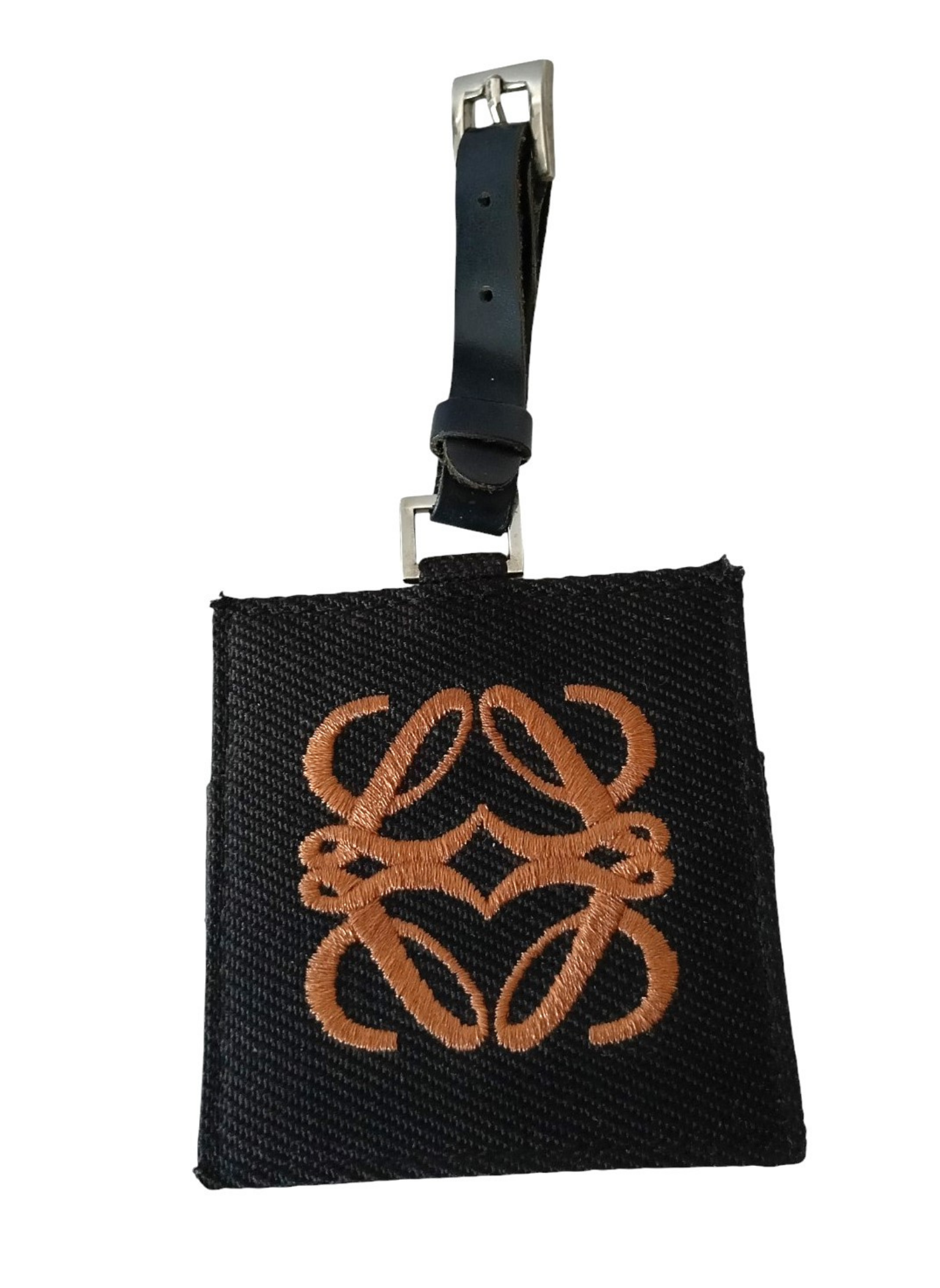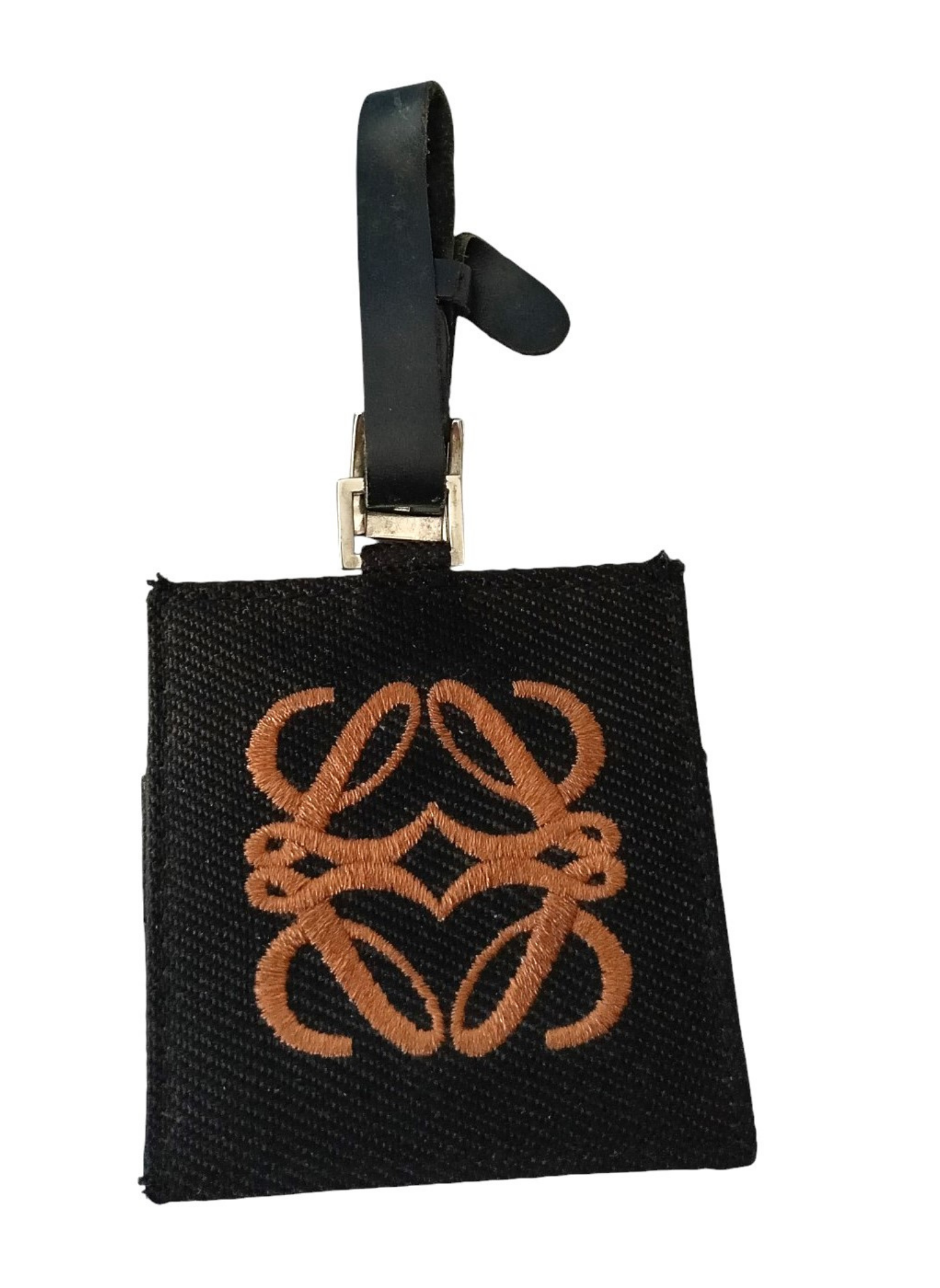 Identificador Vintage de Loewe,para maletas o bolsos,elaborado en lona negra con el anagrama bordado de Loewe en color marron.La parte trasera lleva un bolsillo plano transparente para poner la identificación.Correa de cuero ajustable .Muy buen estado,con su caja y funda.medidas 7,5 x 7,5 cms.