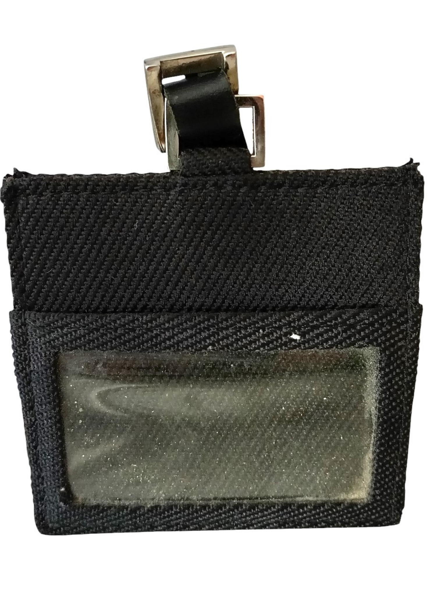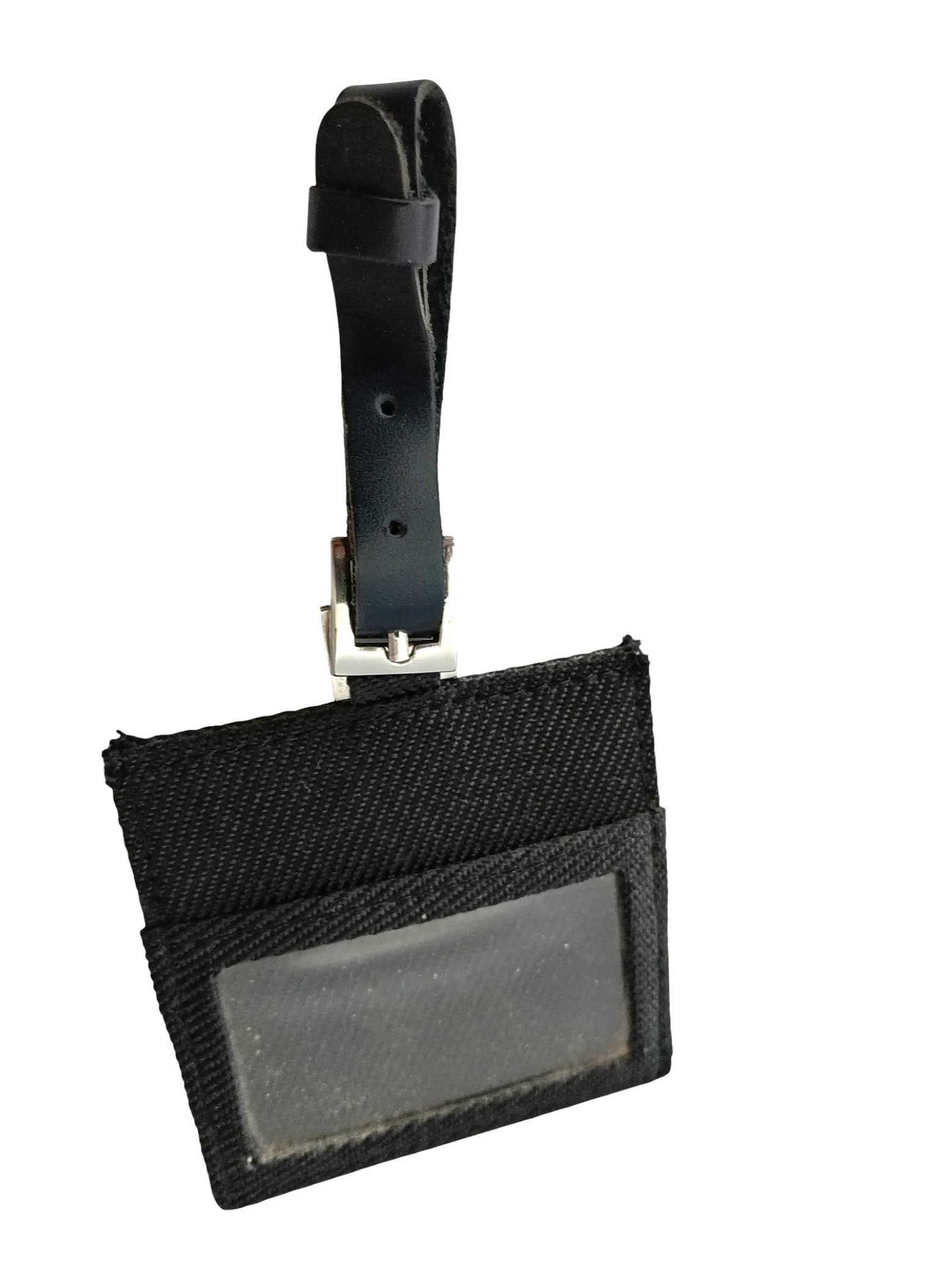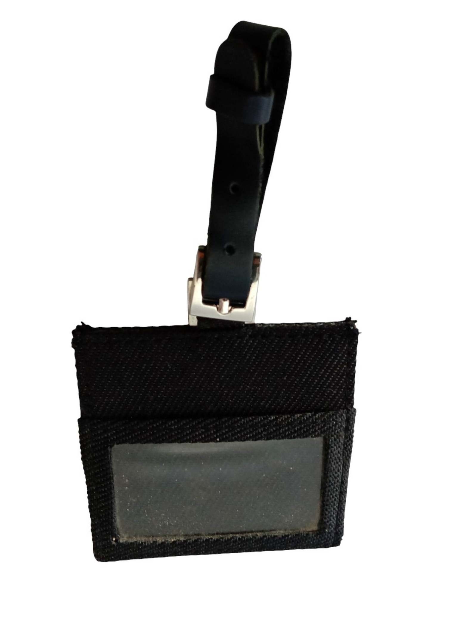 Identificador Vintage de Loewe,para maletas o bolsos,elaborado en lona negra con el anagrama bordado de Loewe en color marron.La parte trasera lleva un bolsillo plano transparente para poner la identificación.Correa de cuero ajustable .Muy buen estado,con su caja y funda.medidas 7,5 x 7,5 cms.