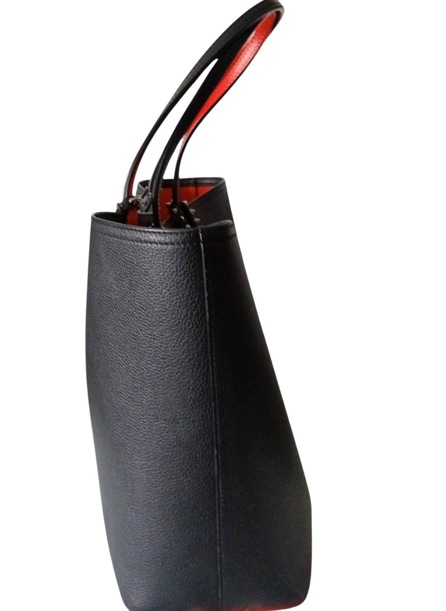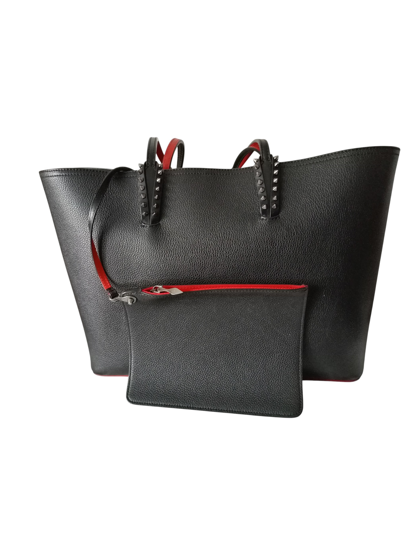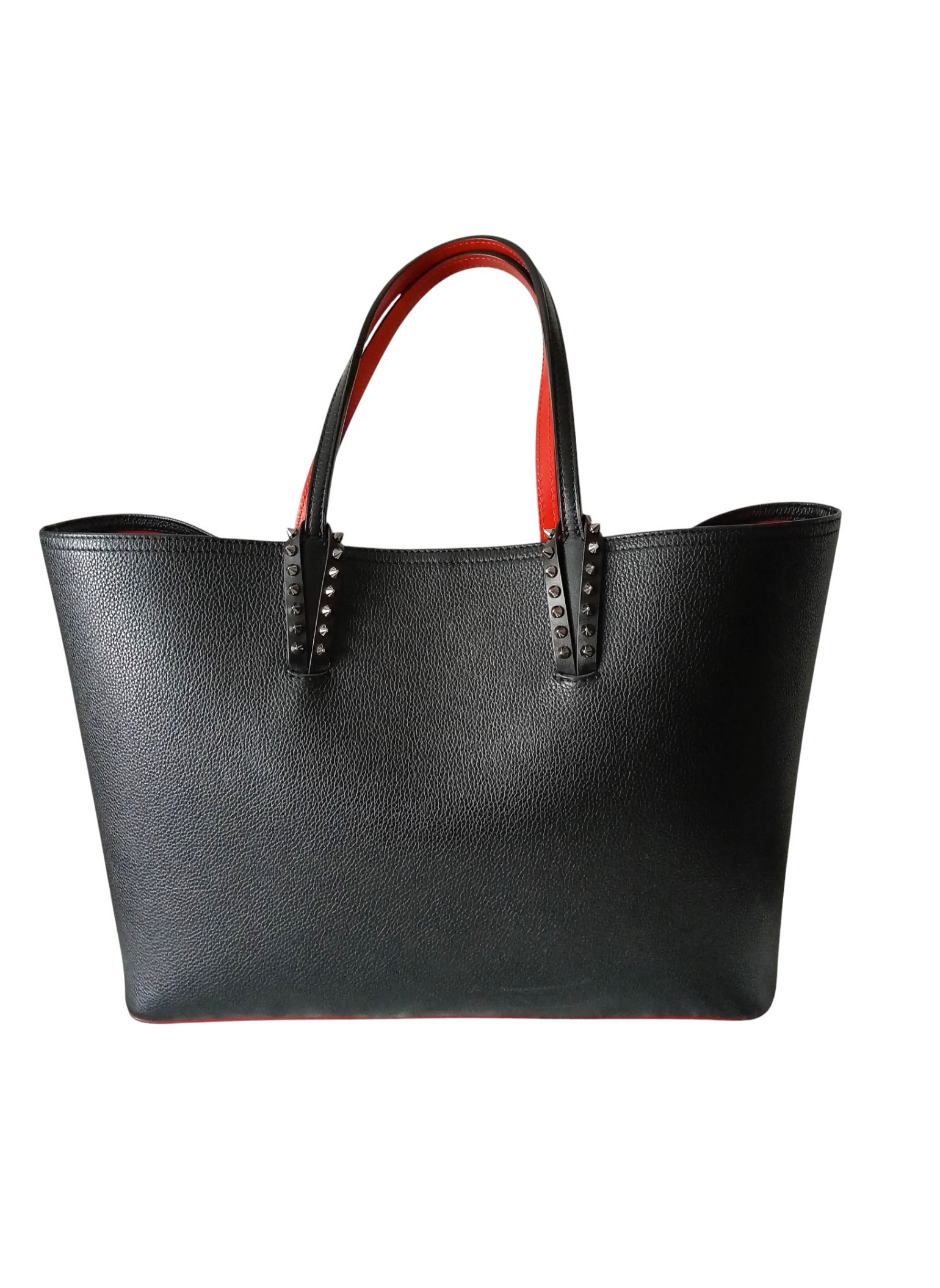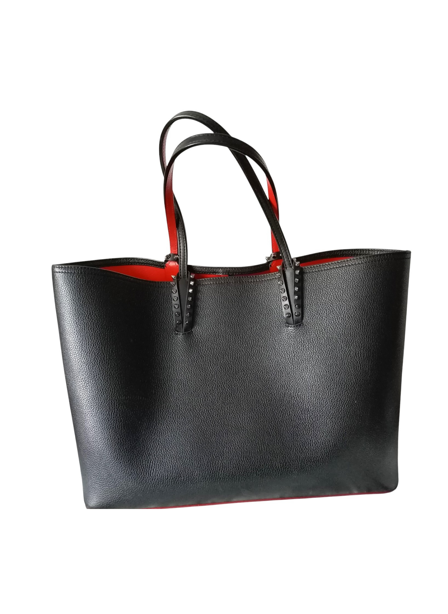 Bolso tote de Christian Louboutin,modelo "Cabata",elaborado en piel negra granulada con detalles de tachuelas plateadas adornando los refuerzos de las asas.Dos asas de piel para hombro o mano.Interior de piel roja tipica de la firma.Base de goma roja.Lleva un pouch interior a juego que se puede extraer.Esta en muy buen estado.Medidas:37 cms de ancho x 29 cms de alto x 14 cms de profundidad.