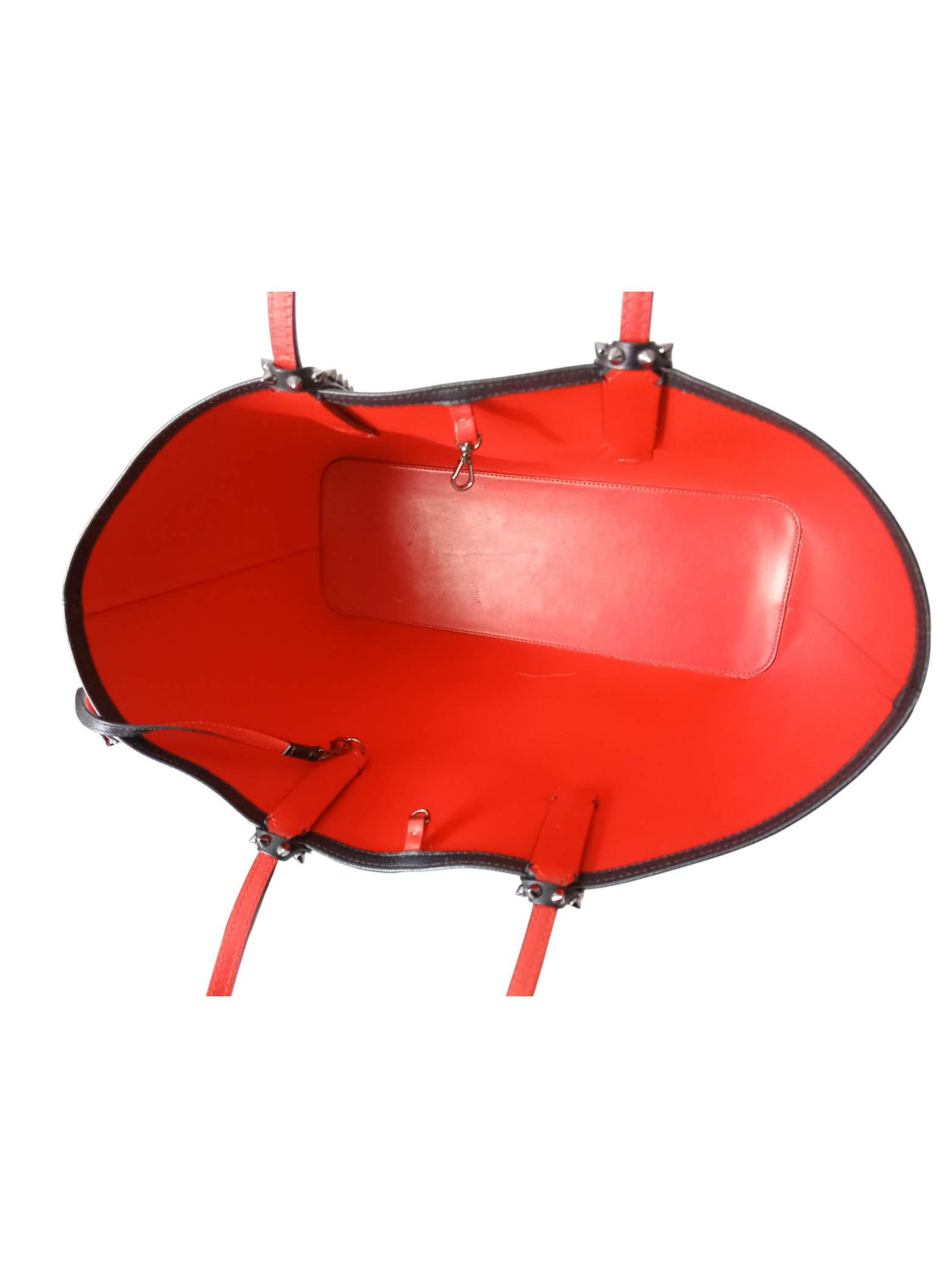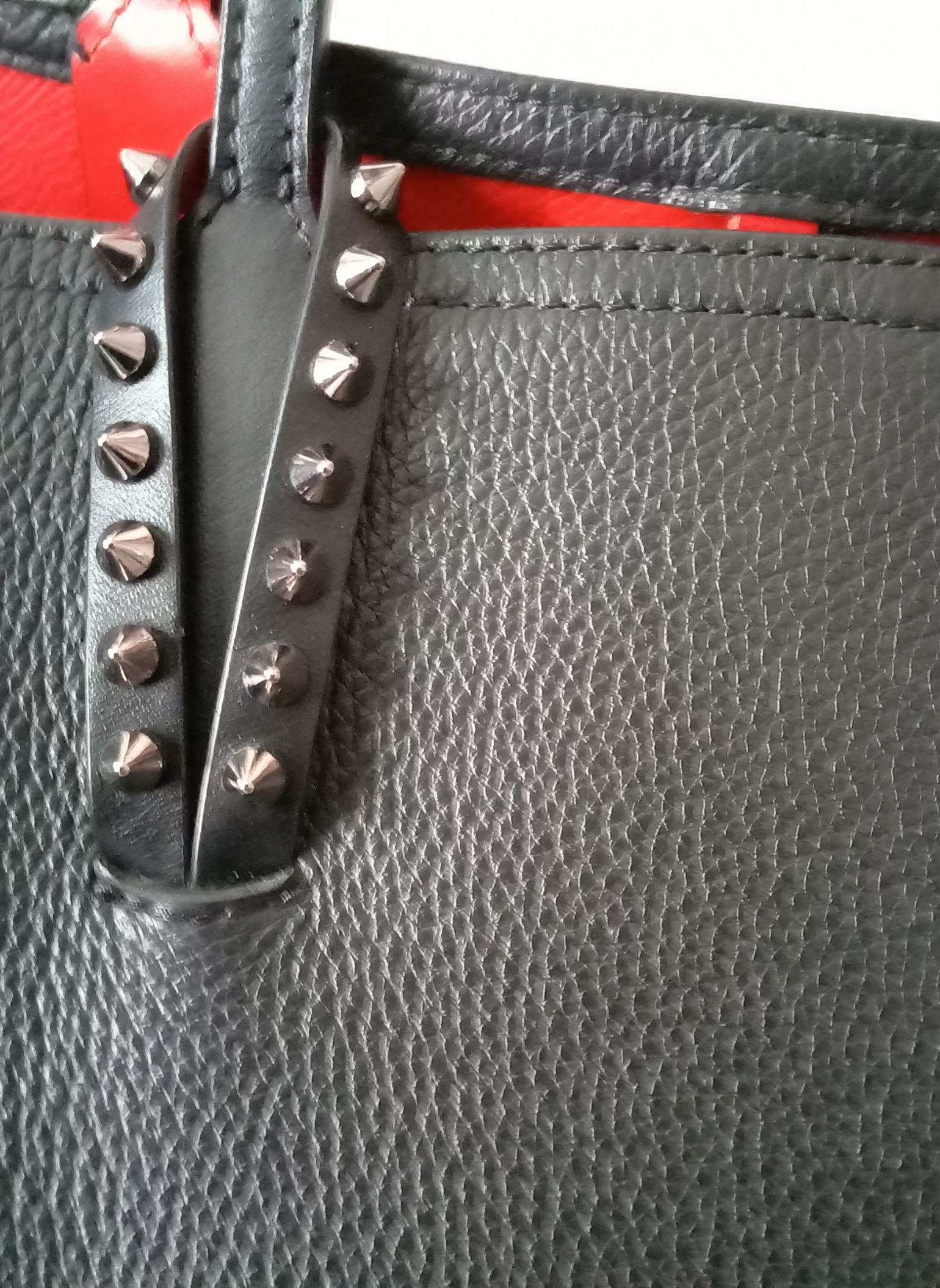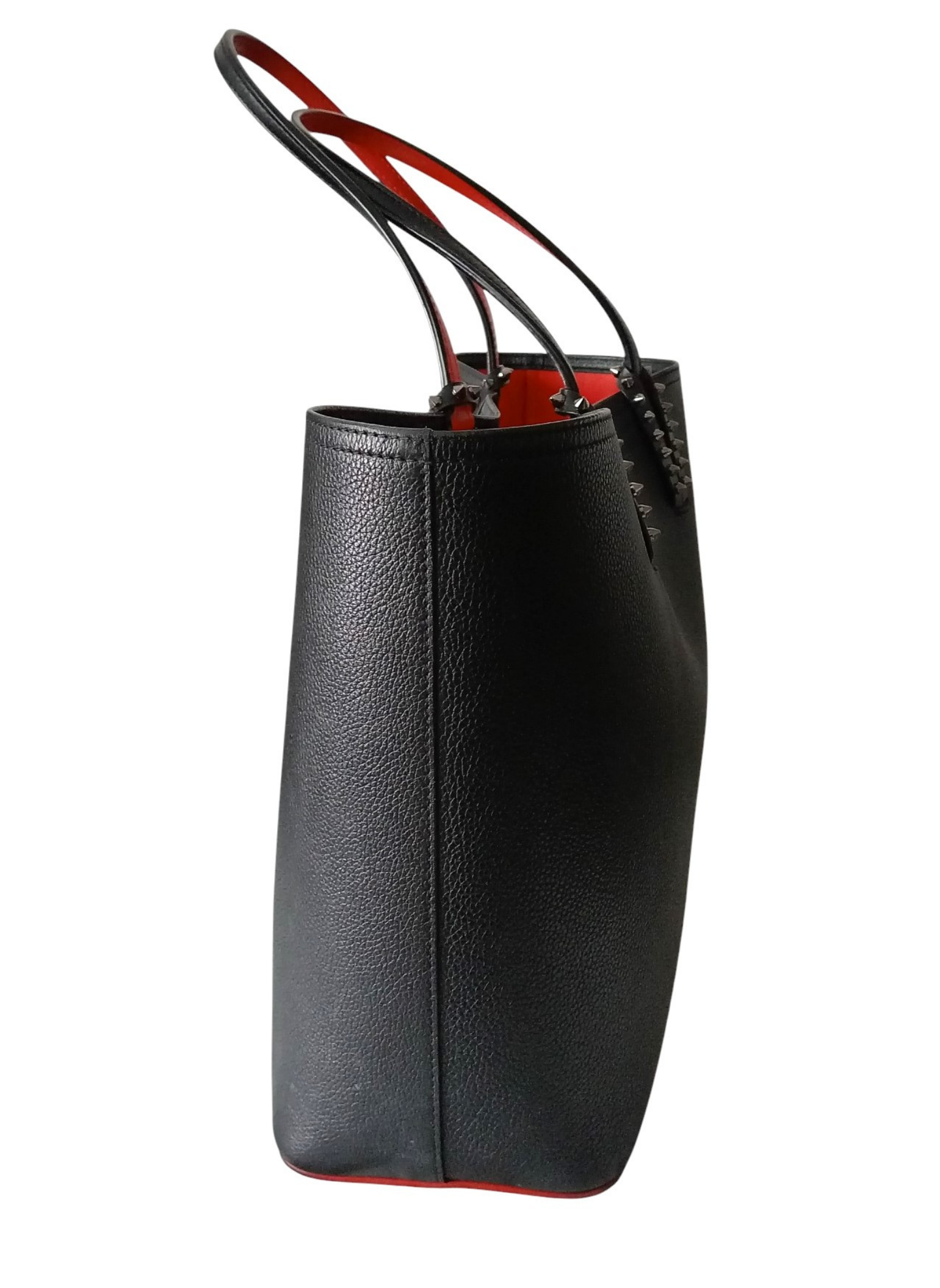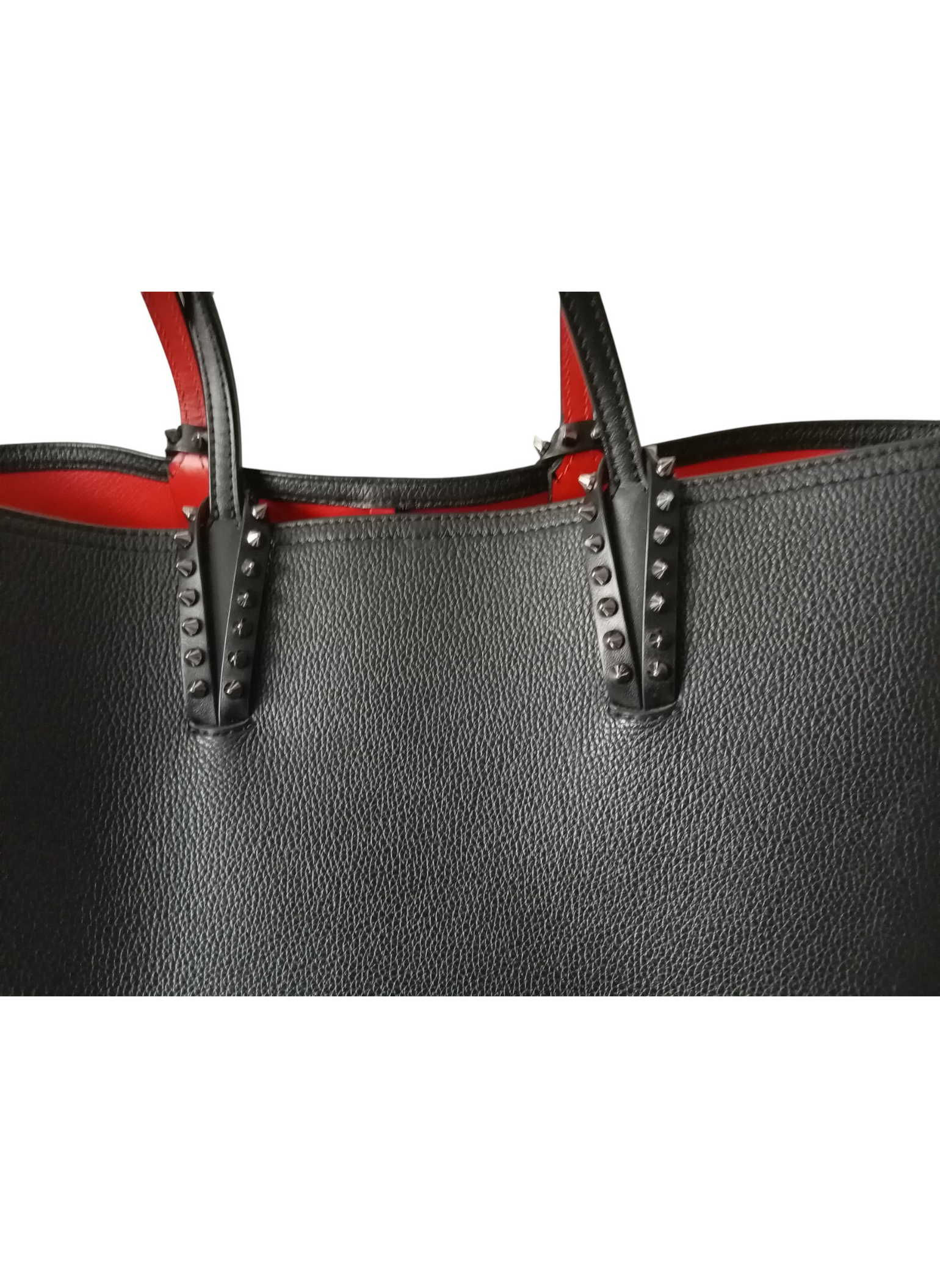 Bolso tote de Christian Louboutin,modelo "Cabata",elaborado en piel negra granulada con detalles de tachuelas plateadas adornando los refuerzos de las asas.Dos asas de piel para hombro o mano.Interior de piel roja tipica de la firma.Base de goma roja.Lleva un pouch interior a juego que se puede extraer.Esta en muy buen estado.Medidas:37 cms de ancho x 29 cms de alto x 14 cms de profundidad.