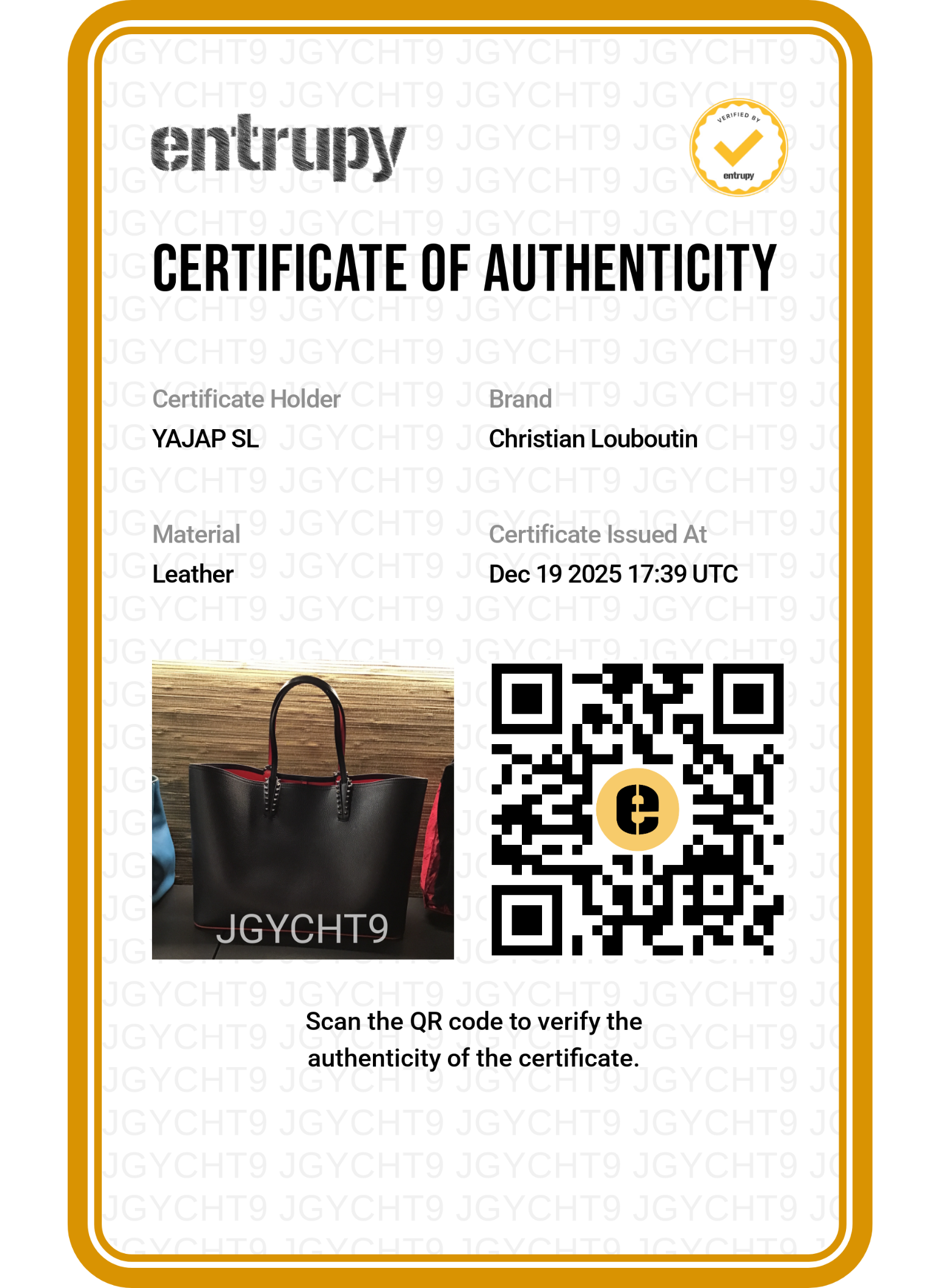 Certificado de autenticidad Entrupy : JGYCHT9