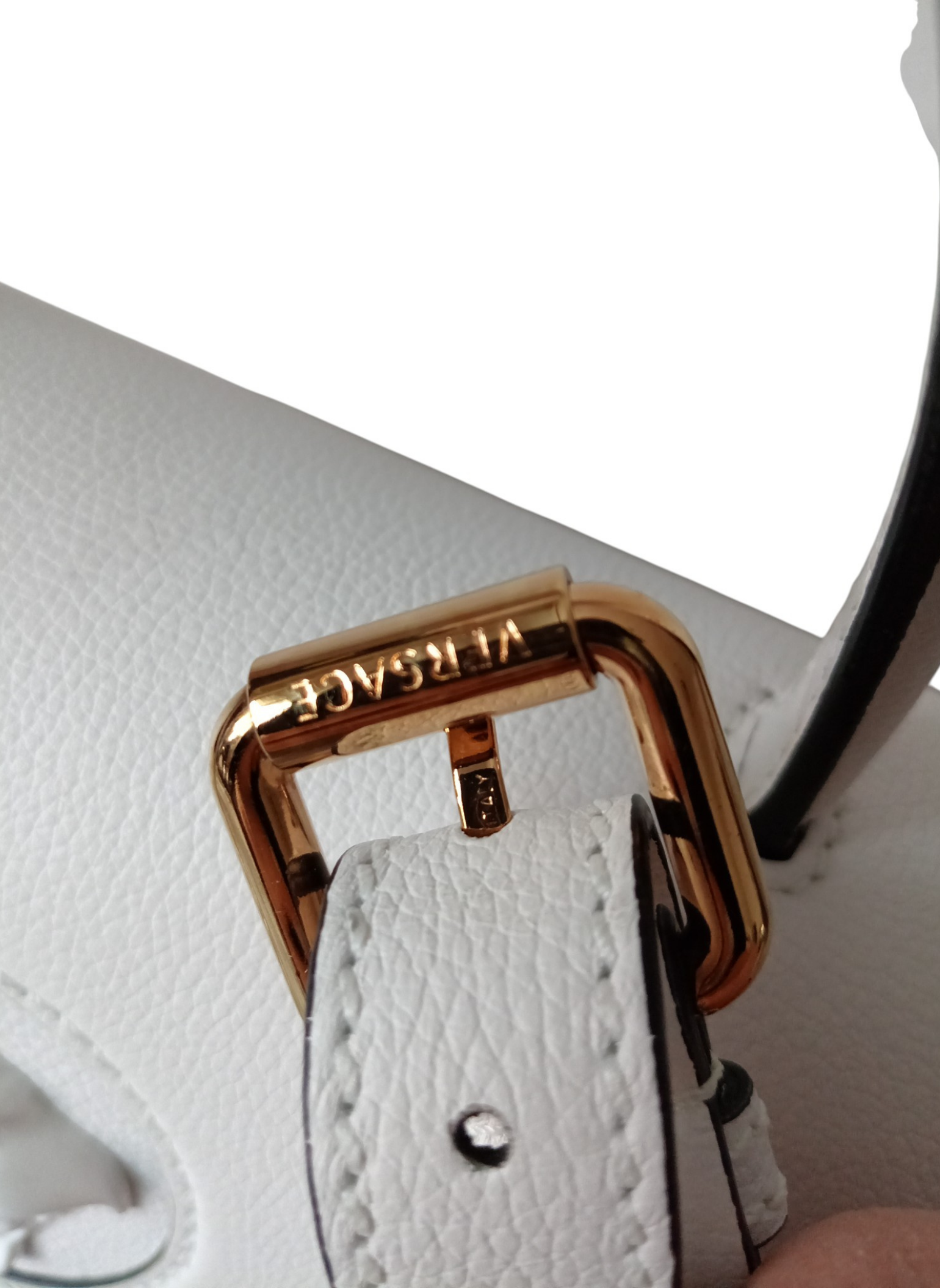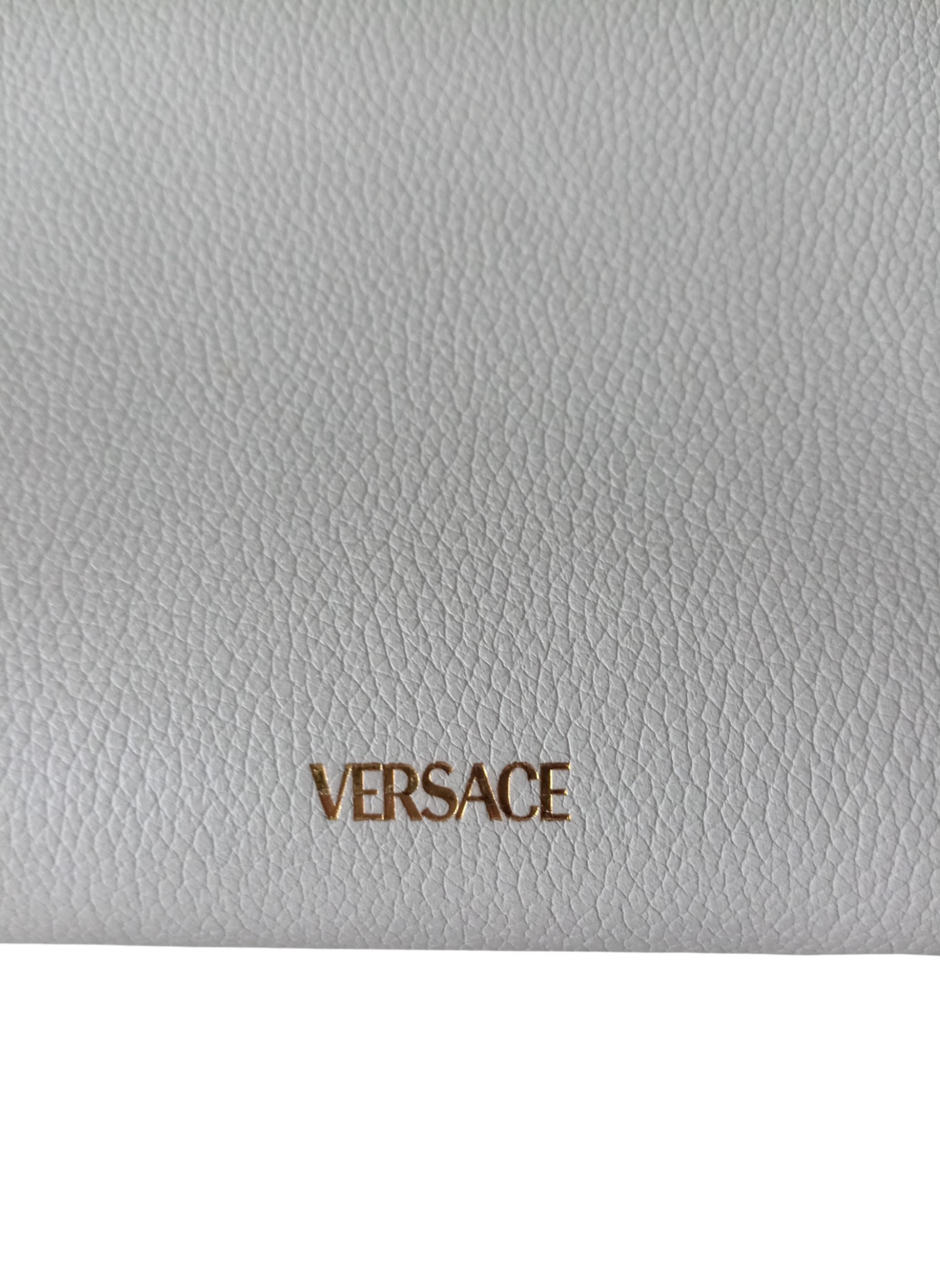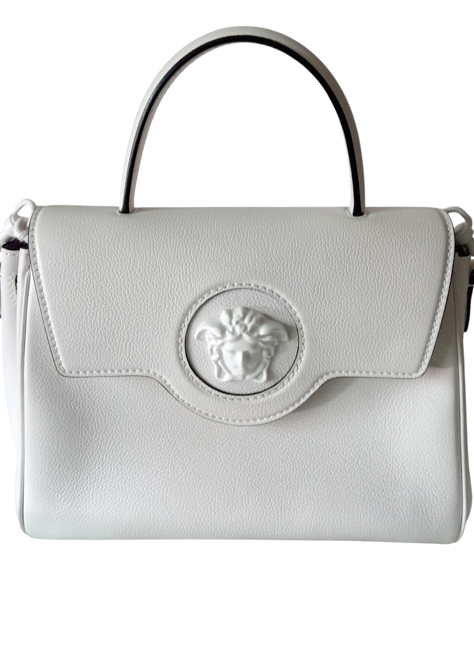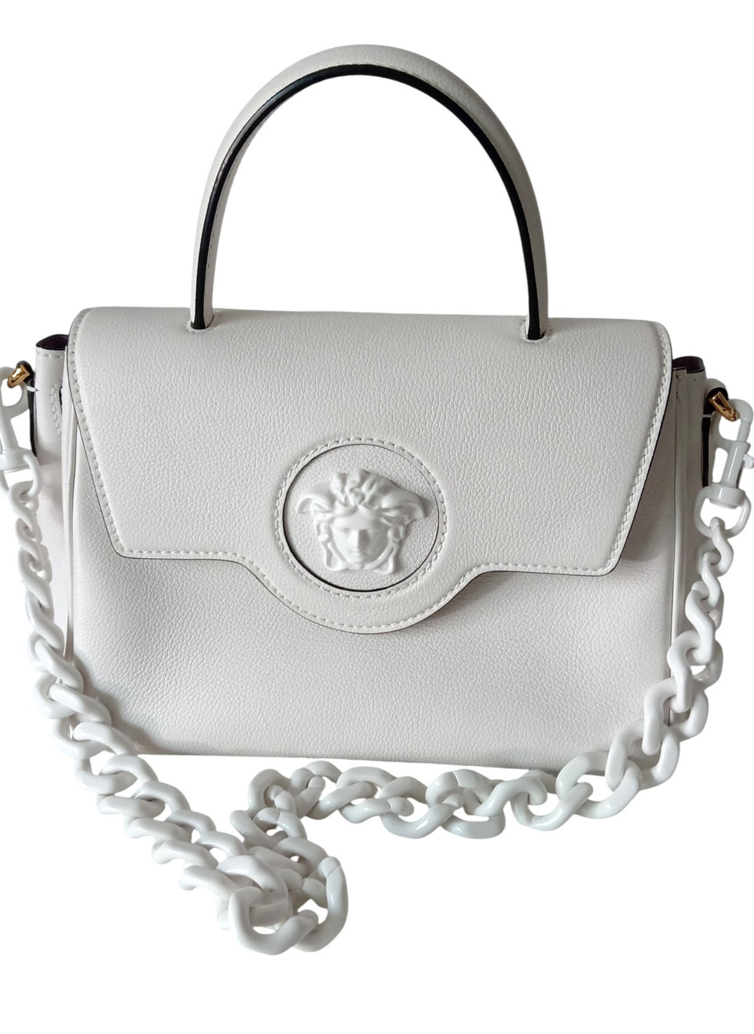 Bolso de Versace "La Medusa",en piel de becerro granulada color blanco.Presenta la icónica medusa en la parte delantera, típica de la firma.Tiene un asa para mano, también tiene una correa ajustable y extraible para llevar cruzado y una cadena blanca extraible para el hombro.Herrajes dorados y cierre de solapa con botón magnético.Interior de piel morada con un bolsillo con cremallera y dos bolsillos planos.Esta en muy buen estado.Medidas: 25 cms de ancho x 17 cms de alto x 12 cms de profundidad.