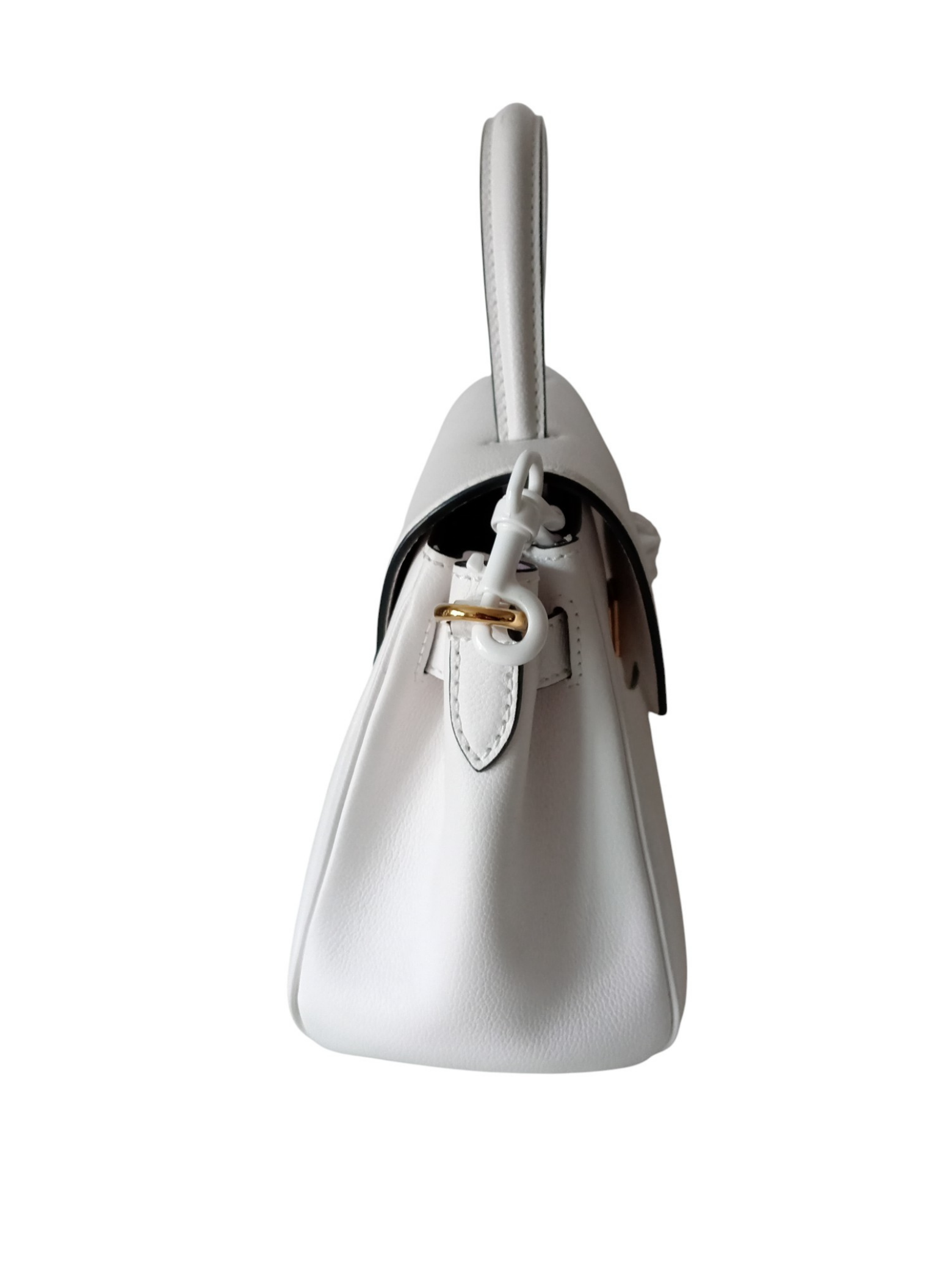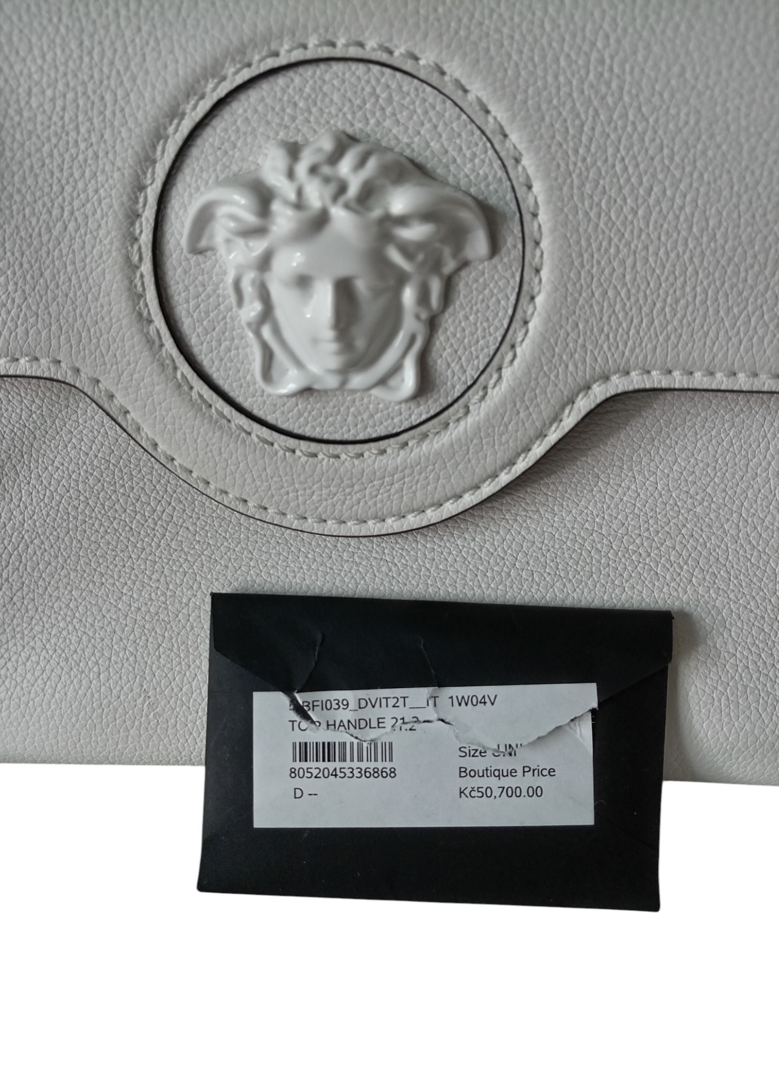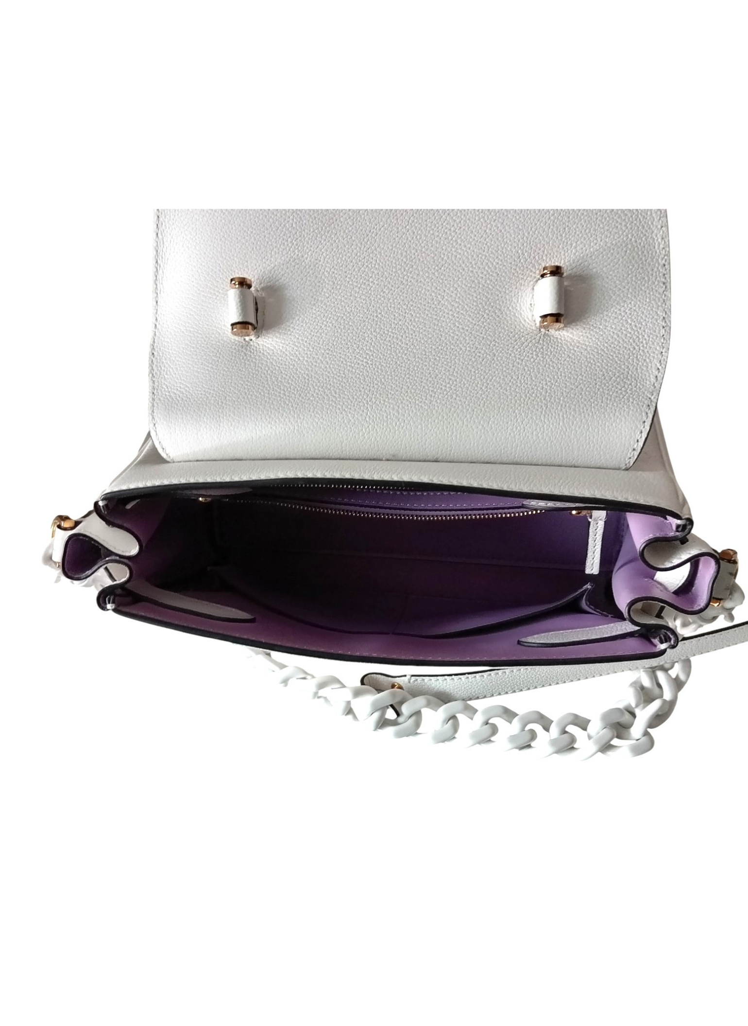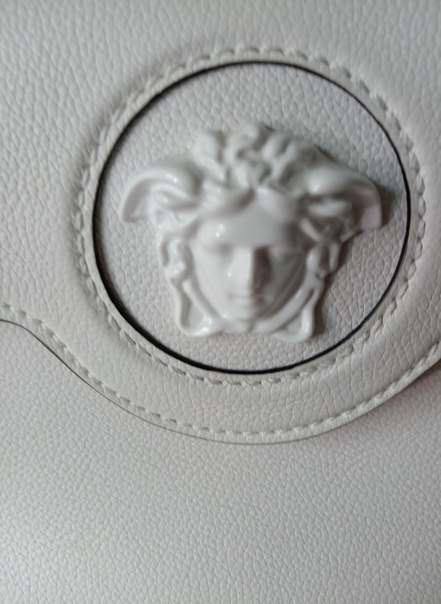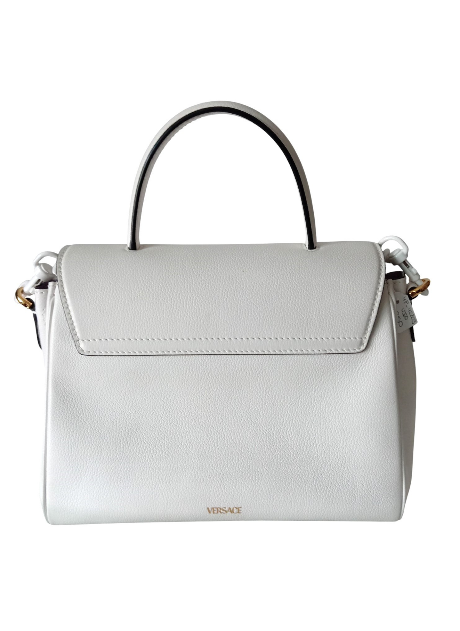 Bolso de Versace "La Medusa",en piel de becerro granulada color blanco.Presenta la icónica medusa en la parte delantera, típica de la firma.Tiene un asa para mano, también tiene una correa ajustable y extraible para llevar cruzado y una cadena blanca extraible para el hombro.Herrajes dorados y cierre de solapa con botón magnético.Interior de piel morada con un bolsillo con cremallera y dos bolsillos planos.Esta en muy buen estado.Medidas: 25 cms de ancho x 17 cms de alto x 12 cms de profundidad.