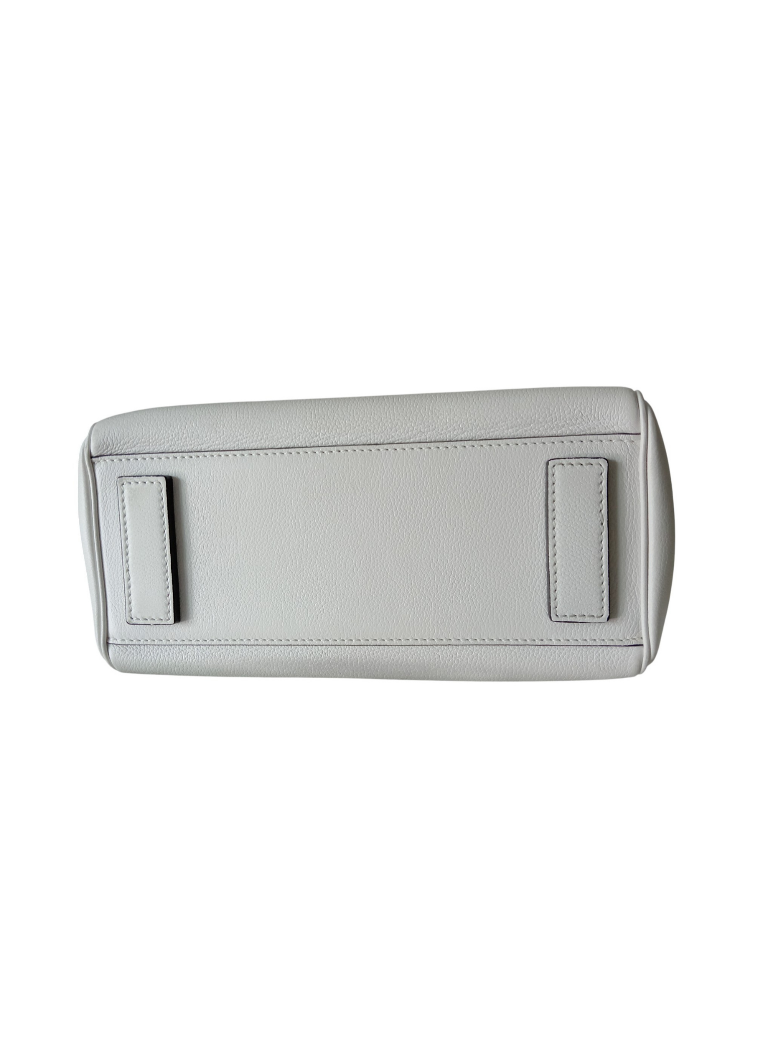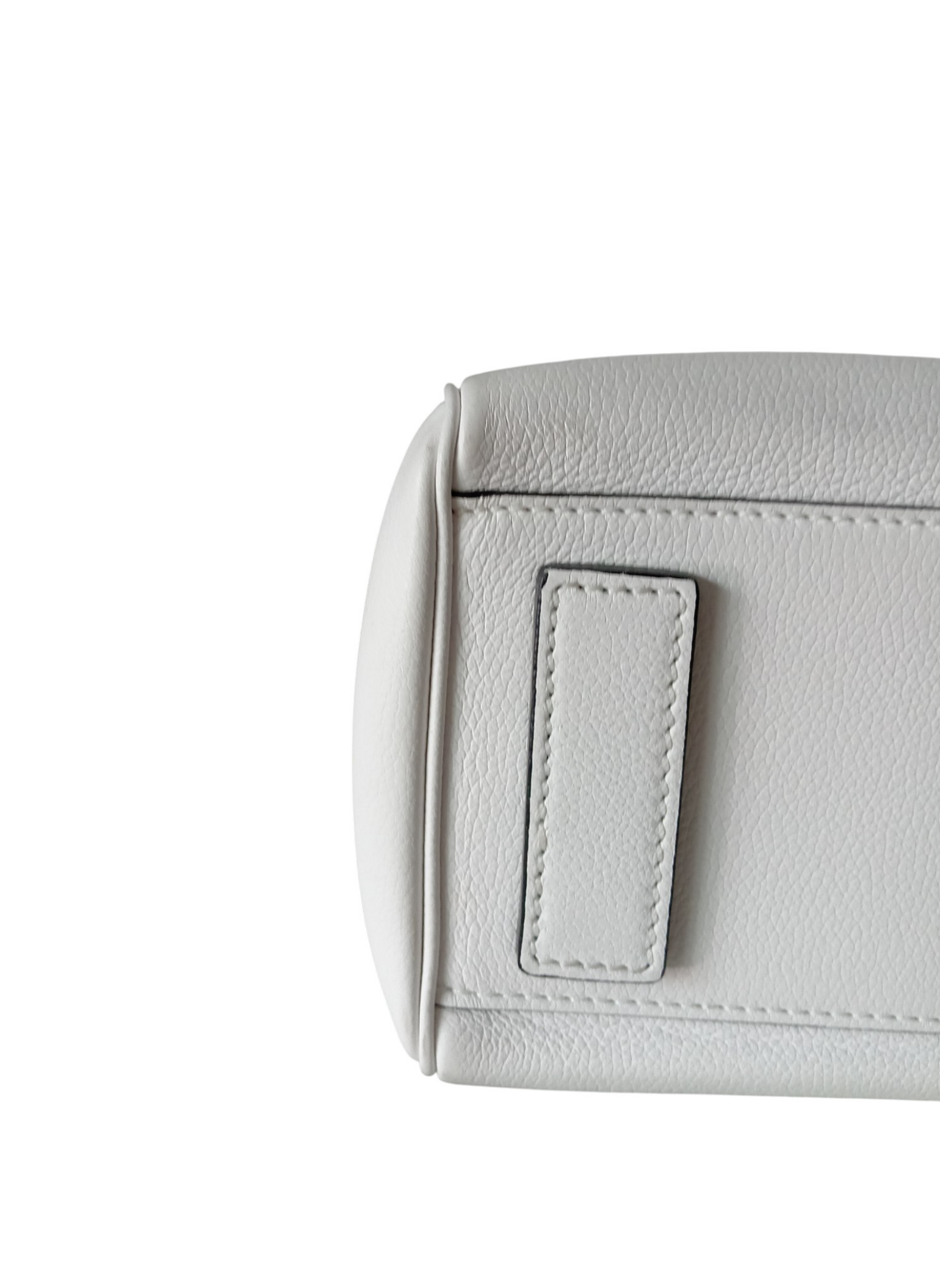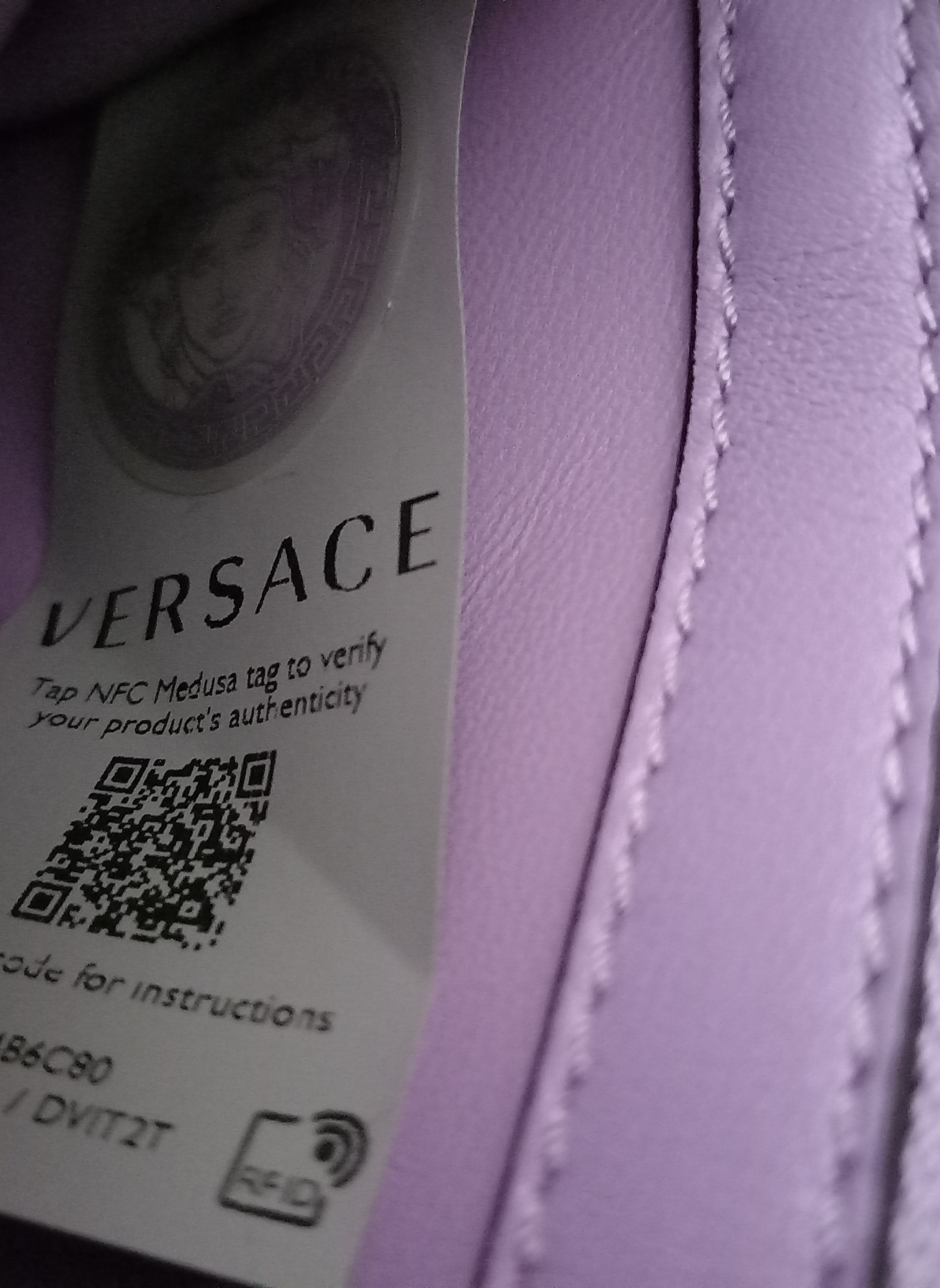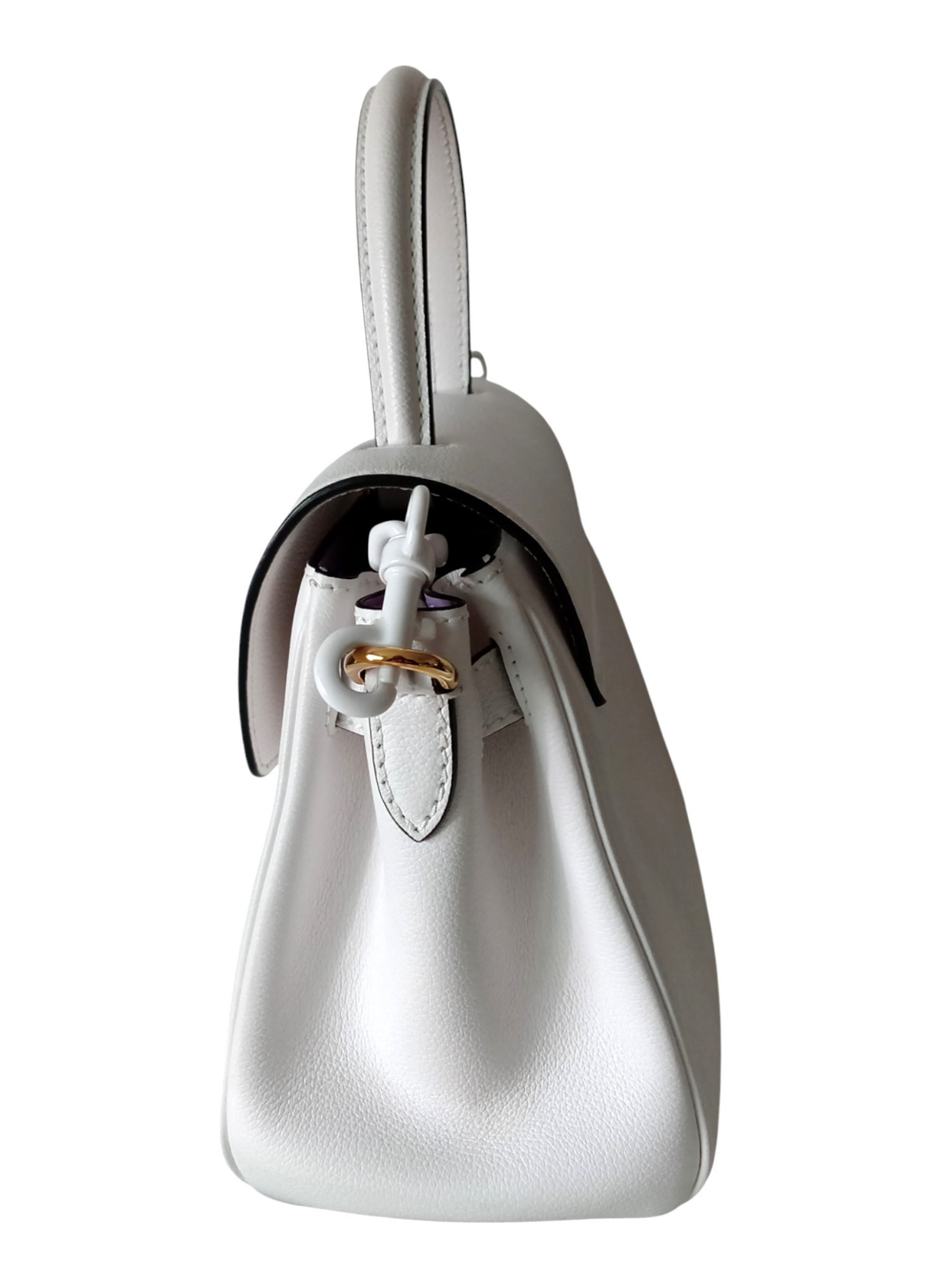 Bolso de Versace "La Medusa",en piel de becerro granulada color blanco.Presenta la icónica medusa en la parte delantera, típica de la firma.Tiene un asa para mano, también tiene una correa ajustable y extraible para llevar cruzado y una cadena blanca extraible para el hombro.Herrajes dorados y cierre de solapa con botón magnético.Interior de piel morada con un bolsillo con cremallera y dos bolsillos planos.Esta en muy buen estado.Medidas: 25 cms de ancho x 17 cms de alto x 12 cms de profundidad.