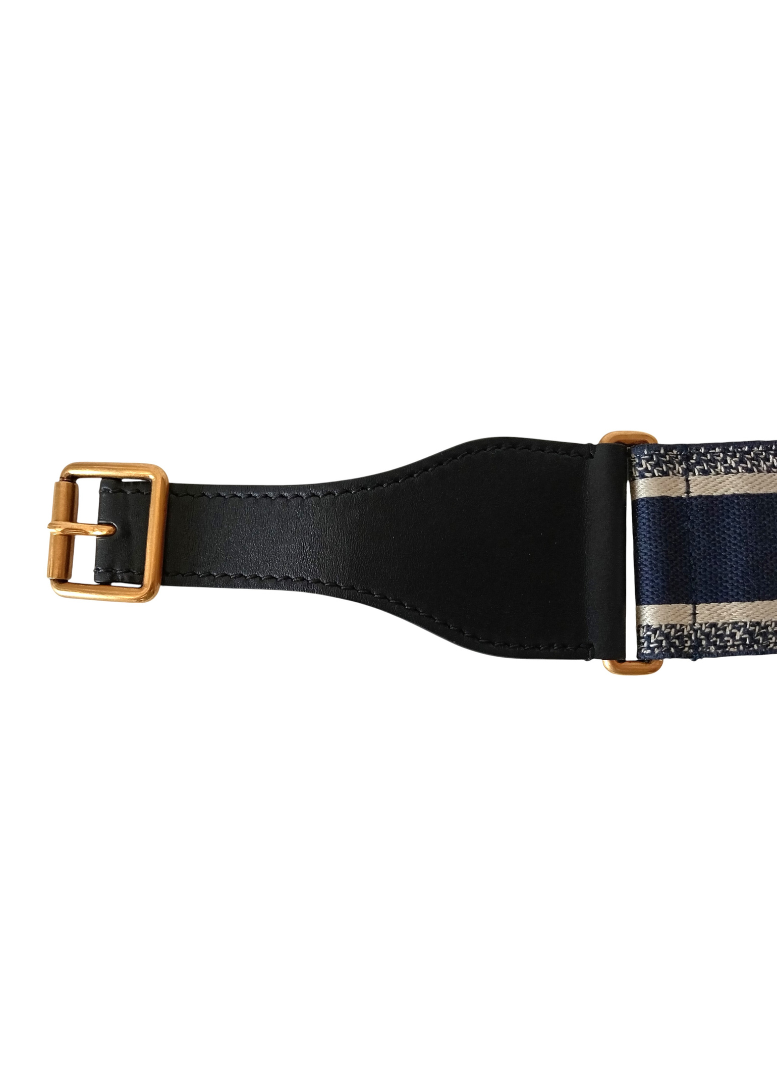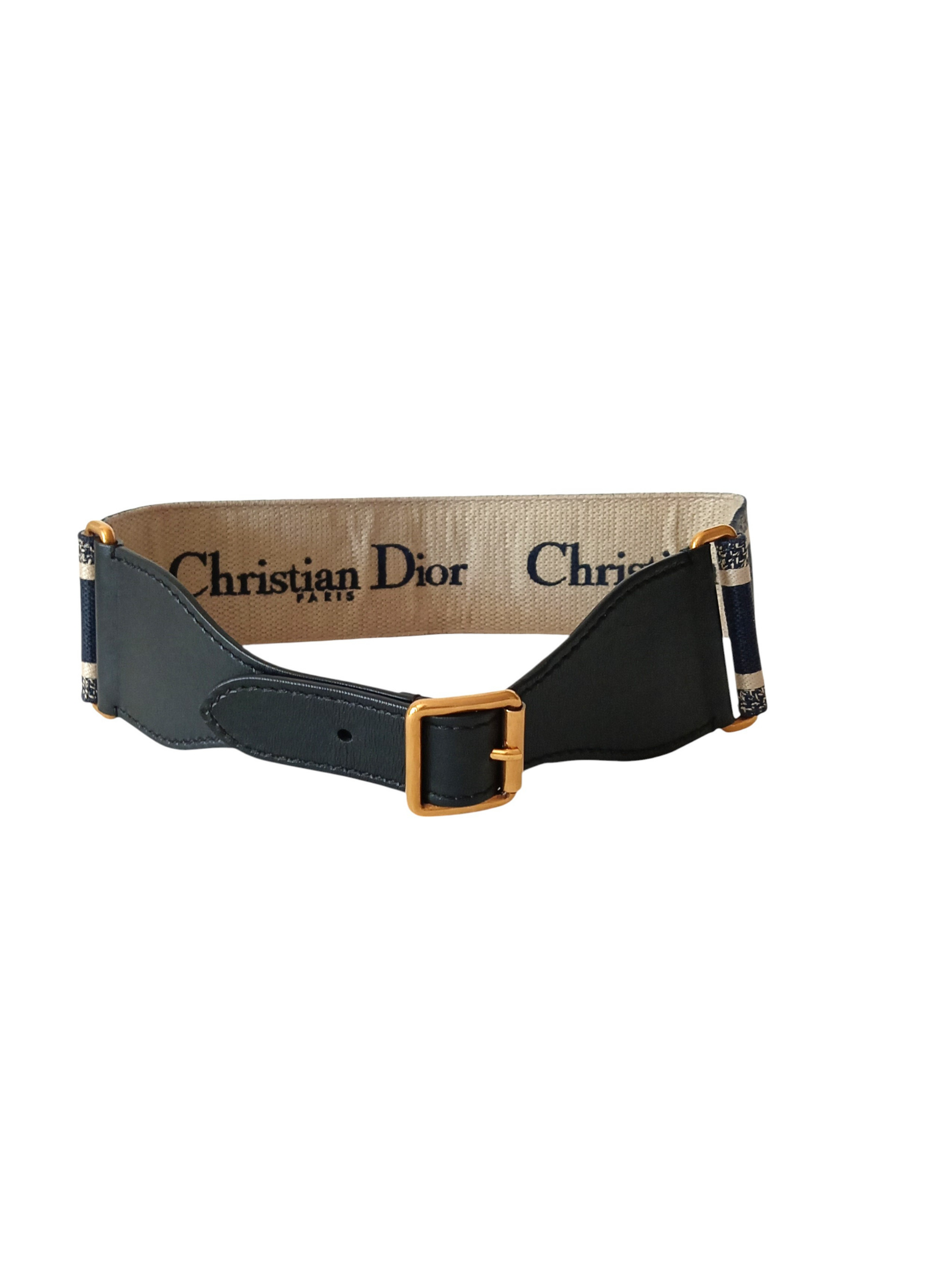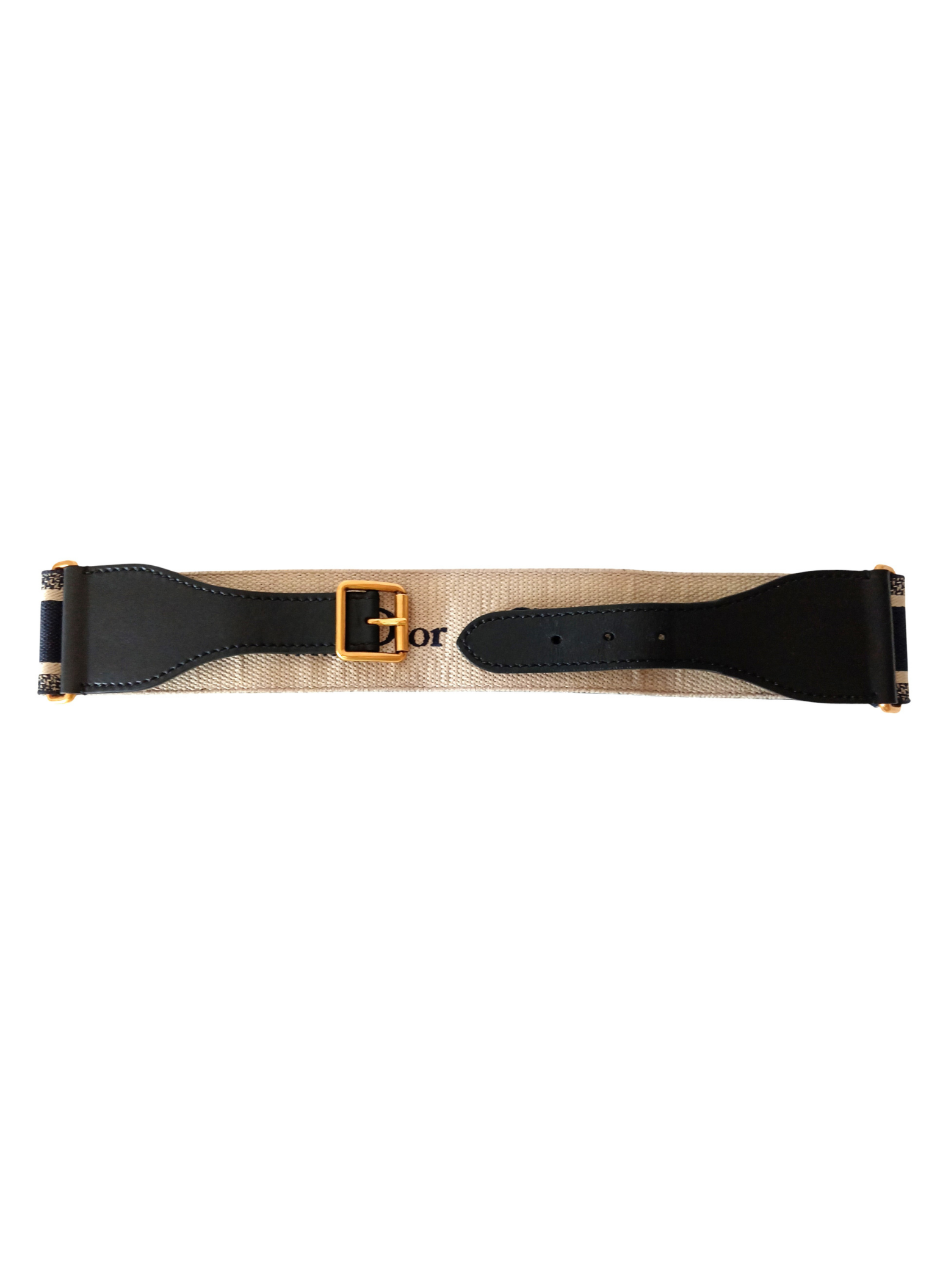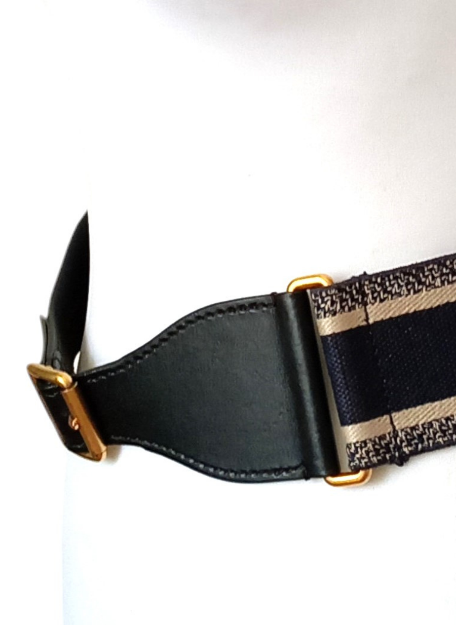 Cinturón ancho de lona y piel de Christian Dior.Con la firma de Christian Dior bordado en el centro en el interior y en el exterior,correas de piel negra en la parte delantera con hebilla dorada.Muy buen estado Medidas: 75 cms desde la hebilla hasta el agujero central x 6 cms de ancho.
