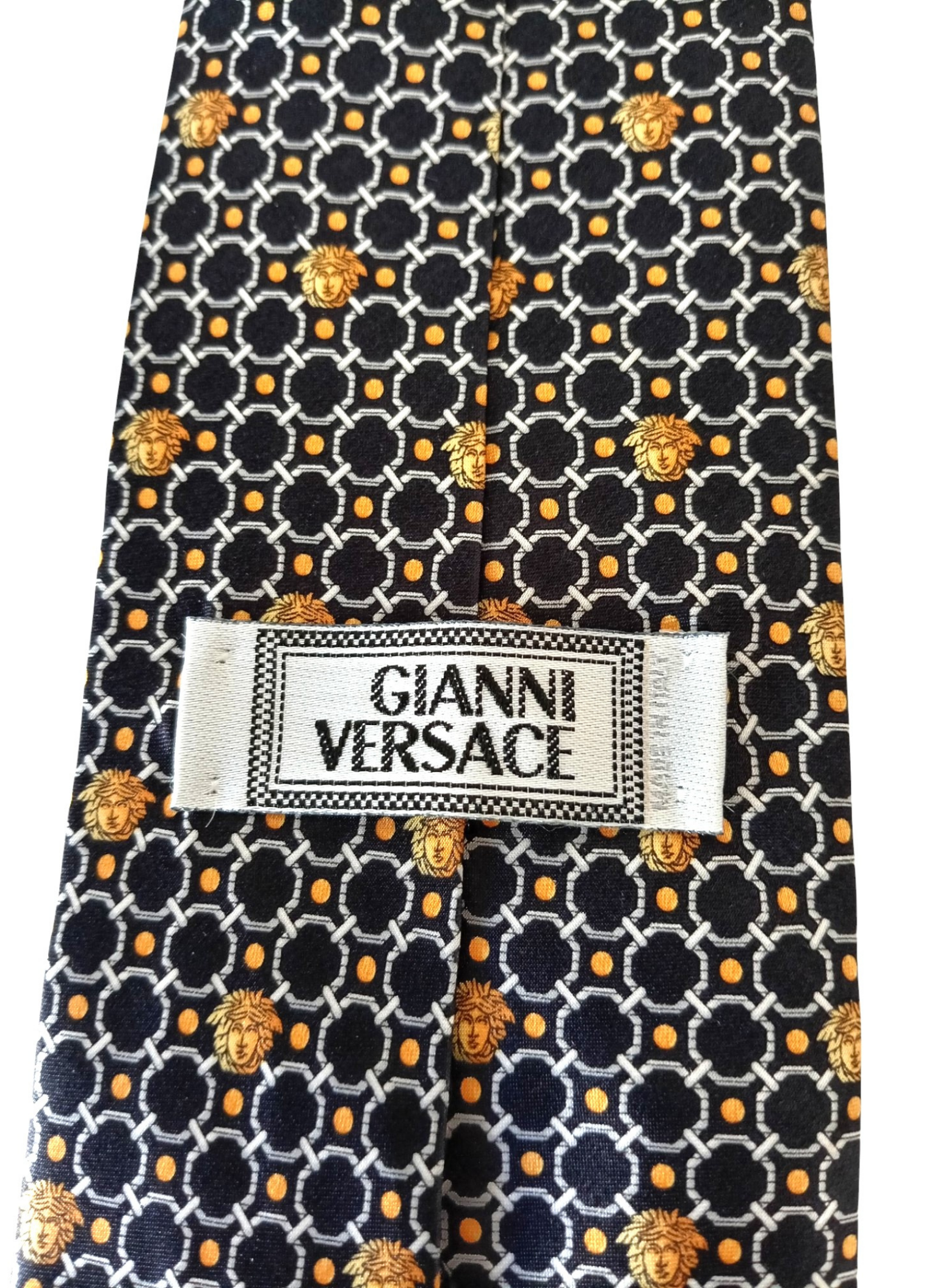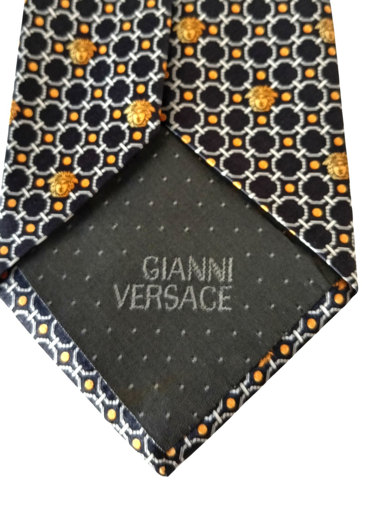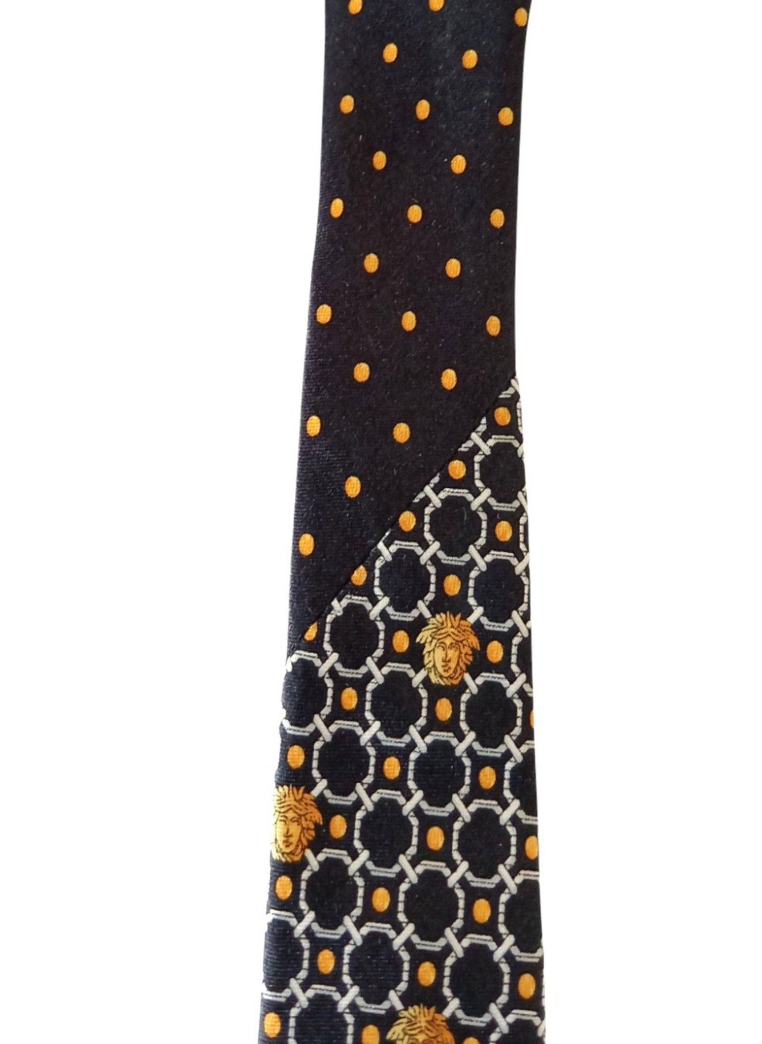 Corbata de Gianni versace.100% seda,con fondo negro,circulos blancos y medusas amarillas.la parte de atras fondo negro con lunares amarillos.Muy buen estado.Mide por la parte mas ancha 9 cms