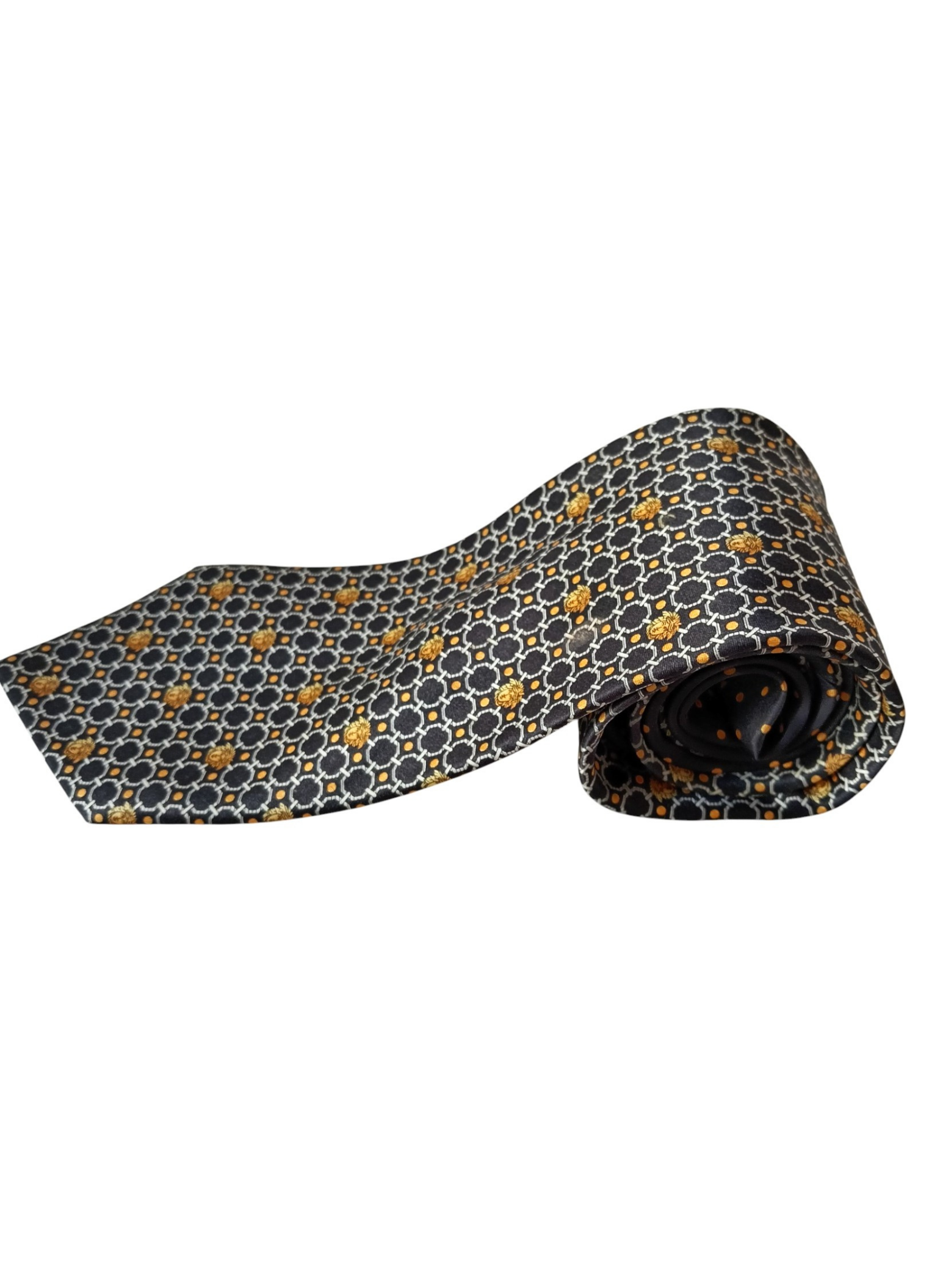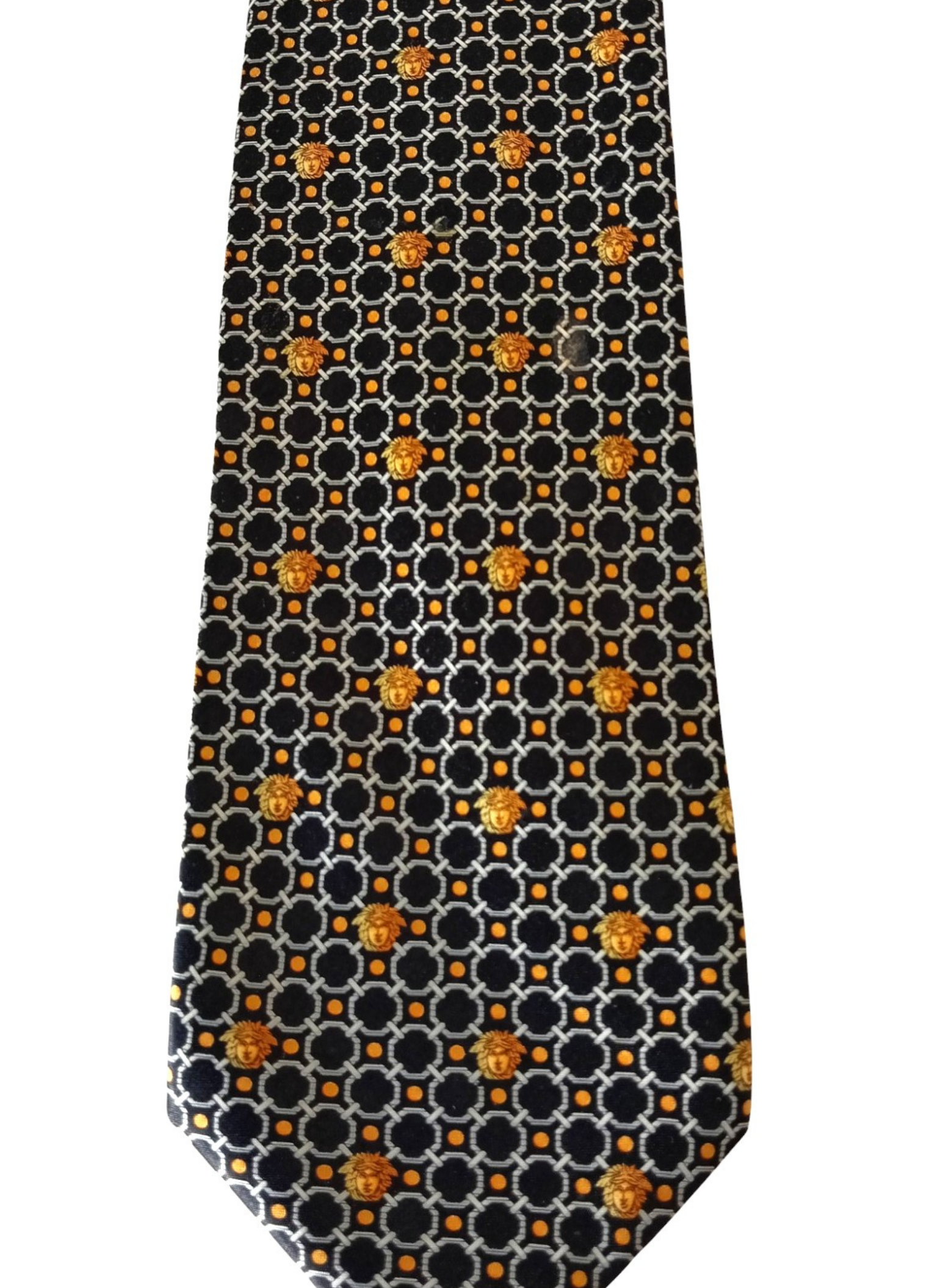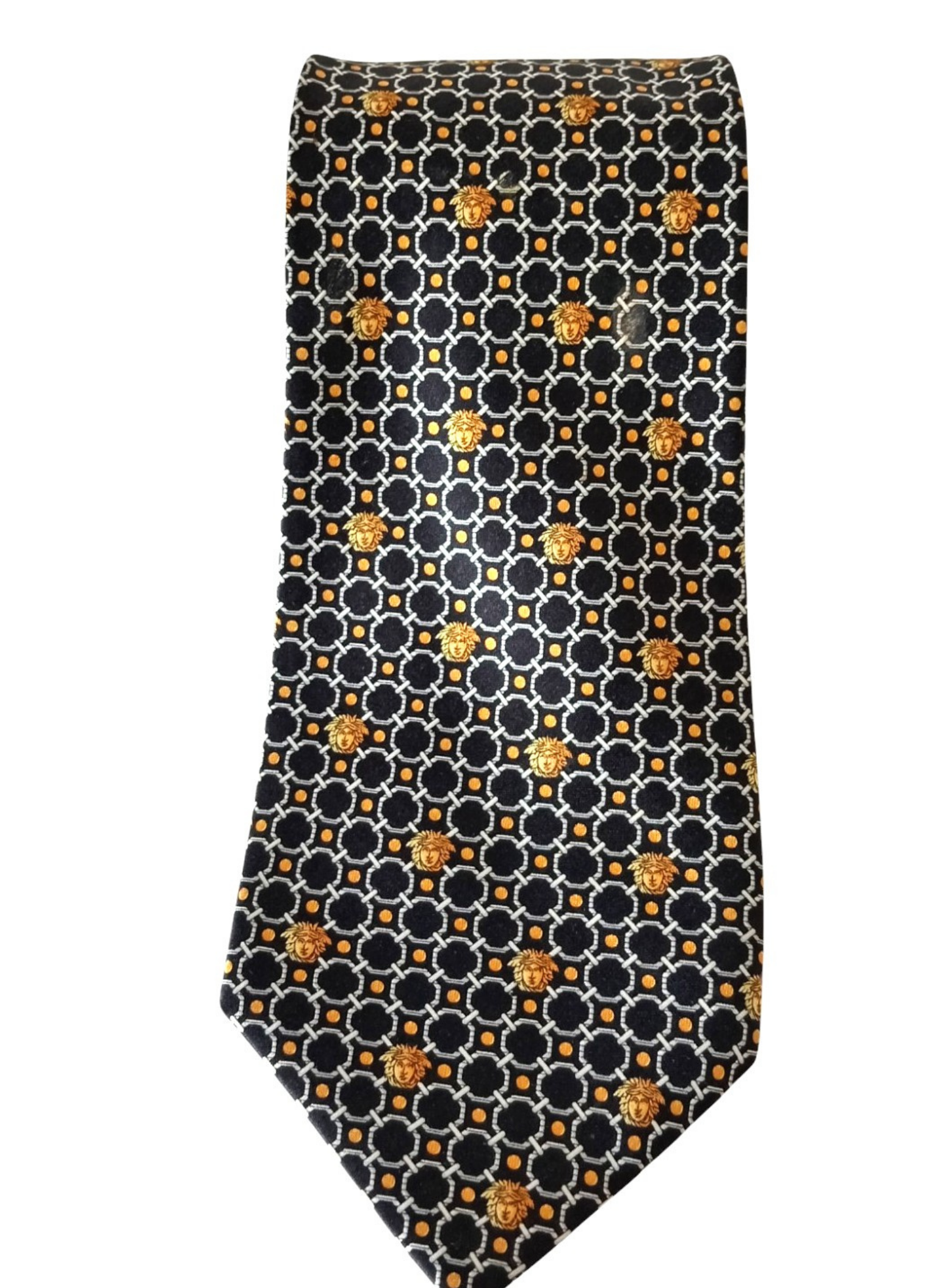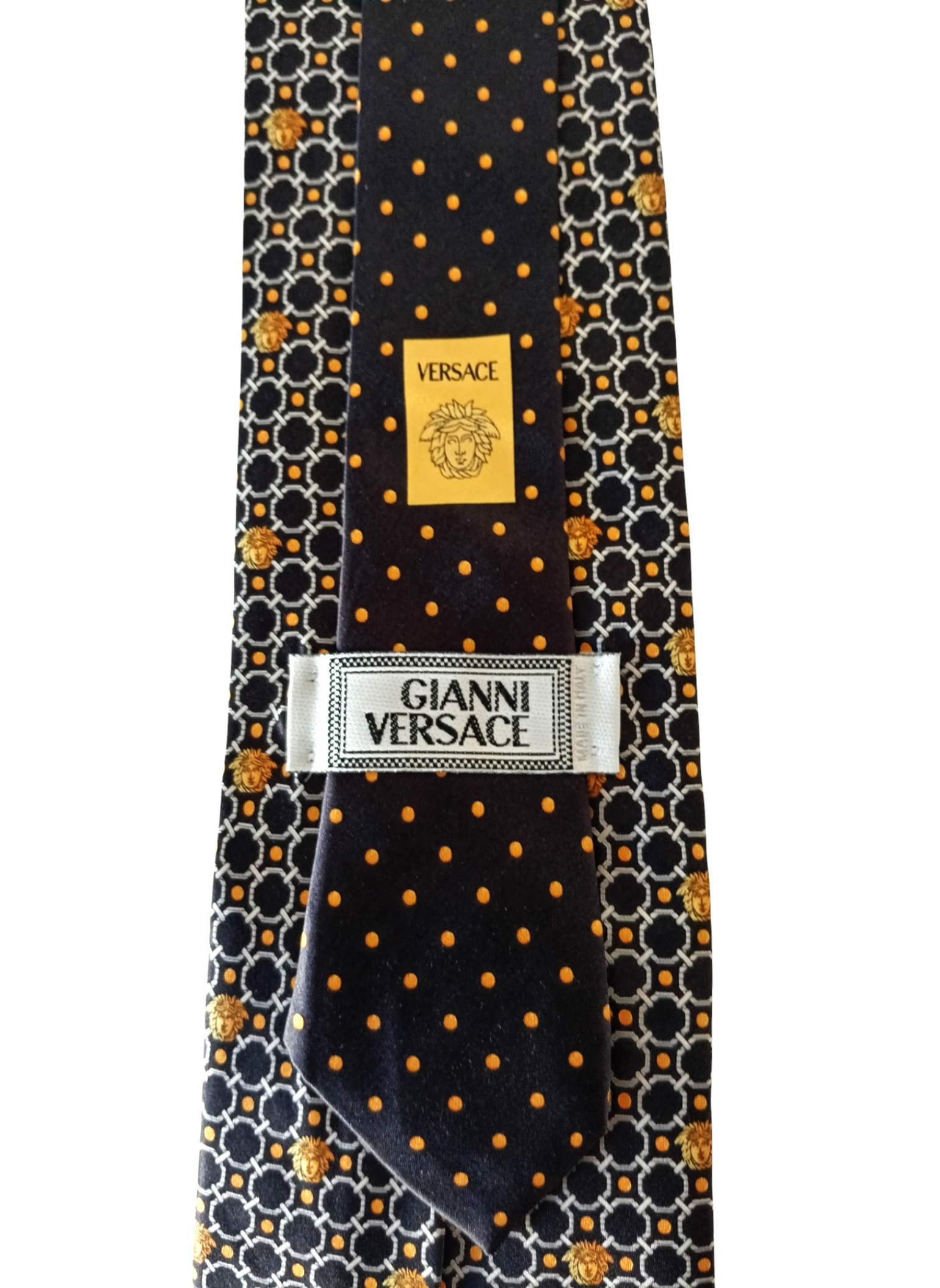Corbata de Gianni versace.100% seda,con fondo negro,circulos blancos y medusas amarillas.la parte de atras fondo negro con lunares amarillos.Muy buen estado.Mide por la parte mas ancha 9 cms
