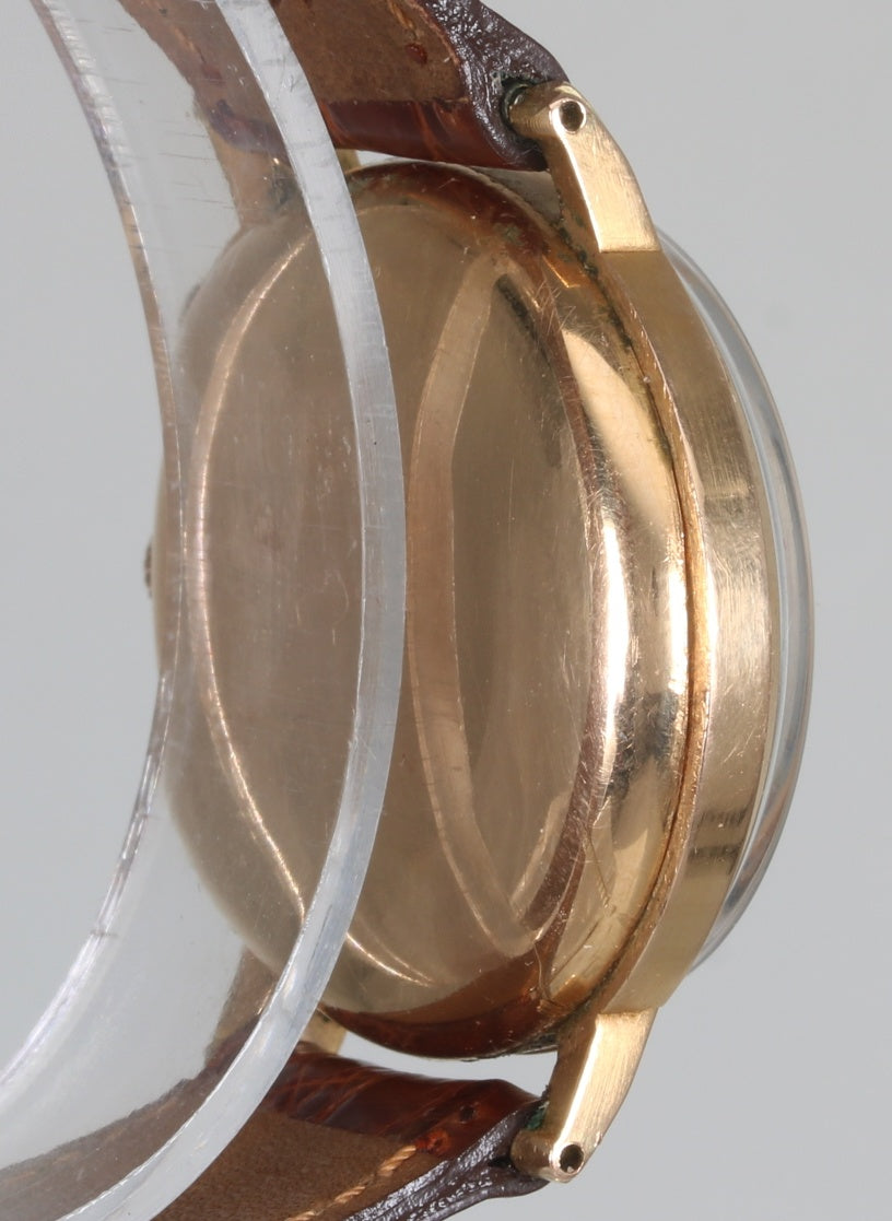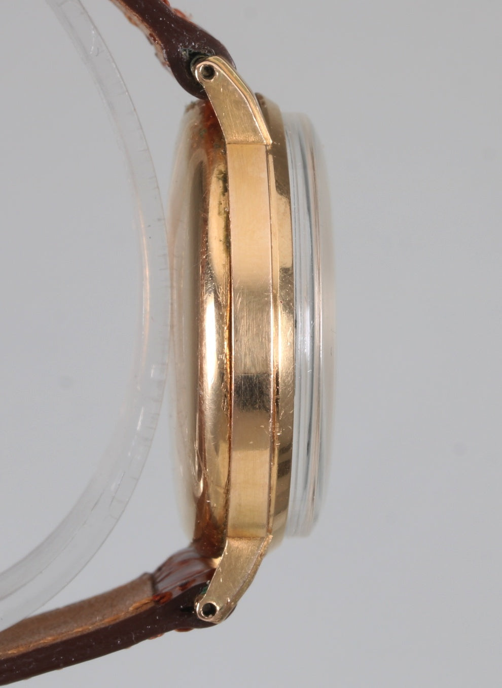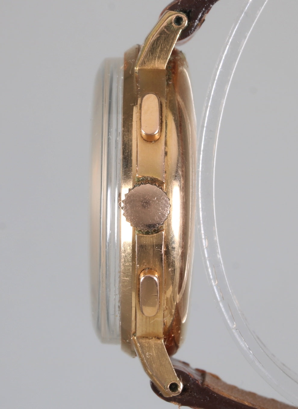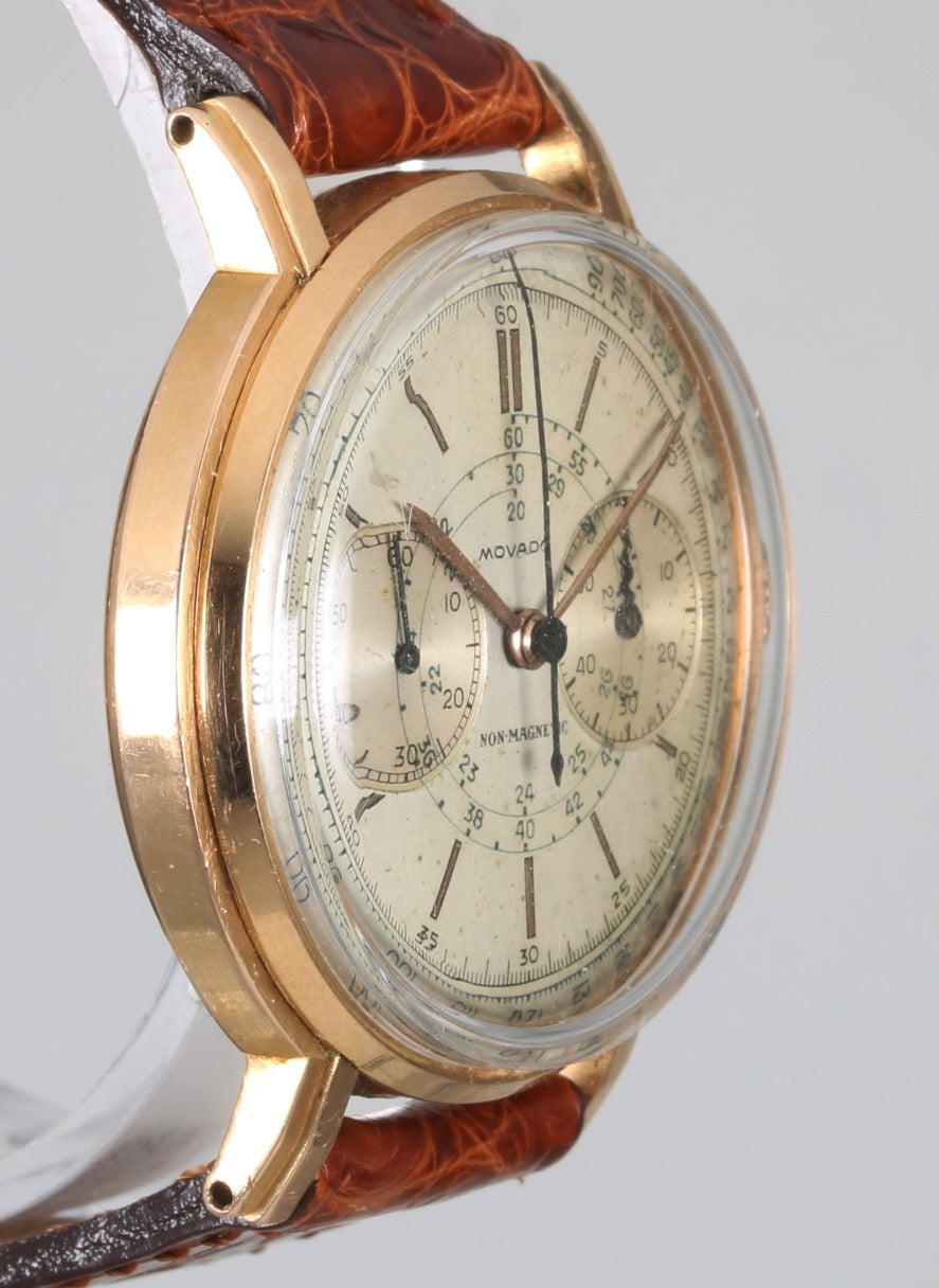 Excelente cronógrafo Movado de los años 40 con caja de oro rosa 18kt sin pulir y cristal mineral. Movimiento de cuerda. Del cronógrafo funcionan correctamente tres funciones (start, stop, reset). La esfera tiene ligeras señales del paso del tiempo. Incluye correa nueva de piel. Al ser un reloj vintage no podemos garantizar su resistencia al agua.