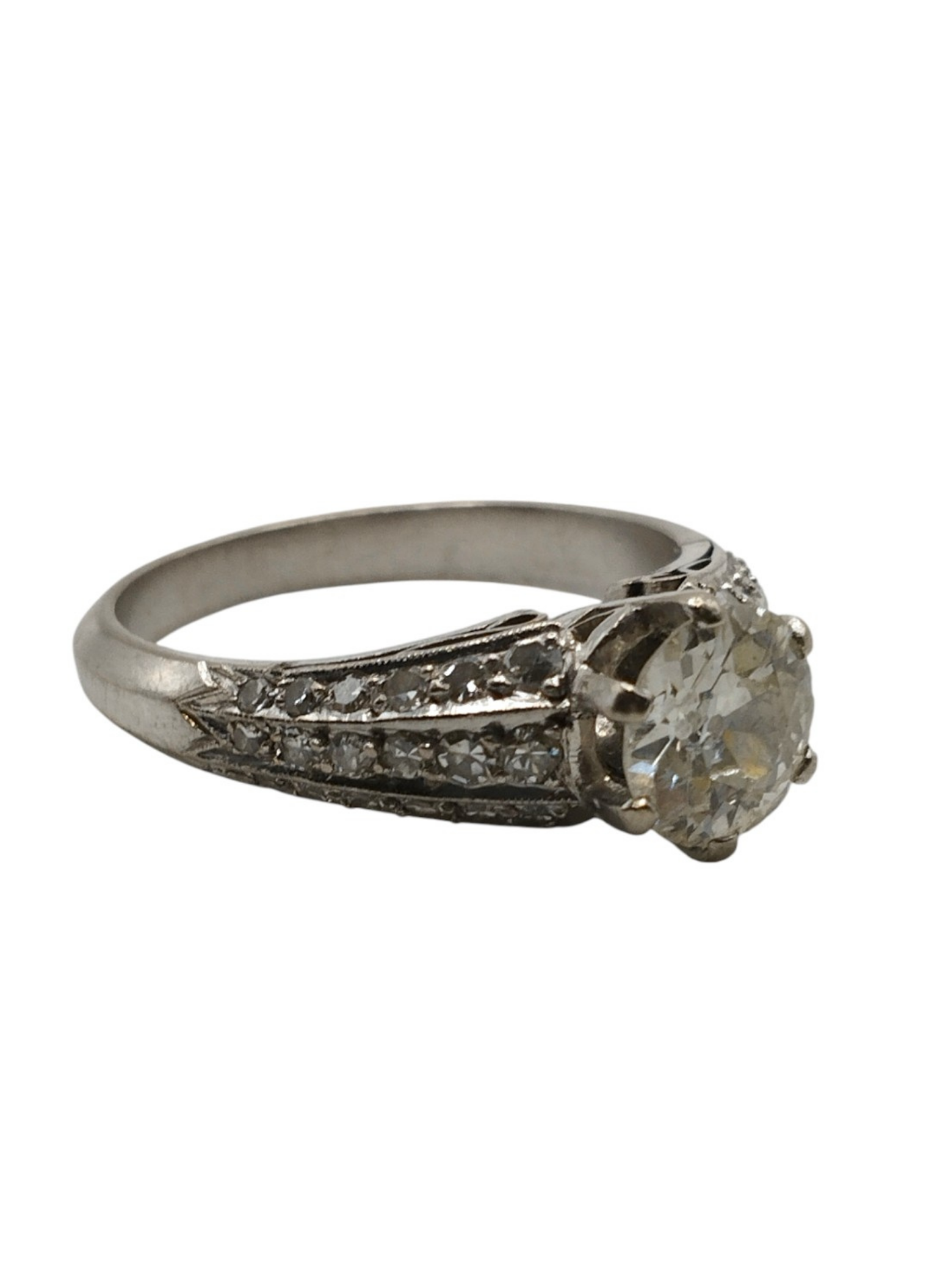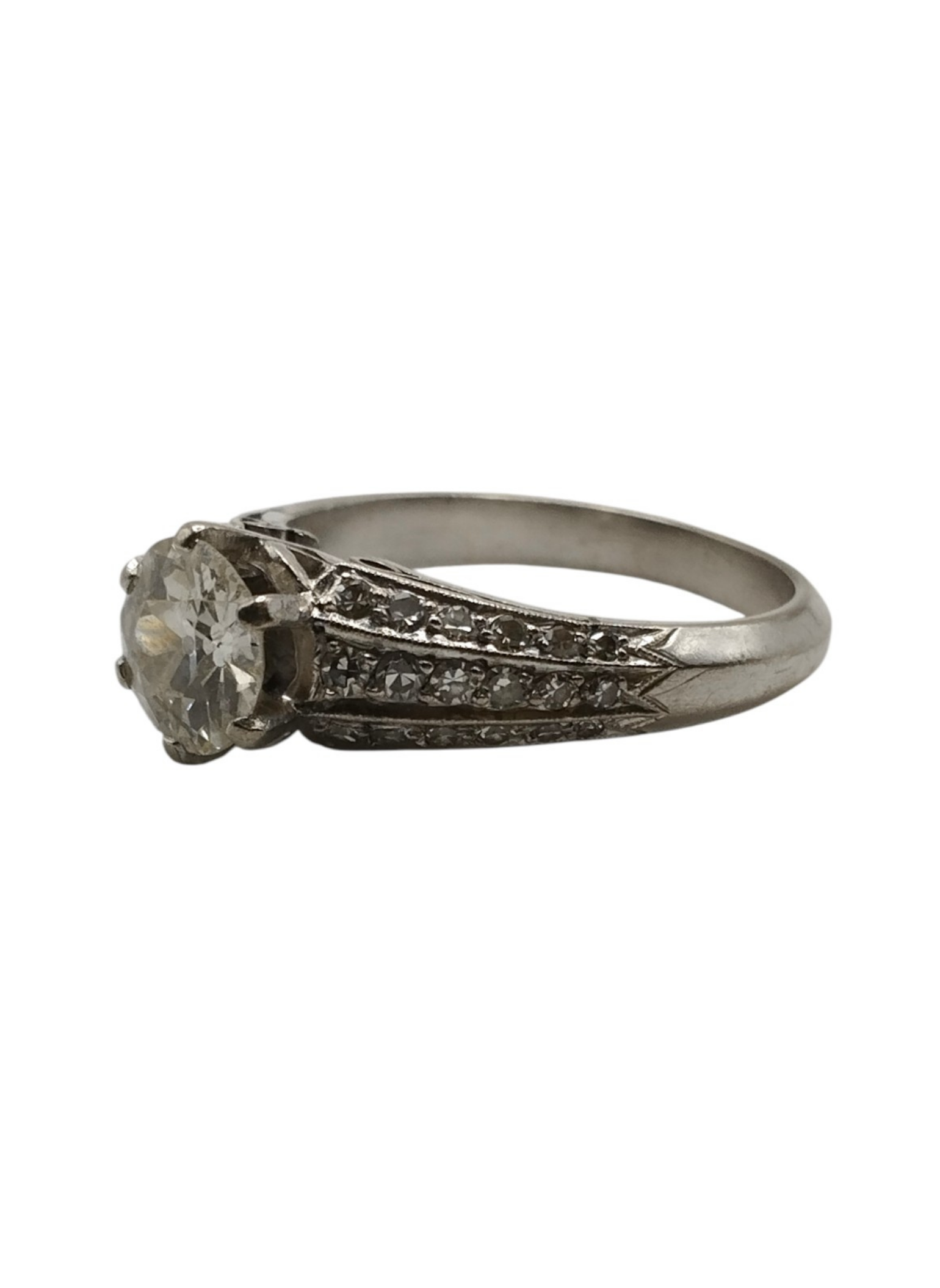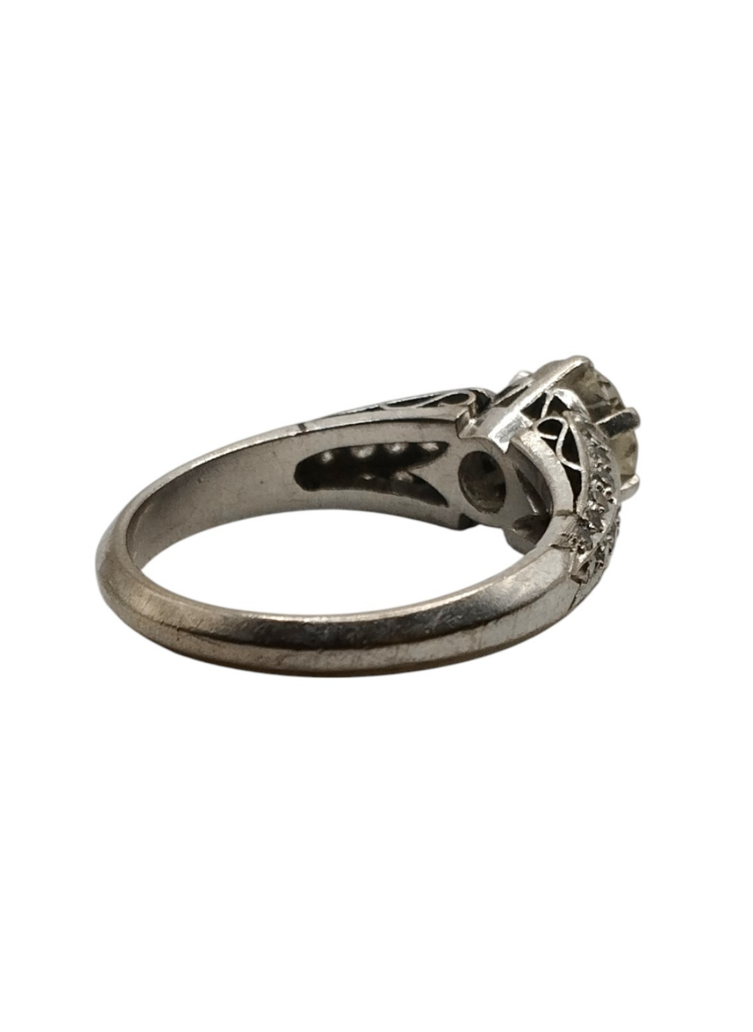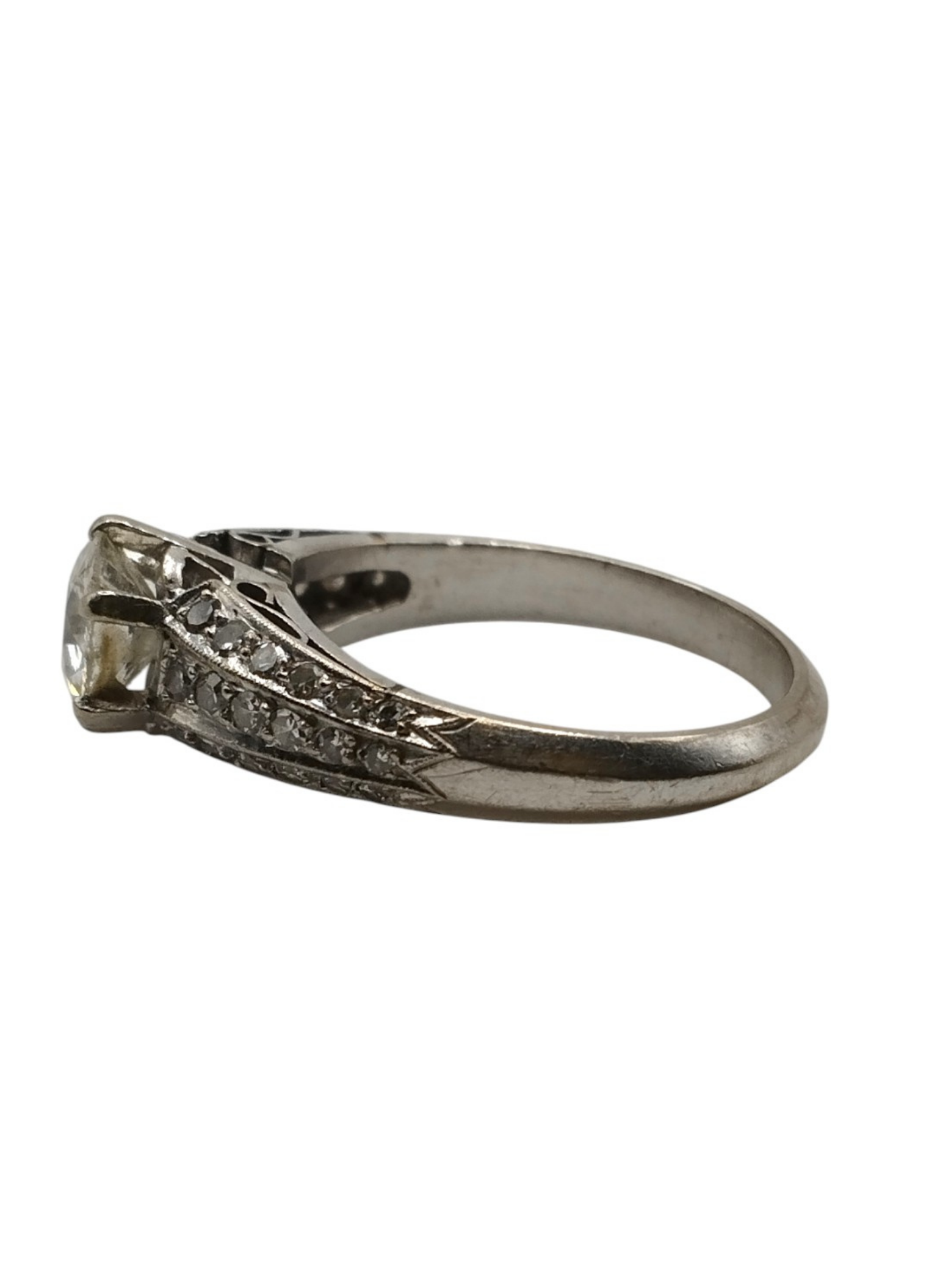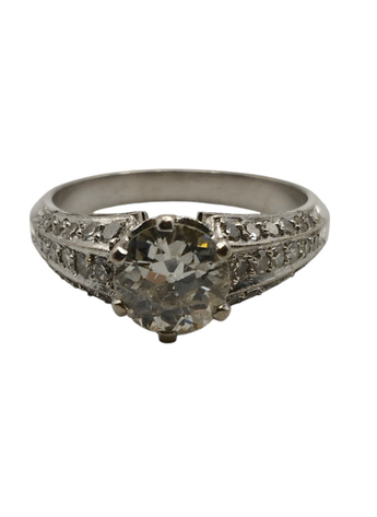 Anillo de oro de 18 Kts,con un brillante central talla antigua de 1,50 Kts,engastado en garra,con tres filas de brillantitos a cada lado.Es una talla 20.Pesa 5,1 grs en total.Es de los años 60-70.