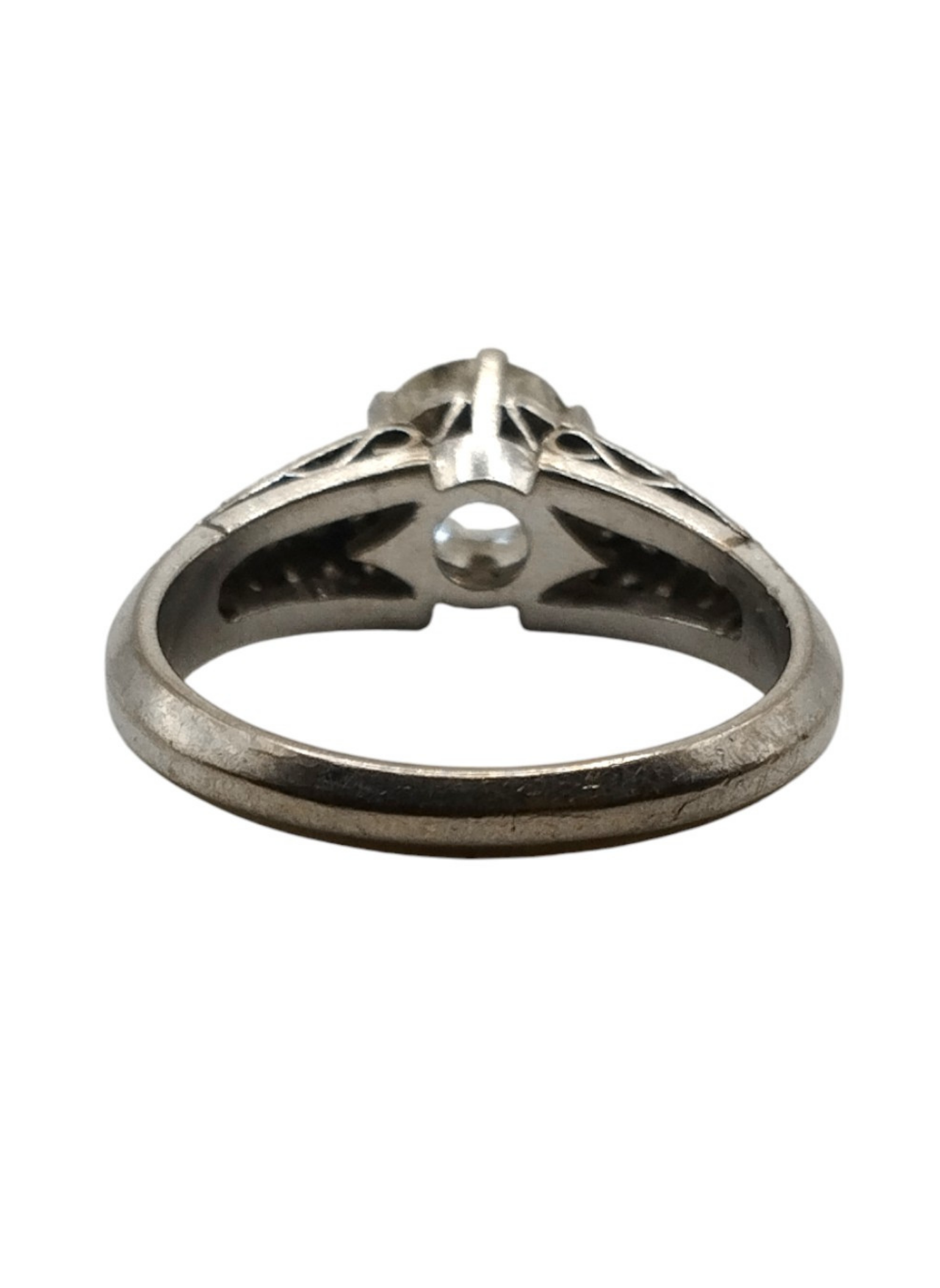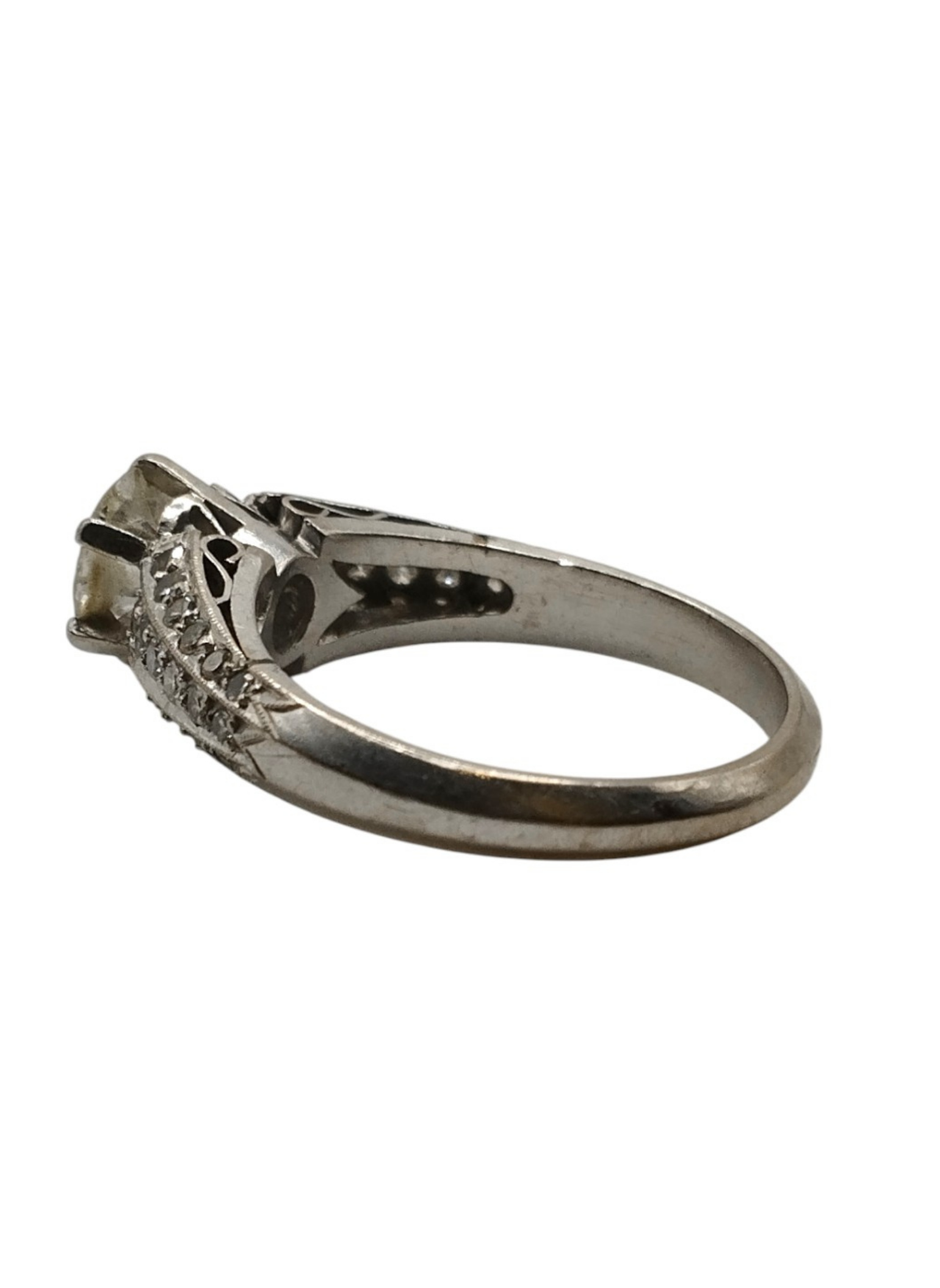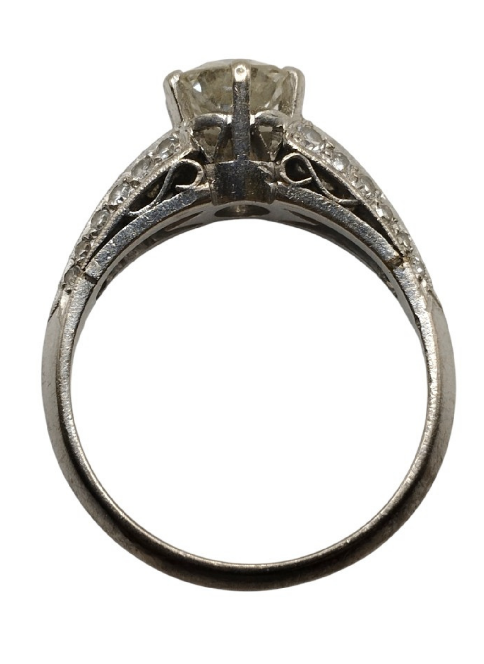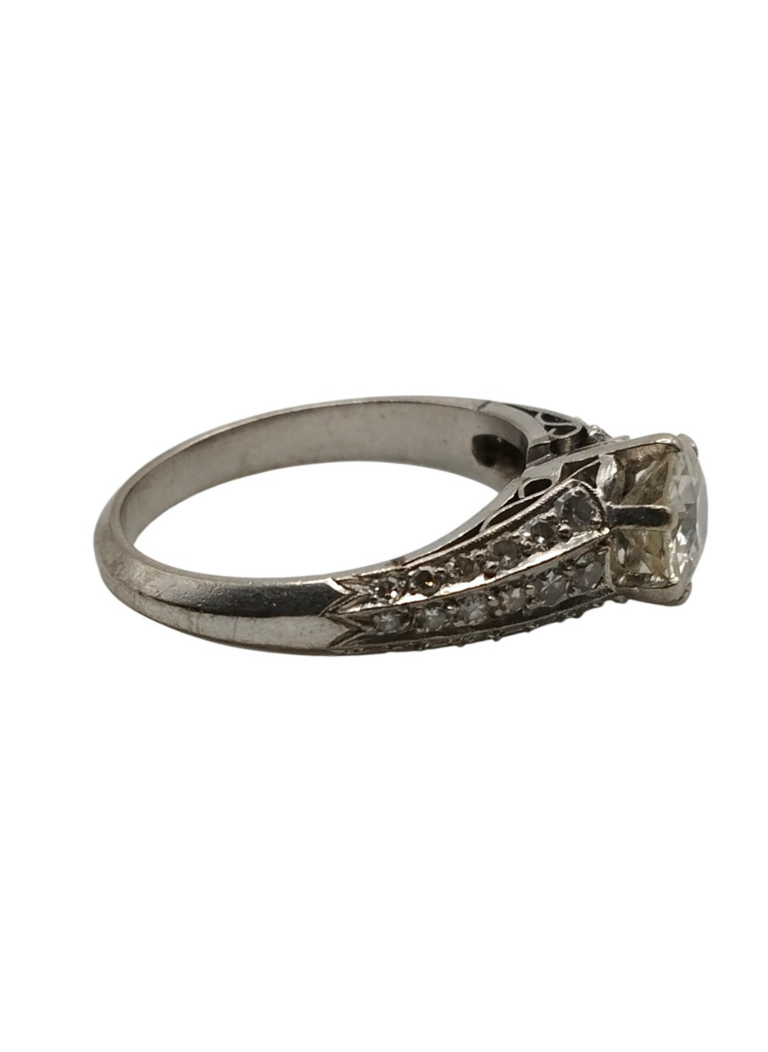 Anillo de oro de 18 Kts,con un brillante central talla antigua de 1,50 Kts,engastado en garra,con tres filas de brillantitos a cada lado.Es una talla 20.Pesa 5,1 grs en total.Es de los años 60-70.