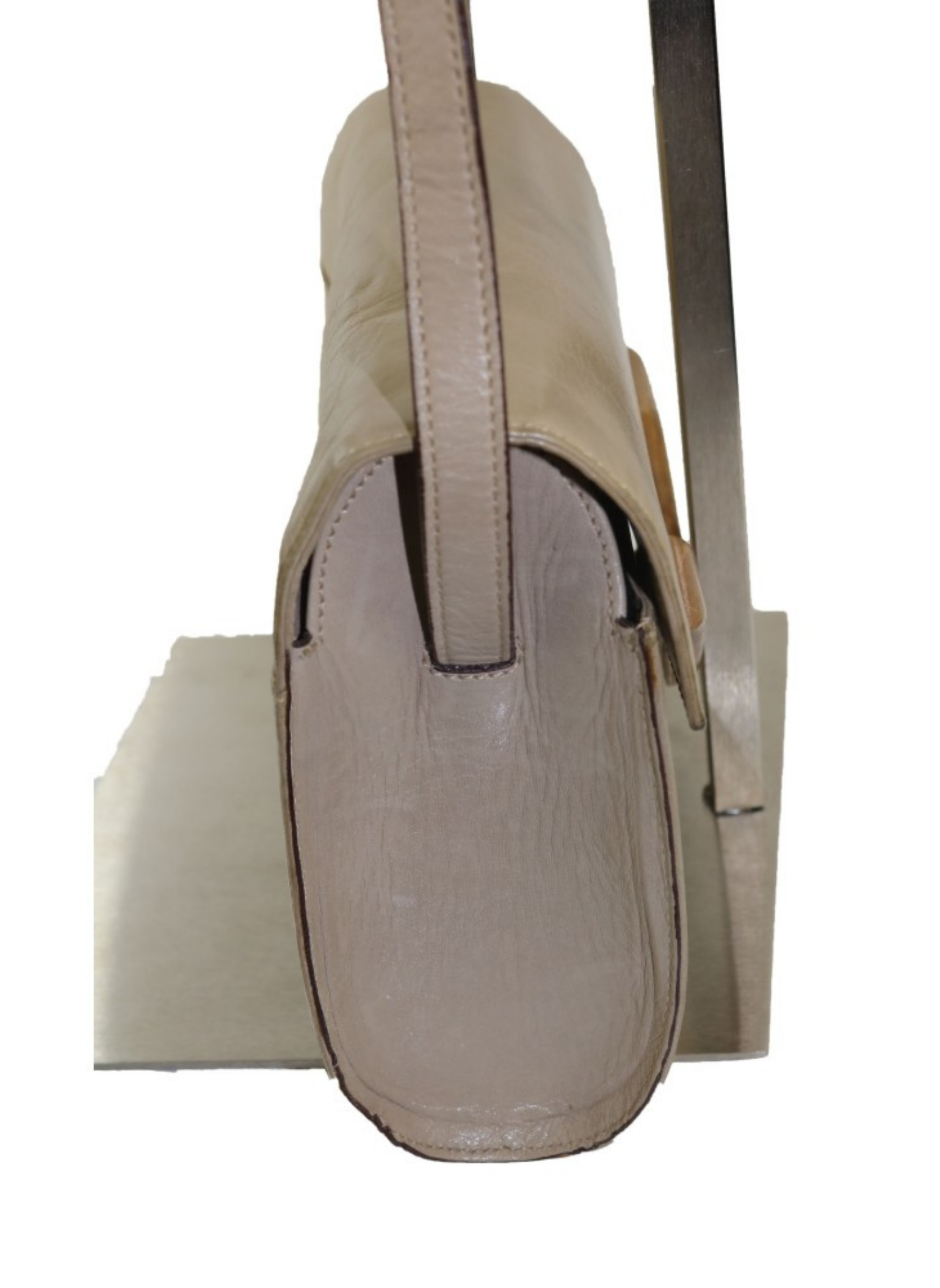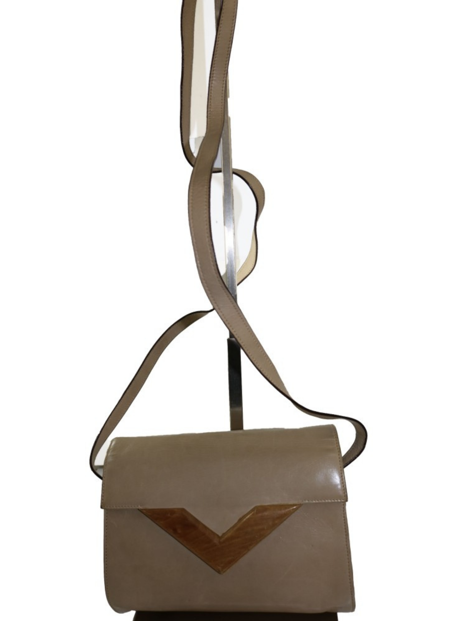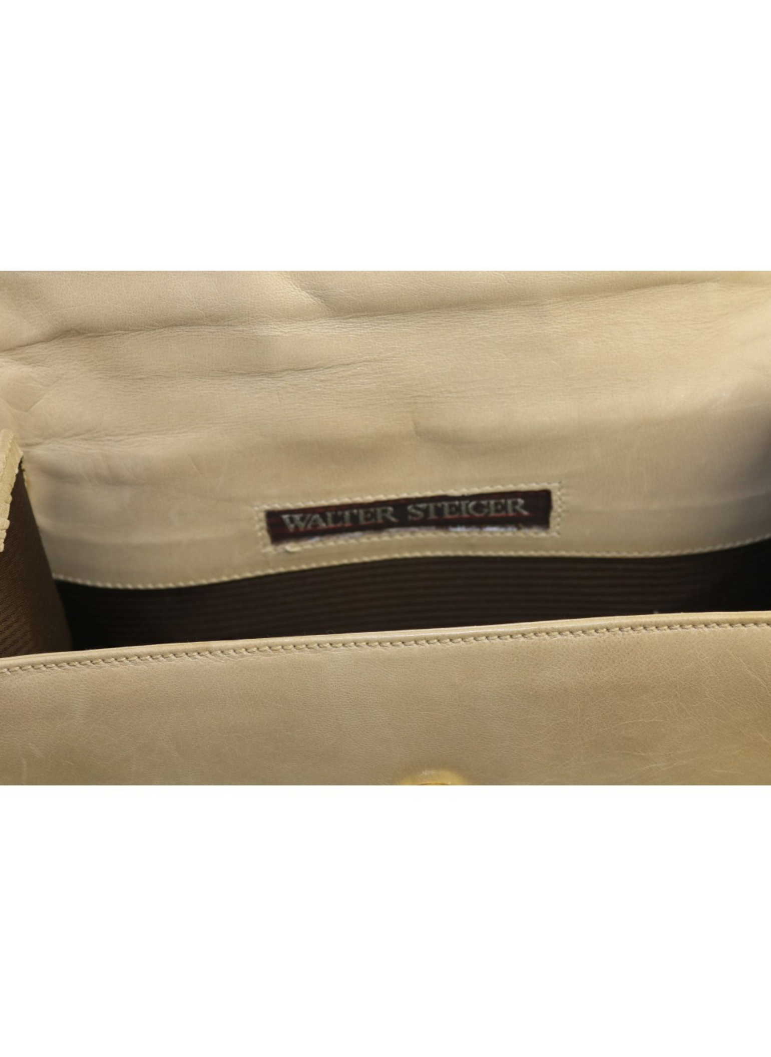 Bolso de la marca Walter Steiger en cuero de color beige. Contiene un asa larga de hombro o cruzado, con V en madera clara en la solapa y con botón de presión para abrir a un interior forrado en tela oscura con rayas, con bolsillo abierto. Contiene muy pocos signos de uso.