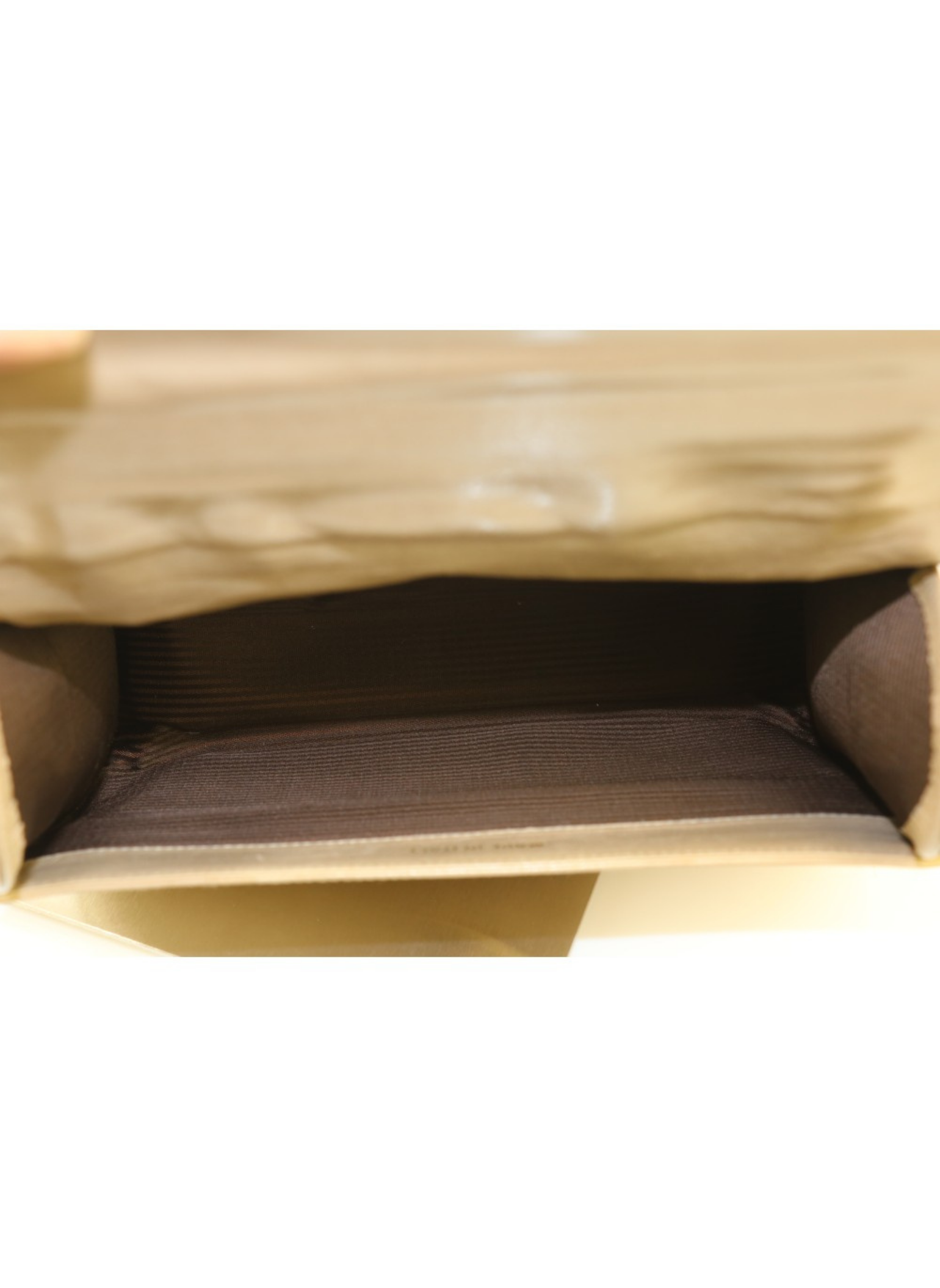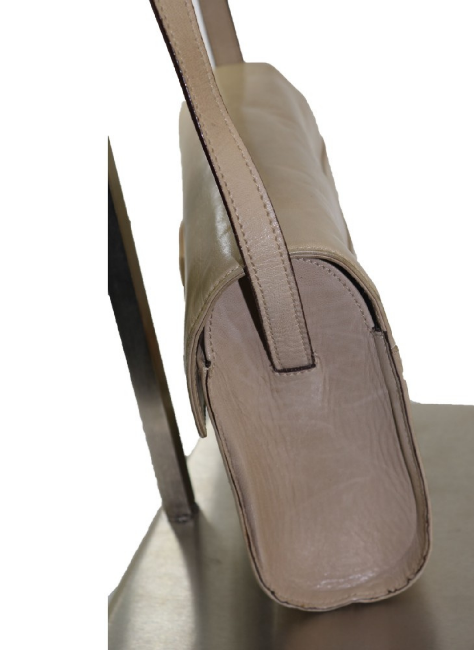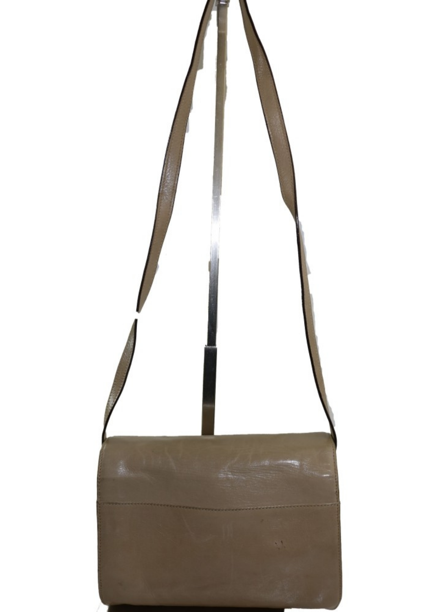 Bolso de la marca Walter Steiger en cuero de color beige. Contiene un asa larga de hombro o cruzado, con V en madera clara en la solapa y con botón de presión para abrir a un interior forrado en tela oscura con rayas, con bolsillo abierto. Contiene muy pocos signos de uso.