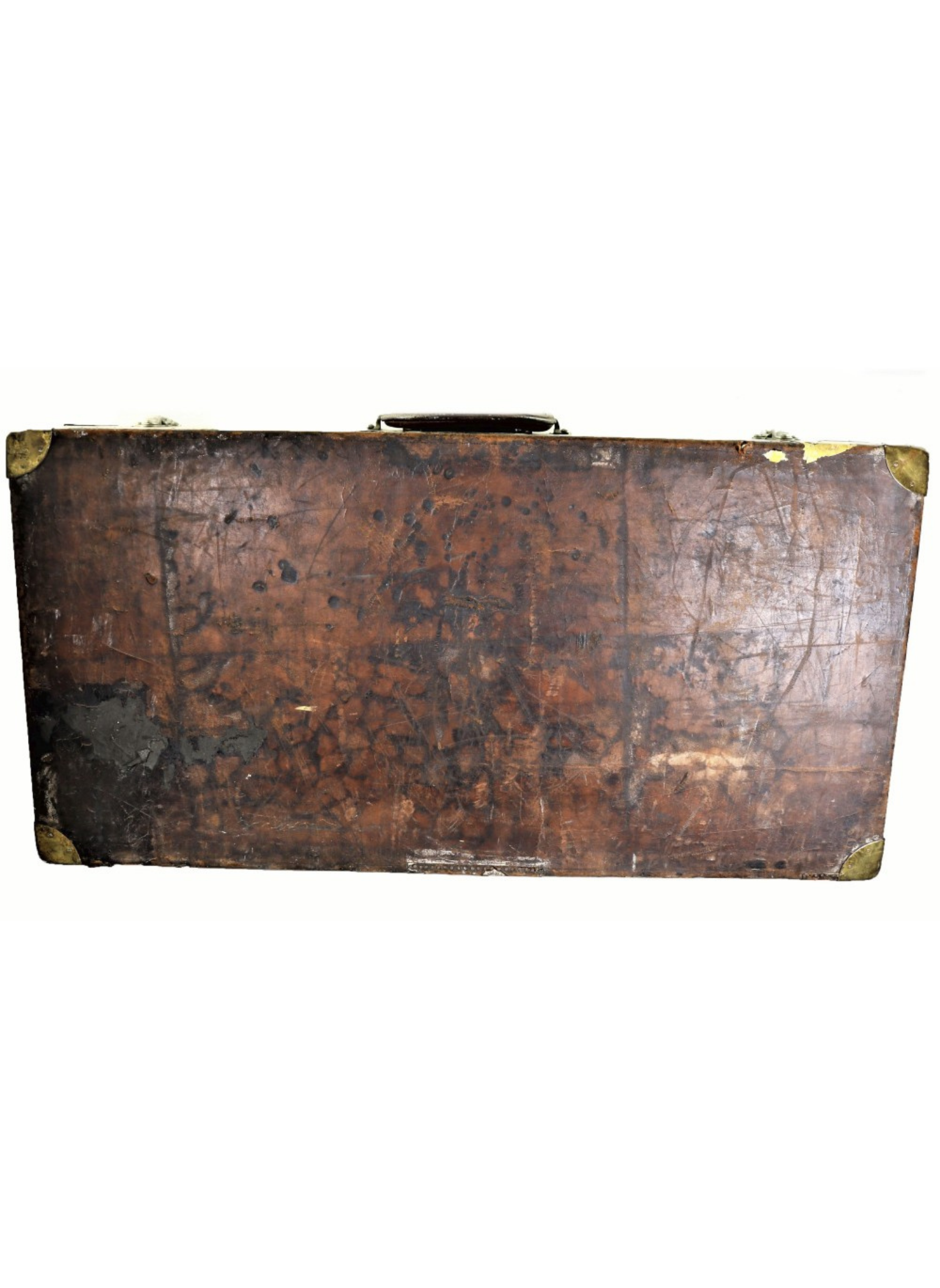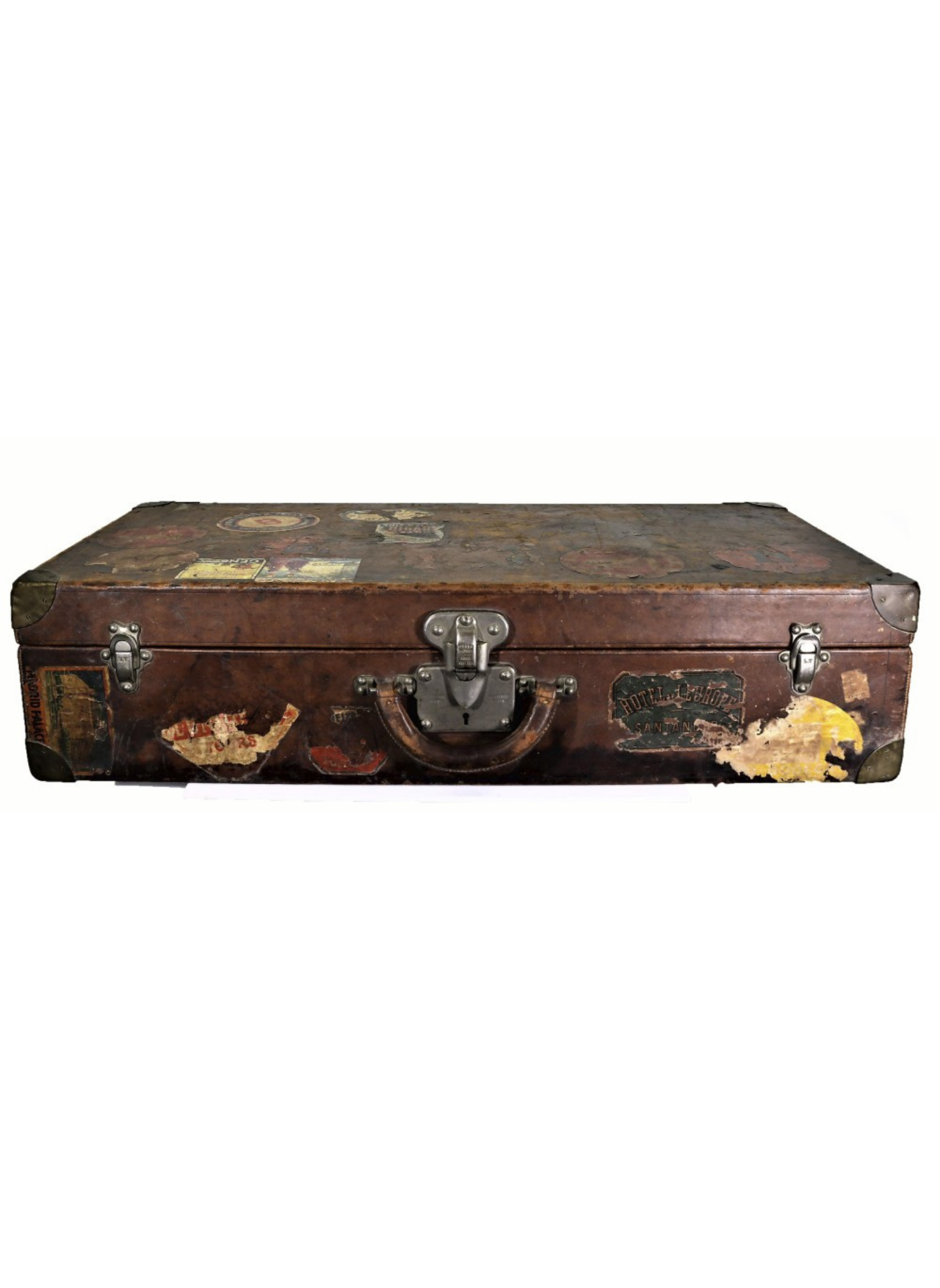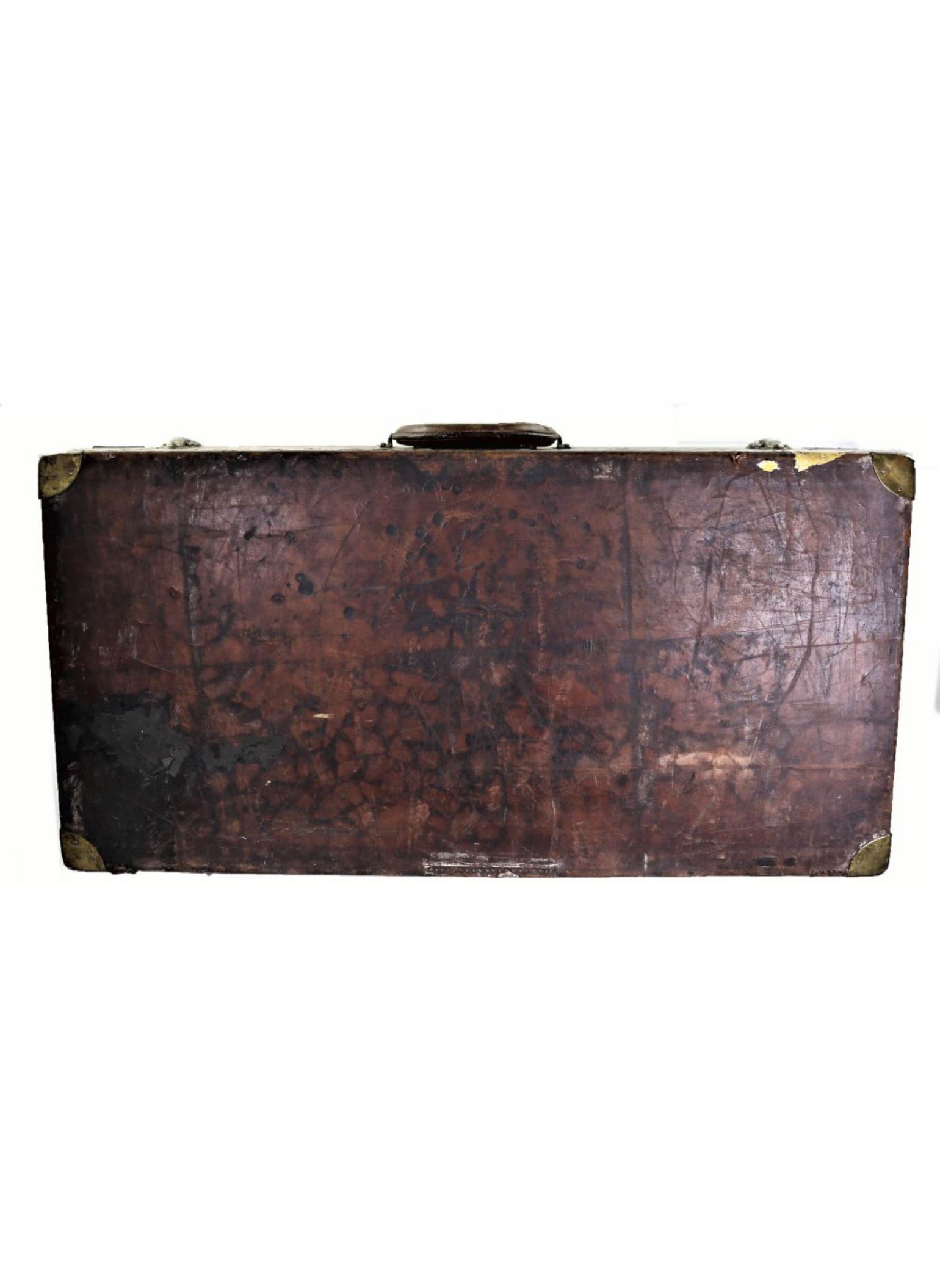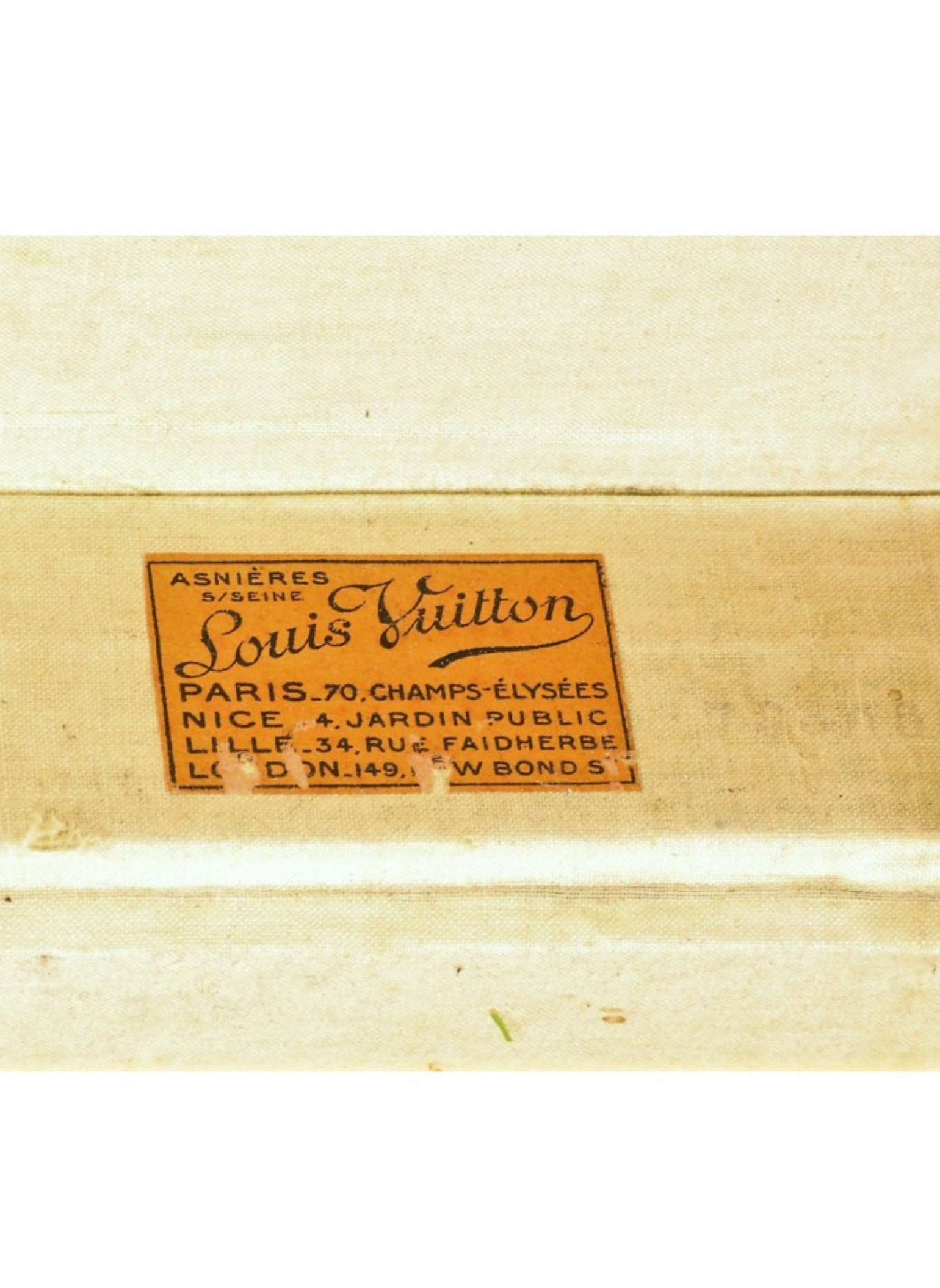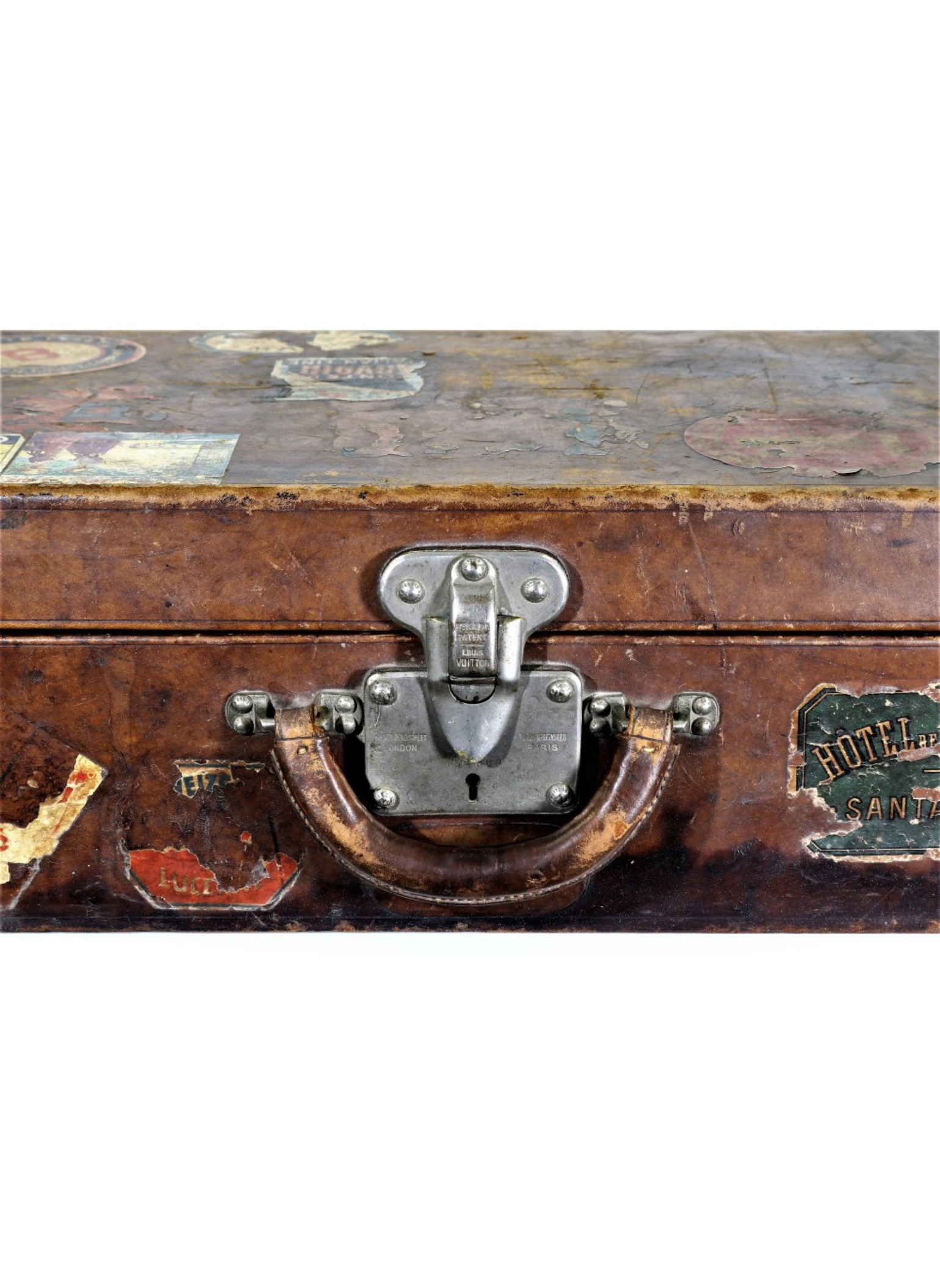 Maleta Louis Vuitton Vintage Años 20  en cuero liso, con herrajes en metal tono plateado y esquineras en dorado , esta maleta es de la linea lisa y tiene adhesivos de hoteles importantes de la època. Visible uso en la maleta (ver fotos) pero es un producto que a pesar de sus años se conserva en  buen estado.Pieza para coleccionistas.