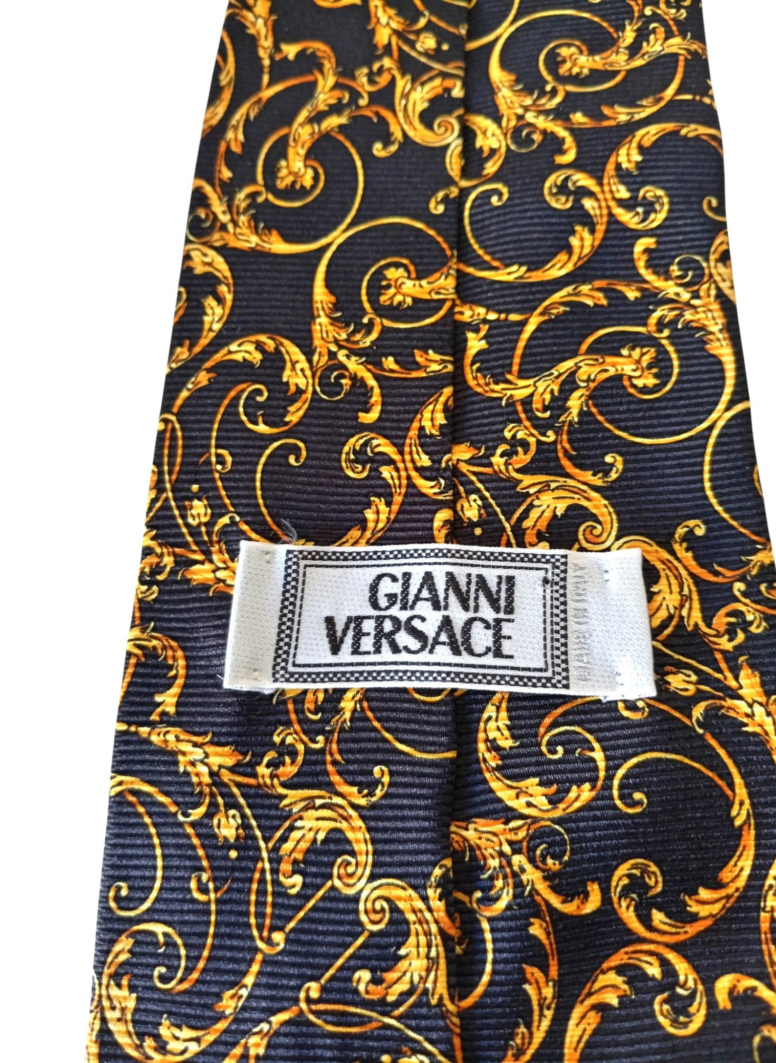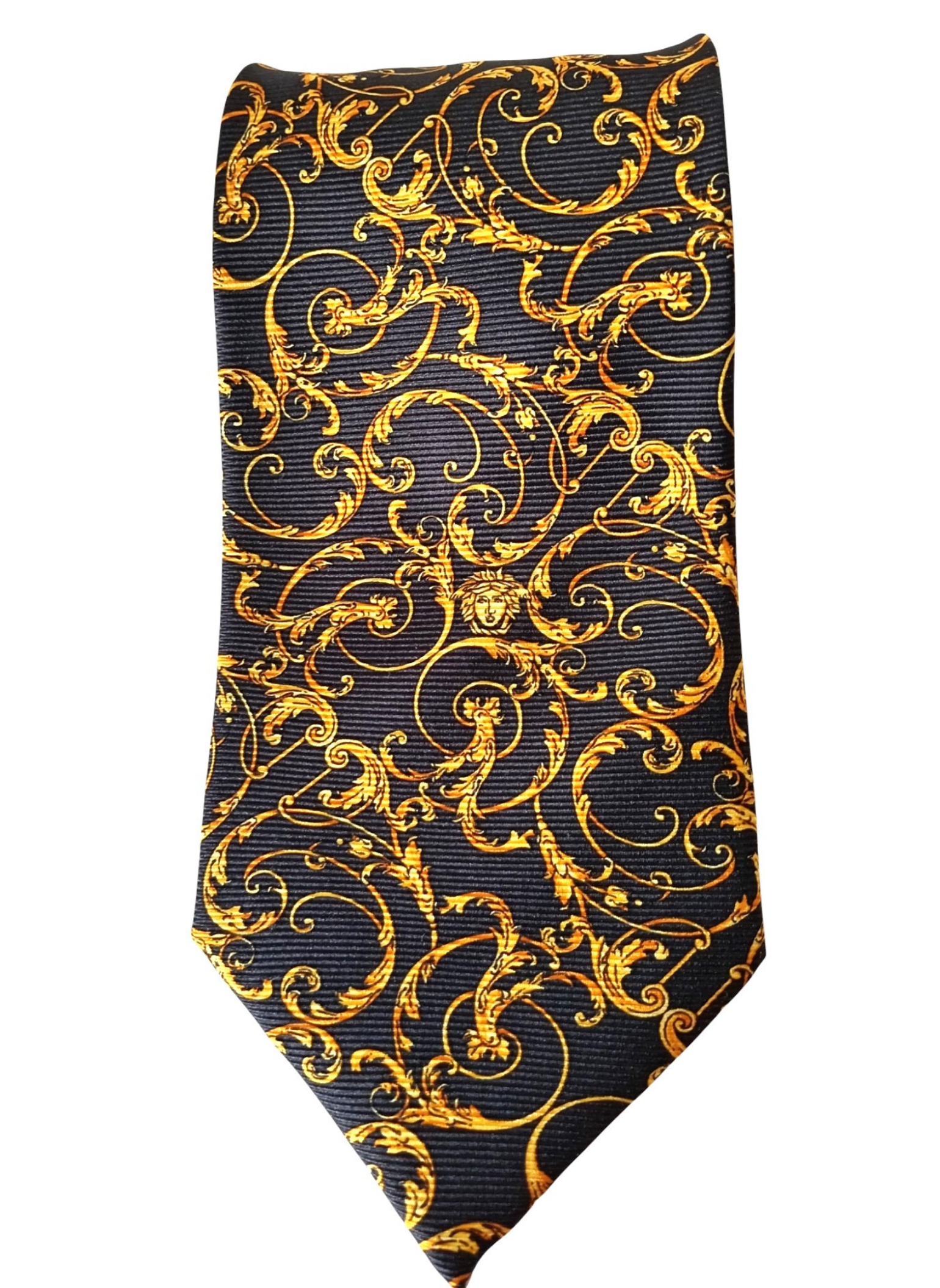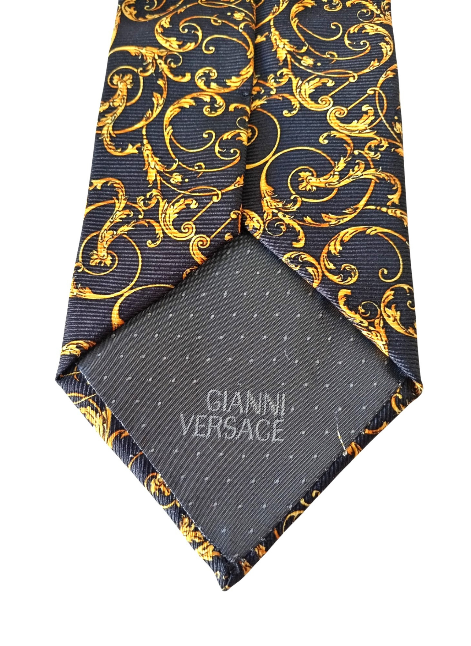 Corbata de Gianni Versace,100% seda.Color negro con motivos y medusa dorados,la parte de atrás es de color beige con la greca dorada típica de la firma.Perfecto estado.Mide 10 cms por la parte mas ancha