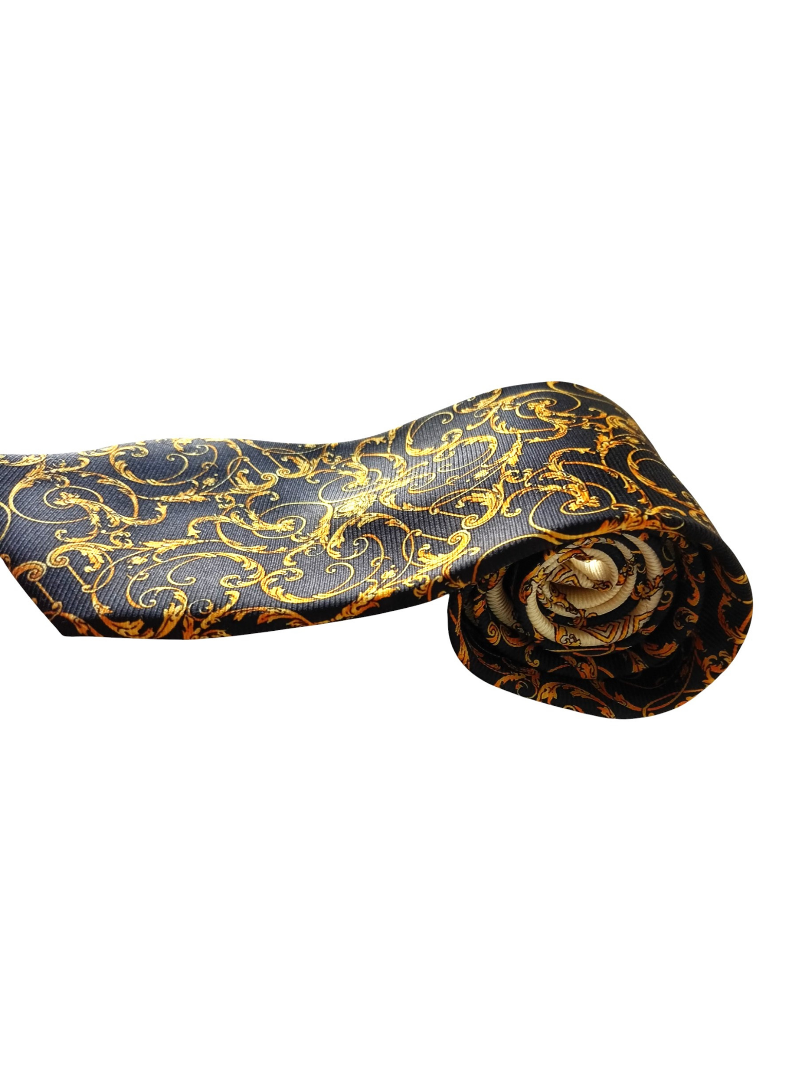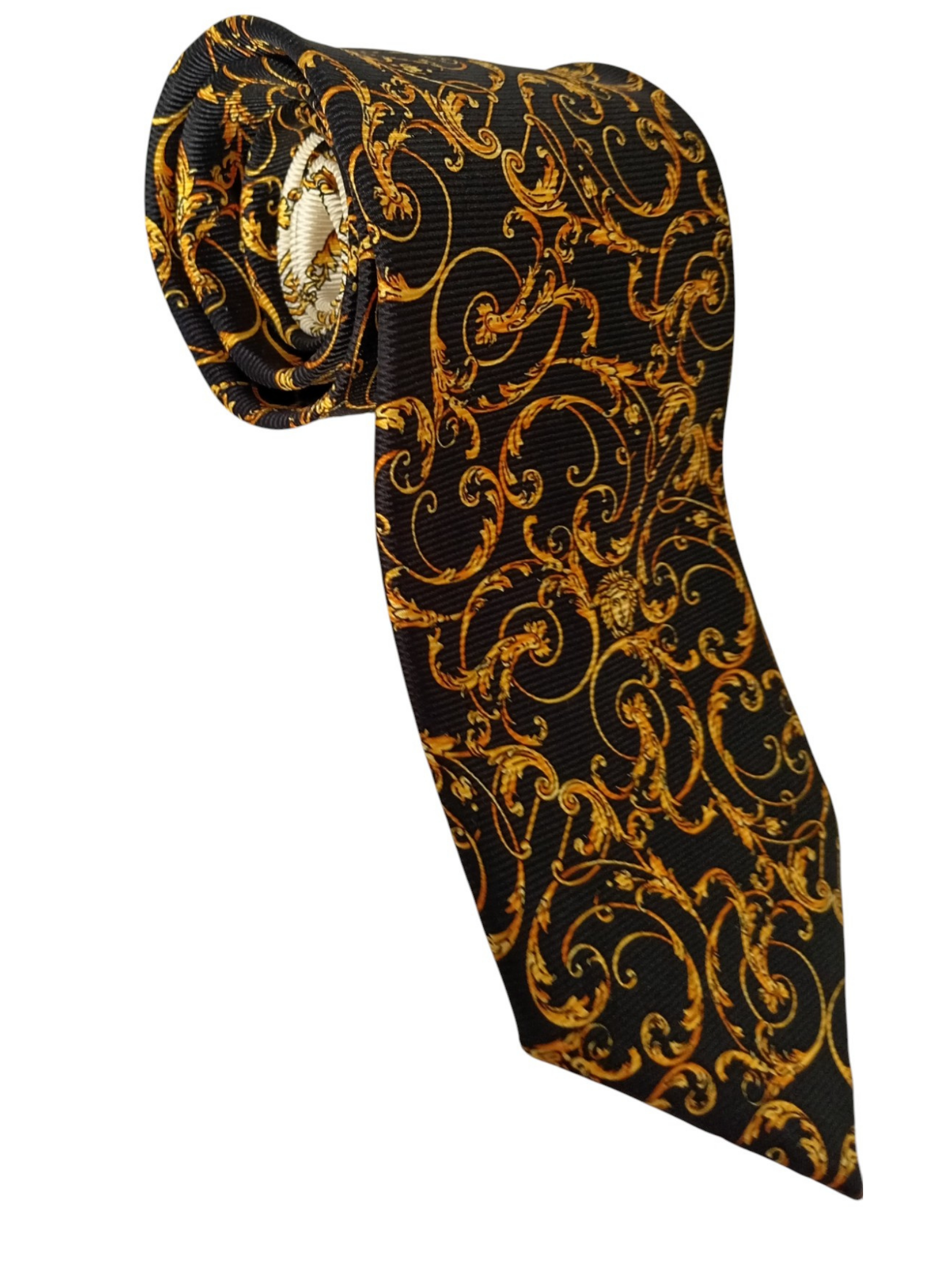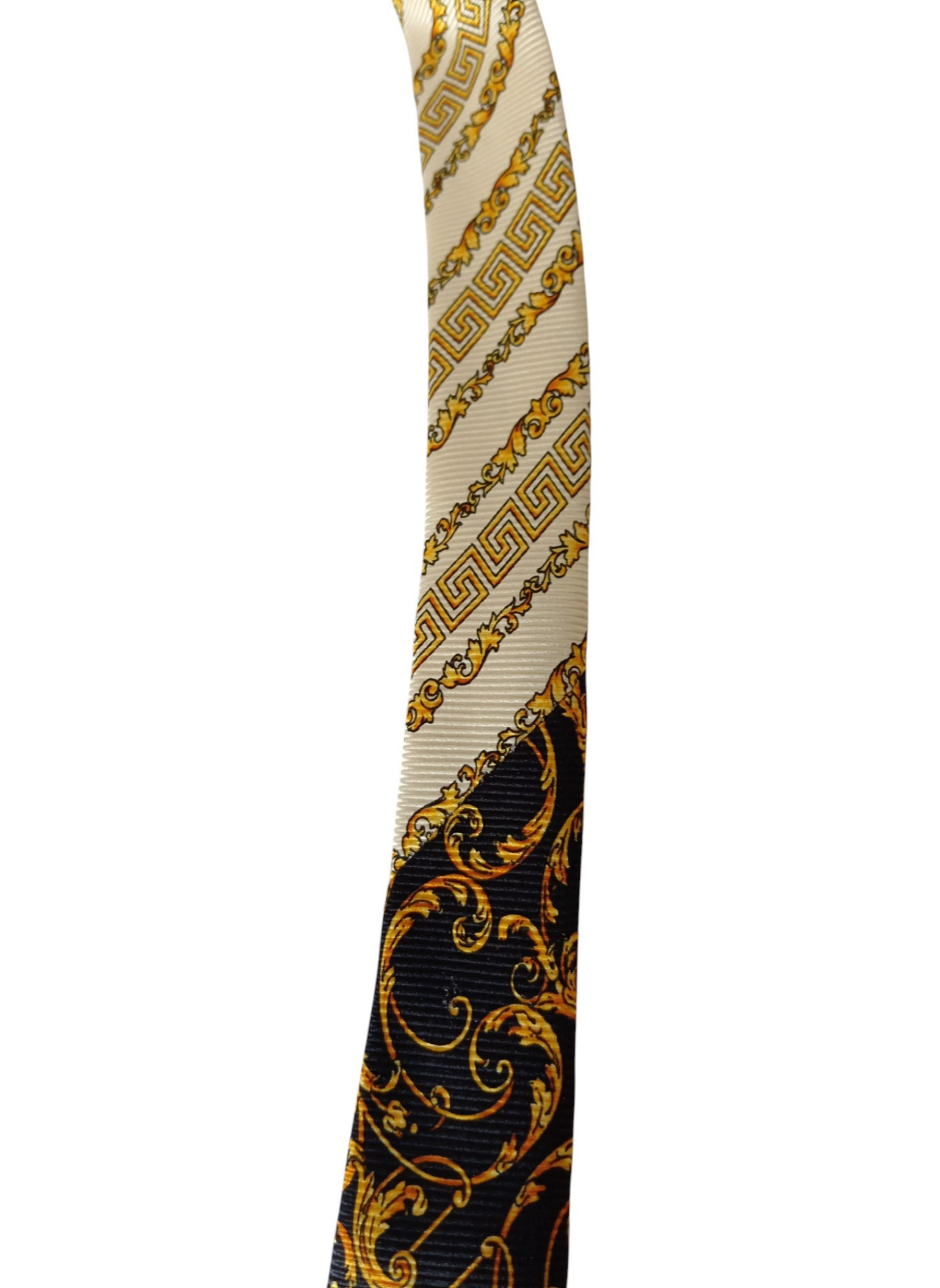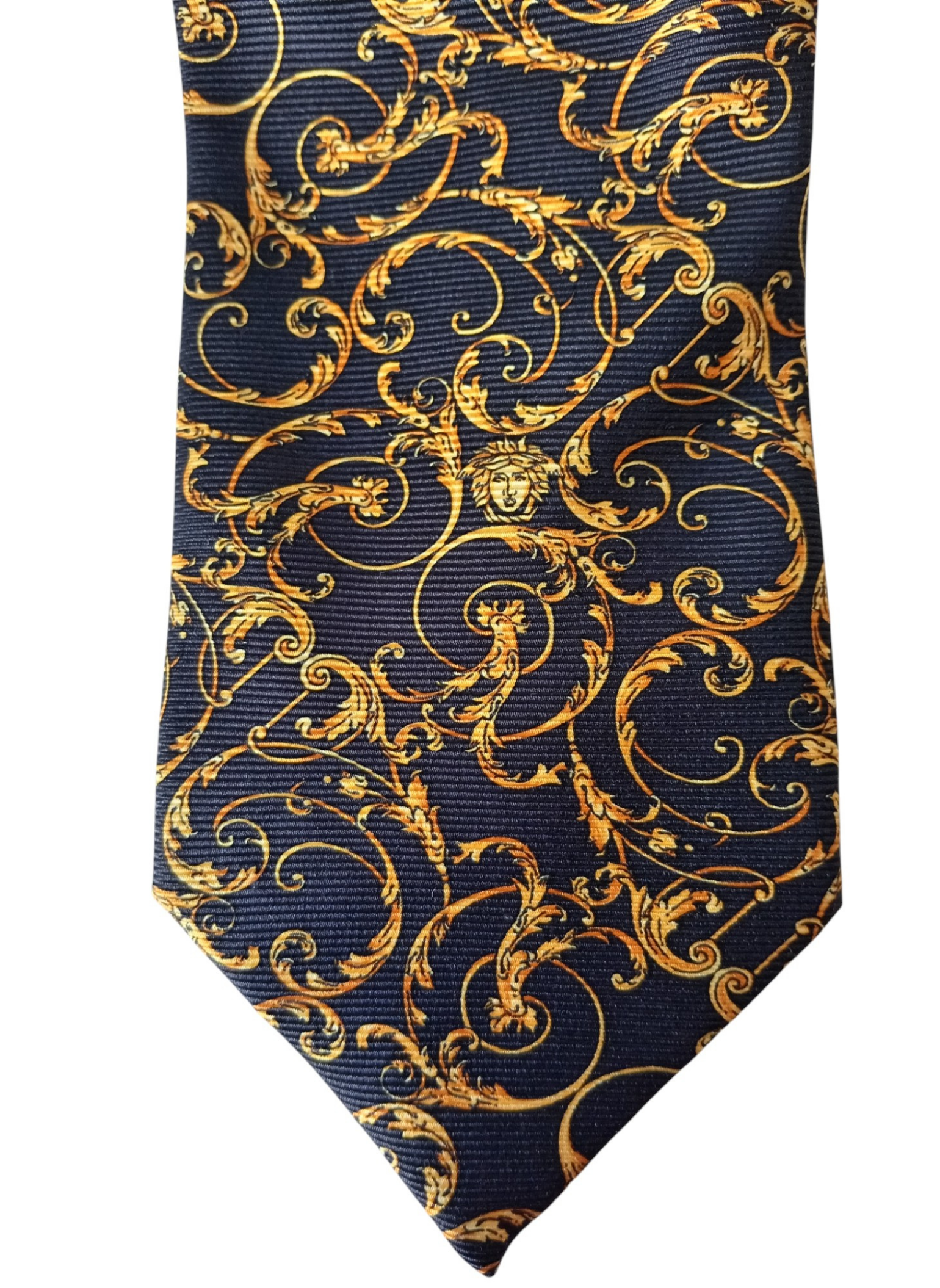 Corbata de Gianni Versace,100% seda.Color negro con motivos y medusa dorados,la parte de atrás es de color beige con la greca dorada típica de la firma.Perfecto estado.Mide 10 cms por la parte mas ancha