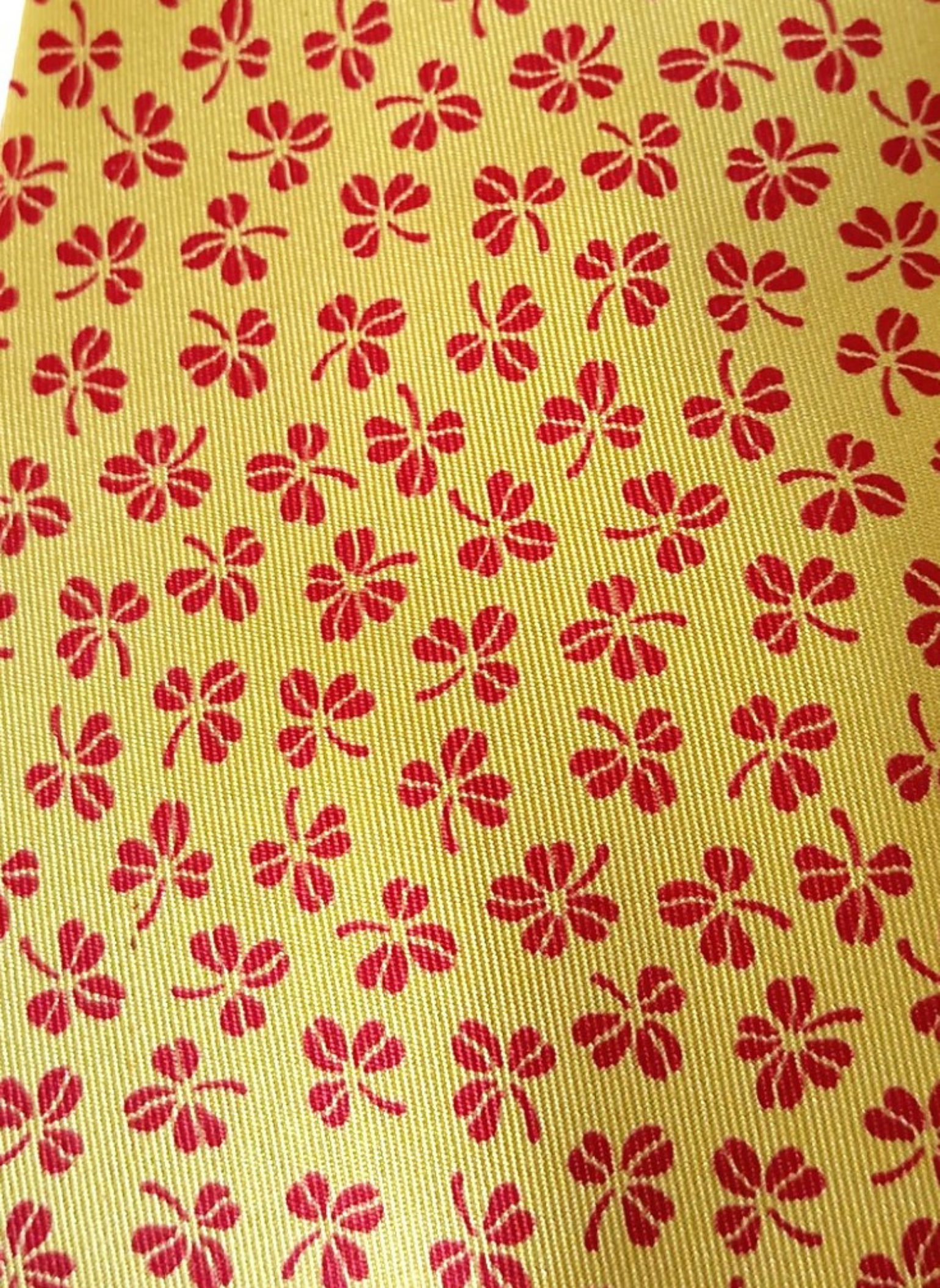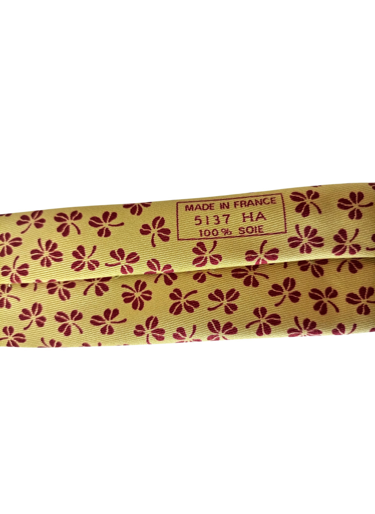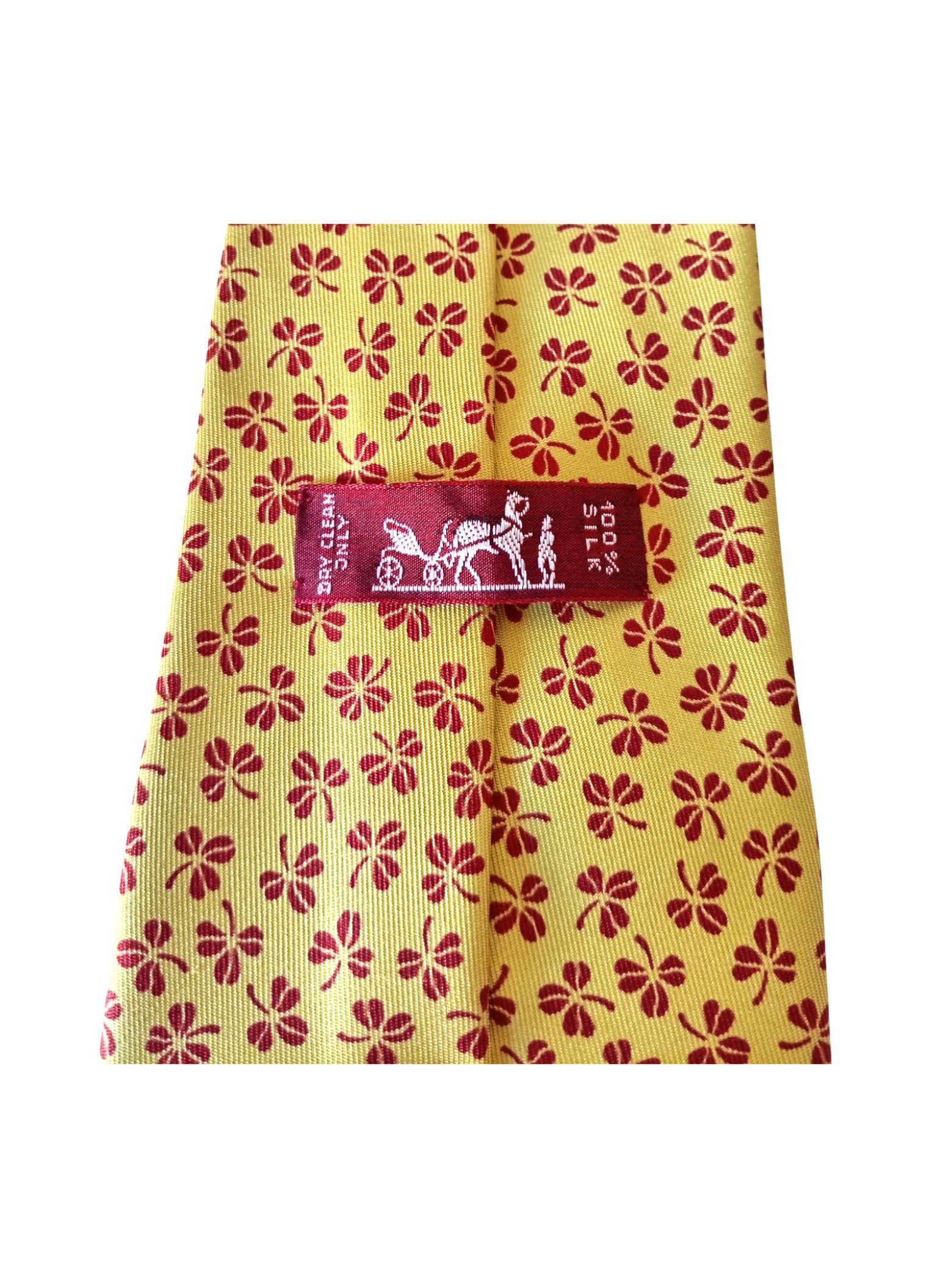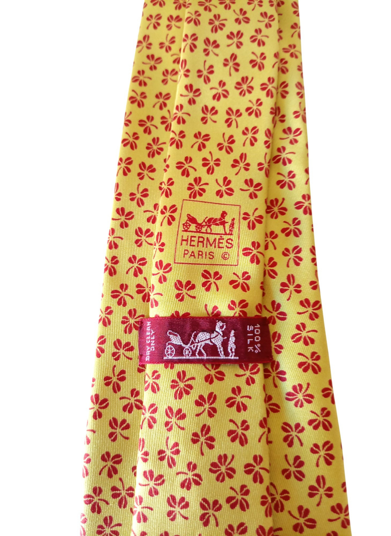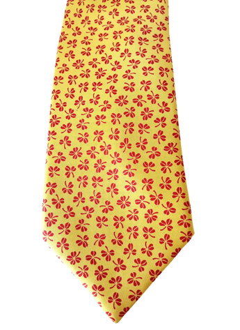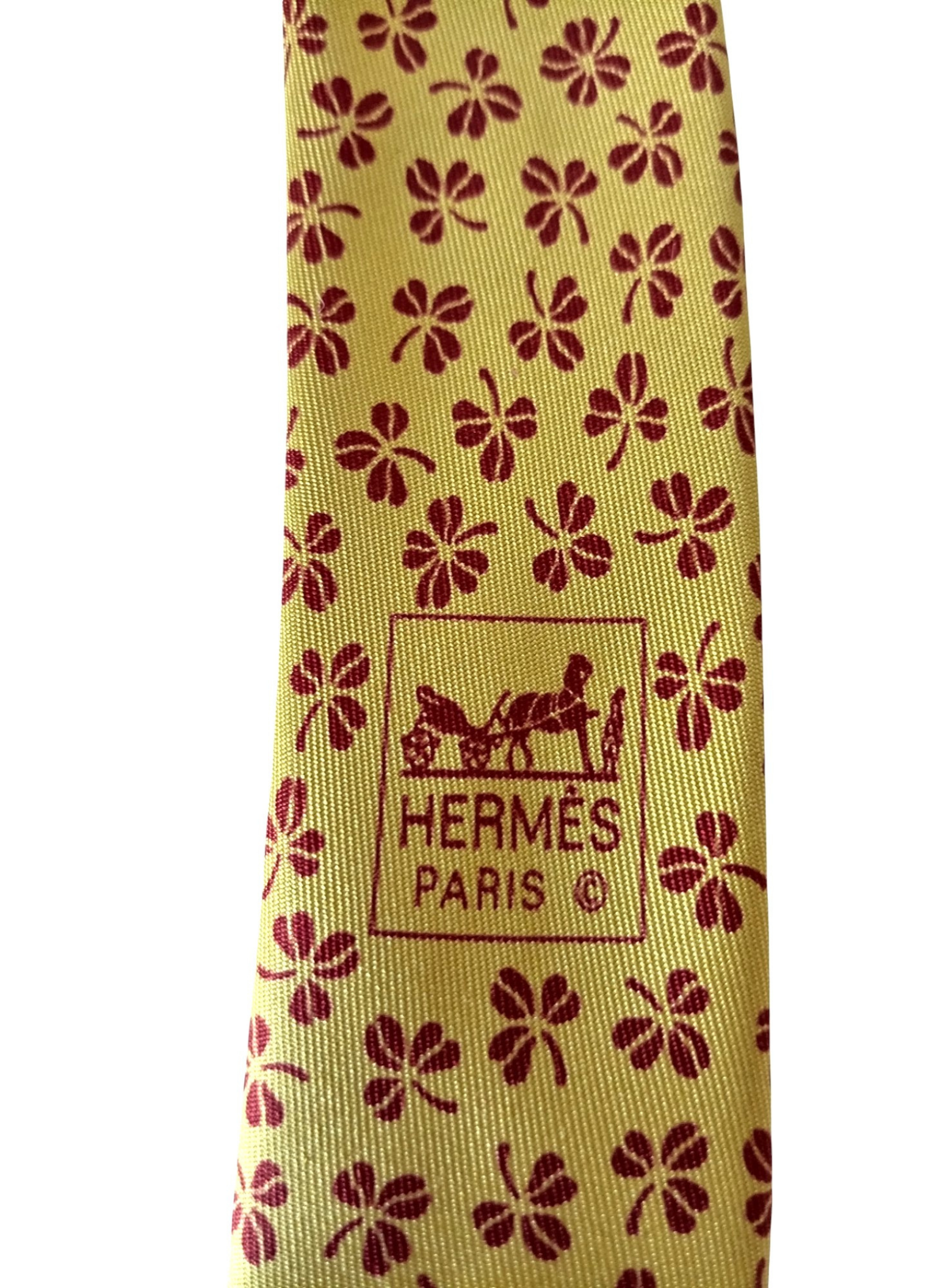 Corbata de seda de Hermés,fondo color mostaza con treboles rojos.Esta en perfecto estado y mide 9,5 cms por la parte mas ancha.