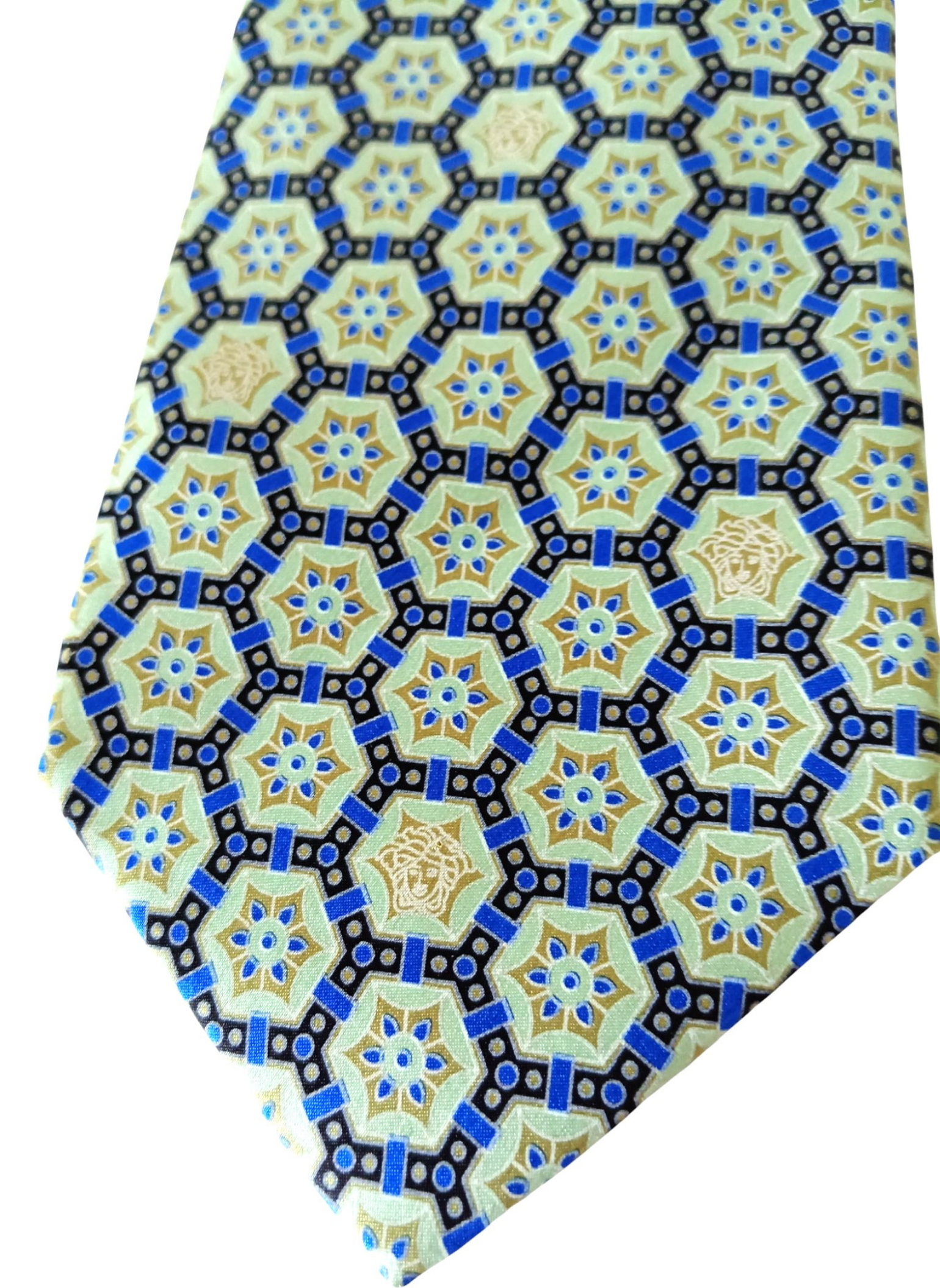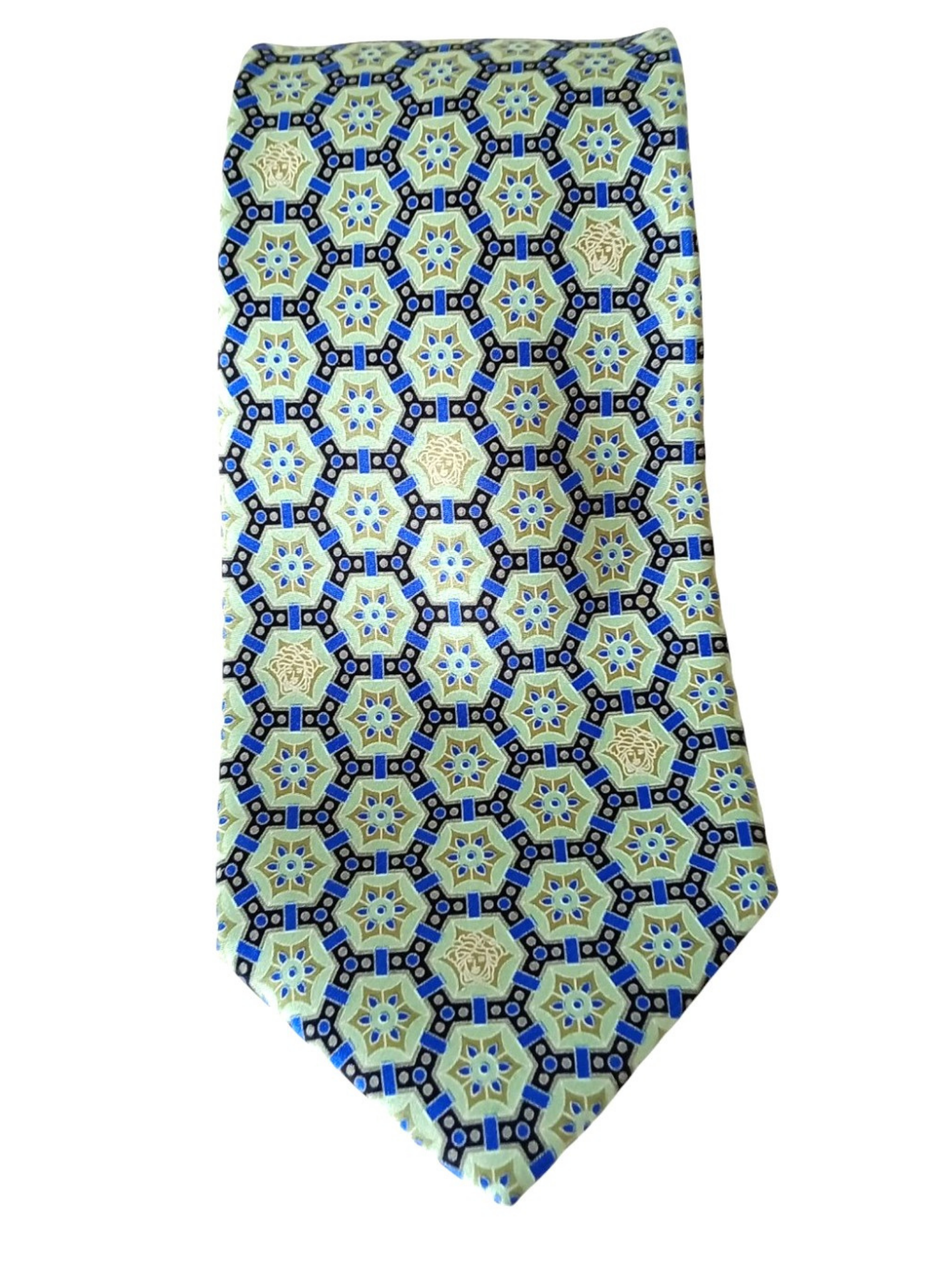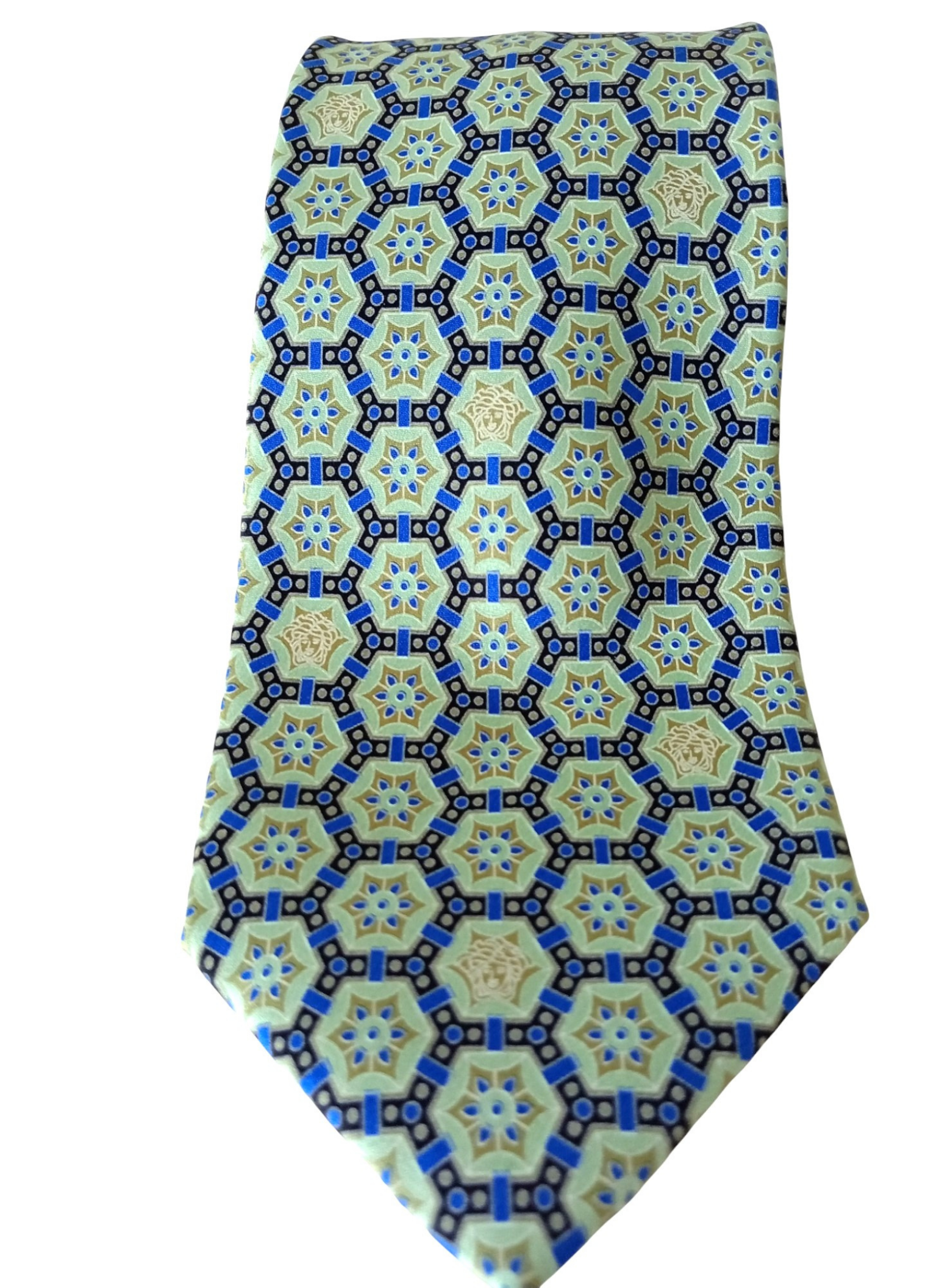 Corbata de Versace,100% seda.Colores verdes y azules haciendo hexágonos,En la parte de atrás cambia los colores.Esta en perfecto estado.Mide 9 cms por la parte mas ancha.