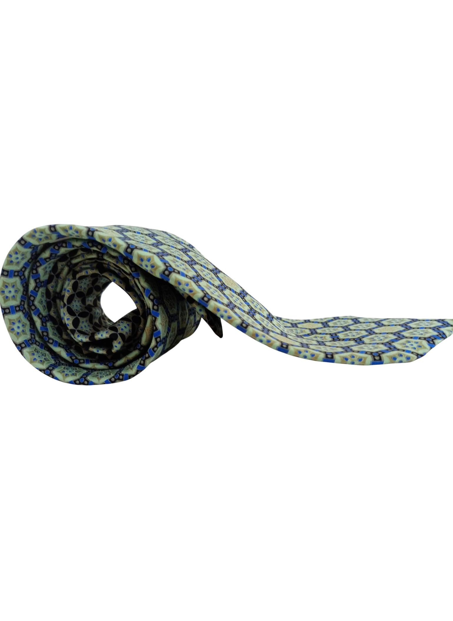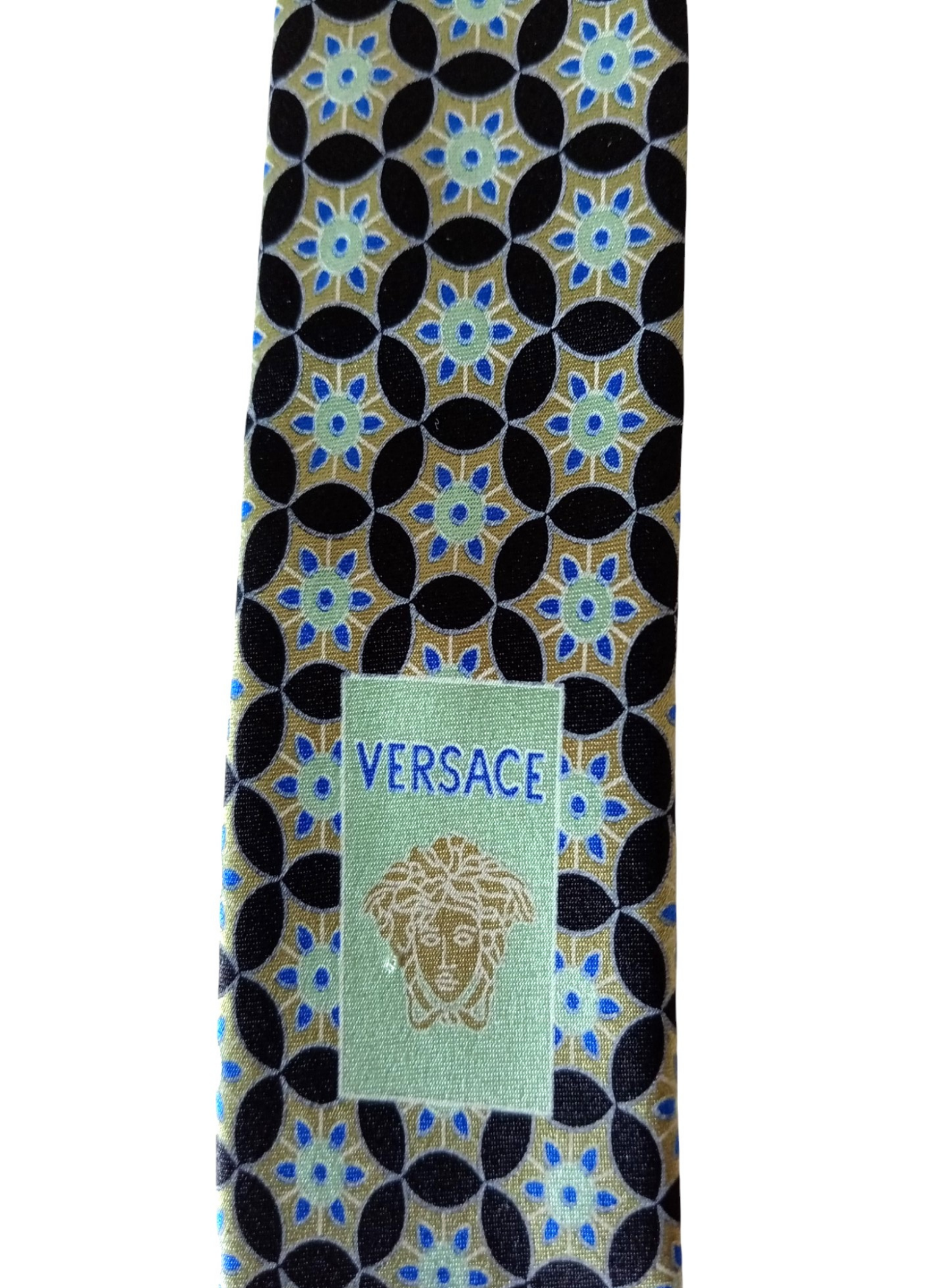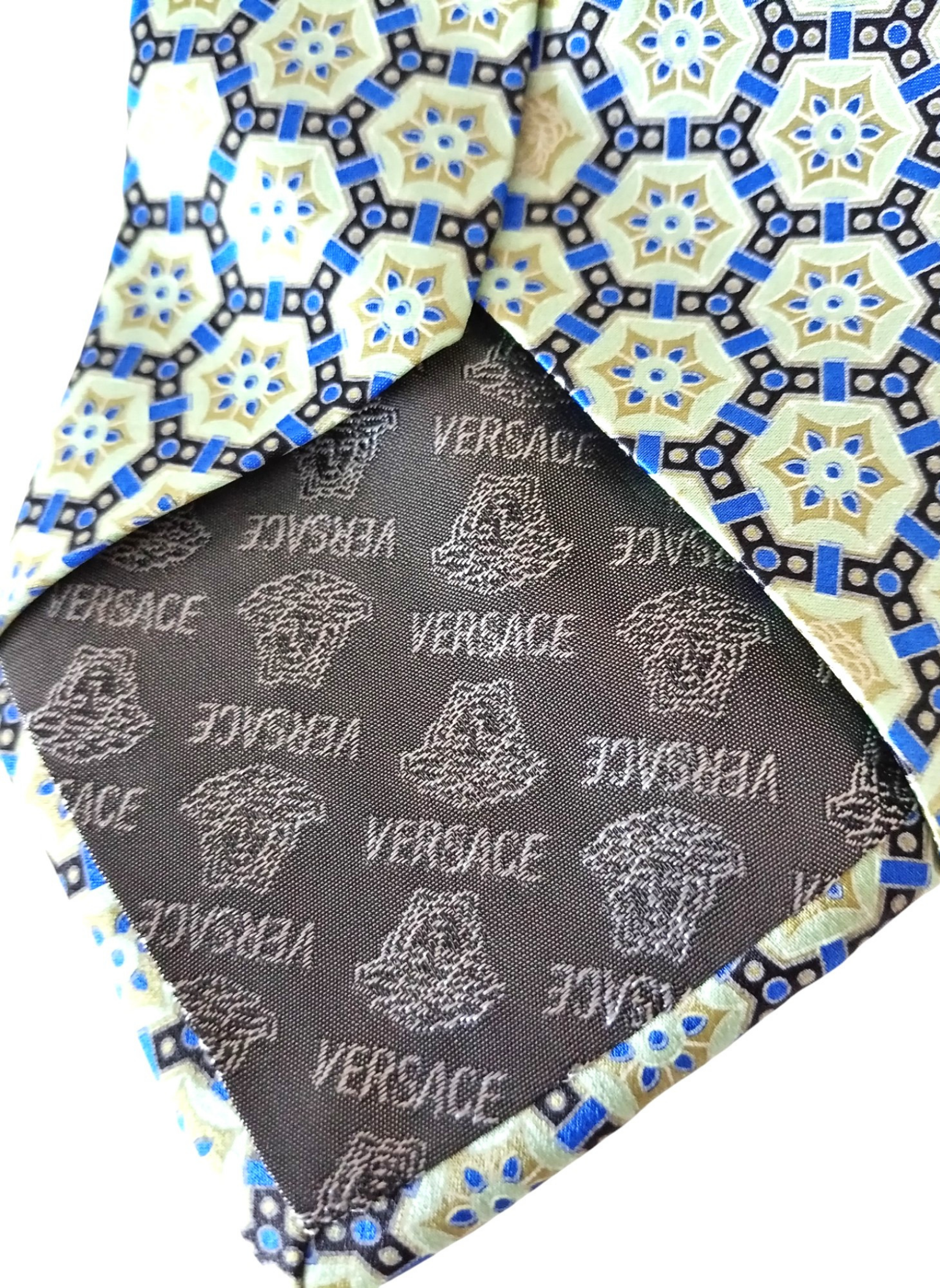 Corbata de Versace,100% seda.Colores verdes y azules haciendo hexágonos,En la parte de atrás cambia los colores.Esta en perfecto estado.Mide 9 cms por la parte mas ancha.