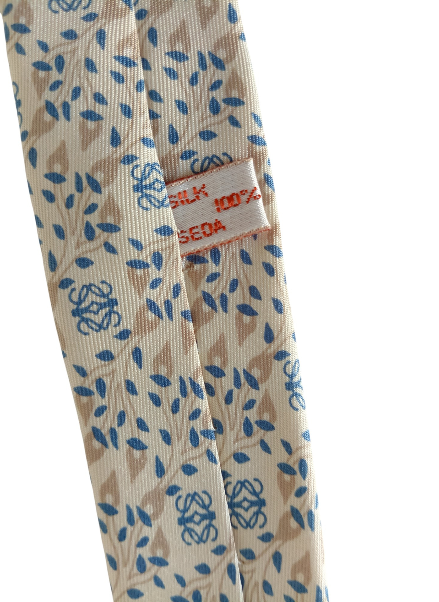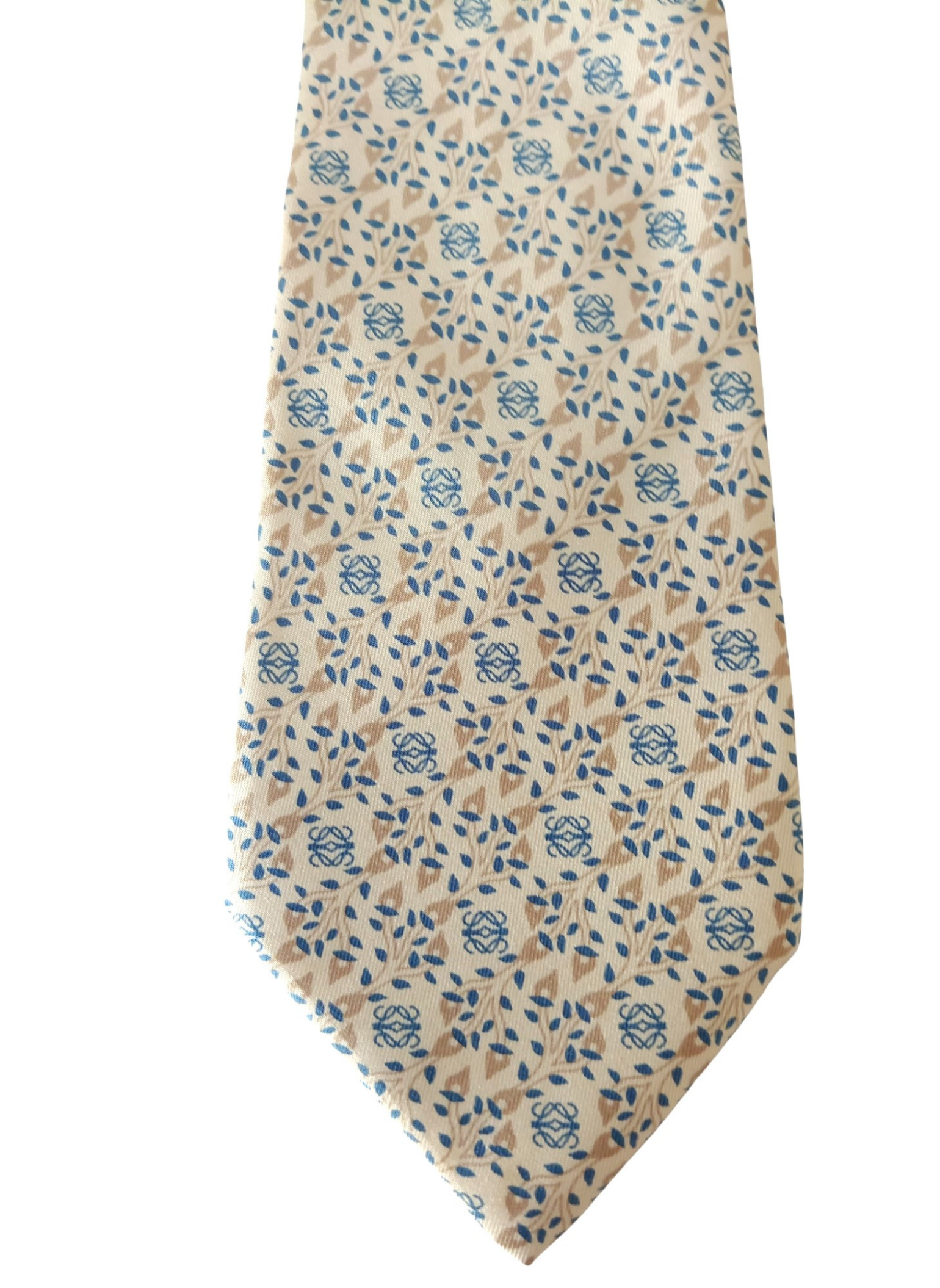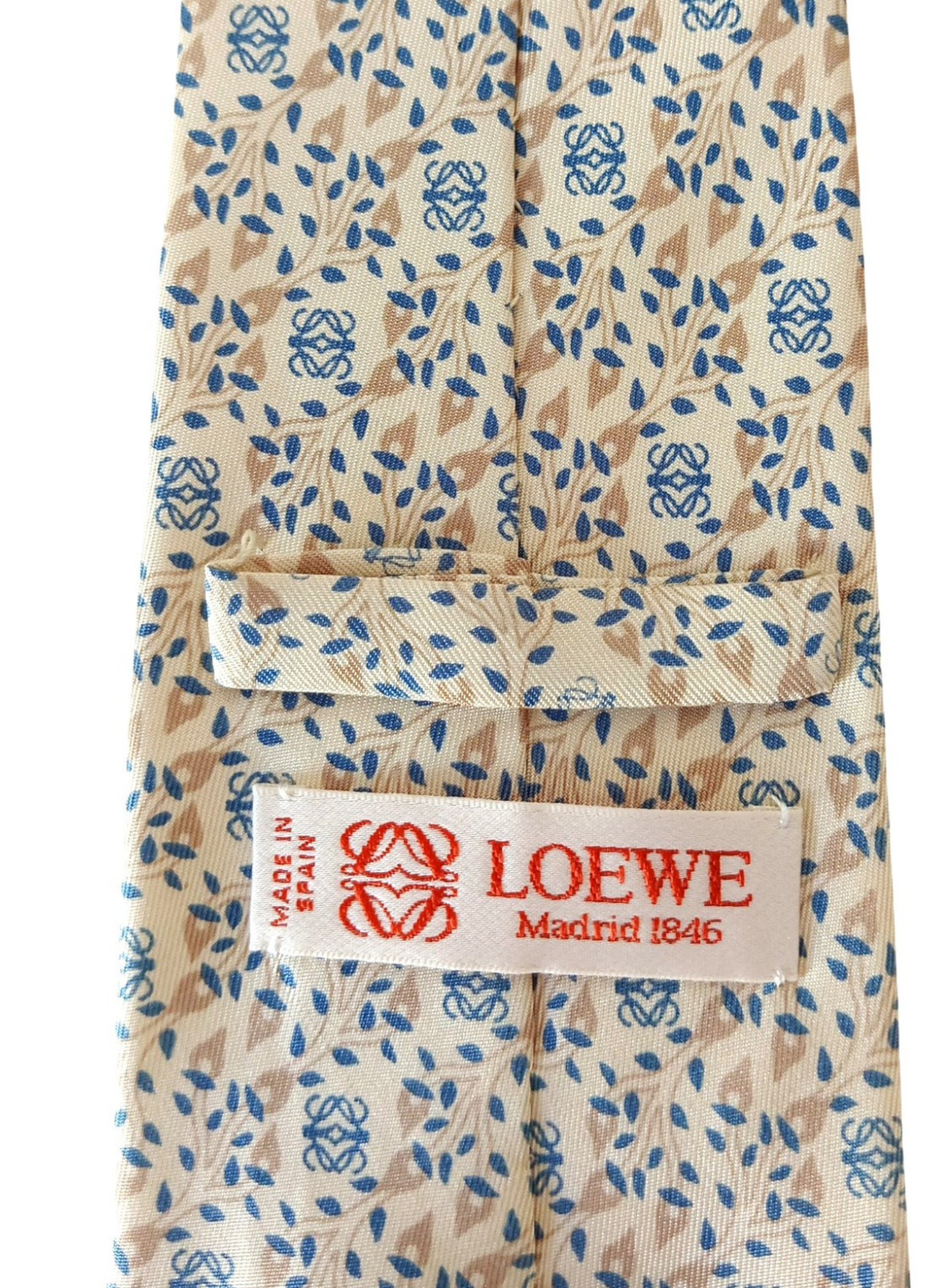 Corbata de Loewe,de la colección "Flora de Ultramar",100% seda.Fondo beige con anagrama de Loewe y motivos florales en tonos azules.Esta en perfecto estado.Mide 9 cms por la parte mas ancha.