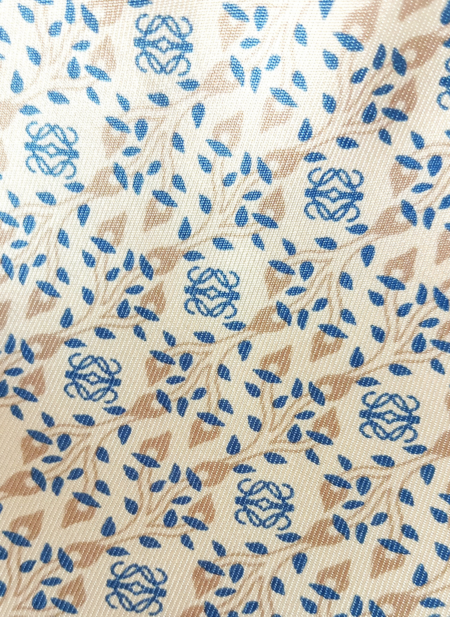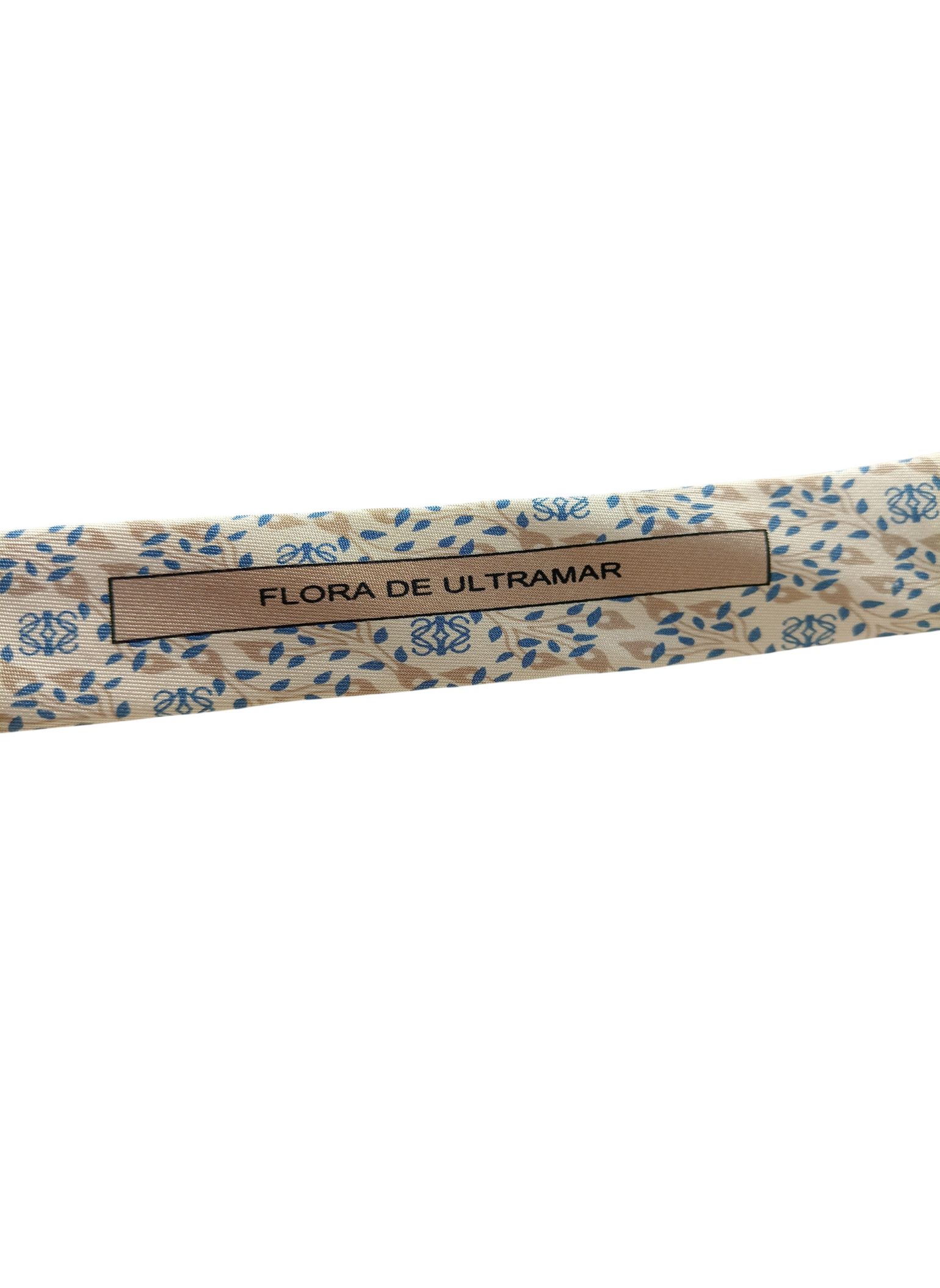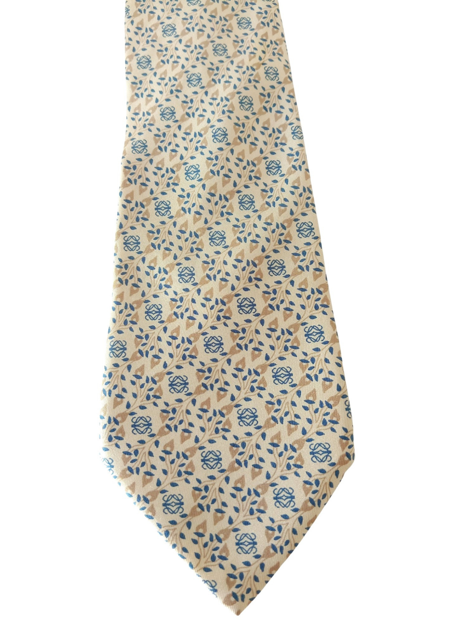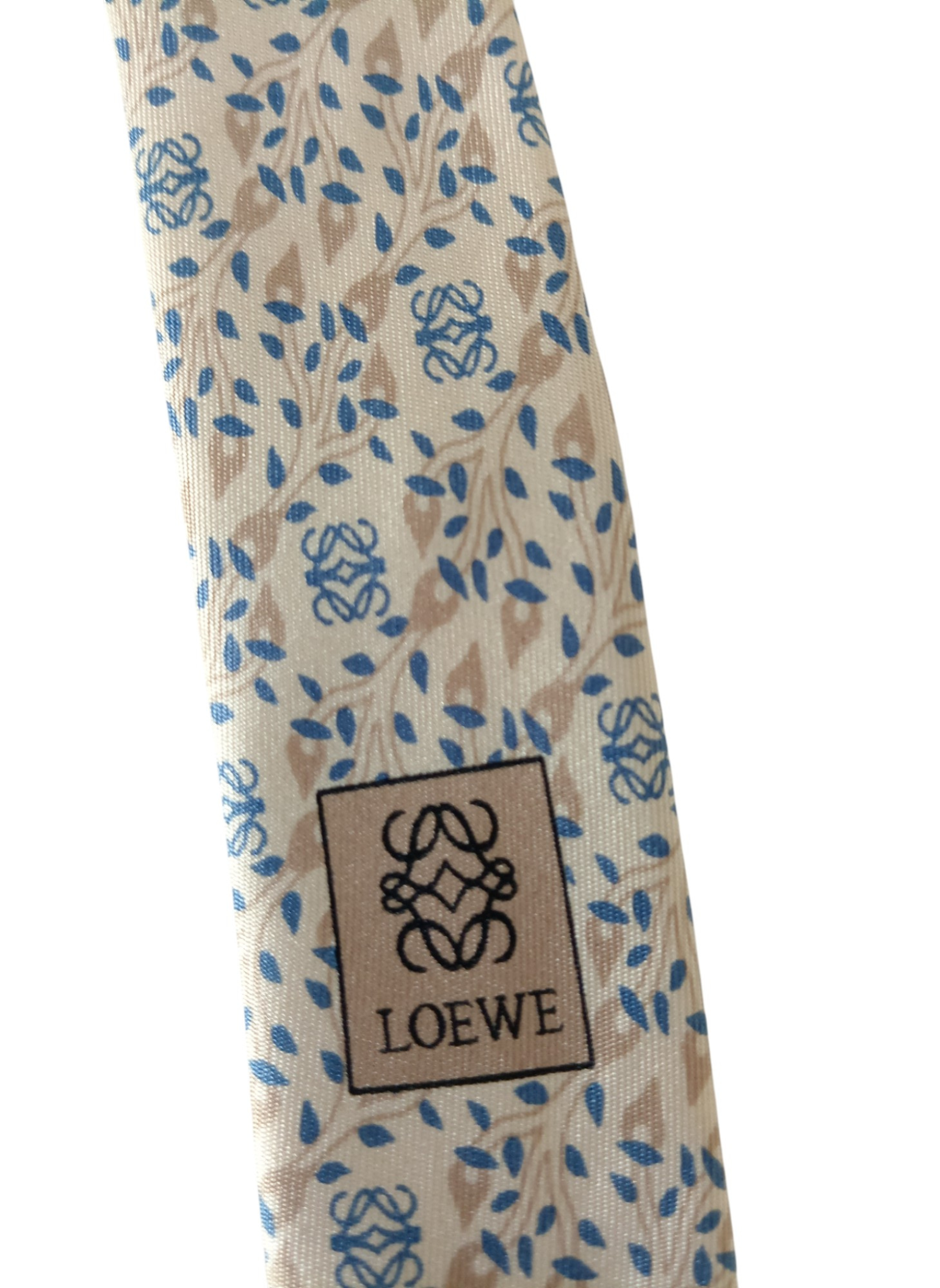 Corbata de Loewe,de la colección "Flora de Ultramar",100% seda.Fondo beige con anagrama de Loewe y motivos florales en tonos azules.Esta en perfecto estado.Mide 9 cms por la parte mas ancha.