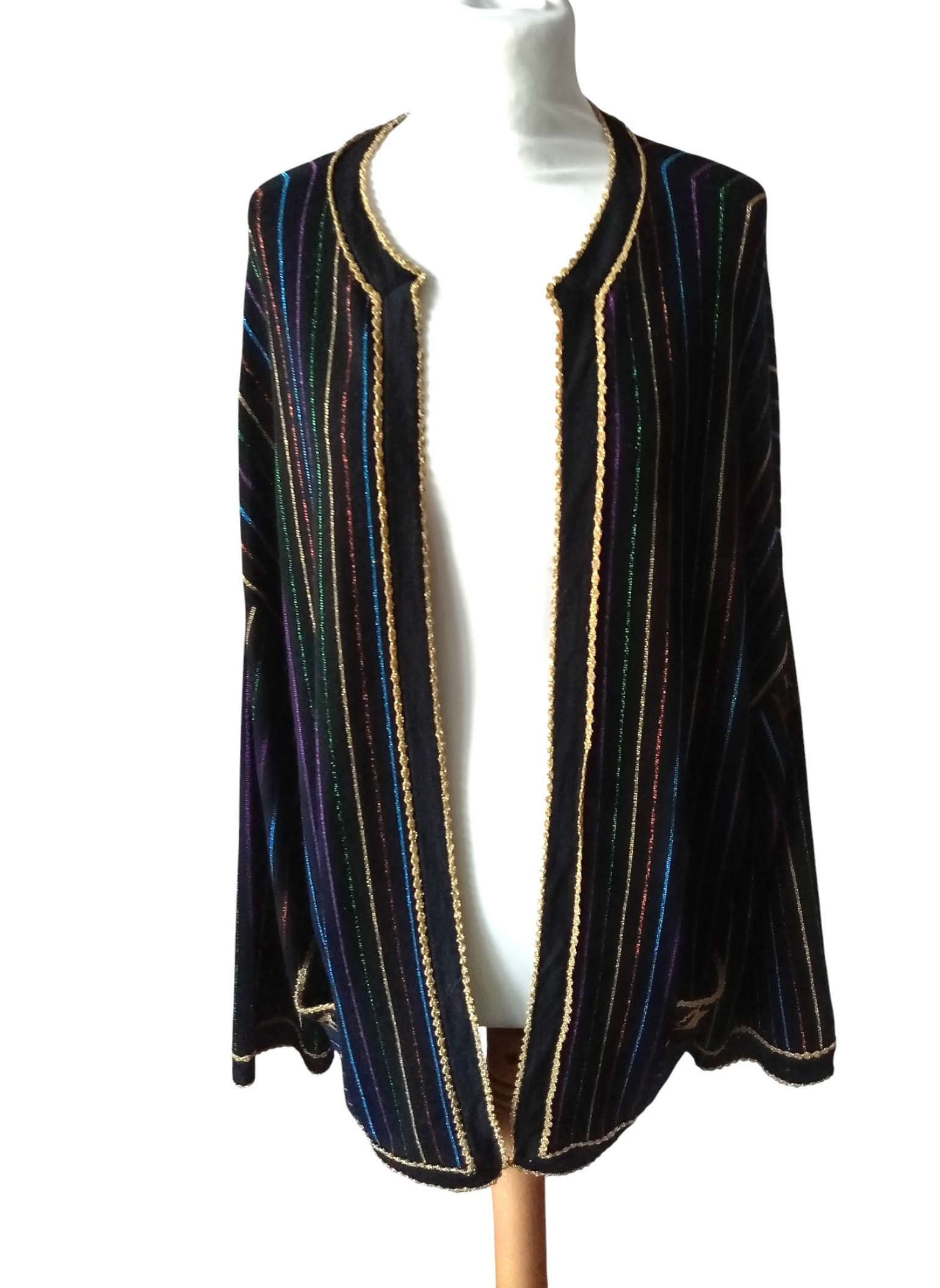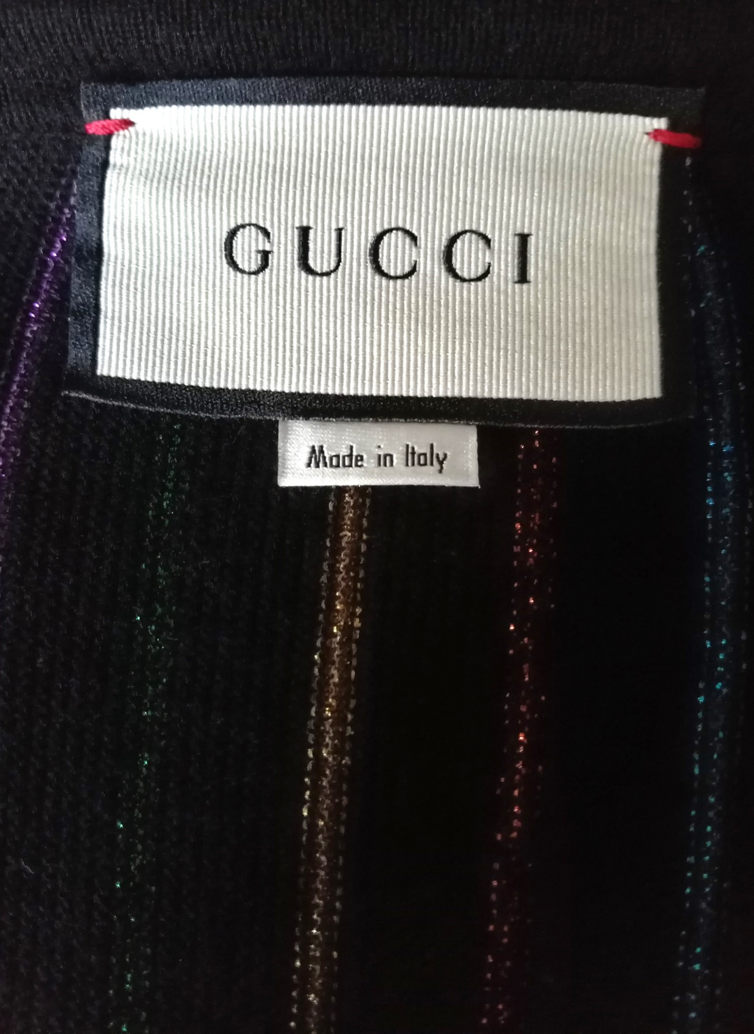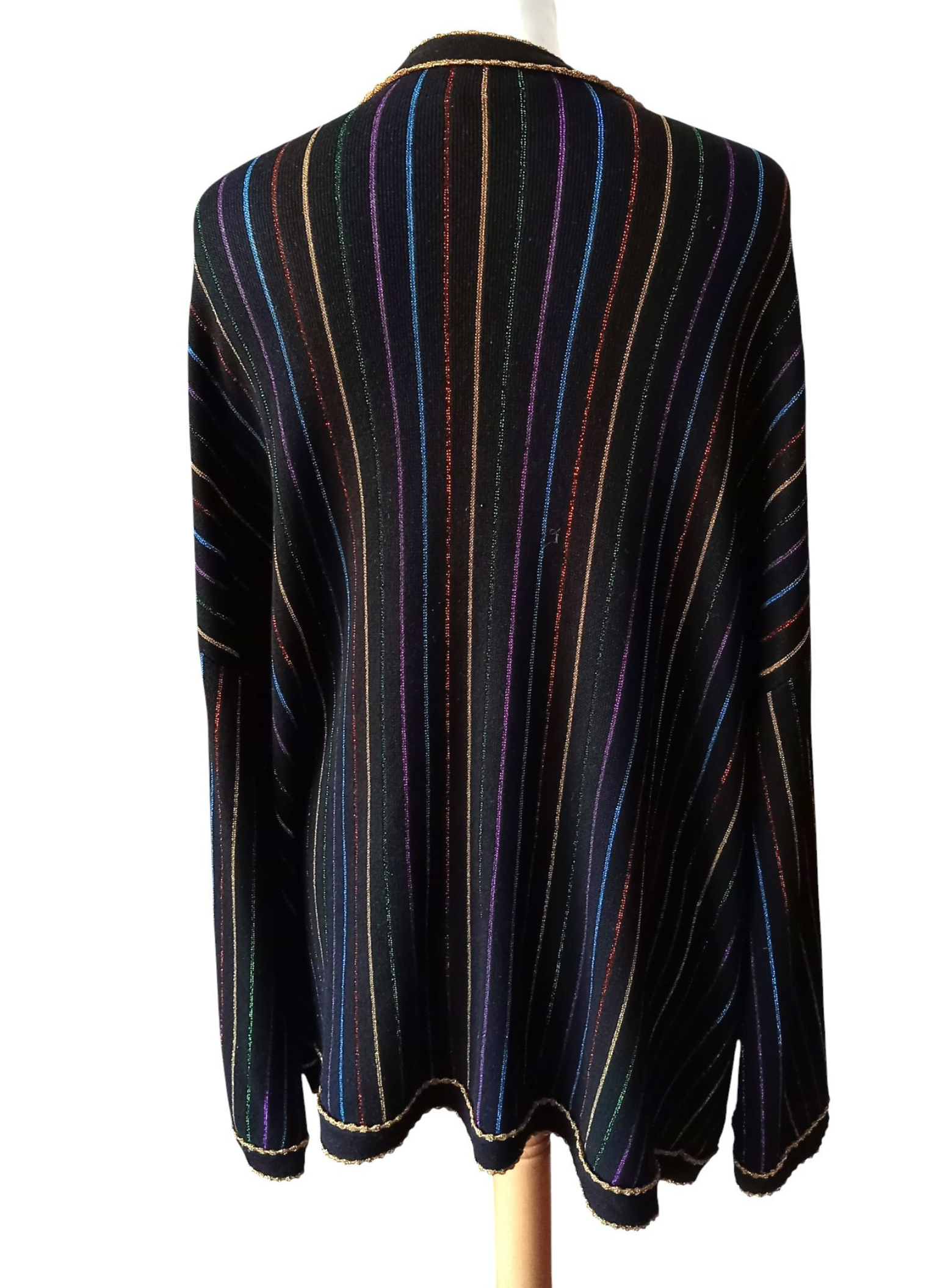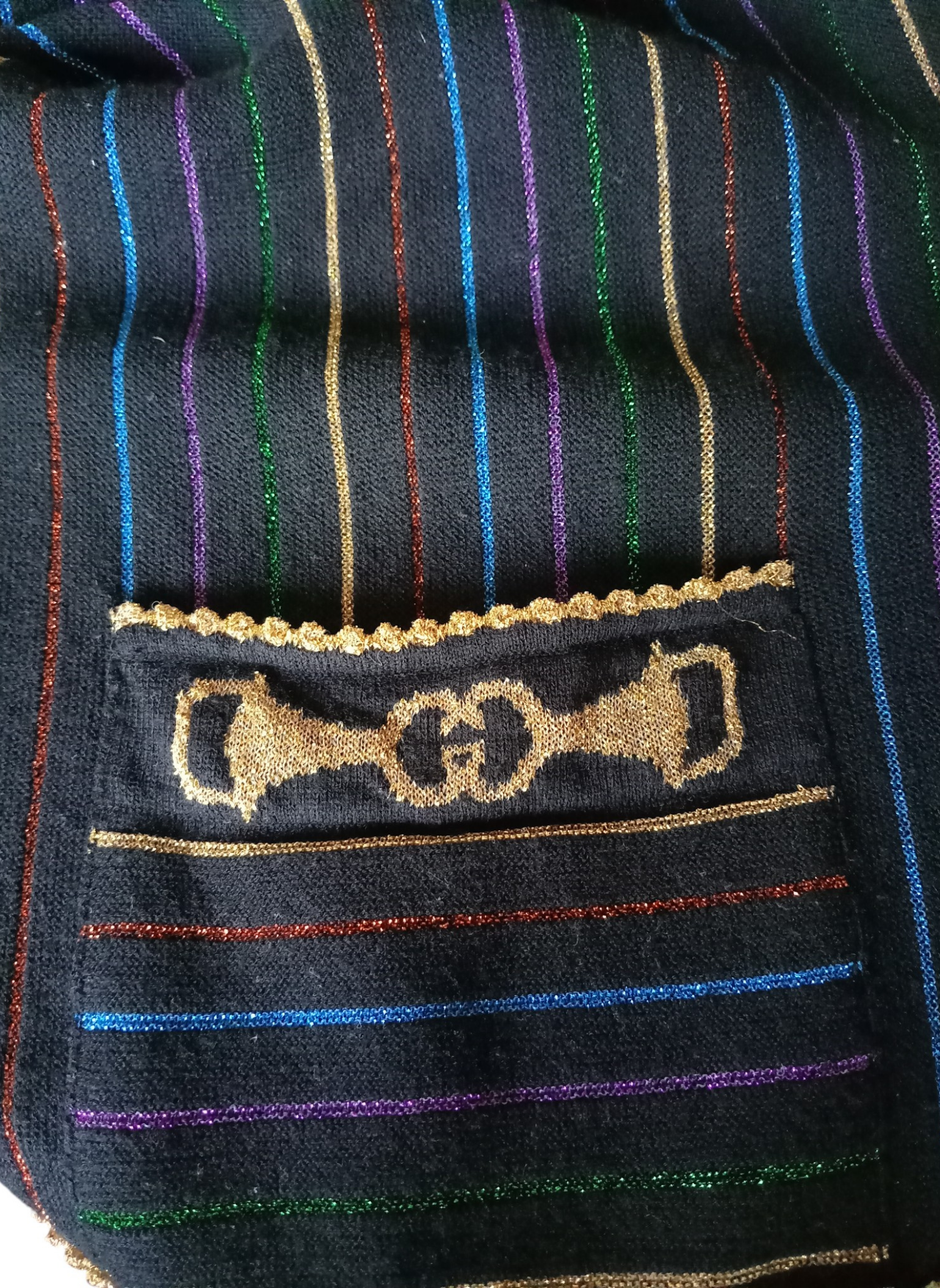 Chaqueta de lana de Gucci,con fondo negro y con finas rayas verticales metalizadas de varios colores.Bordes trenzados dorados a lo largo de la apertura y puños.Dos bolsillos delanteros con en bordado dorado del Horsebite tipico de la firma.Esta en perfecto estado.Composicion: 92% Lana,5% Fibra y 3% Poliamide.Talla S. Medidas: 40cms de hombro x 50 cms de manga x 75 cms de largo.