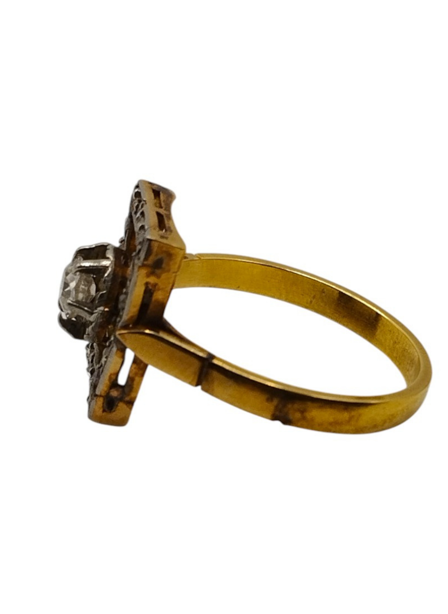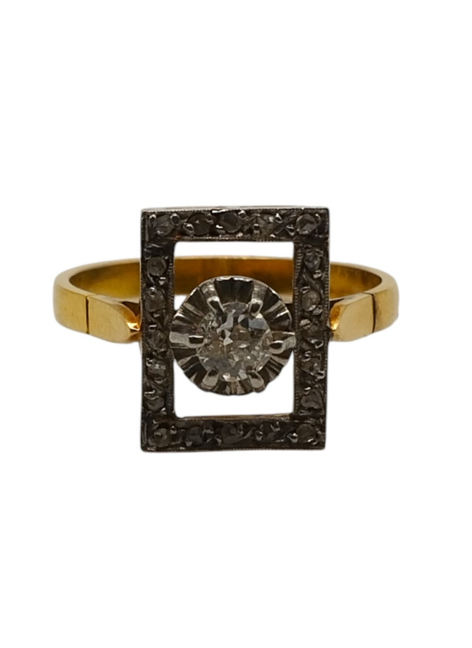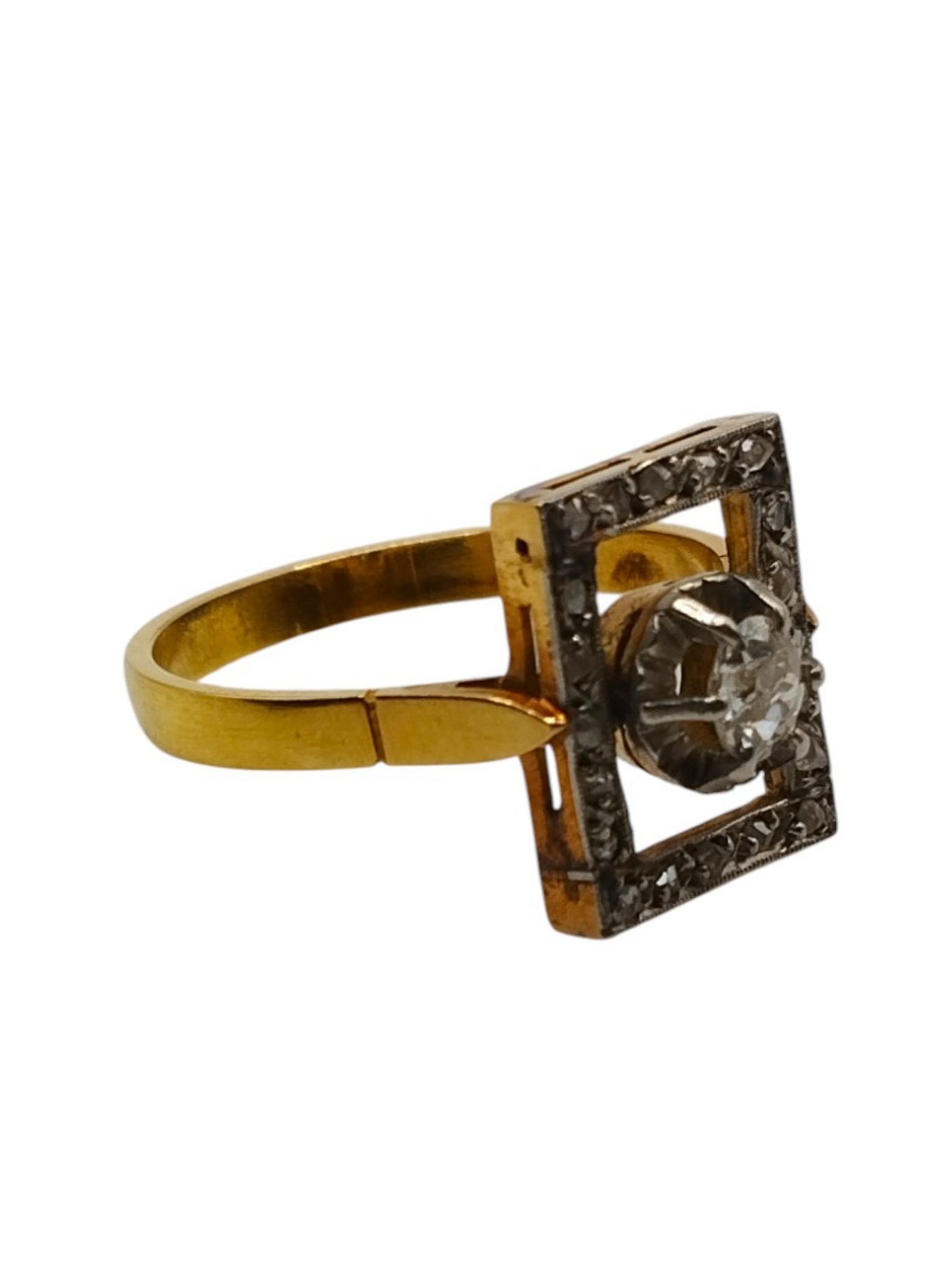 Anillo Vintage,forma cuadrada con diamante central de 0.20kt aproximado,talla antigua,rodeado con un cuadrado de diamantes pequeños.Aro de oro rosa de 18 kts y parte de arriba oro blanco de 18 kts.Es una talla 14.pesa en total 3,8 grs.Mide 12,8 mm de alto x 9,8 mm de ancho.