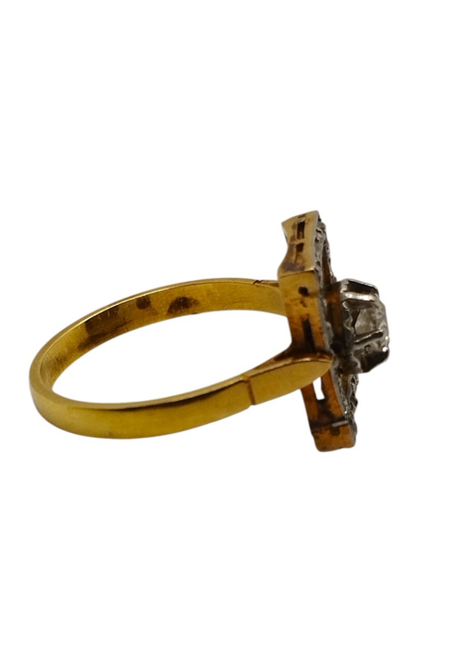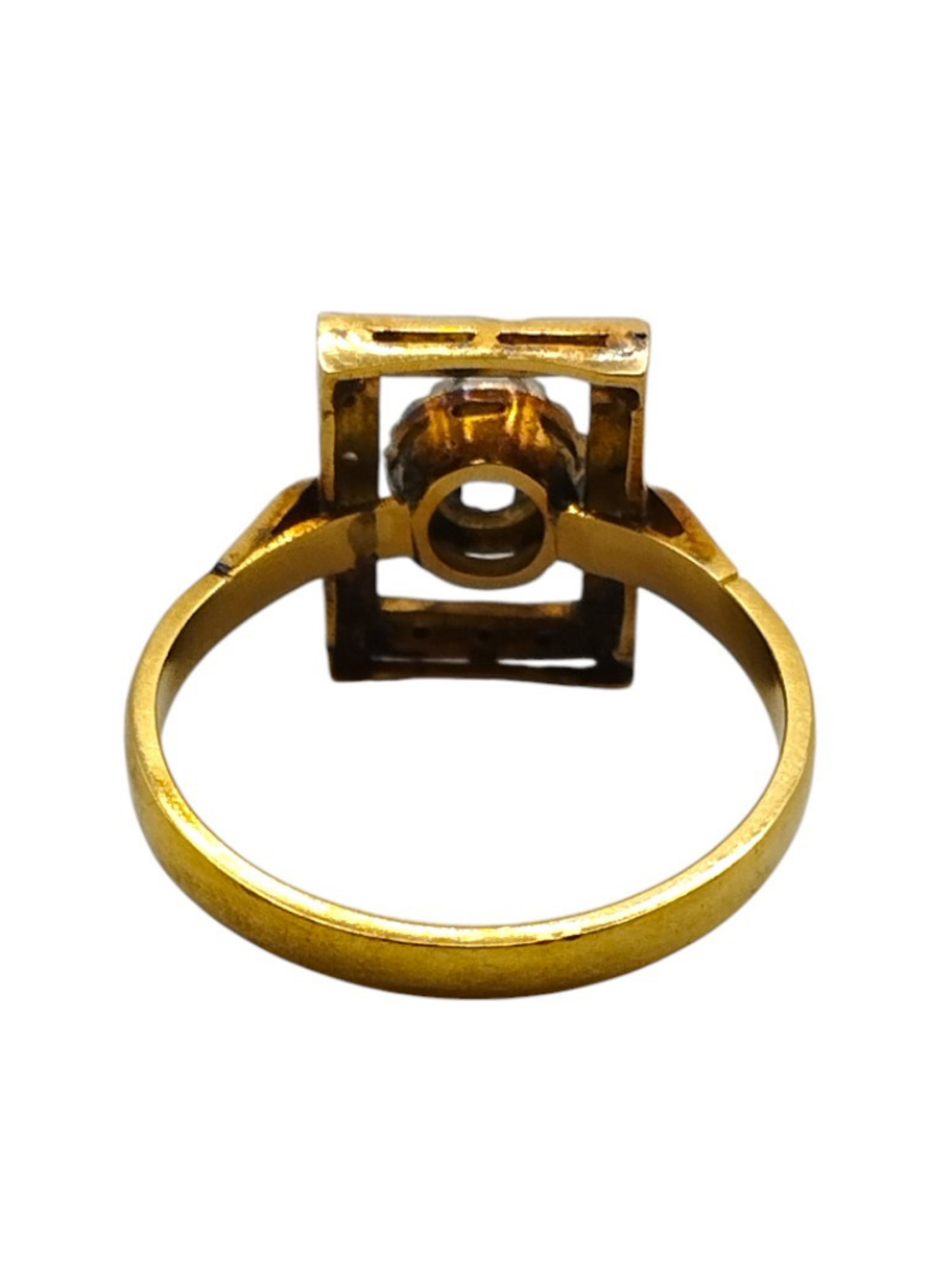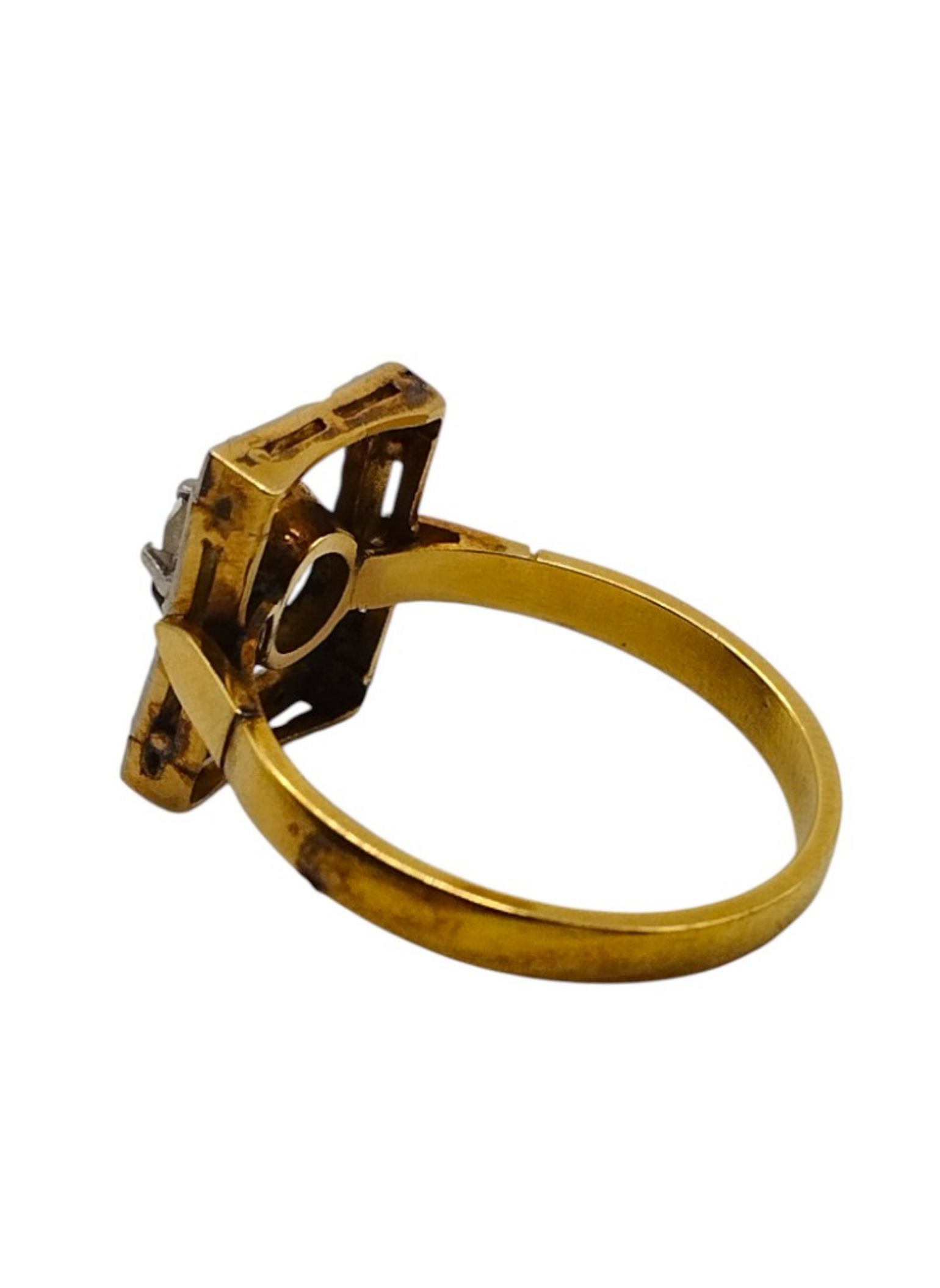 Anillo Vintage,forma cuadrada con diamante central de 0.20kt aproximado,talla antigua,rodeado con un cuadrado de diamantes pequeños.Aro de oro rosa de 18 kts y parte de arriba oro blanco de 18 kts.Es una talla 14.pesa en total 3,8 grs.Mide 12,8 mm de alto x 9,8 mm de ancho.
