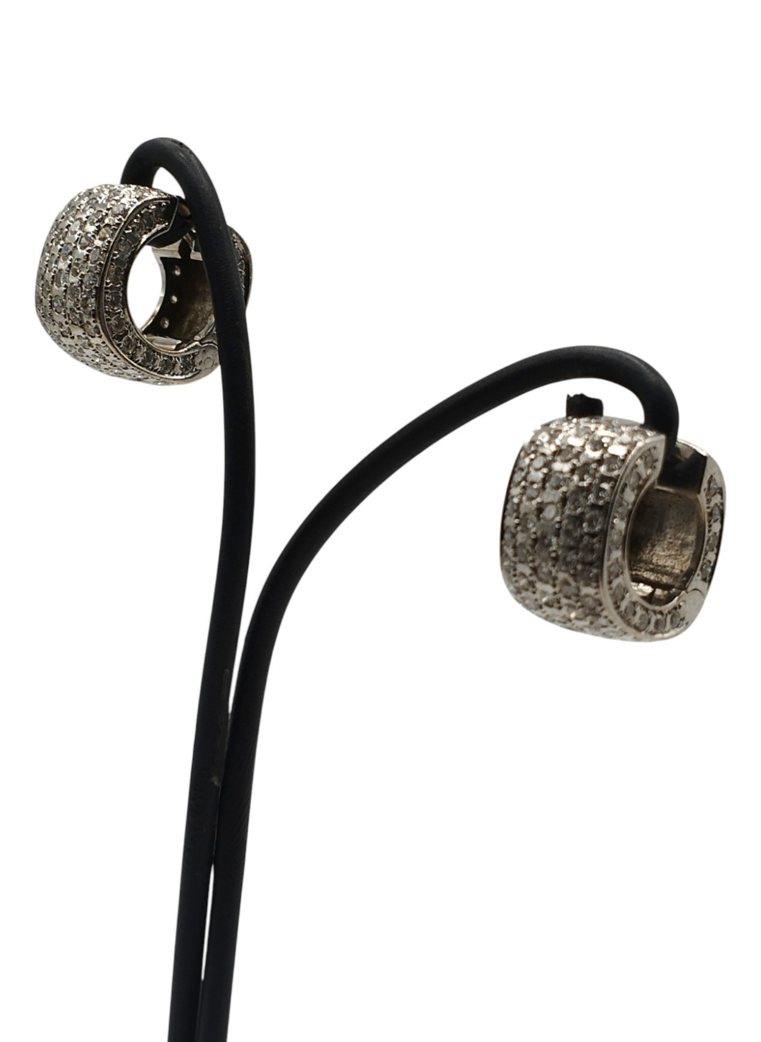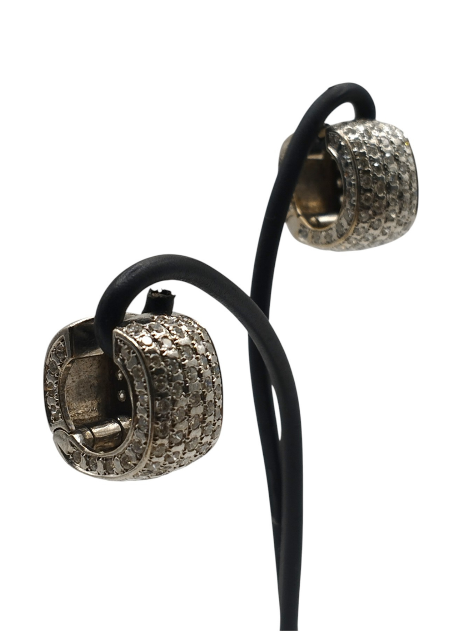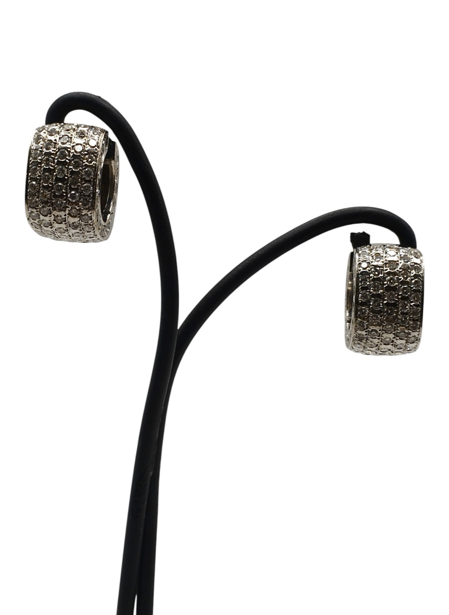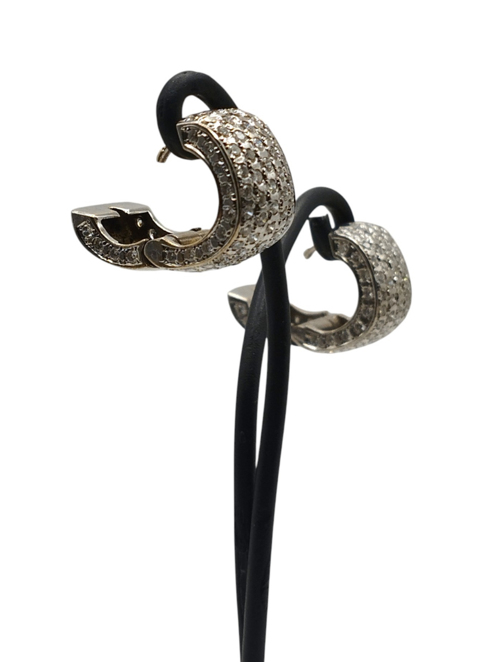 Pendientes de oro blanco de 18 Kts con forma de aro ancho,con pavé de brillantes,brillantes por la parte de delante y por el lateral,la parte de atras solo oro blanco.Medidas . 8,7 mm de ancho x 14,7 mm de alto.Modelo actual en muy buen estado.Pesan 10,8 grs.Y tienen un peso aproximado en brillantes de 2,8 Qts