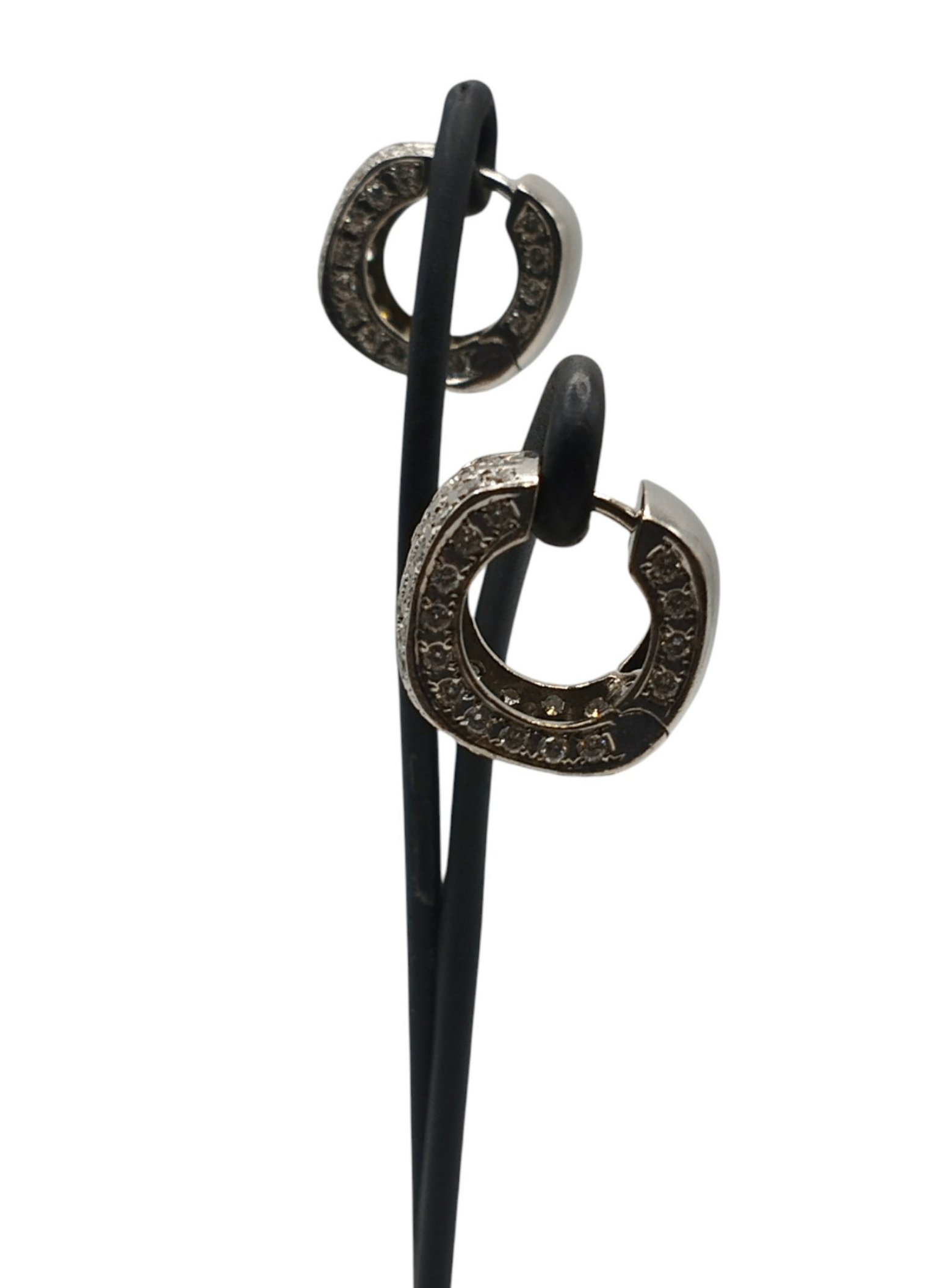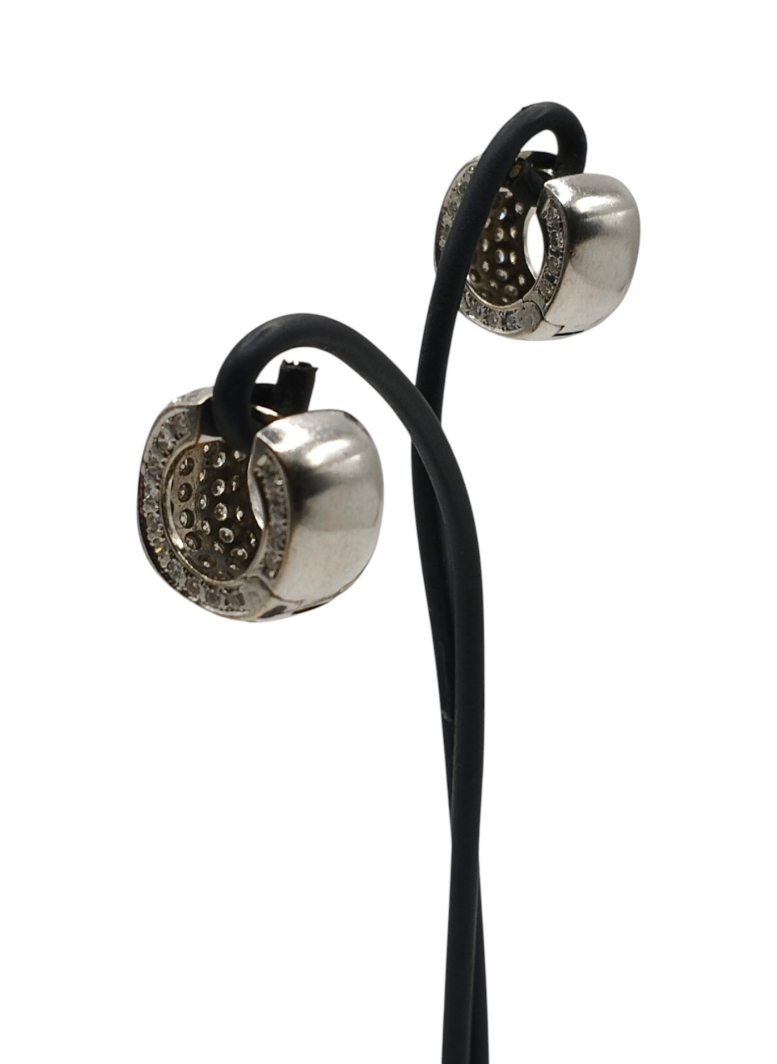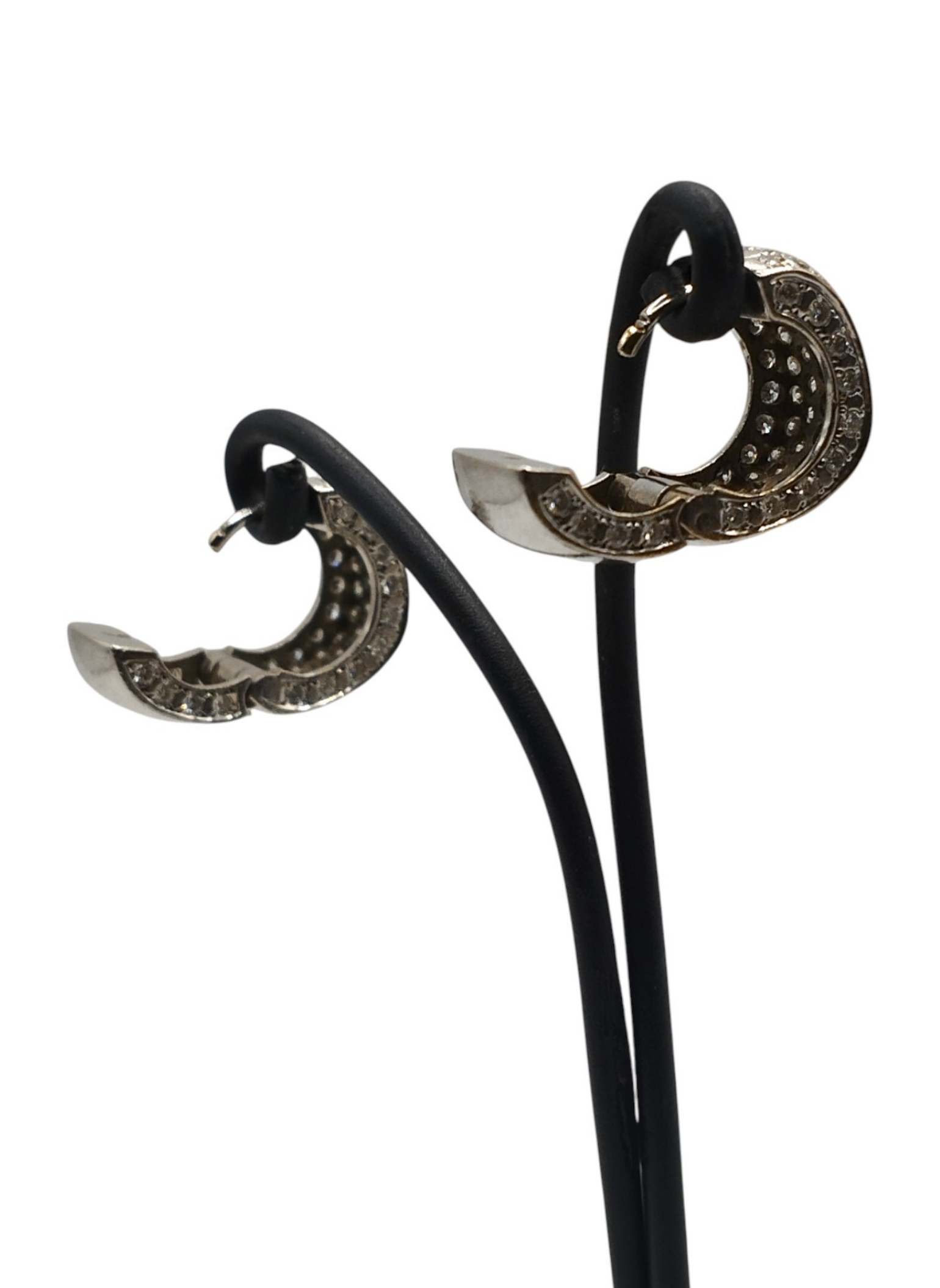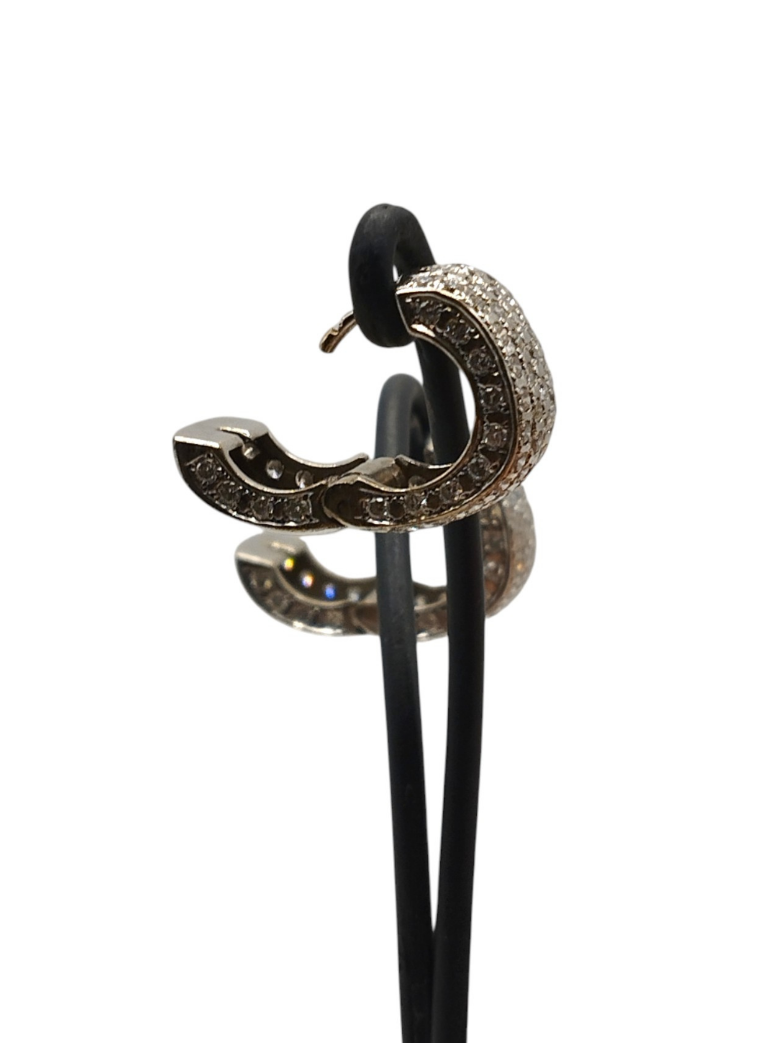 Pendientes de oro blanco de 18 Kts con forma de aro ancho,con pavé de brillantes,brillantes por la parte de delante y por el lateral,la parte de atras solo oro blanco.Medidas . 8,7 mm de ancho x 14,7 mm de alto.Modelo actual en muy buen estado.Pesan 10,8 grs.Y tienen un peso aproximado en brillantes de 2,8 Qts