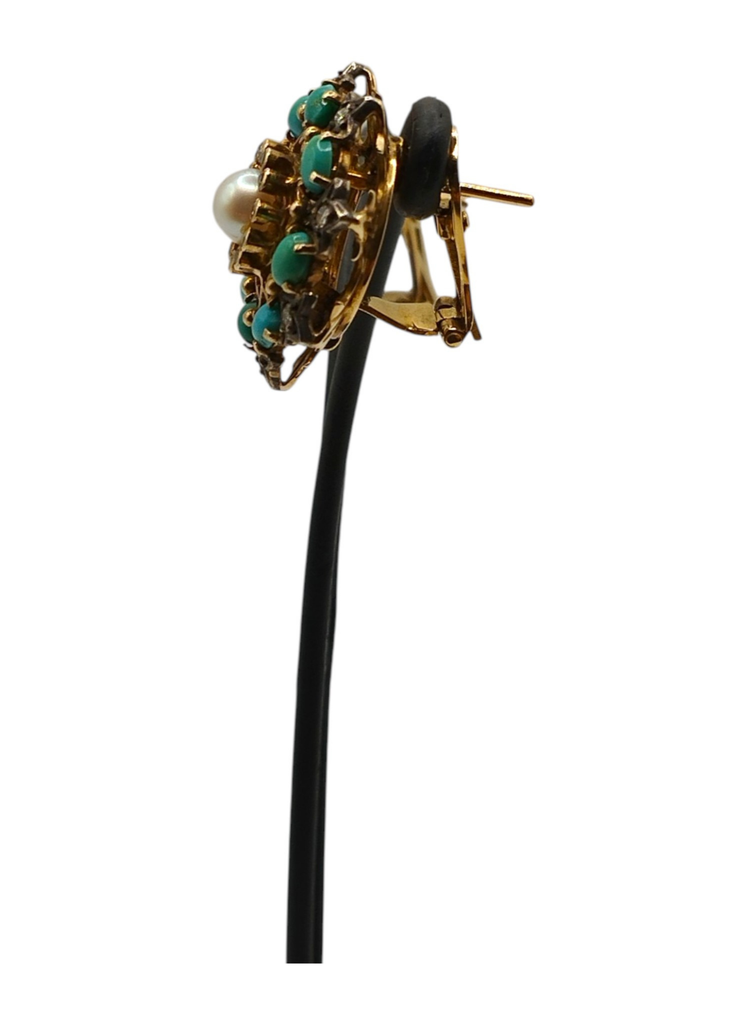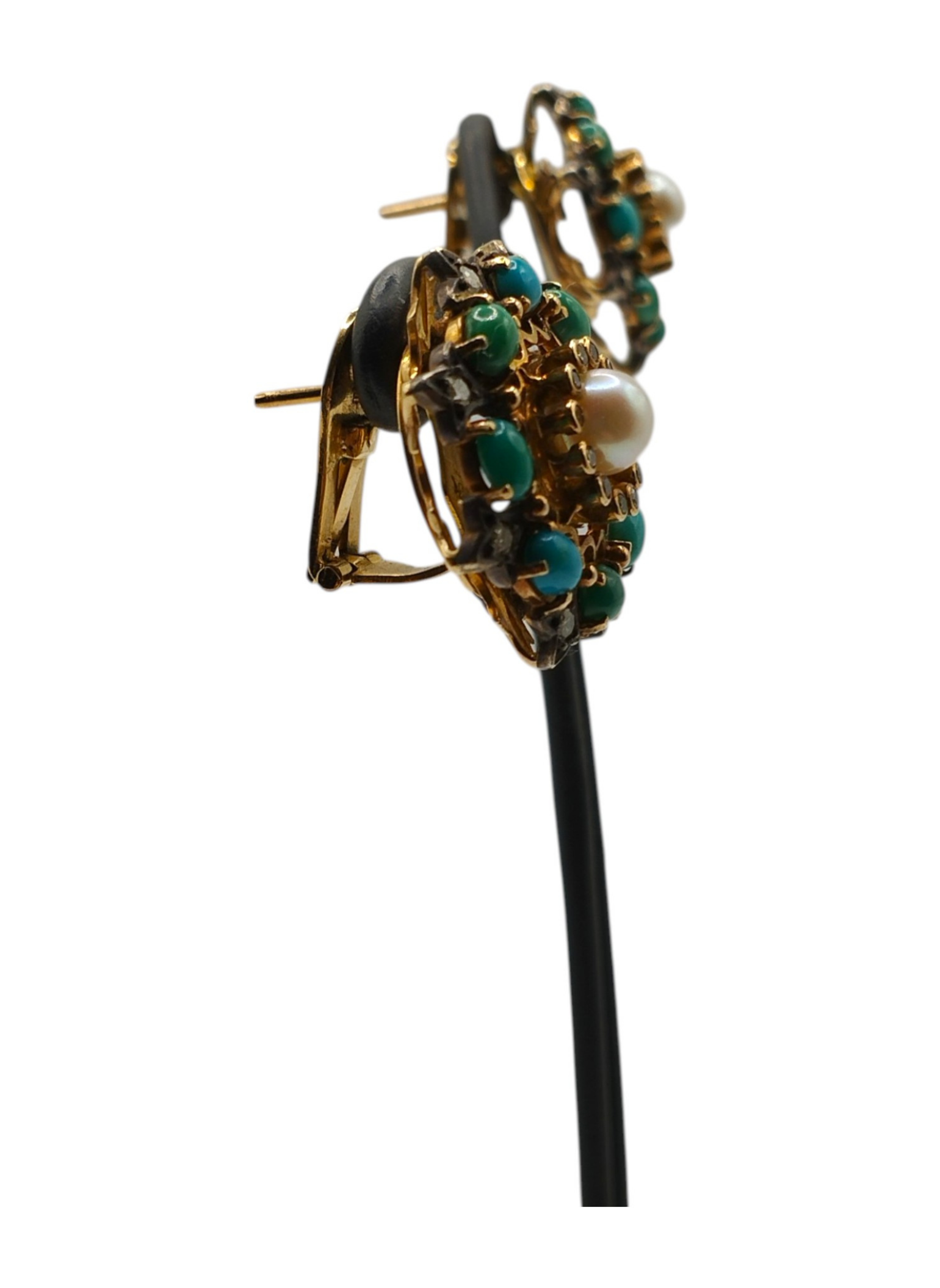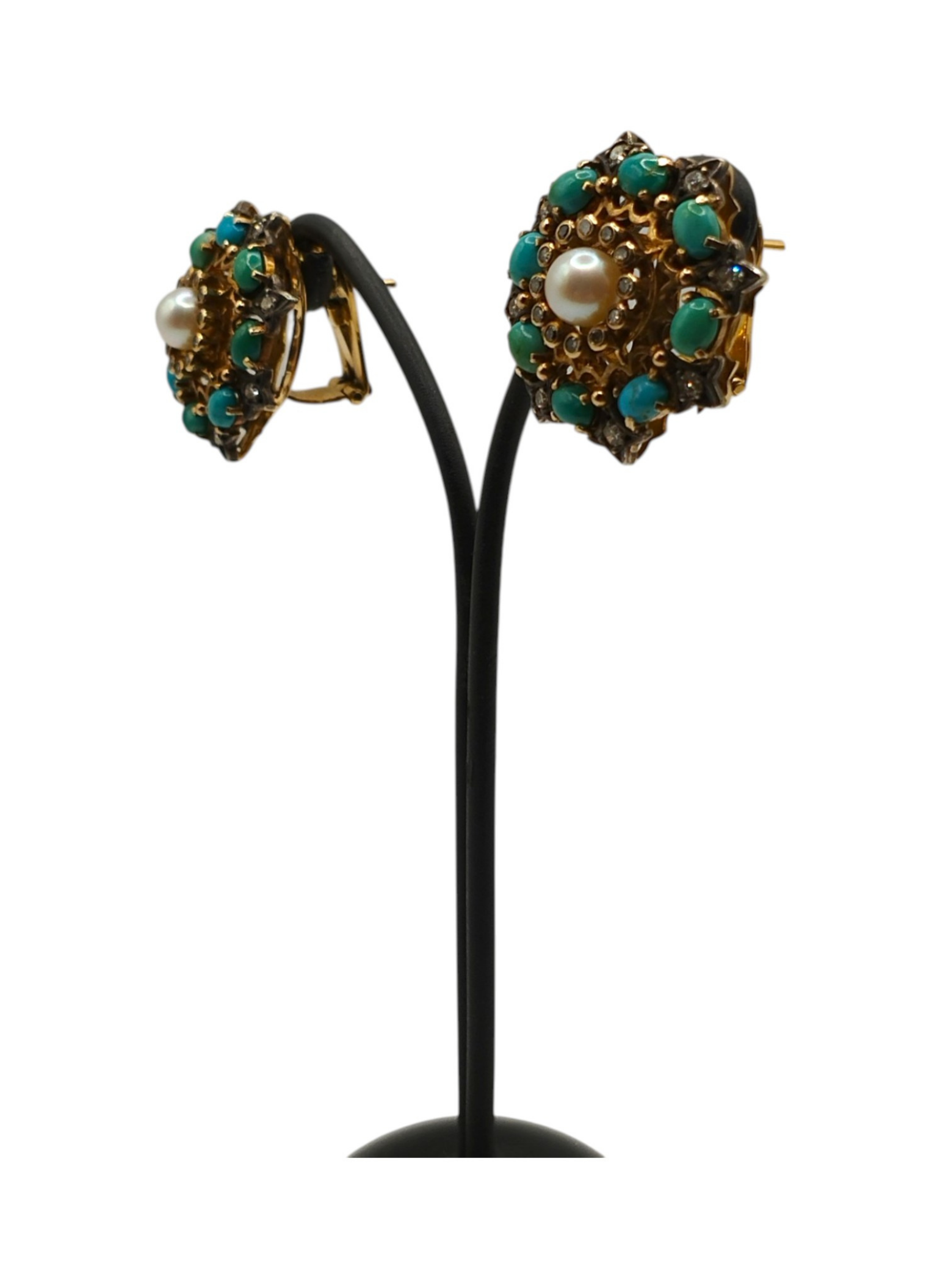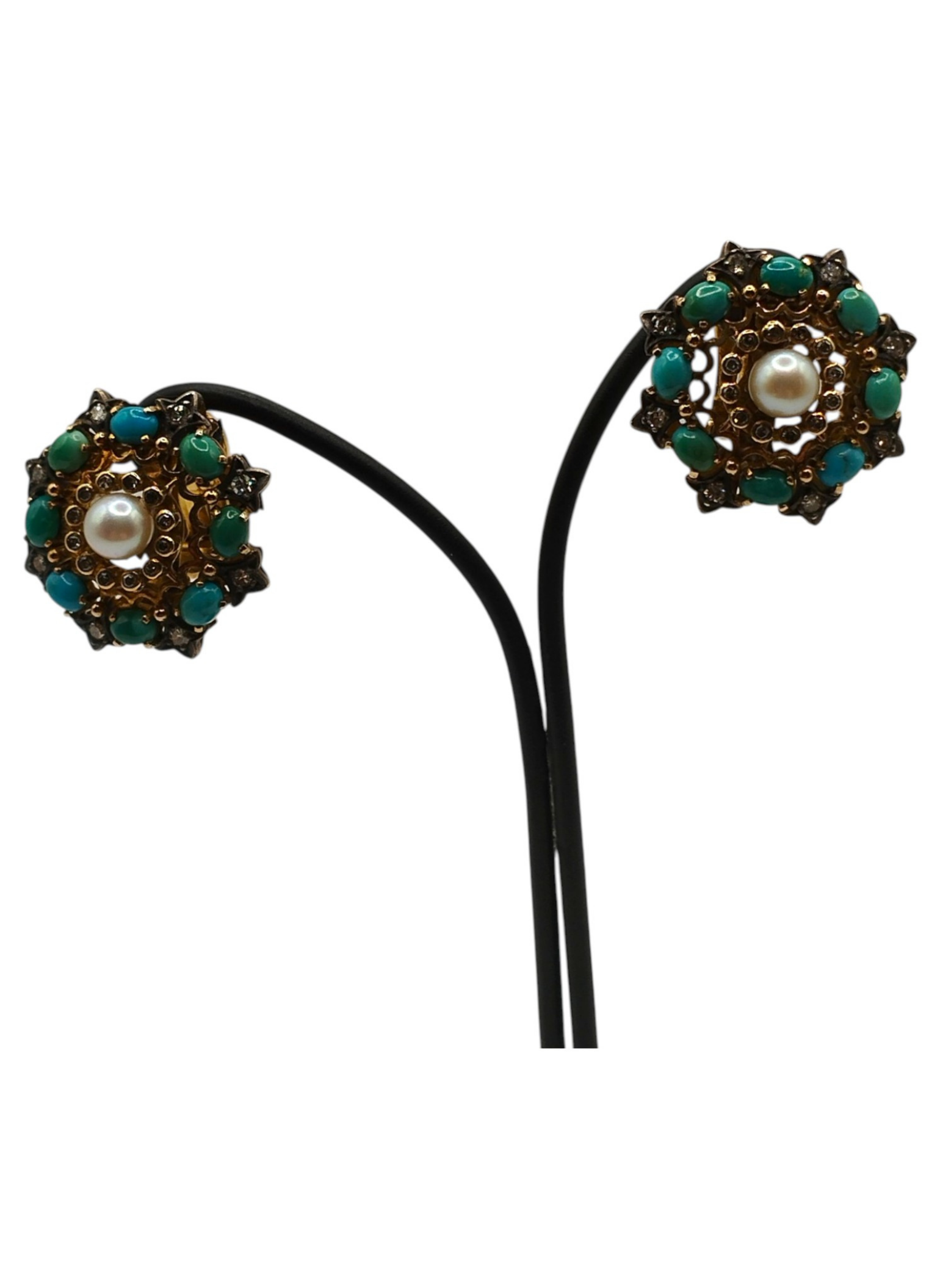 Pendientes Vintage en forma de rosetón ,de oro de 18Kts y engastes en plata.Perla central rodeado de turquesas y diamantes.Epoca Vctoraina.Estan en muy buen estado.Miden 20 mm de diámetro,tienen un peso total de 15,3 grs y un peso en diamantes de 0,72 Qts aproximadamente .