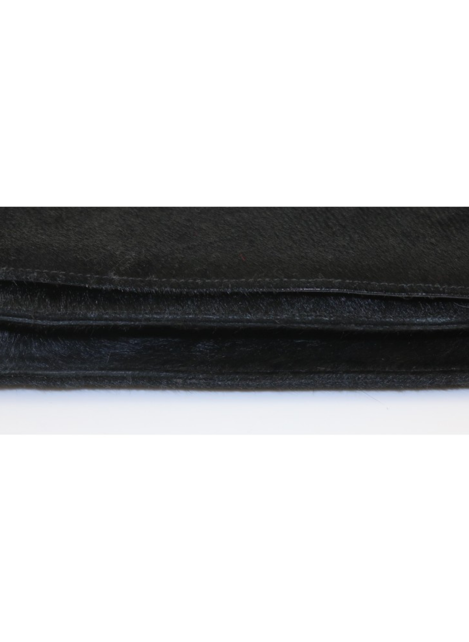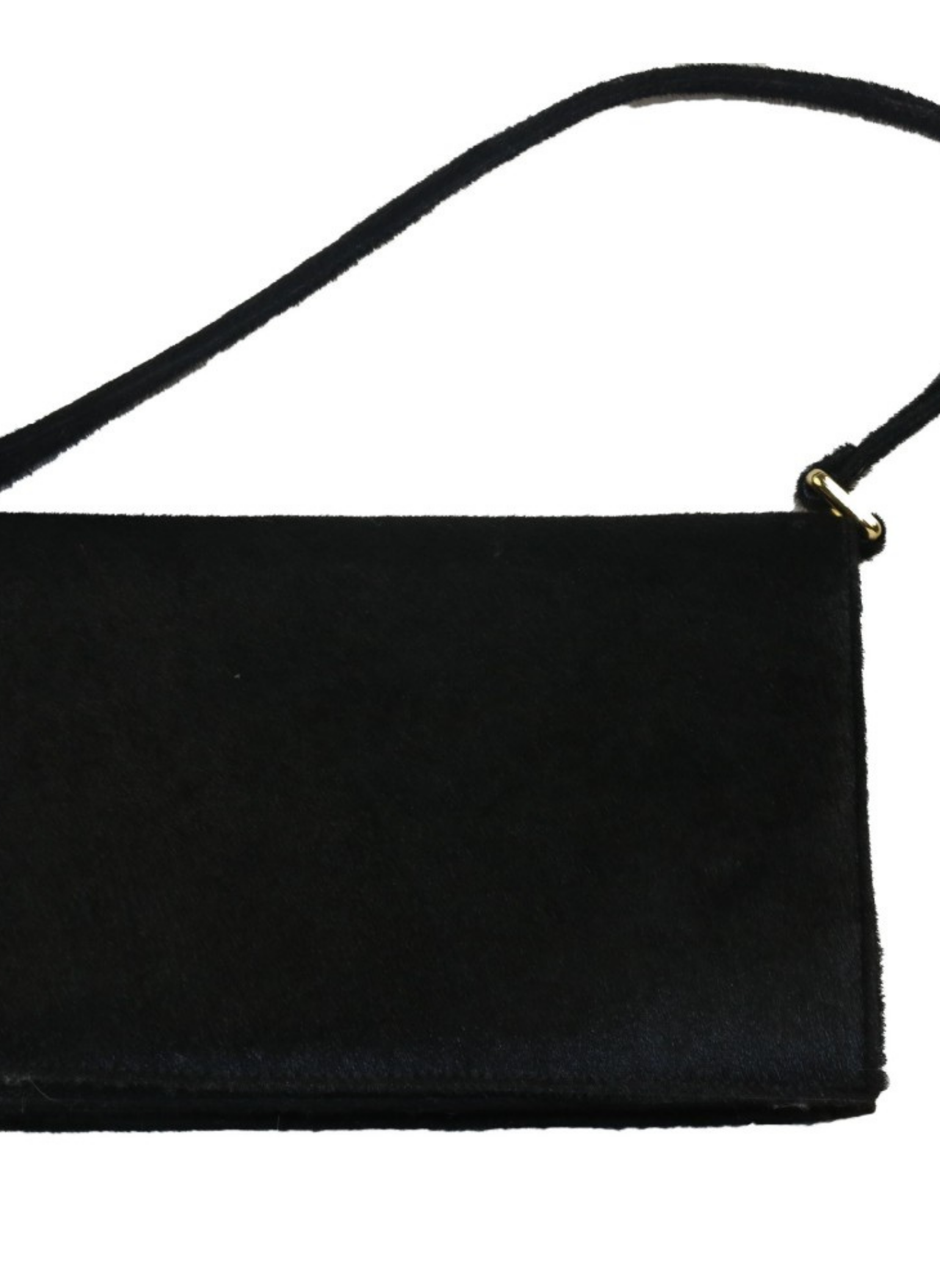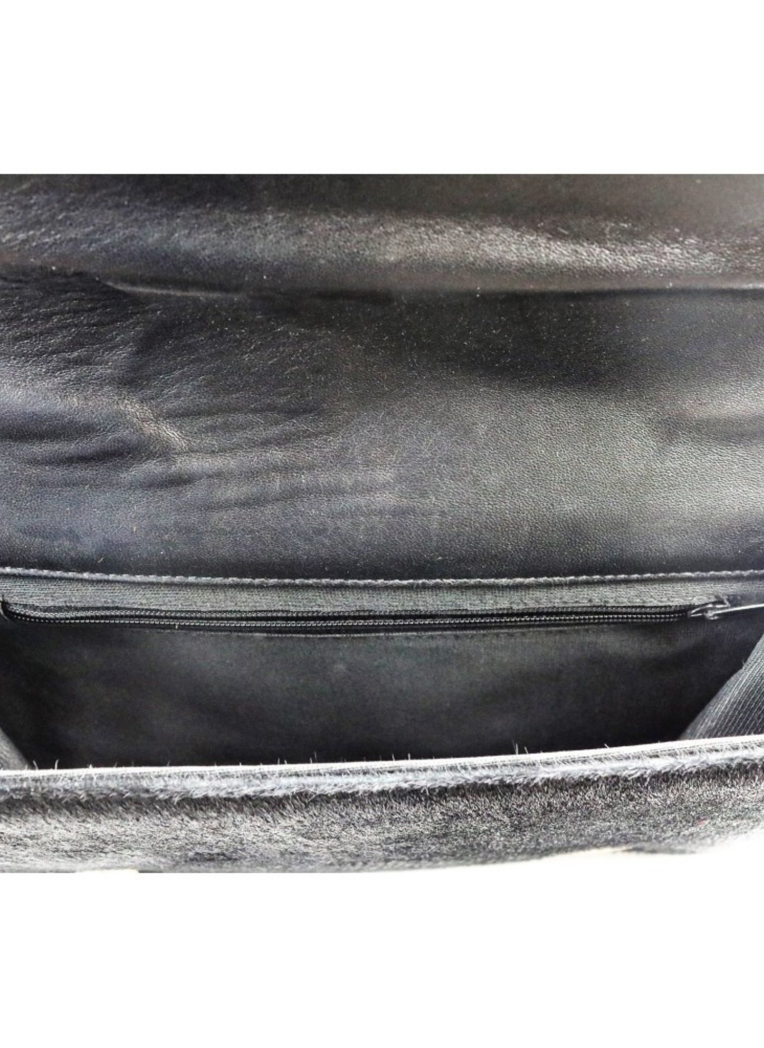 Schwarze Ponyfelltasche mit Klappe und kurzem Schultergriff sowie zwei Druckknöpfen, die sich zu einem mit Leder und Stoff gefütterten Innenraum mit einer Reißverschlusstasche öffnen lässt. Enthält keine Gebrauchsspuren.