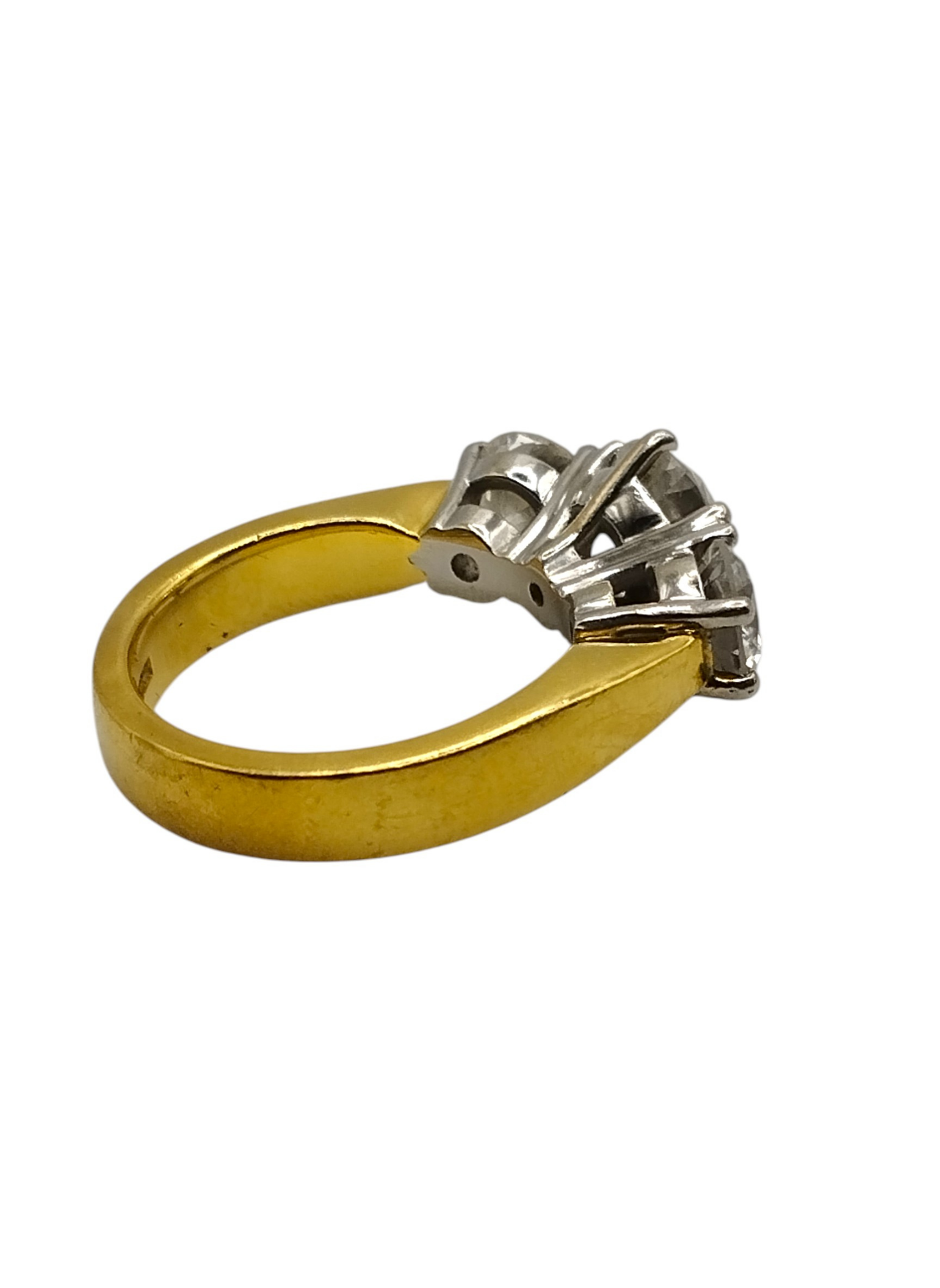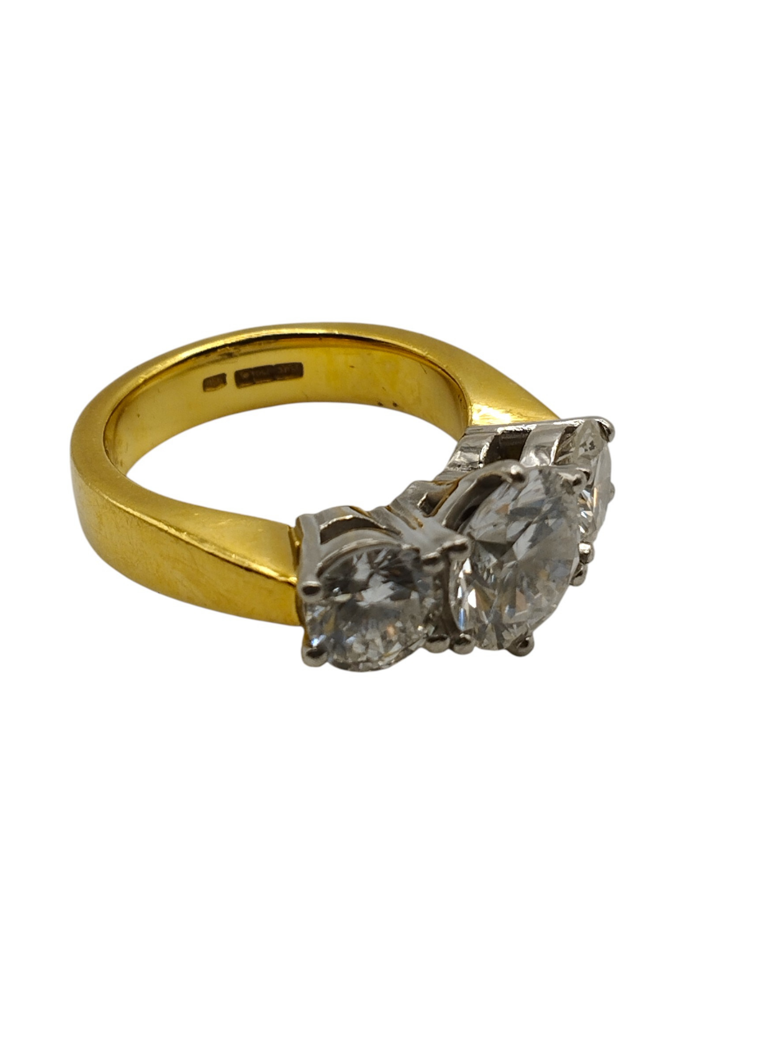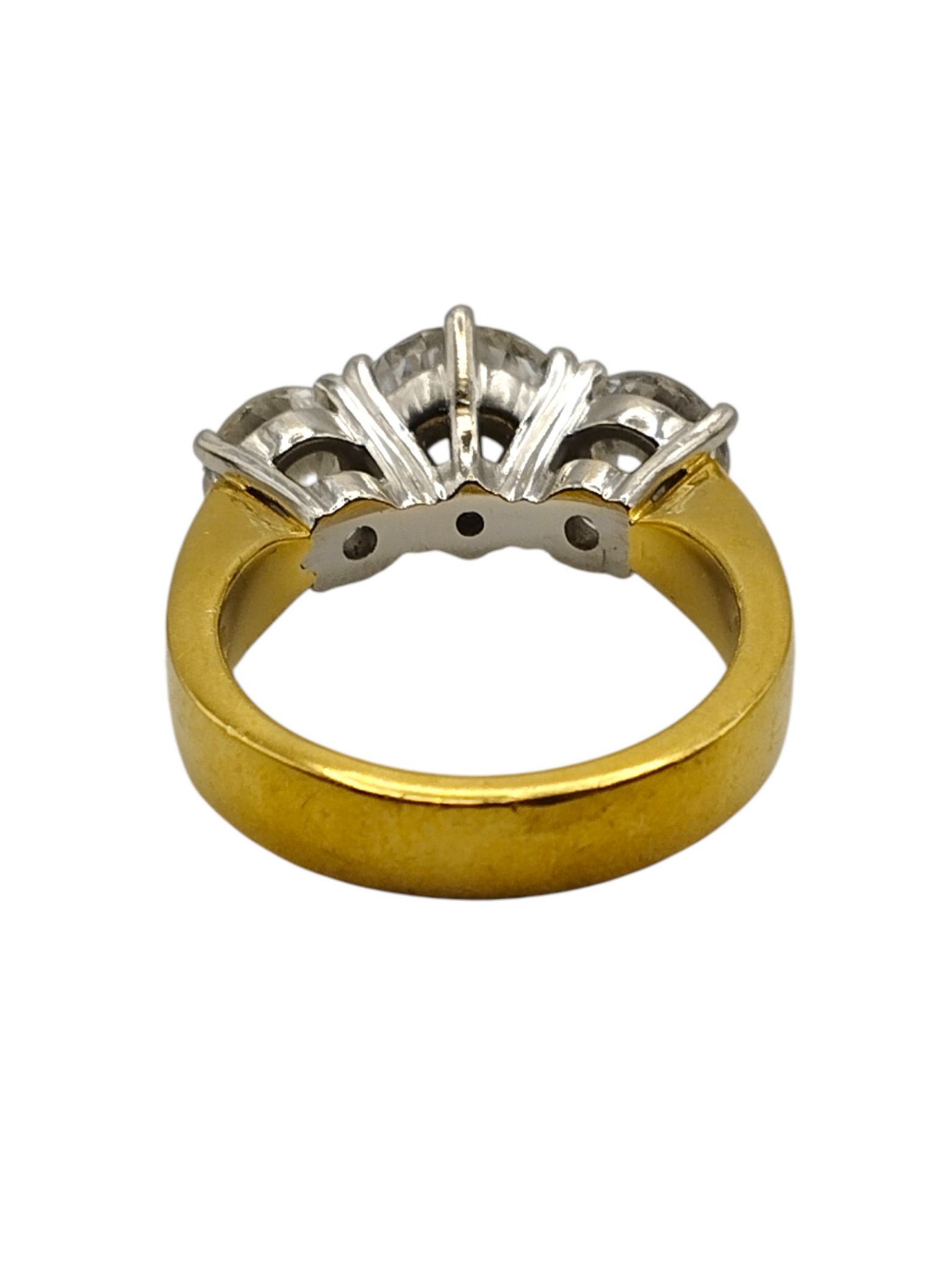 Anillo de oro amarillo de 18 Kts con tres brillantes engastados en platino con garras.El brillante central de 1,50 Qts y los laterales de 0,50 cada uno.Peso total en brillantes 2,5 Qts.Años 80-90 ,vintage.Muy buen estado,peso total 9 grs.es una talla 9,5.