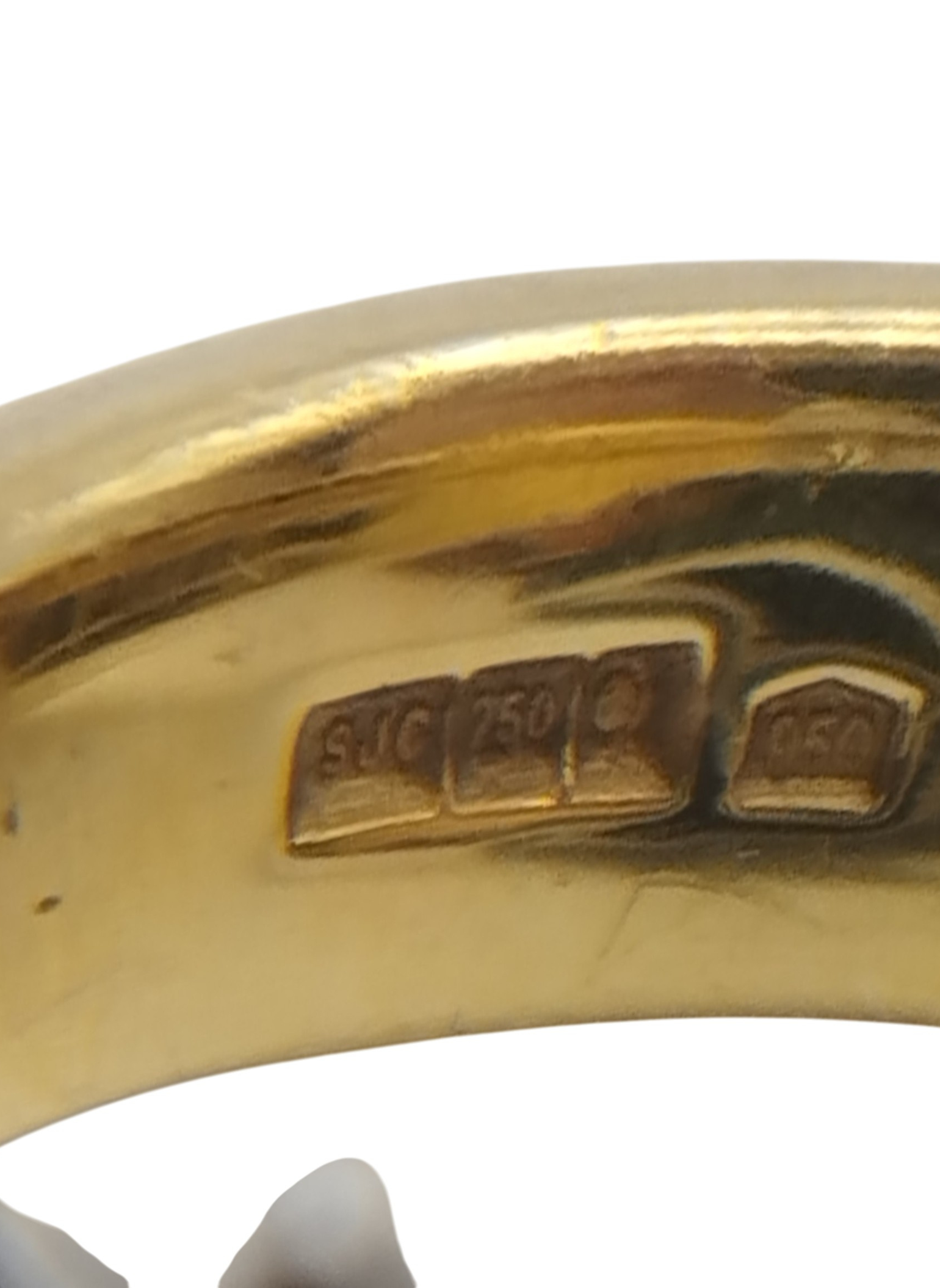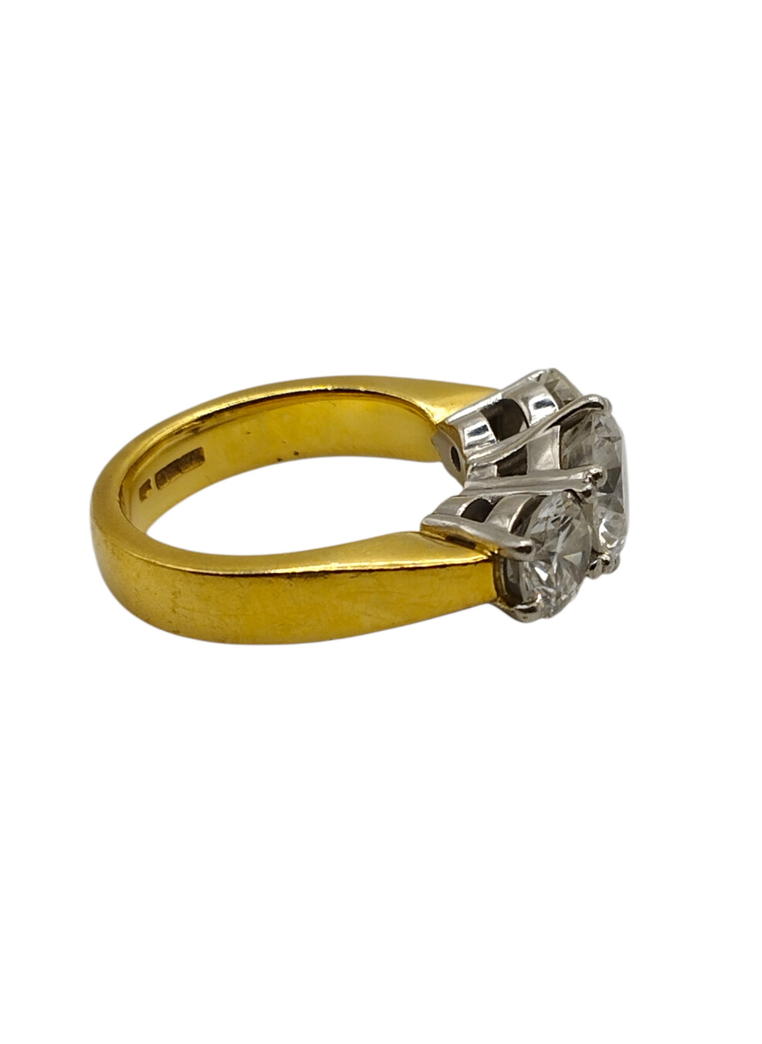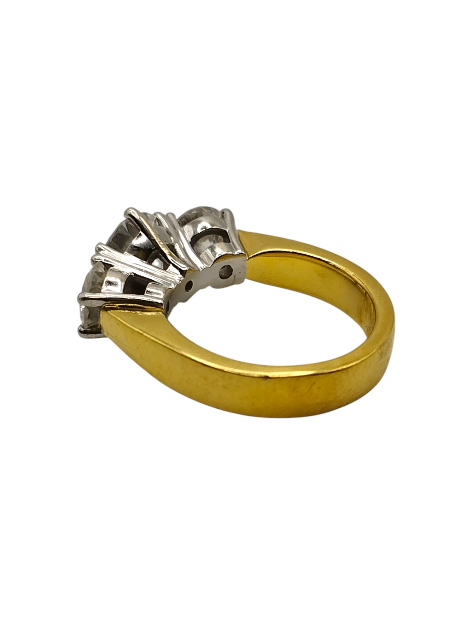 Anillo de oro amarillo de 18 Kts con tres brillantes engastados en platino con garras.El brillante central de 1,50 Qts y los laterales de 0,50 cada uno.Peso total en brillantes 2,5 Qts.Años 80-90 ,vintage.Muy buen estado,peso total 9 grs.es una talla 9,5.