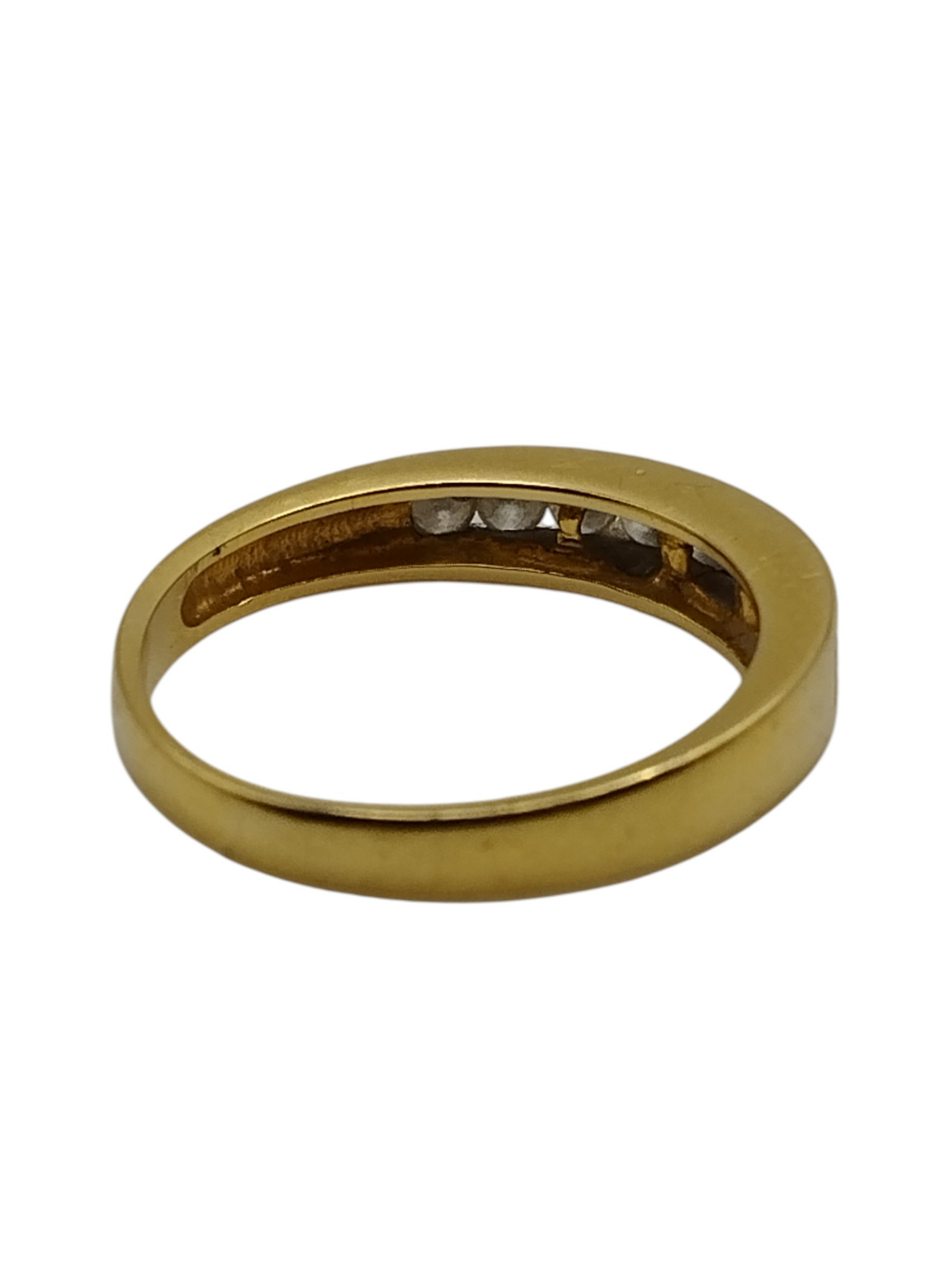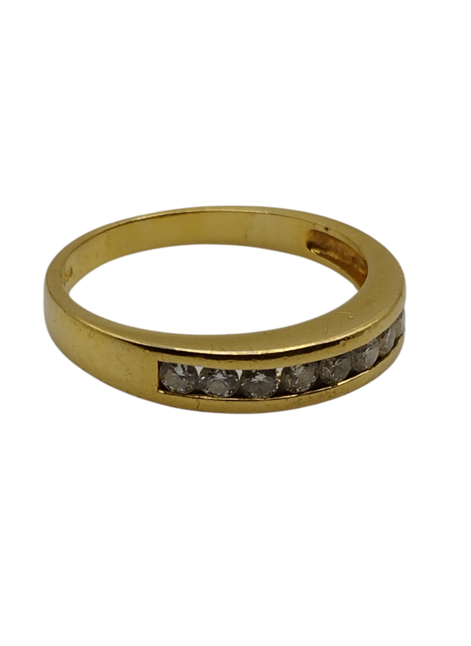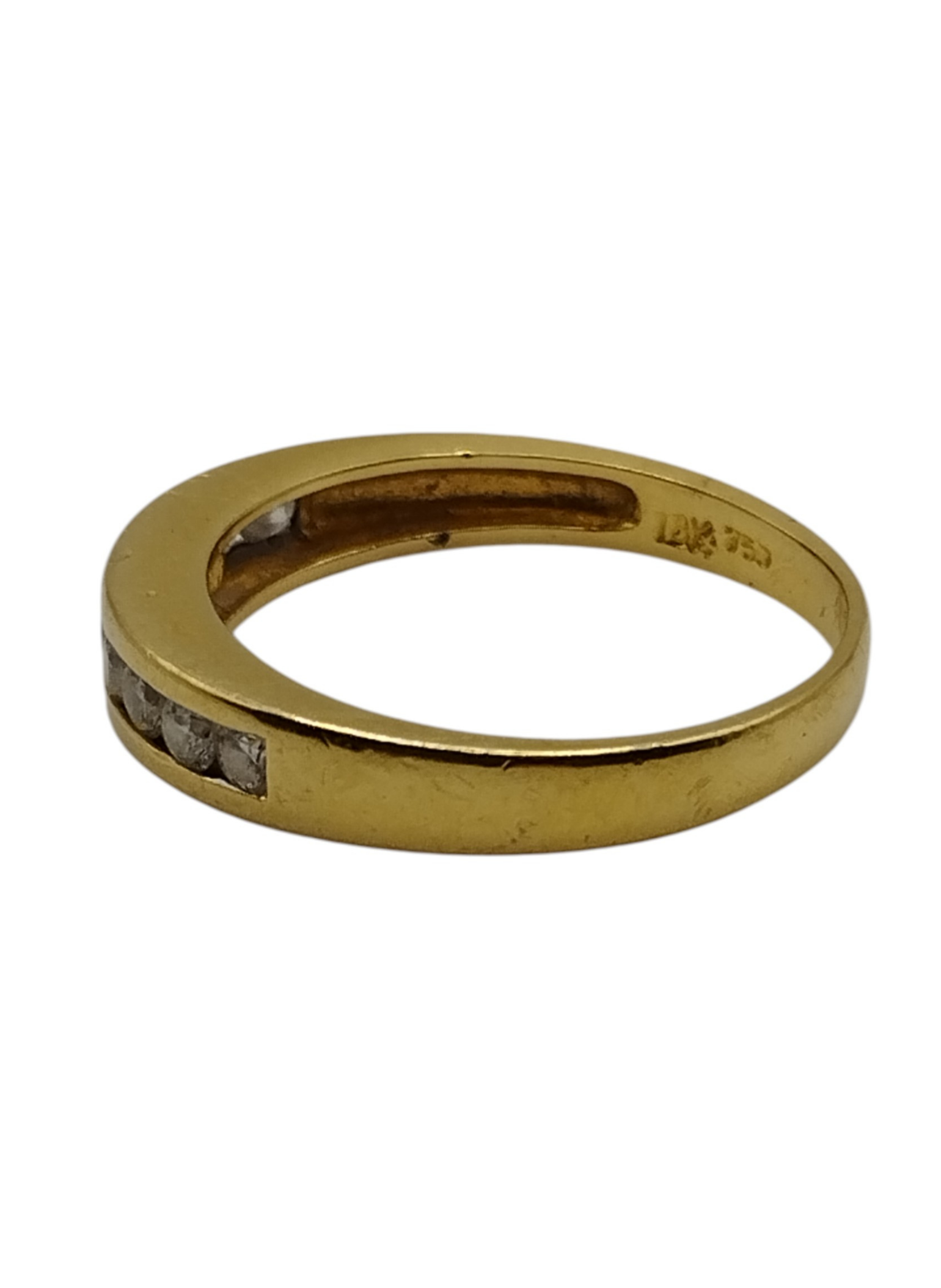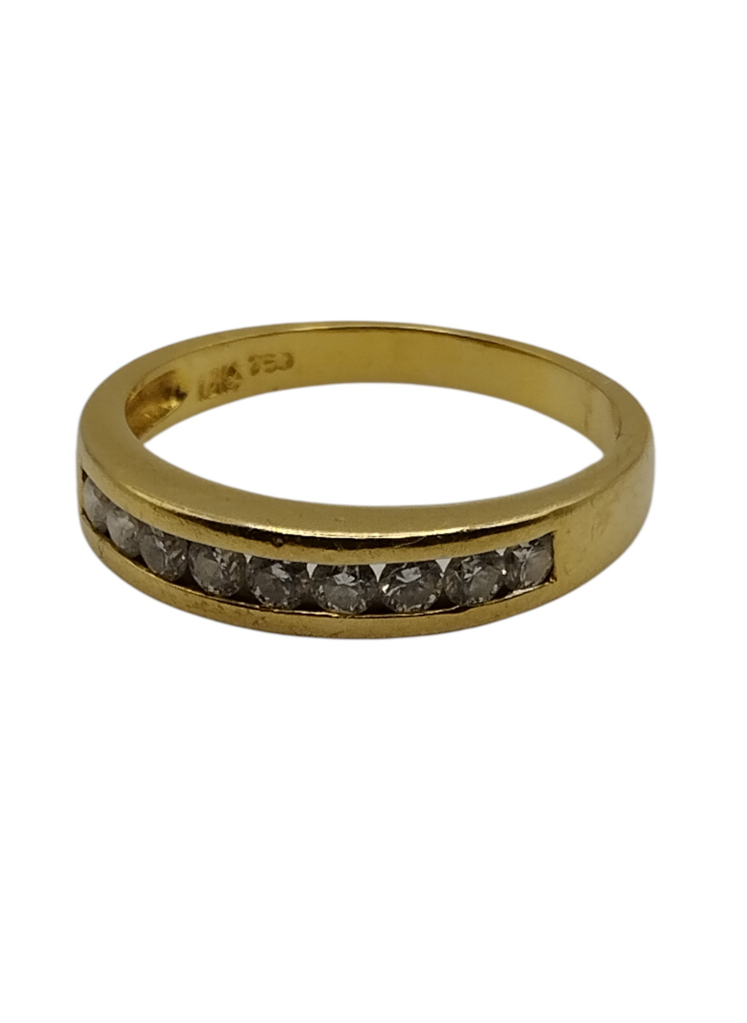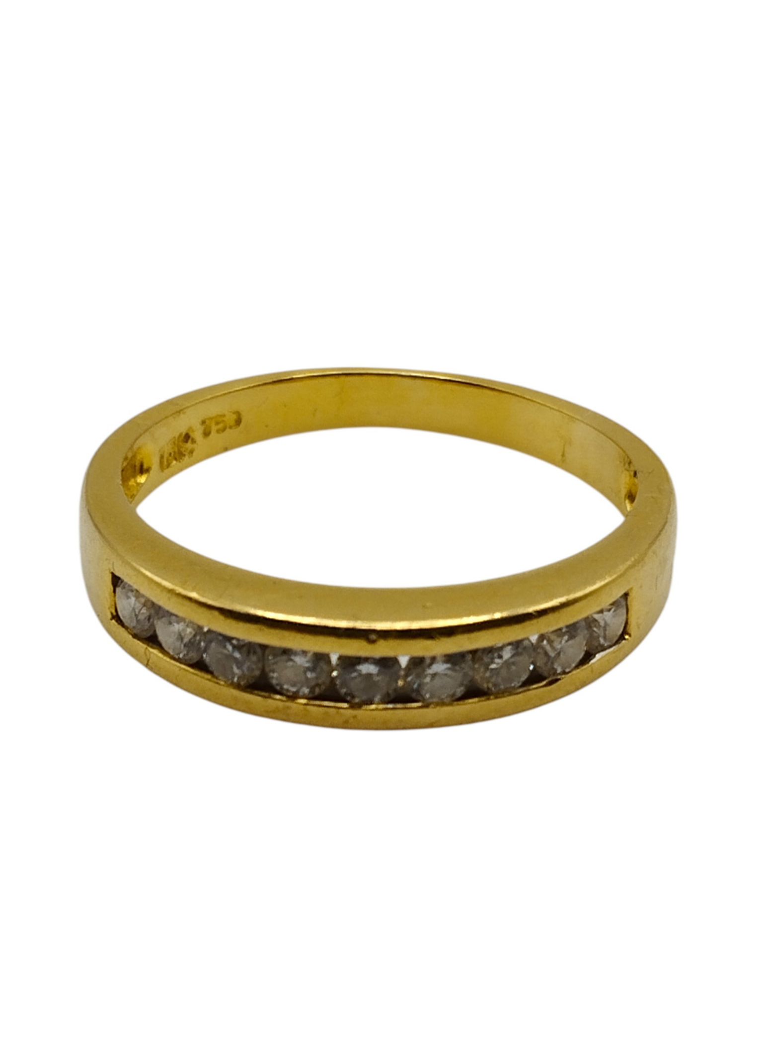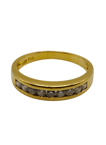 Media alianza en oro amarillo de 18kts con brillantes engastados en carril.Estado muy bueno.Es un numero 13,pesa en total 2,9 grs y tiene un peso en brillantes de aproximadamente 0,36 Qts