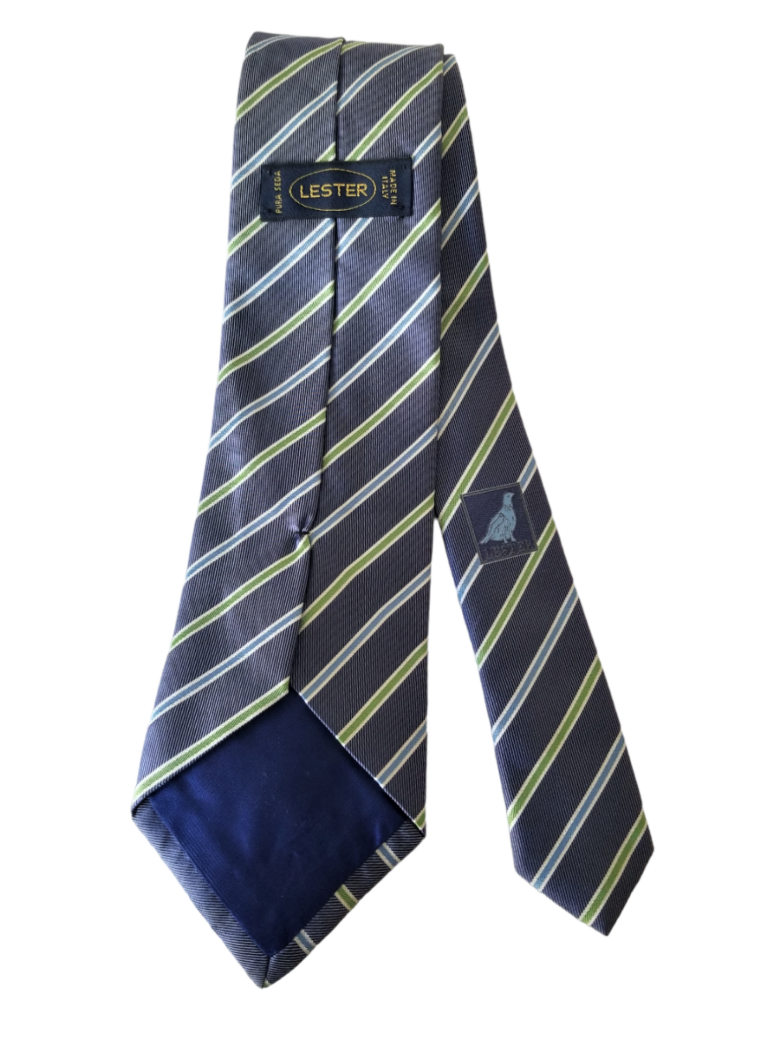 Diese blaugrün-blau gestreifte Krawatte von Lester besteht aus 100 % hochwertiger Seide und eignet sich perfekt für besondere Anlässe. Sie wertet jederzeit jeden Look auf.