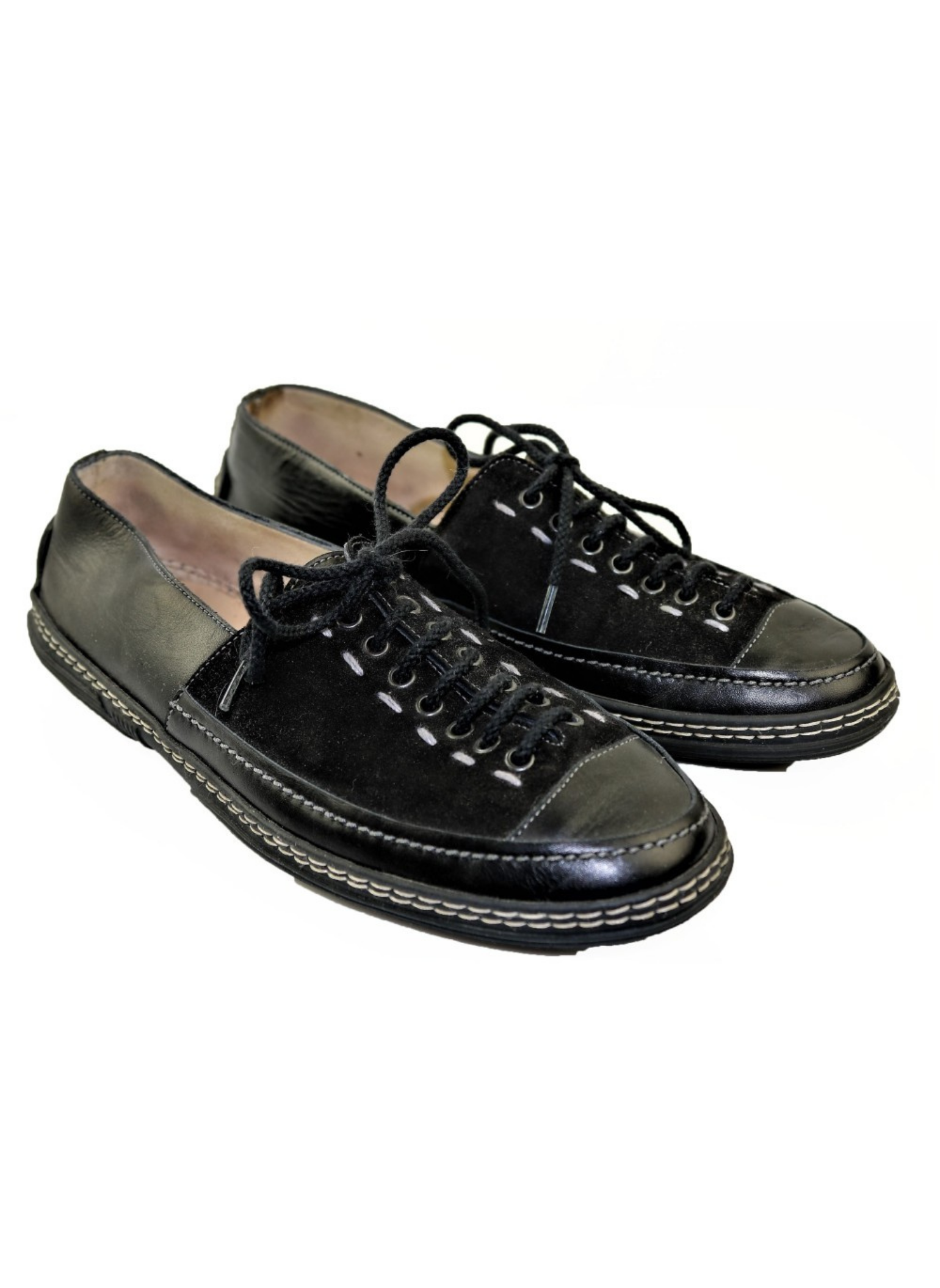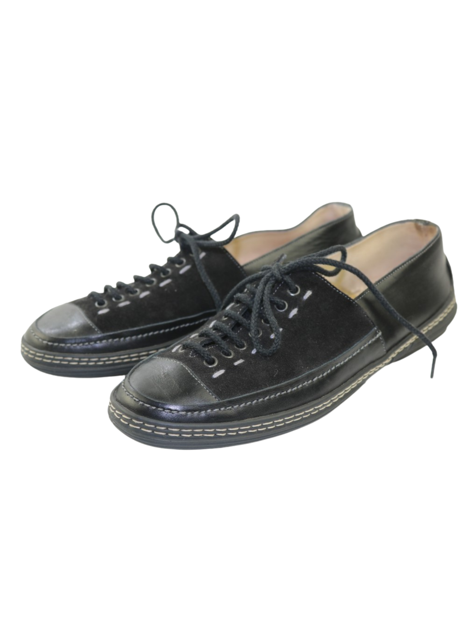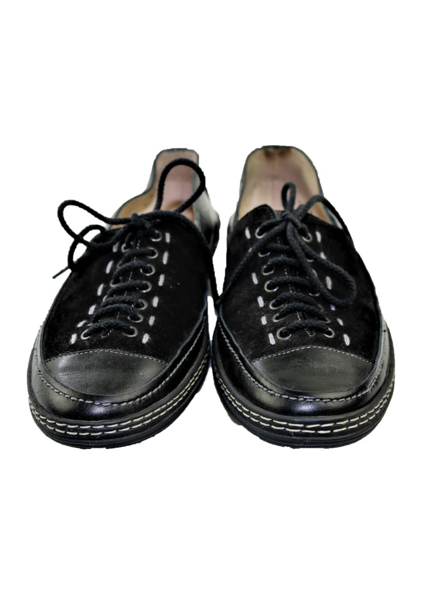 Zapatos de la marca Manolo Blahnik en cuero y ante negro, con plantilla de cuero color nude y suela de goma, con cordones al frente muy cómodos para caminar en talla 37. Estos zapatos no presentan señales de uso.