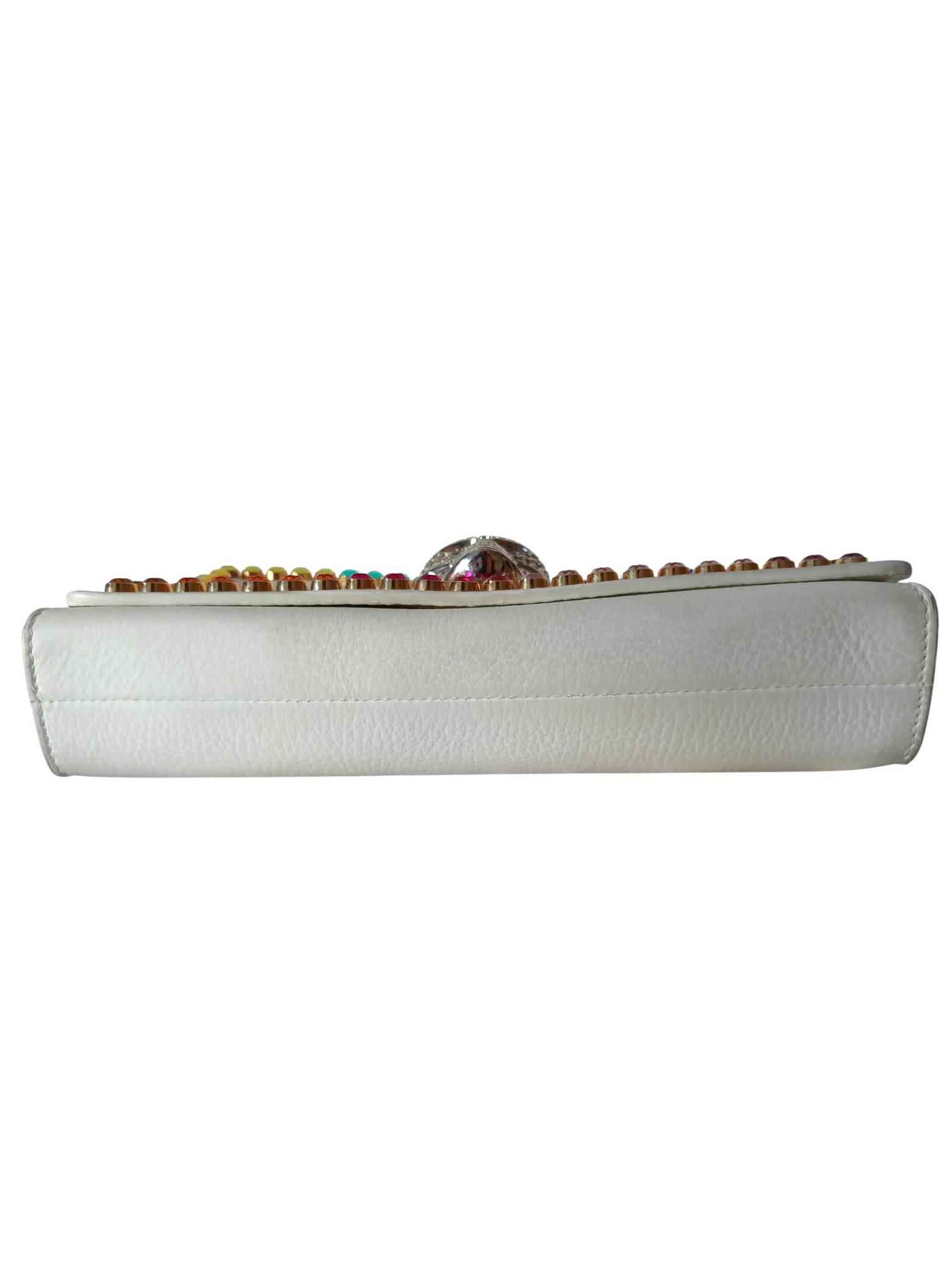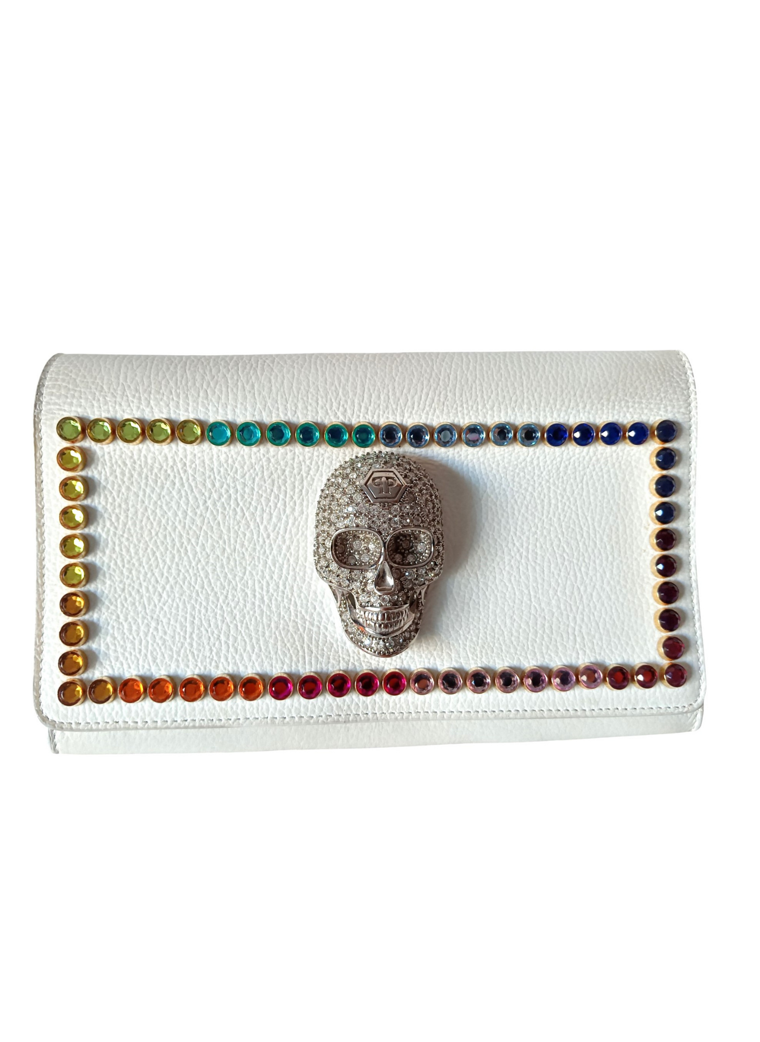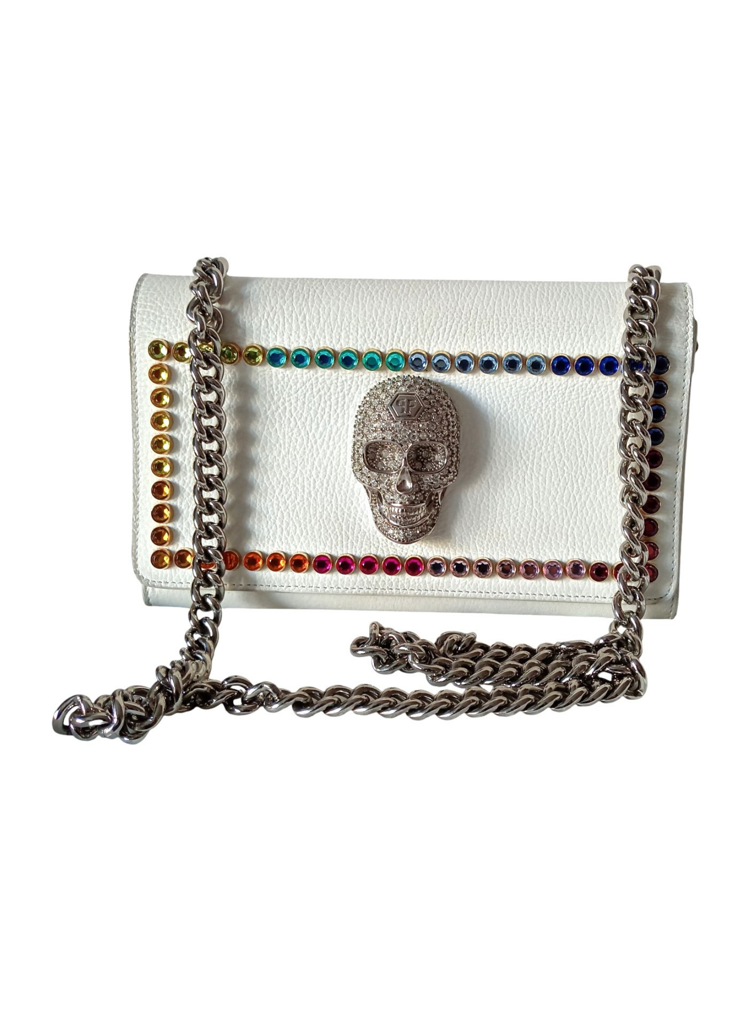 Bolso bandolera de Philipp Plein que tambien se puede usar de clutch.Elaborado en piel blanca granulado con adorno de calavera de metal con piedras blancas rodeada de un rectangulo de tachuelas de colores estilo arco iris.Cadena metalica para hombro o bandolera.Cierre de solapa con presion.Interior forro con estampado leopardo con bolsillo con cremallera.Muy buen estado.Medidas:24 cms de ancho x 15 cms de alto x 4 cms de profundidad.