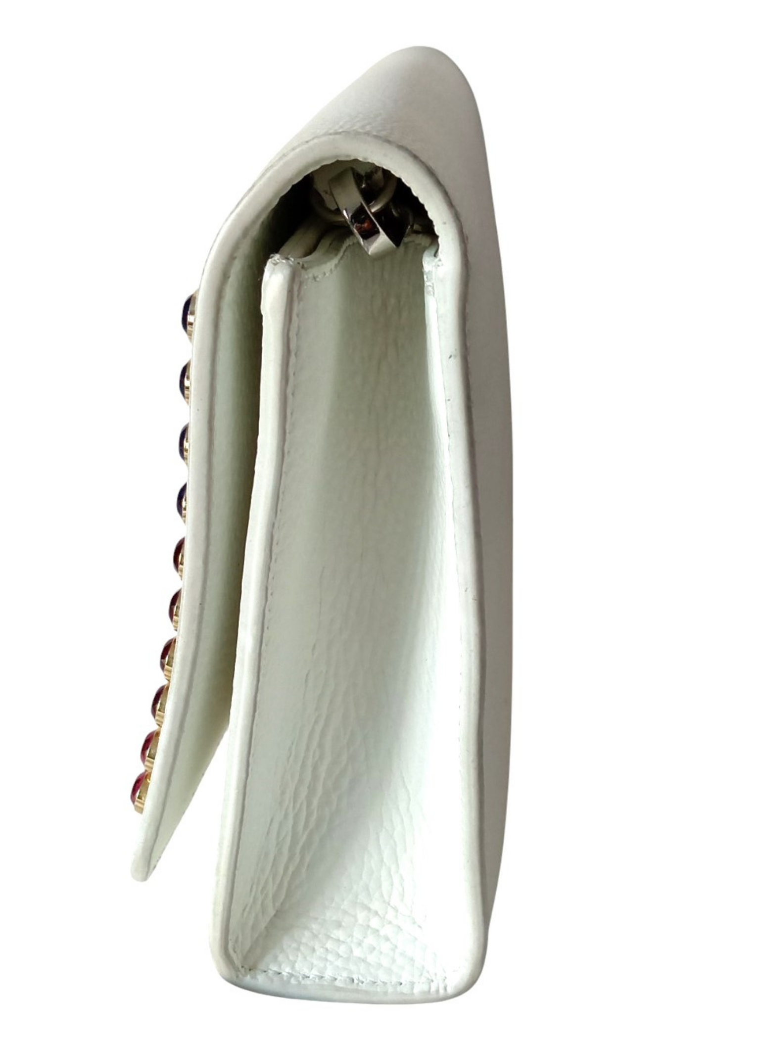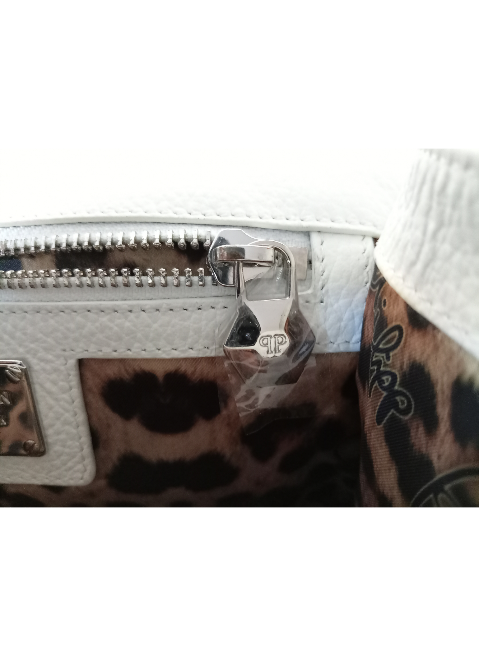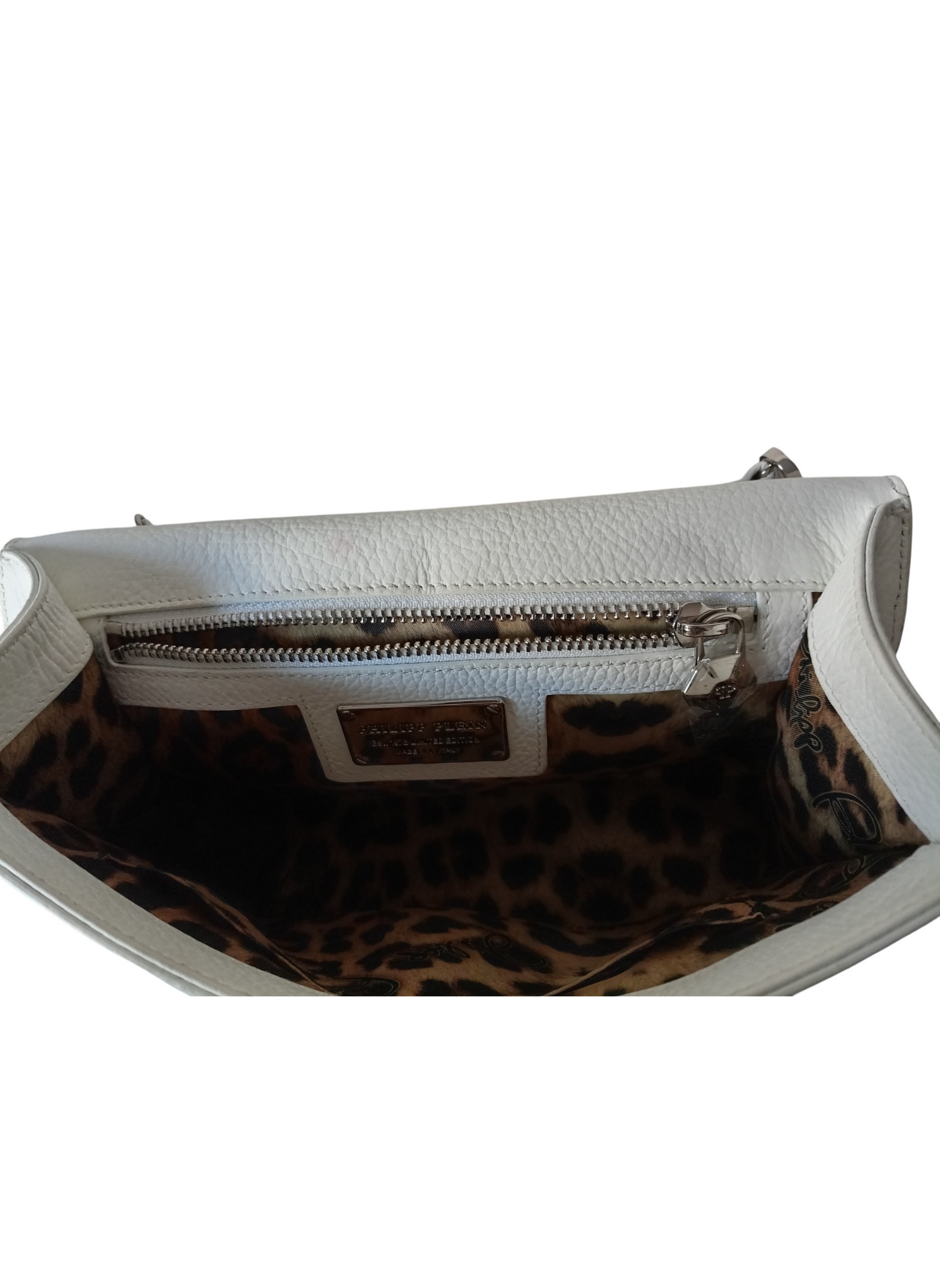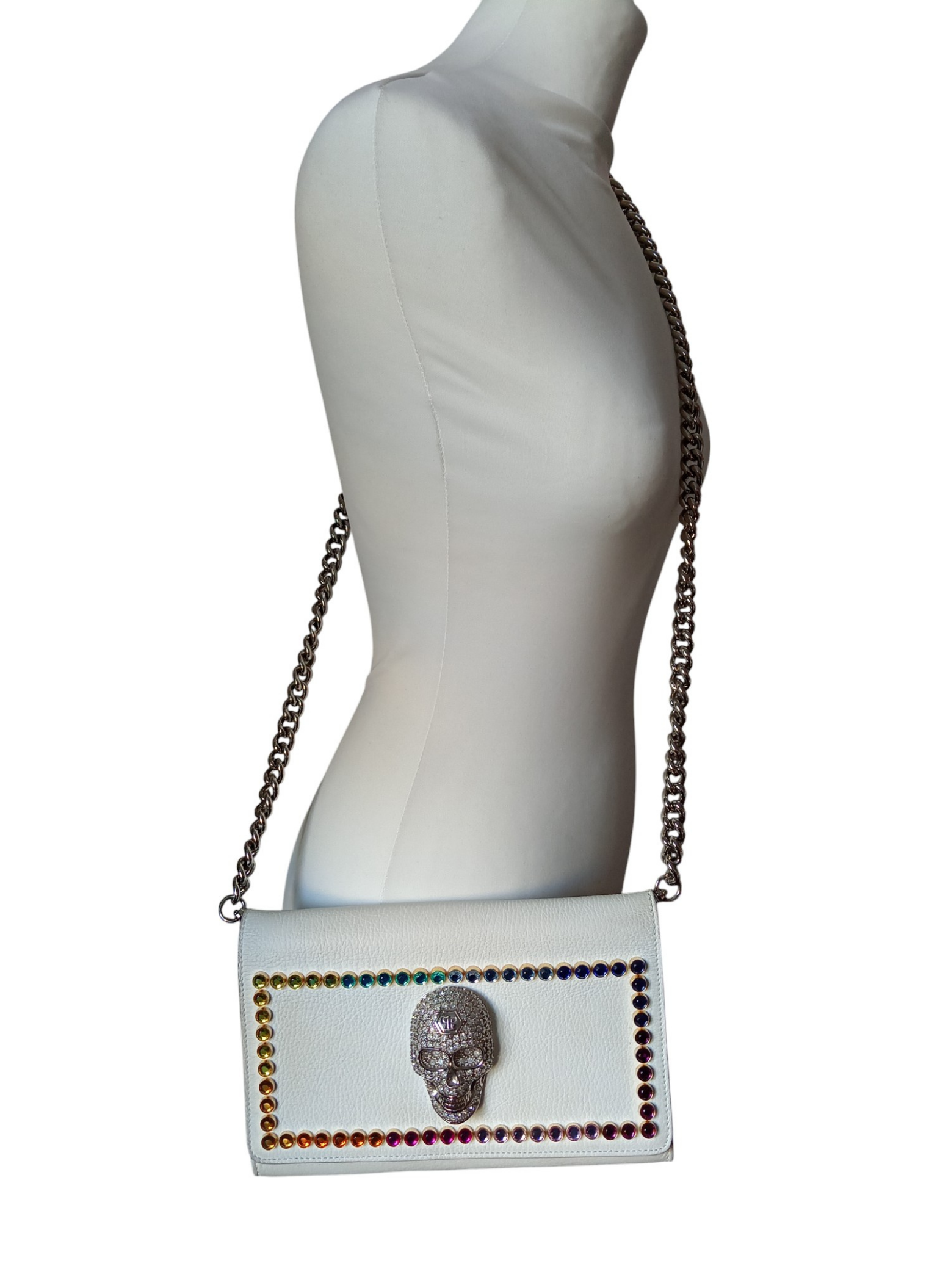 Bolso bandolera de Philipp Plein que tambien se puede usar de clutch.Elaborado en piel blanca granulado con adorno de calavera de metal con piedras blancas rodeada de un rectangulo de tachuelas de colores estilo arco iris.Cadena metalica para hombro o bandolera.Cierre de solapa con presion.Interior forro con estampado leopardo con bolsillo con cremallera.Muy buen estado.Medidas:24 cms de ancho x 15 cms de alto x 4 cms de profundidad.
