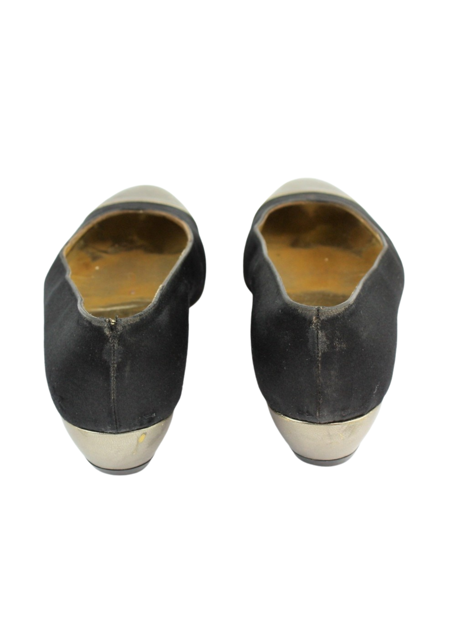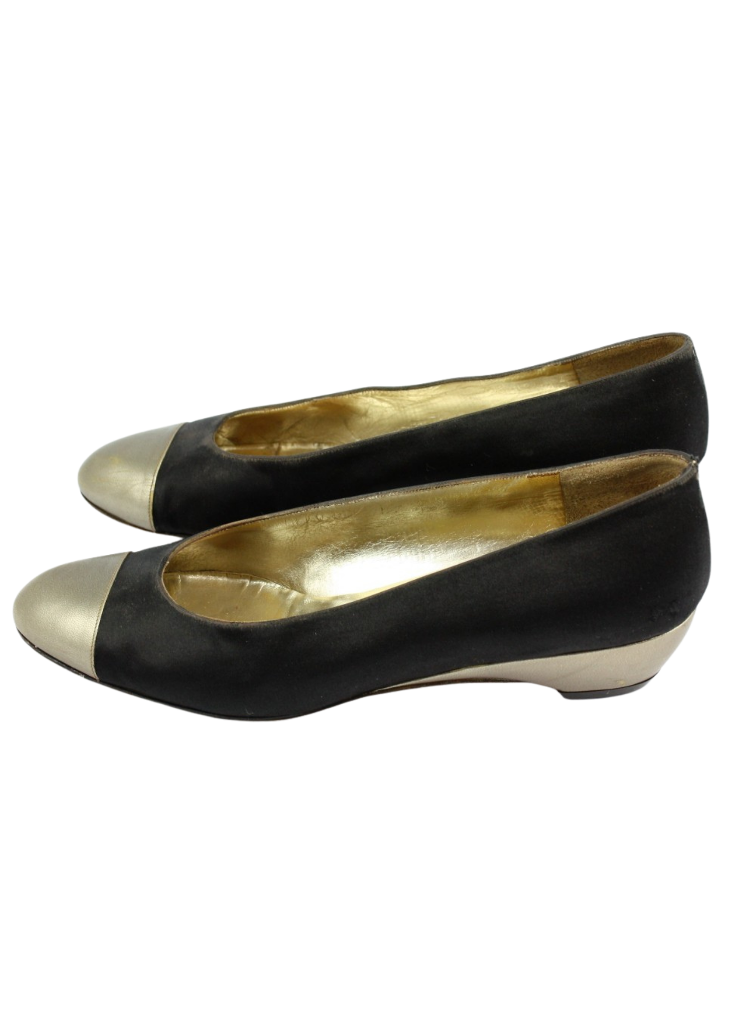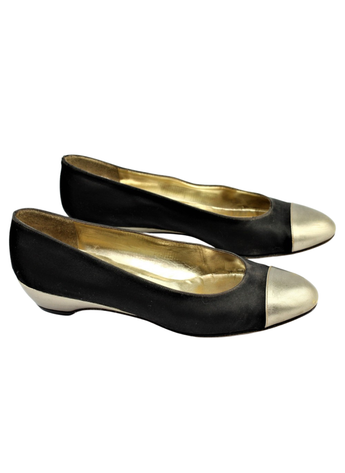 Bailarinas de la marca Salvatore Ferragamo con cuña forrados en seda negra y piel de color dorado suave. Forrados en piel dorada, con suela de cuero hecho en Italia. Son una talla 37.Se nota uso en la tela y en la suela pero en general se encuentra en buen estado.