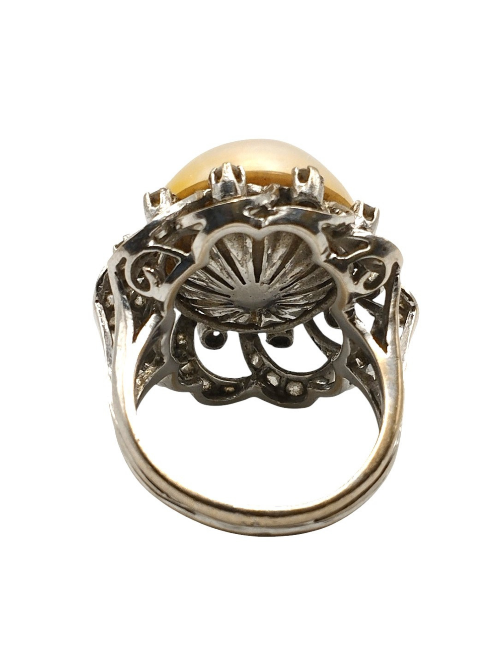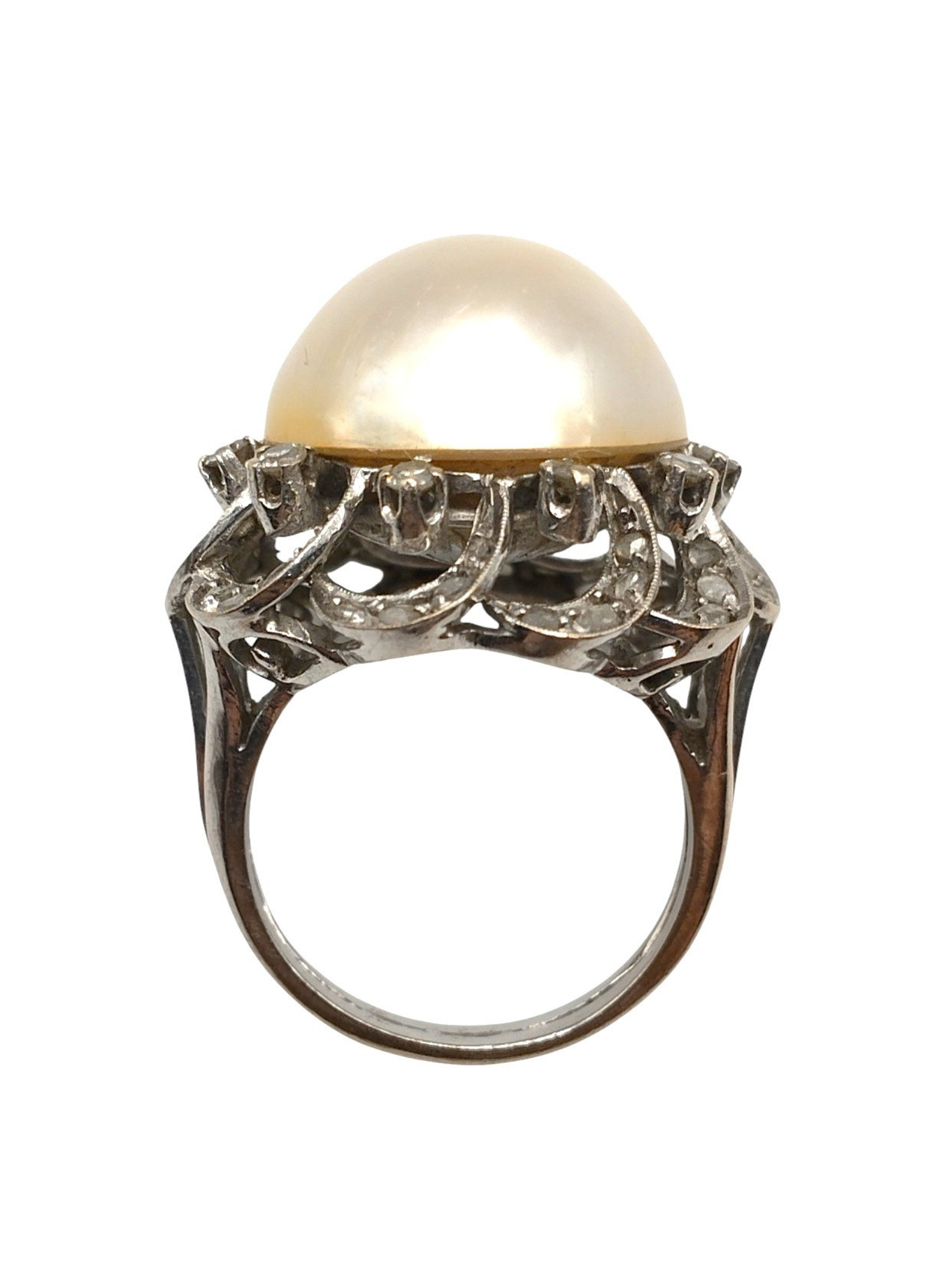 Anills de oro blanco de 18 Kts con un a perla mabe de 17 mm rodeada de brillantes en garray con ondas a modo de encaje con brillantes.Articulo Vintage.Es una talla 15 y pesa 13,1 grs.La medida total es de 25,1 mm de diametro.