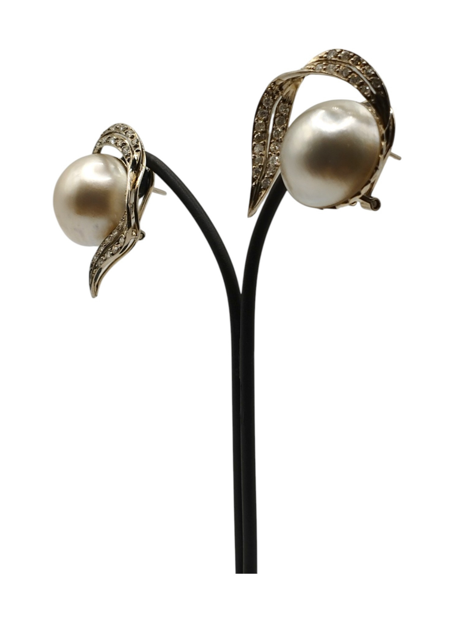 Pendientes Vintage de oro blanco de 18 Kts con una perla mabe de 16,4 mm adornada con una cinta de brillantes.Cierre omega,miden 23,3 mm de ancho,estado muy bueno.Años 60 aproximadamente.Tienen un peso total de 13,9 grs y un peso en brillantes aproximado de 1,68 Qts.