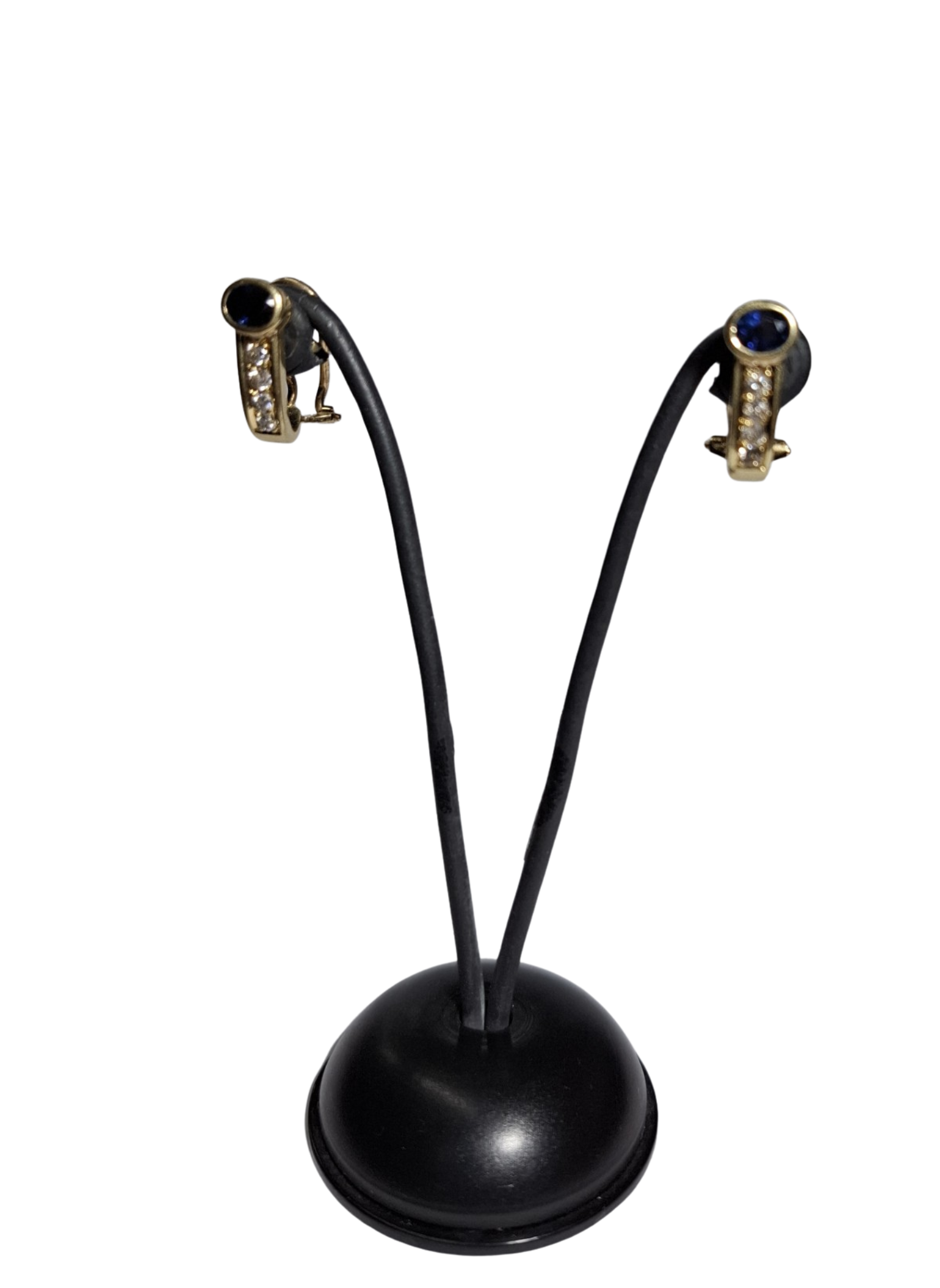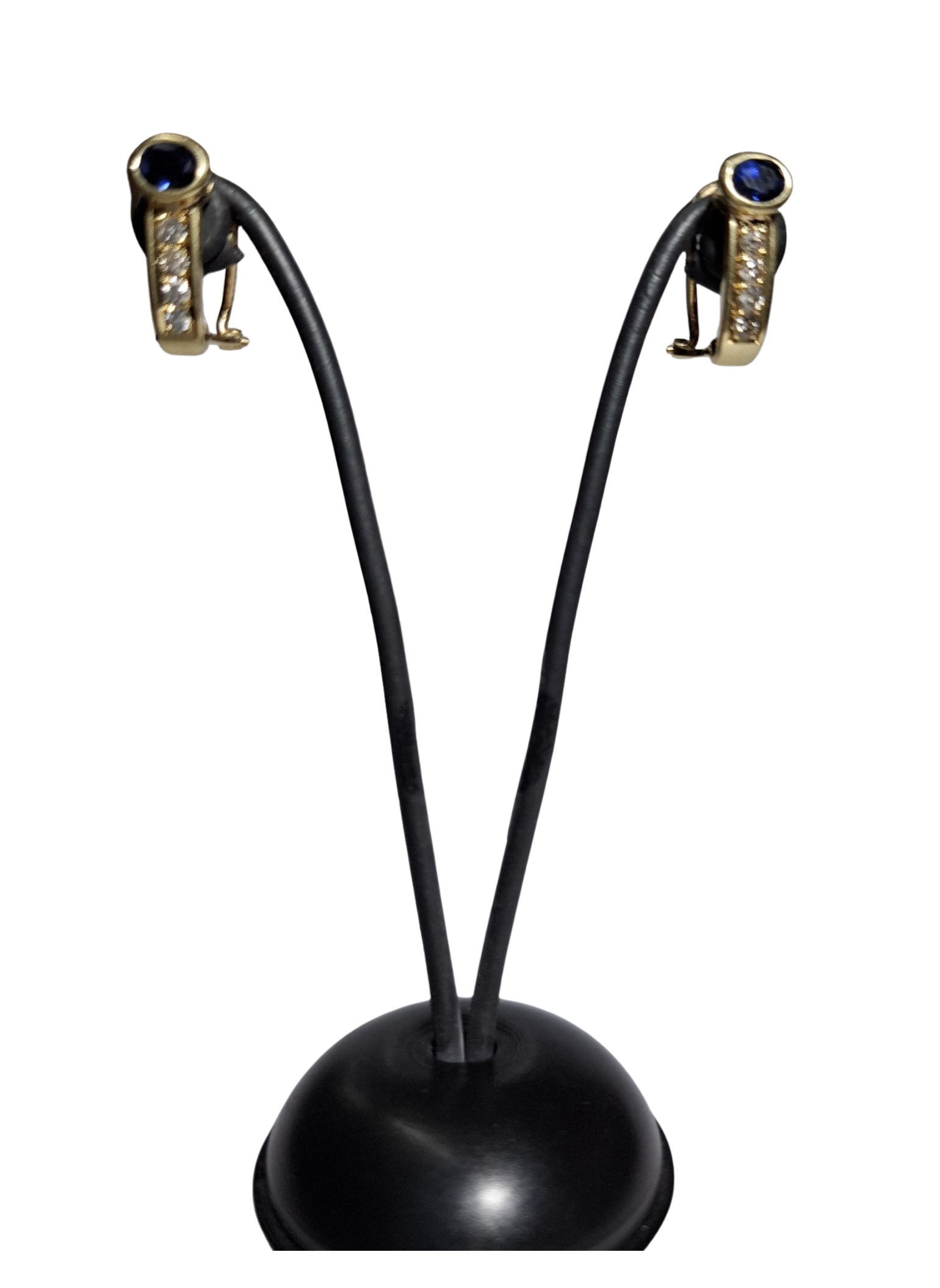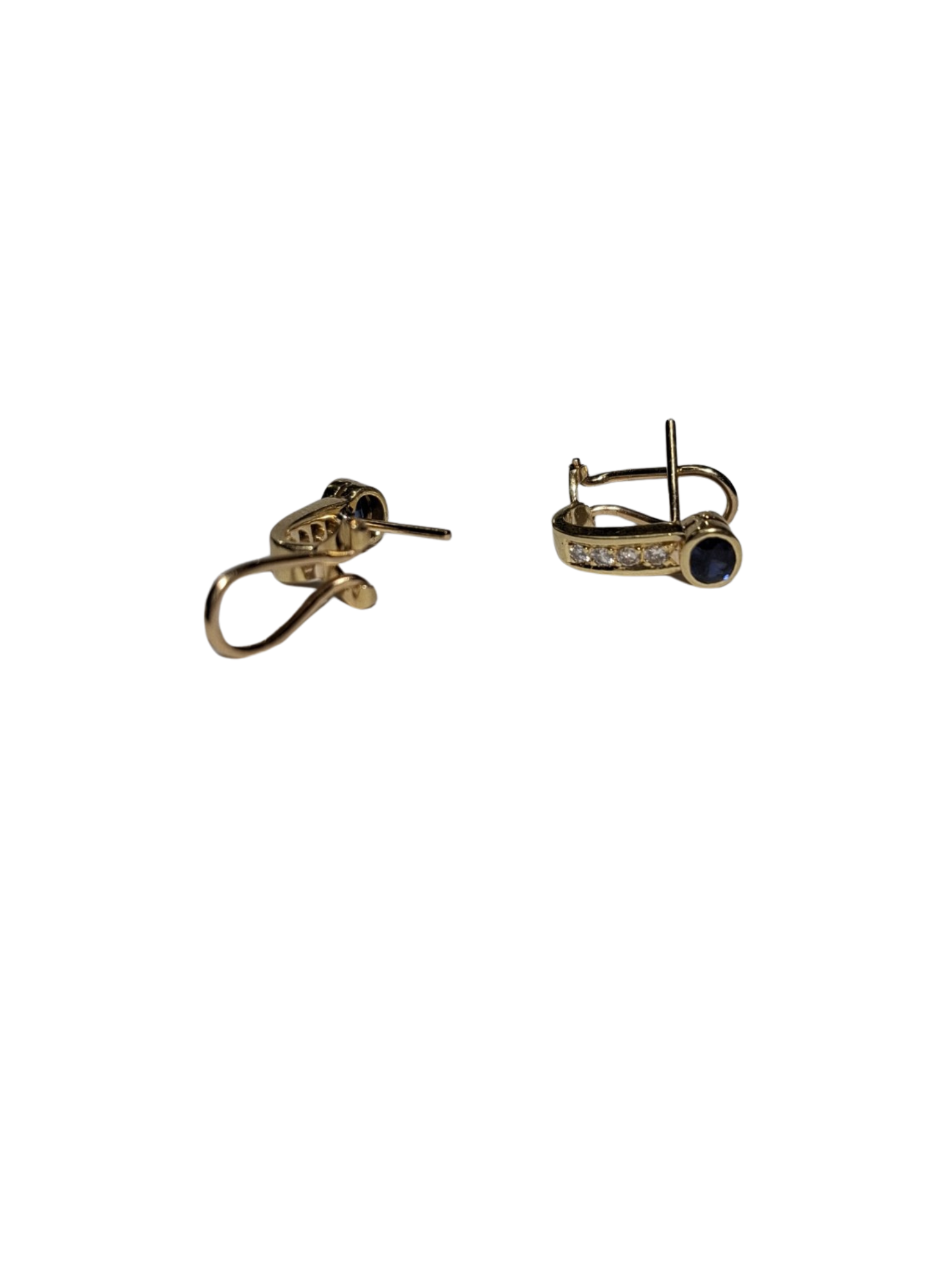 Pendientes alargados con zafiro en la parte superior y fila de 4 brillantes en cada pendiente. Montado en oro amarillo 18k. Cierre Omega.