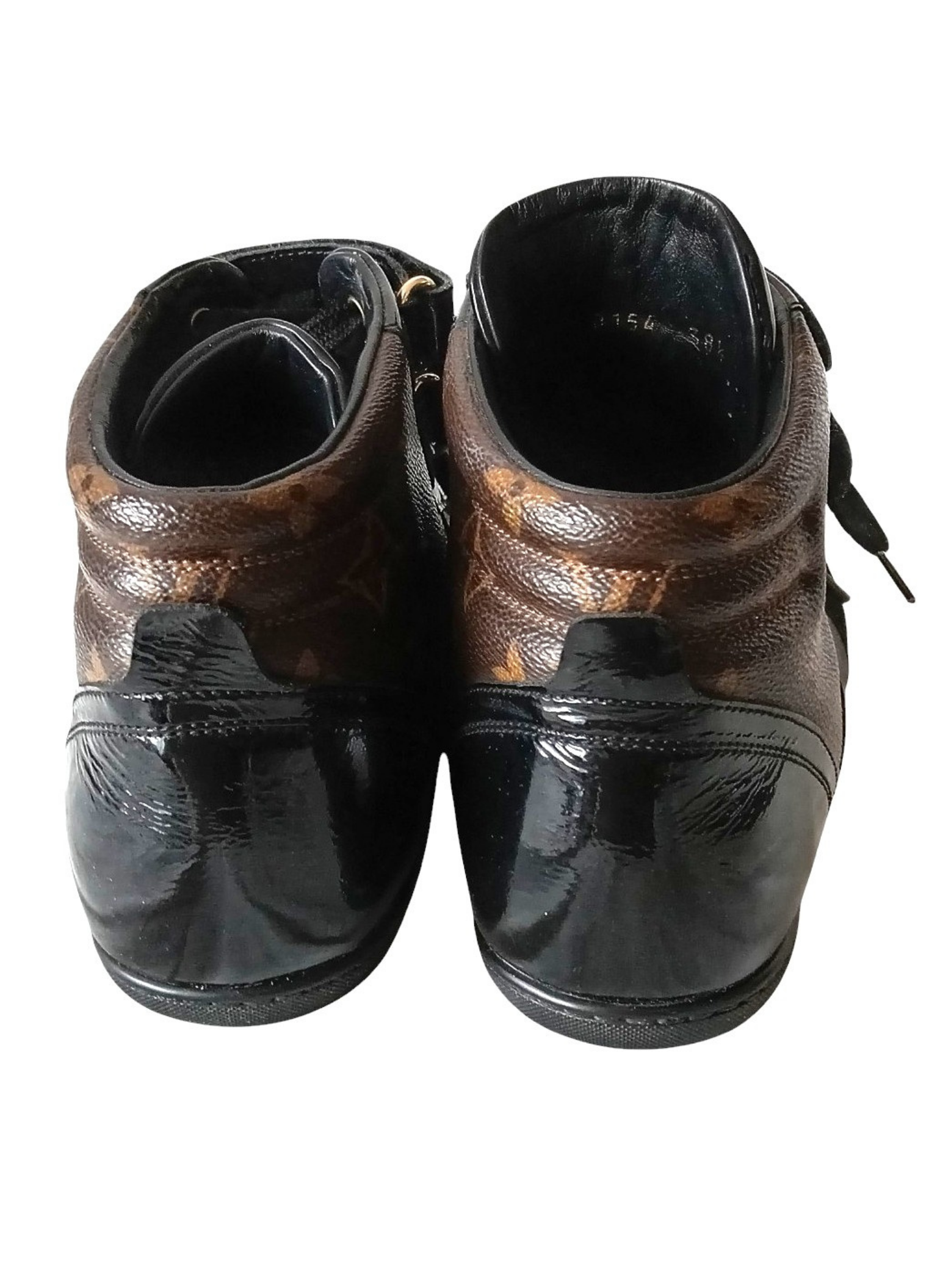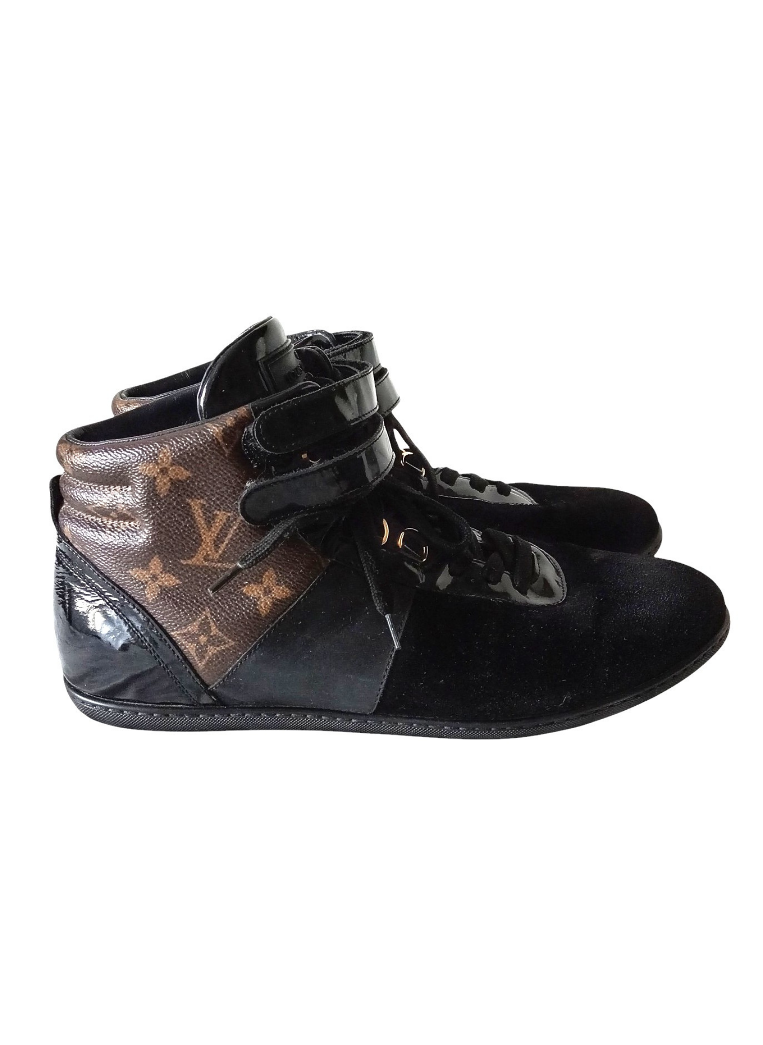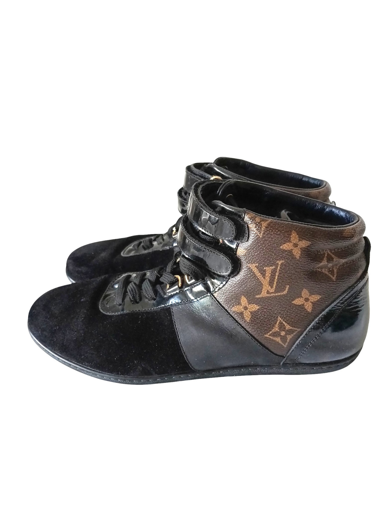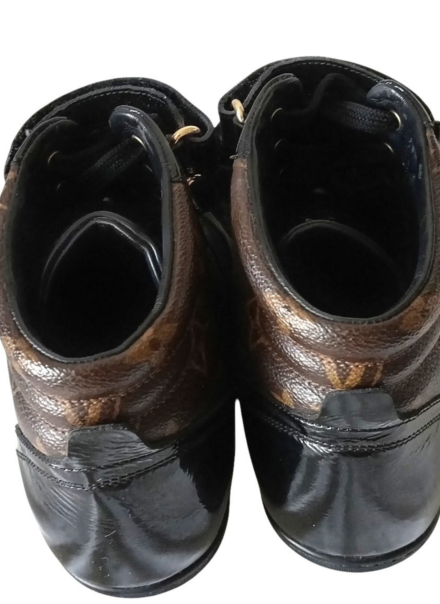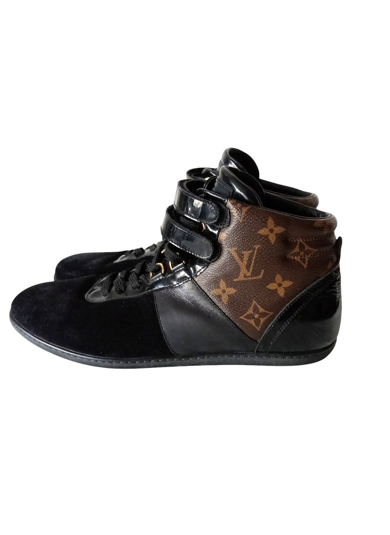 Deportivas tipo botin de Louis Vuitton,modelo "Move Up".Confeccionadas con ante negro en la parte delantera y lona monogram marron en la parte de atras.Cierra con cordones complememtados con dos tiras de velcro en charol negro.Suela de goma plana.Talla 38,5.Buen estado.