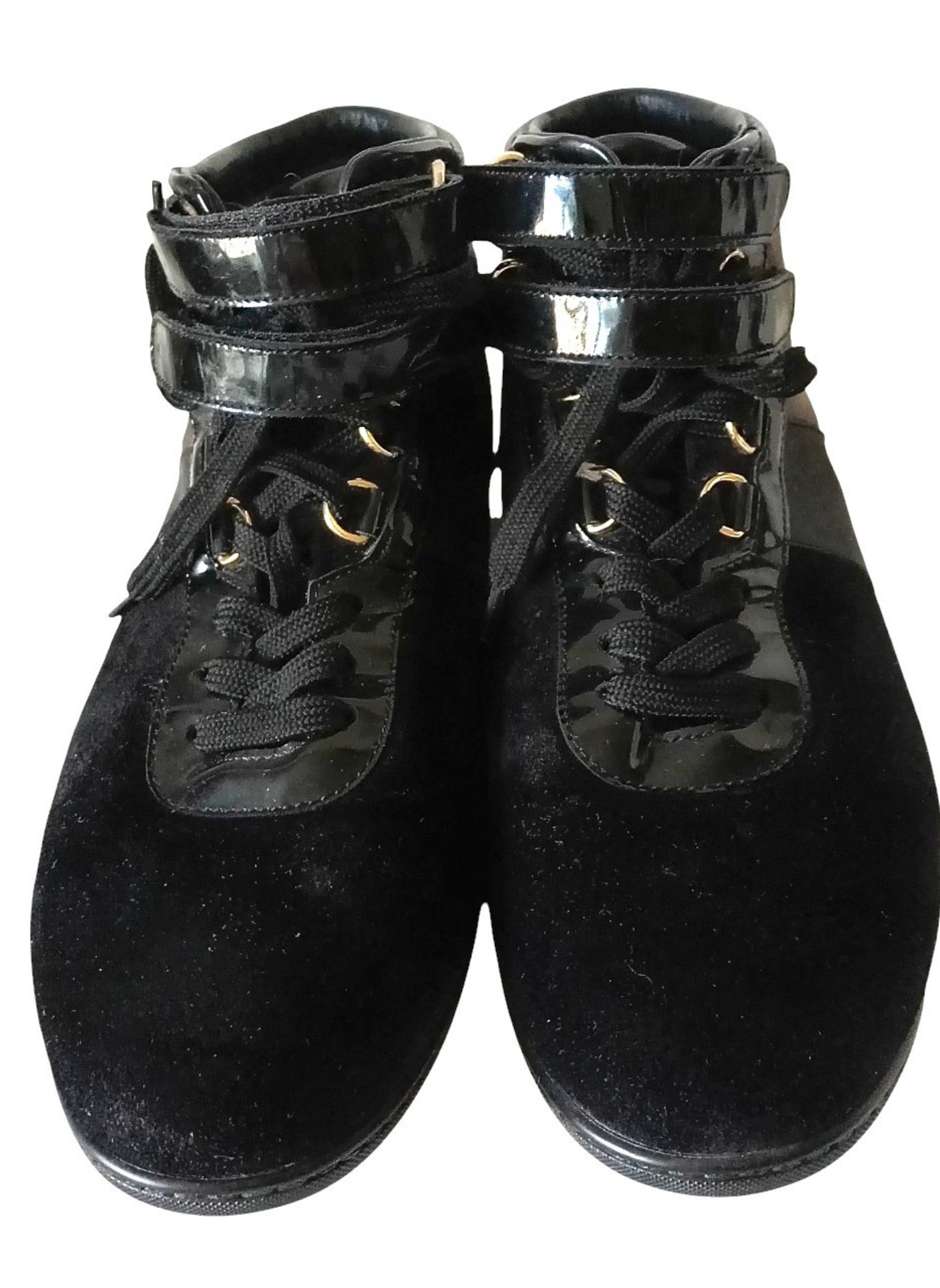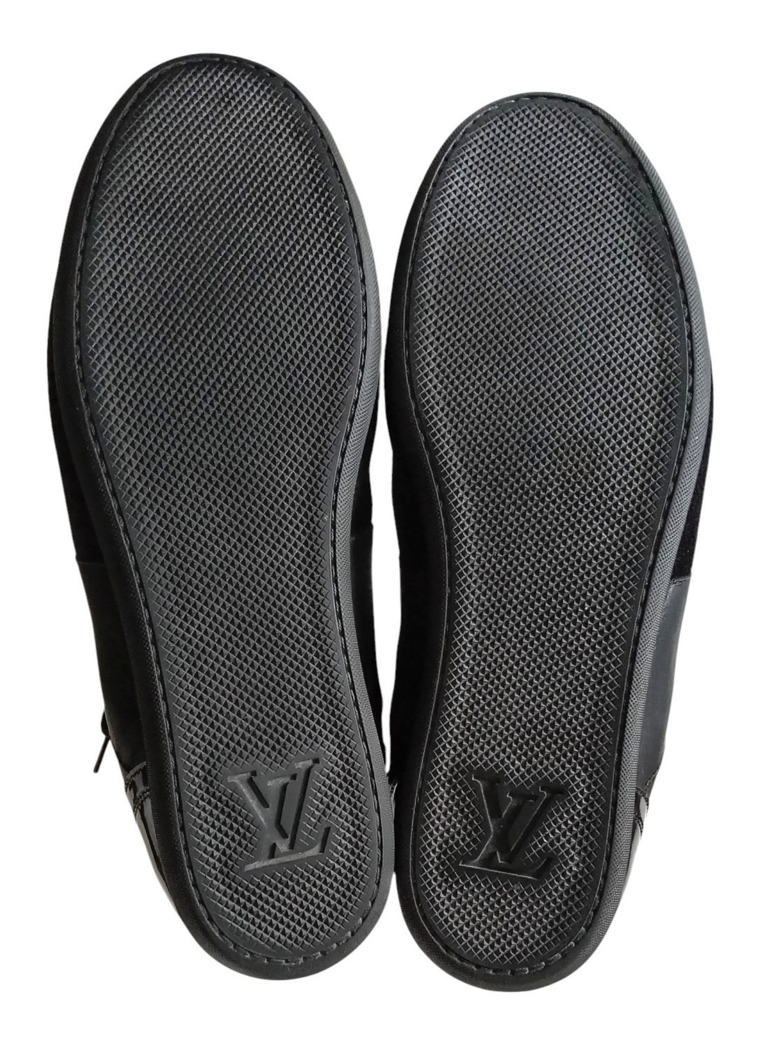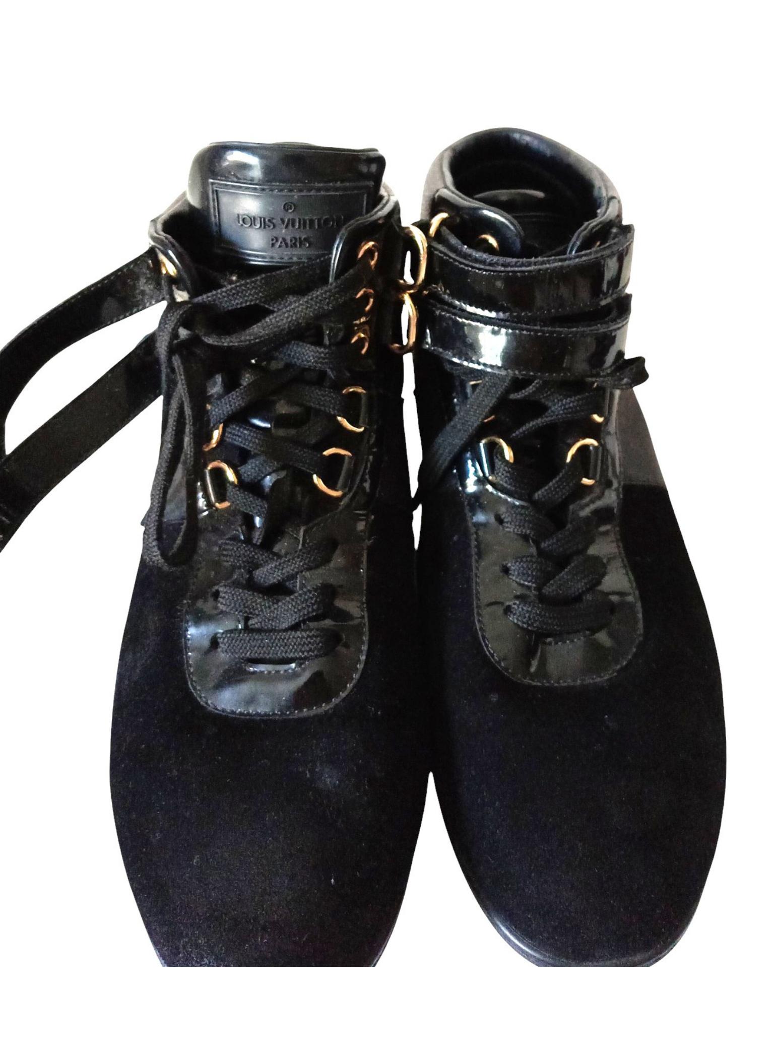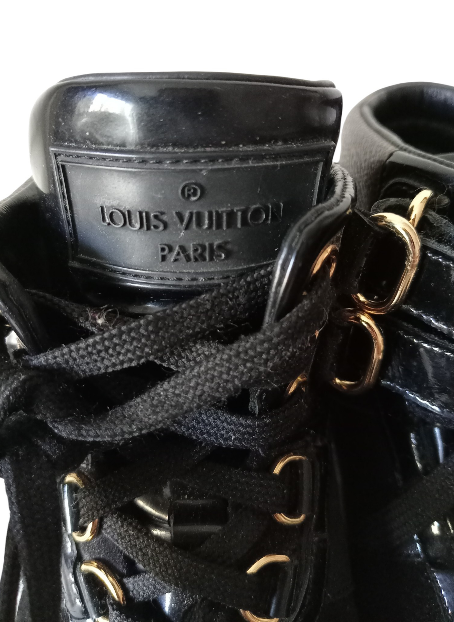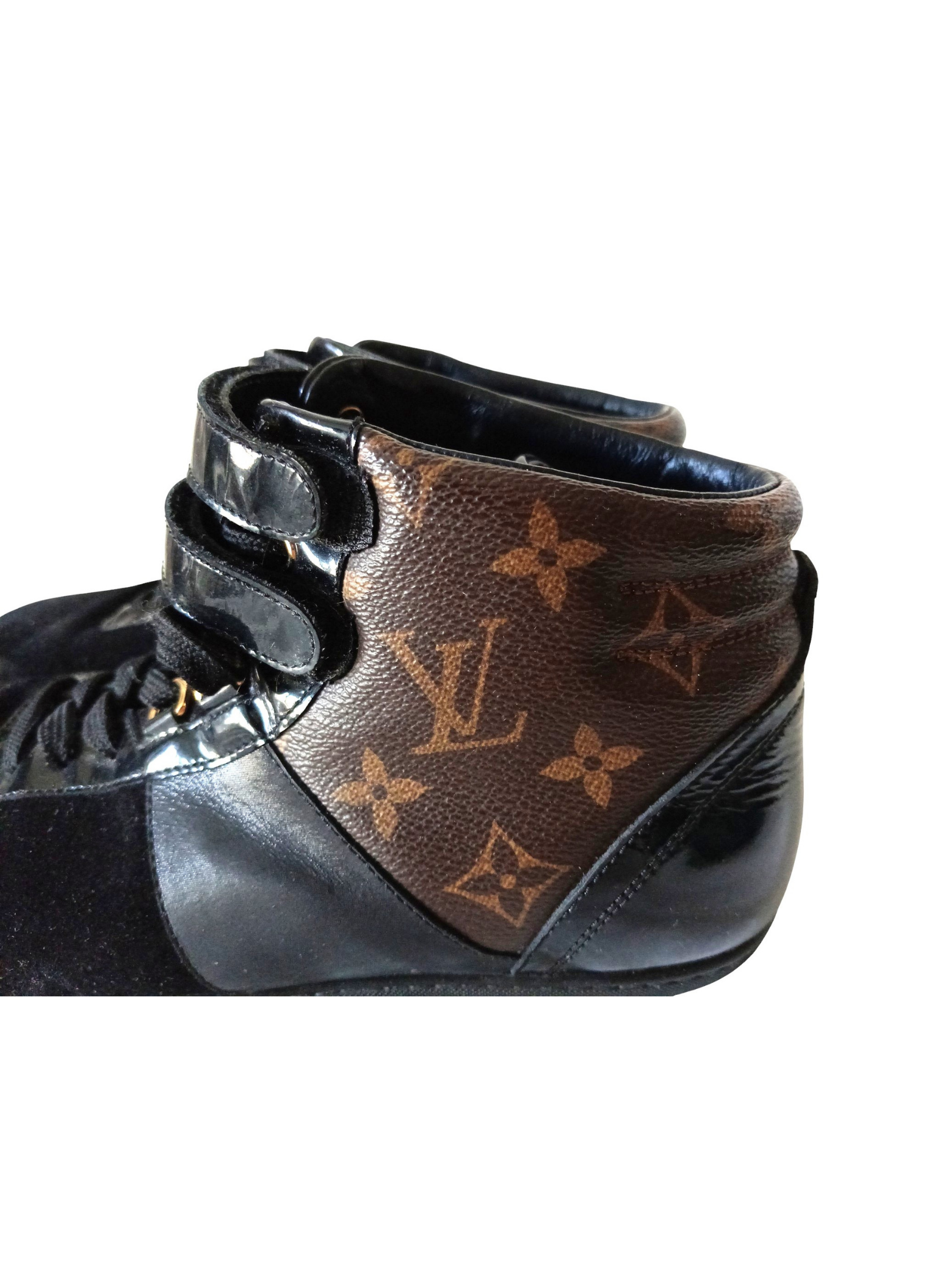 Deportivas tipo botin de Louis Vuitton,modelo "Move Up".Confeccionadas con ante negro en la parte delantera y lona monogram marron en la parte de atras.Cierra con cordones complememtados con dos tiras de velcro en charol negro.Suela de goma plana.Talla 38,5.Buen estado.