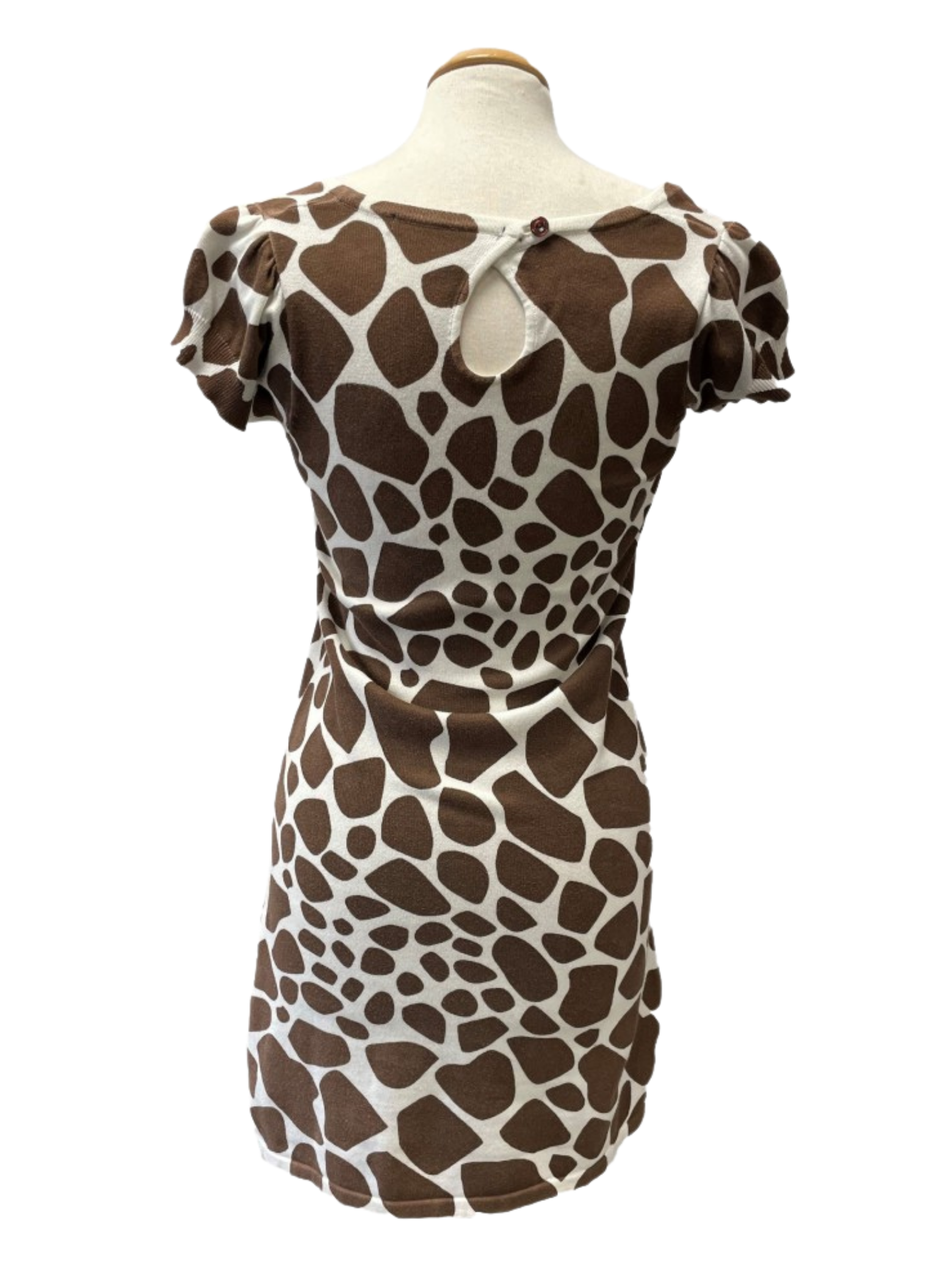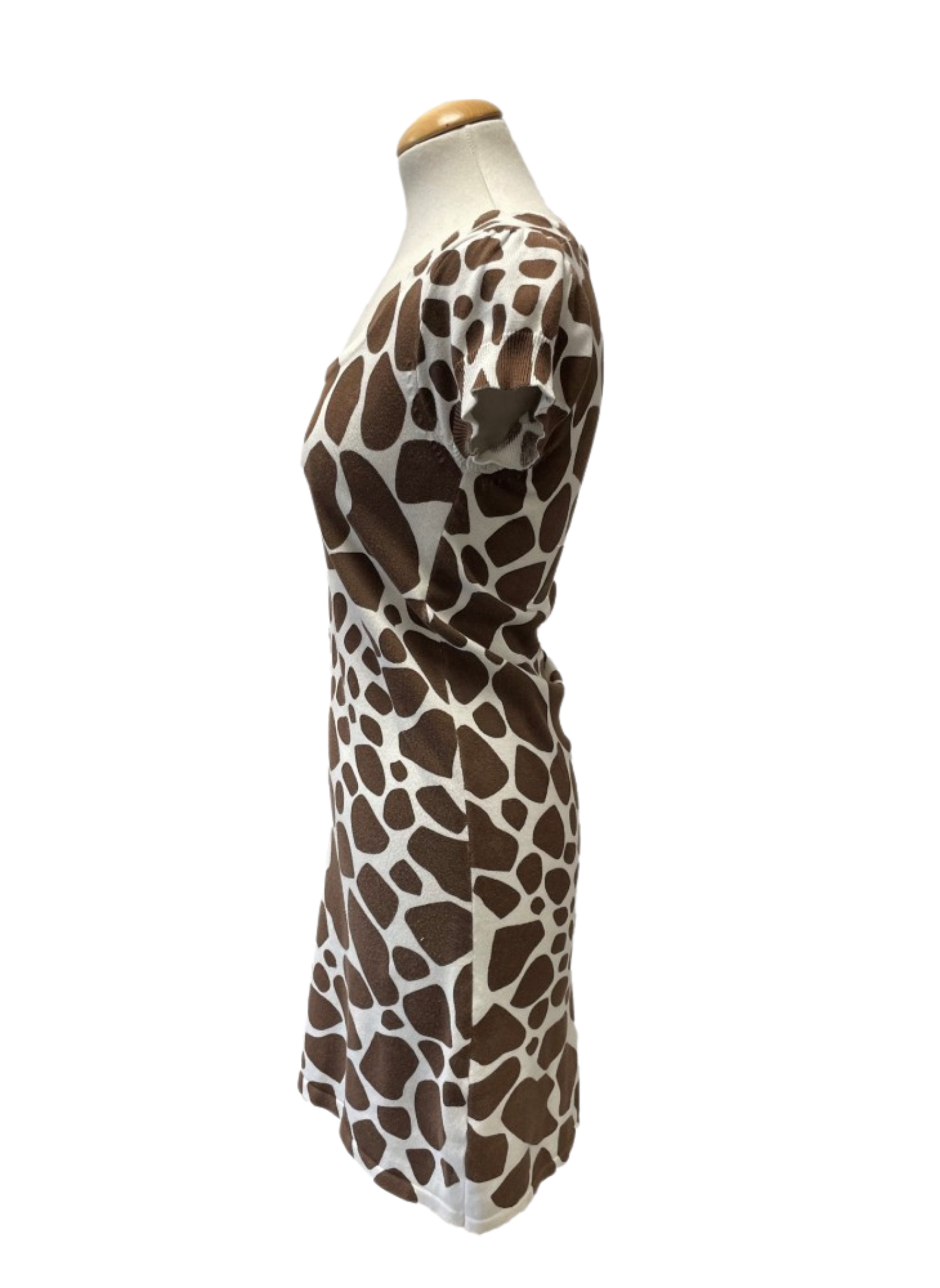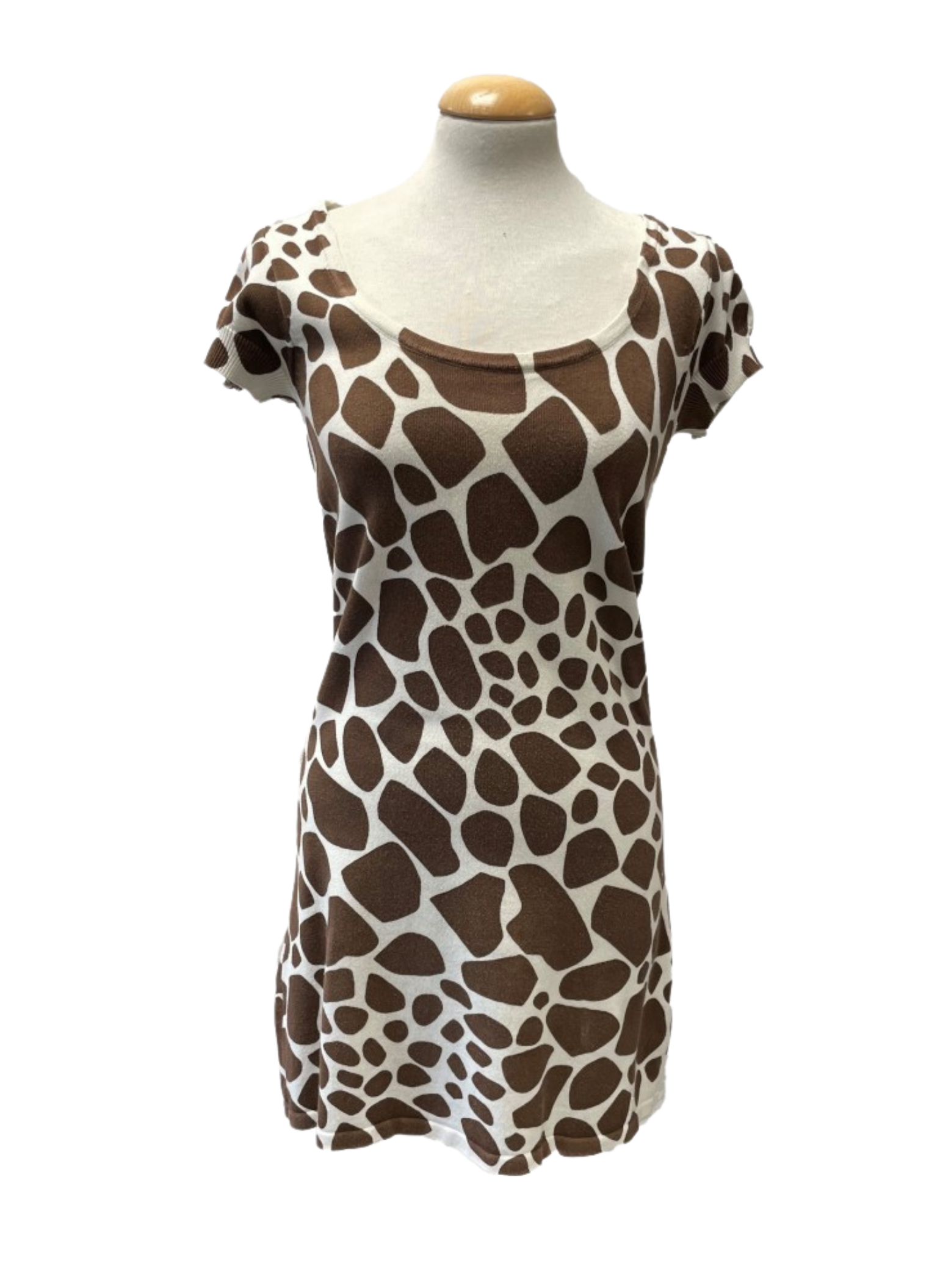 Dress with giraffe-type spots and animal print. Sleeveless. The length reaches the knee. Size S (38). This dress does not show any signs of wear.