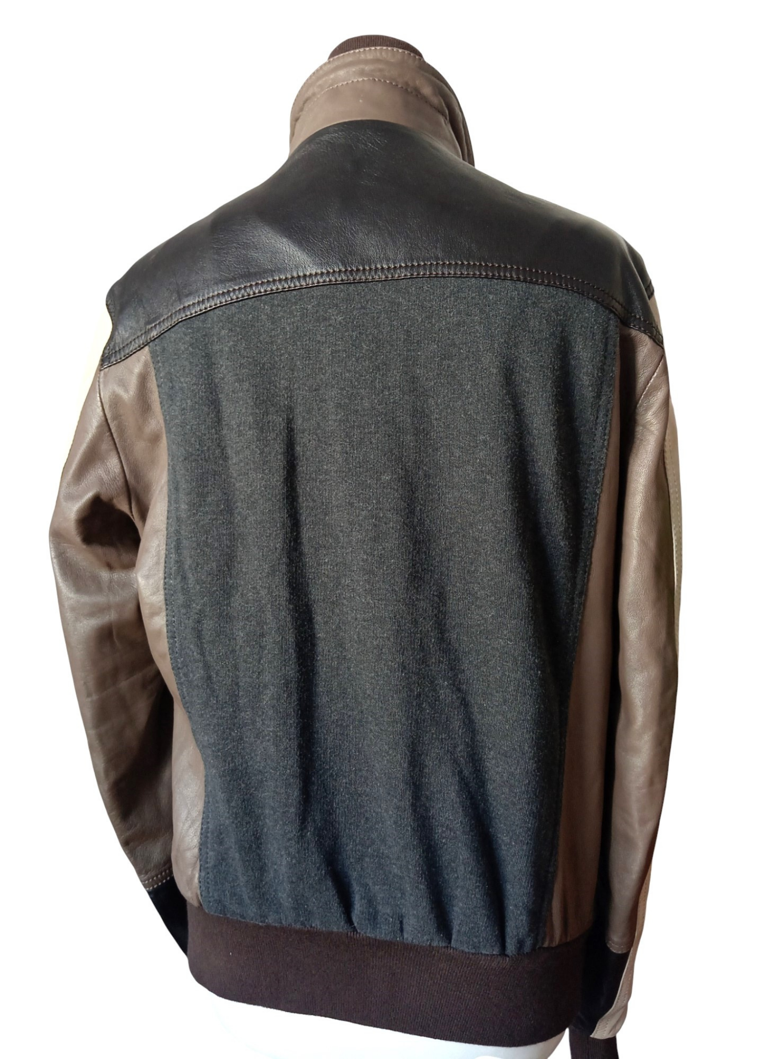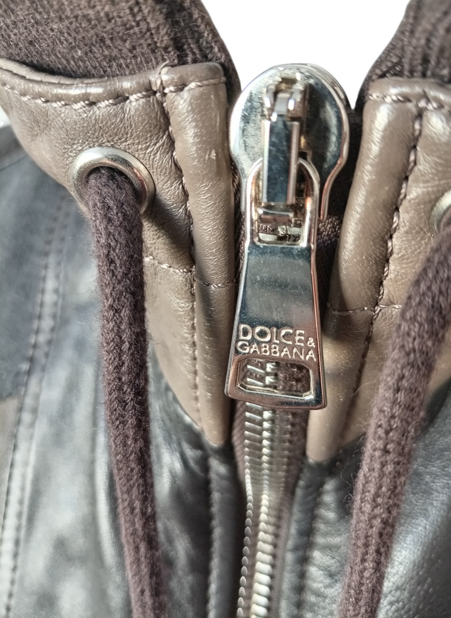 Cazadora de hombre de Dolce & Gabbana,en dos tonos marrones de cuero con las mangas en cuero beige.Espalda e interior de algodón gris.Cierre con cremallera con dos bolsillos laterales.Placa exterior de metal en un lateral.Talla 48 italiana,Compuesta por 40% de algodón y 60% de cuero.Esta en muy buen estado.Medidas: 46 cms de hombros x 70 cms de manga x 66 cms de largo.