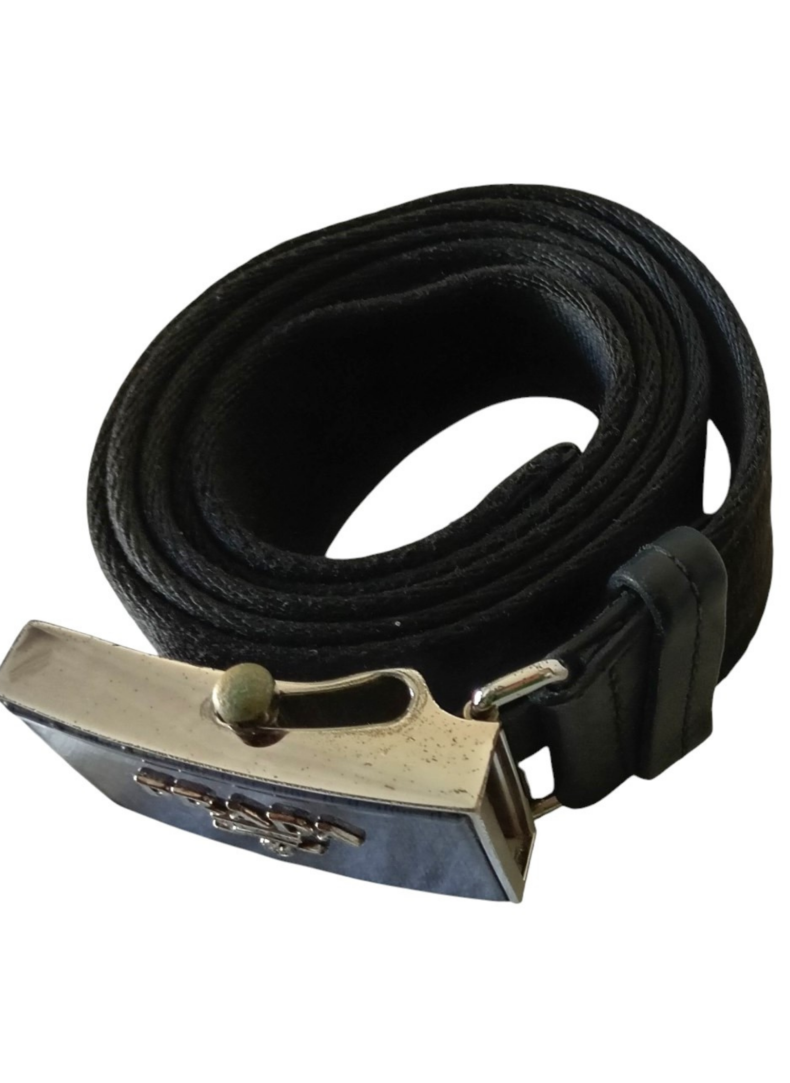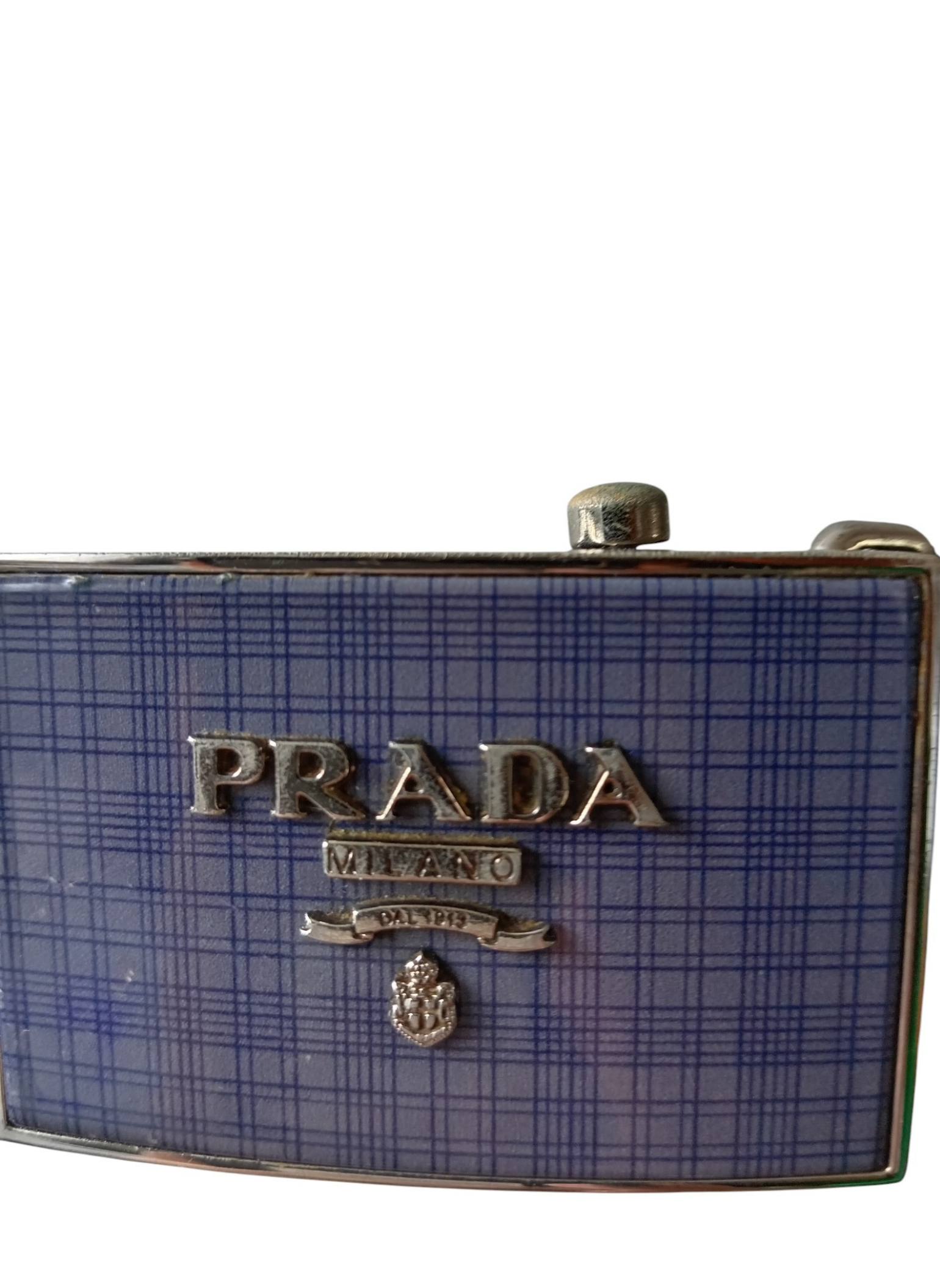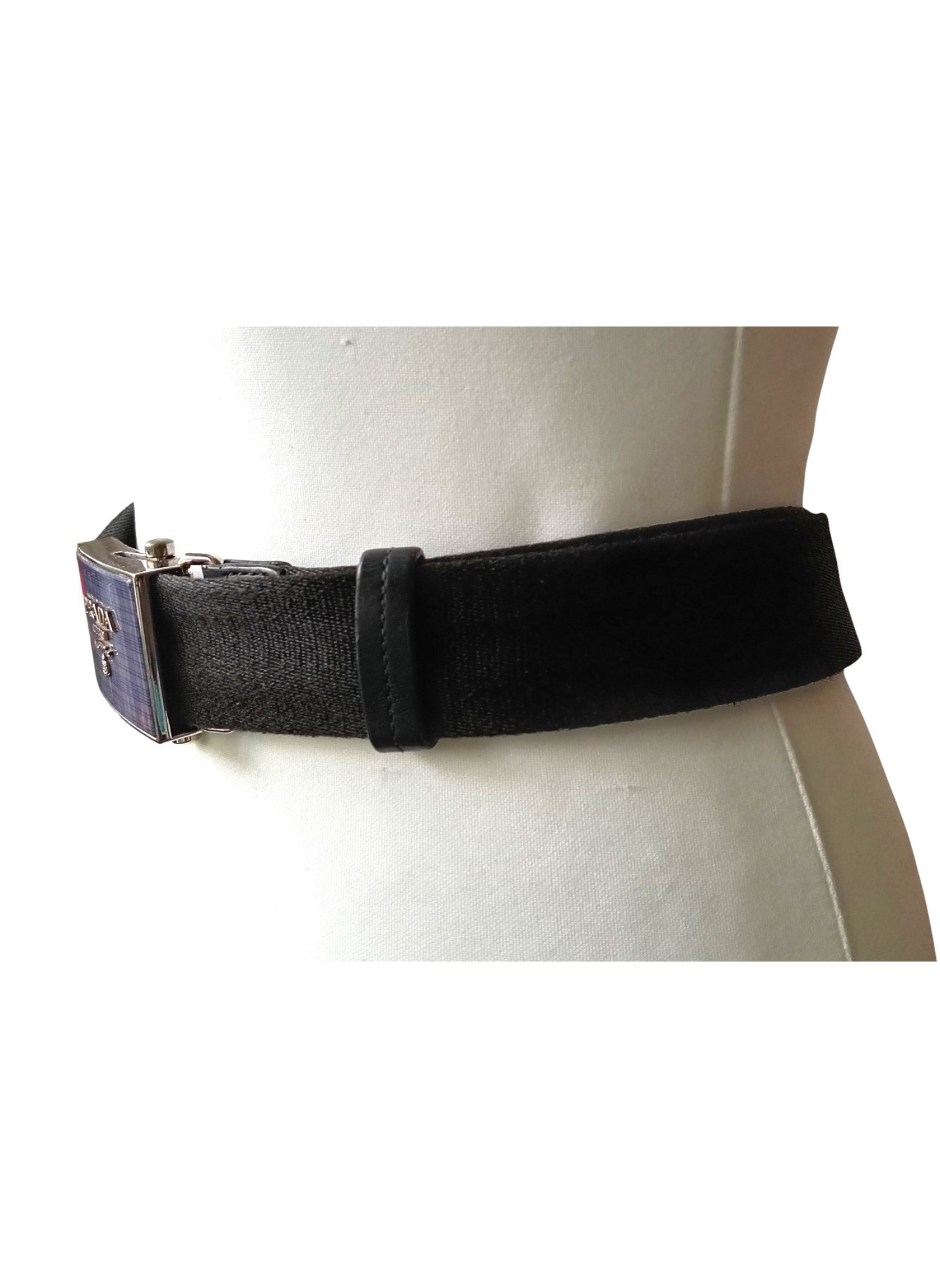 Cinturón de Prada con hebilla rectangular de placa esmaltado a cuadros color morado y correa de lona negra.Esta en perfecto estado con su funda guardapolvos .Es Unisex y se adapta a cualquier medida.Medidas: 110 cms de largo x 3,5 cms de ancho.