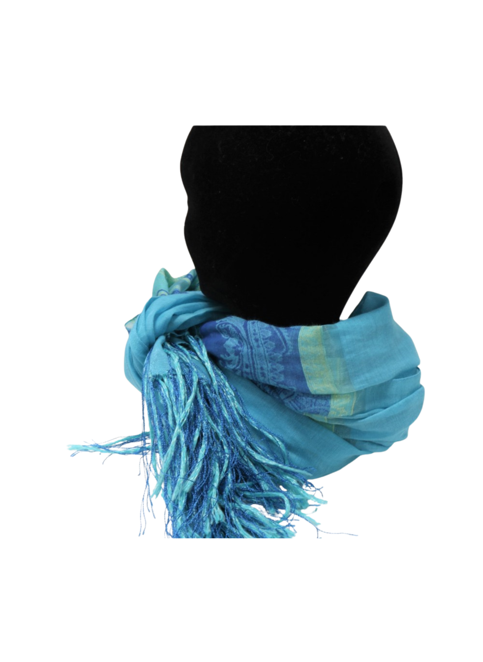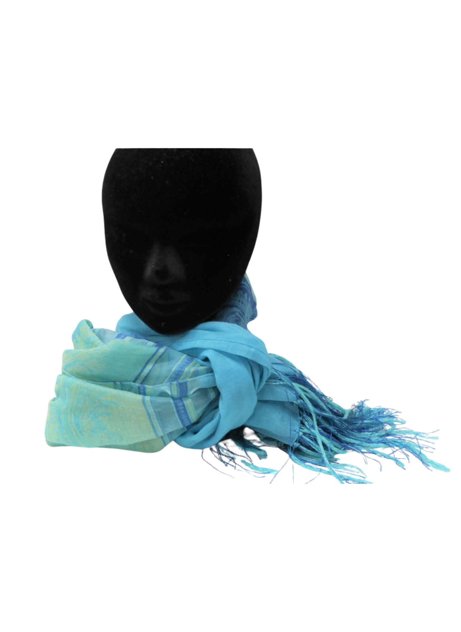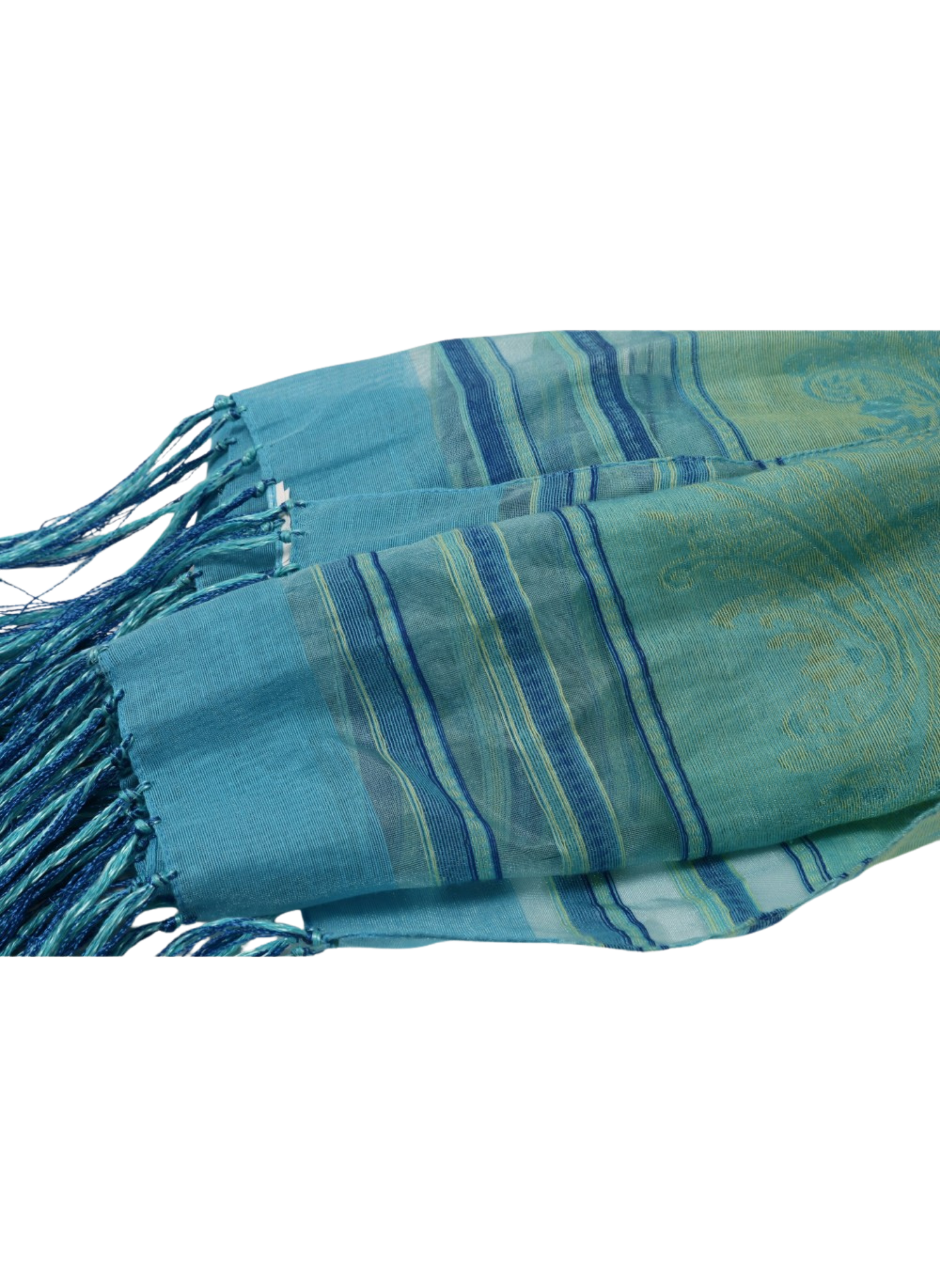 Reflect your unique style with this turquoise scarf with fringes. Made from high-quality polyester, this accessory is not only soft to the touch, but also adds a touch of color and texture to any outfit. Measuring 180 cm long and 47 cm wide, this scarf offers versatility to be worn in various ways. Its elegant fringes add additional charm and movement to your daily look. In very good condition, this scarf is ready to complement your style with a touch of freshness and sophistication on every occasion.